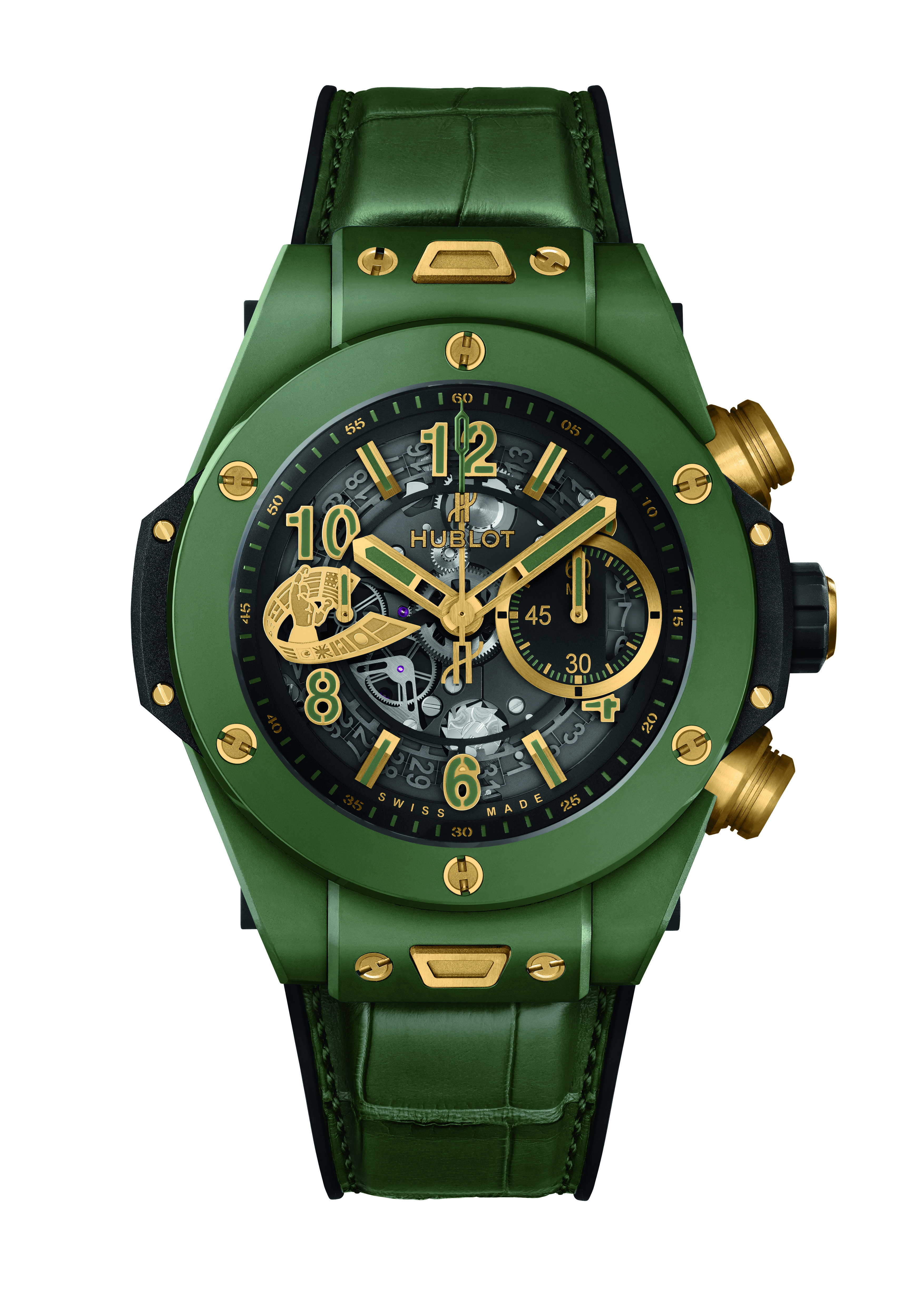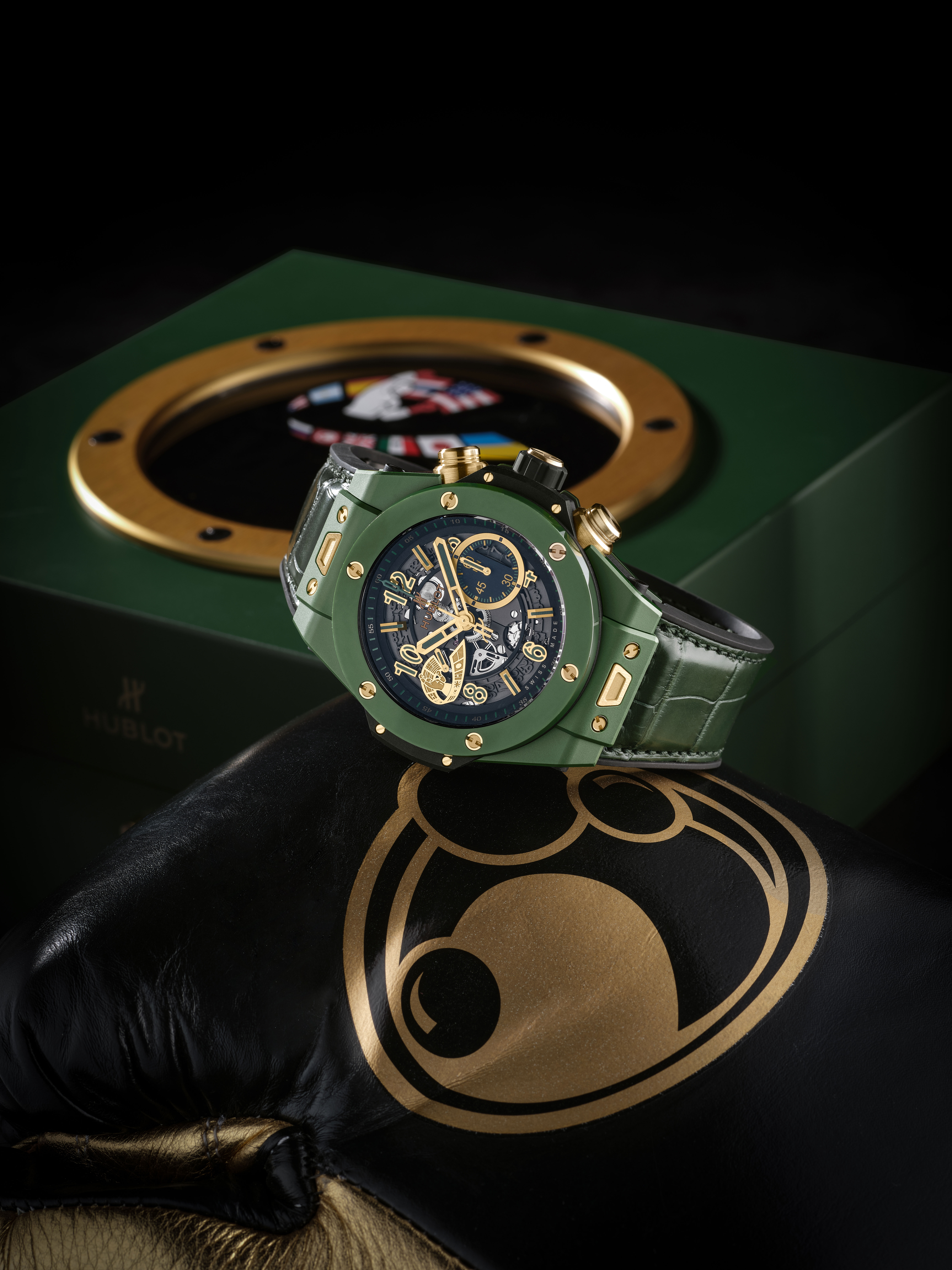 Pour célébrer le partenariat de Hublot avec WBC, l’horloger suisse a créé une montre Big Bang Unico WBC dans deux styles différents avec un bracelet en alligator vert incarnant le design unique de l’emblématique ceinture du championnat, la reconnaissance la plus élevée accordée à un boxeur. Le premier modèle présente un boîtier en céramique verte entièrement polie avec un cadran noir mat ajouré. Hublot propose également une version en King Gold 18K.
