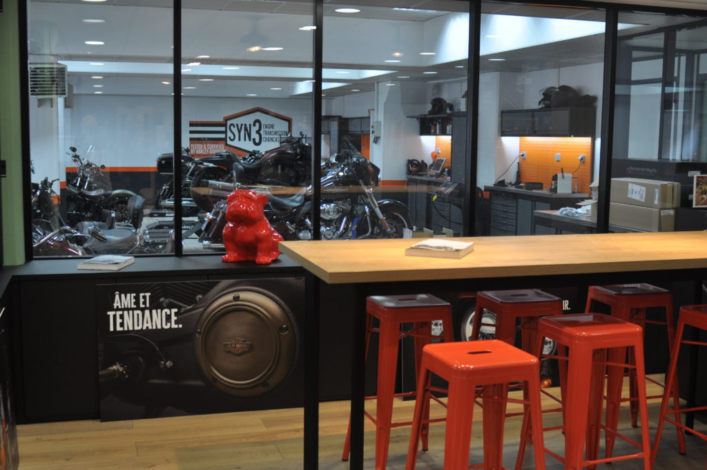 Cet établissement, de par son aménagement décliné sous forme d’espace ouvert et dédié à chaque univers, soutient l’identité de la marque Harley-Davidson.
