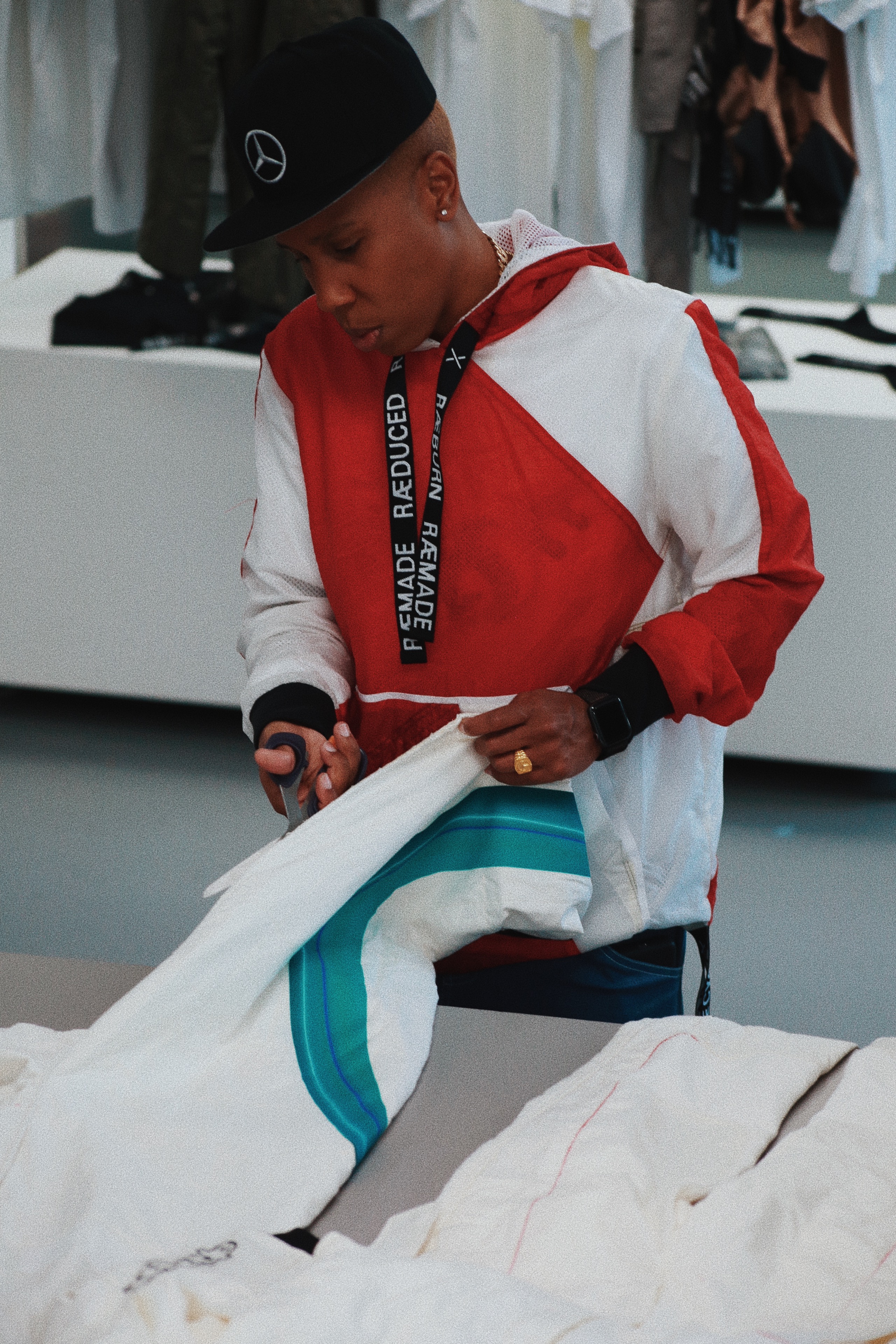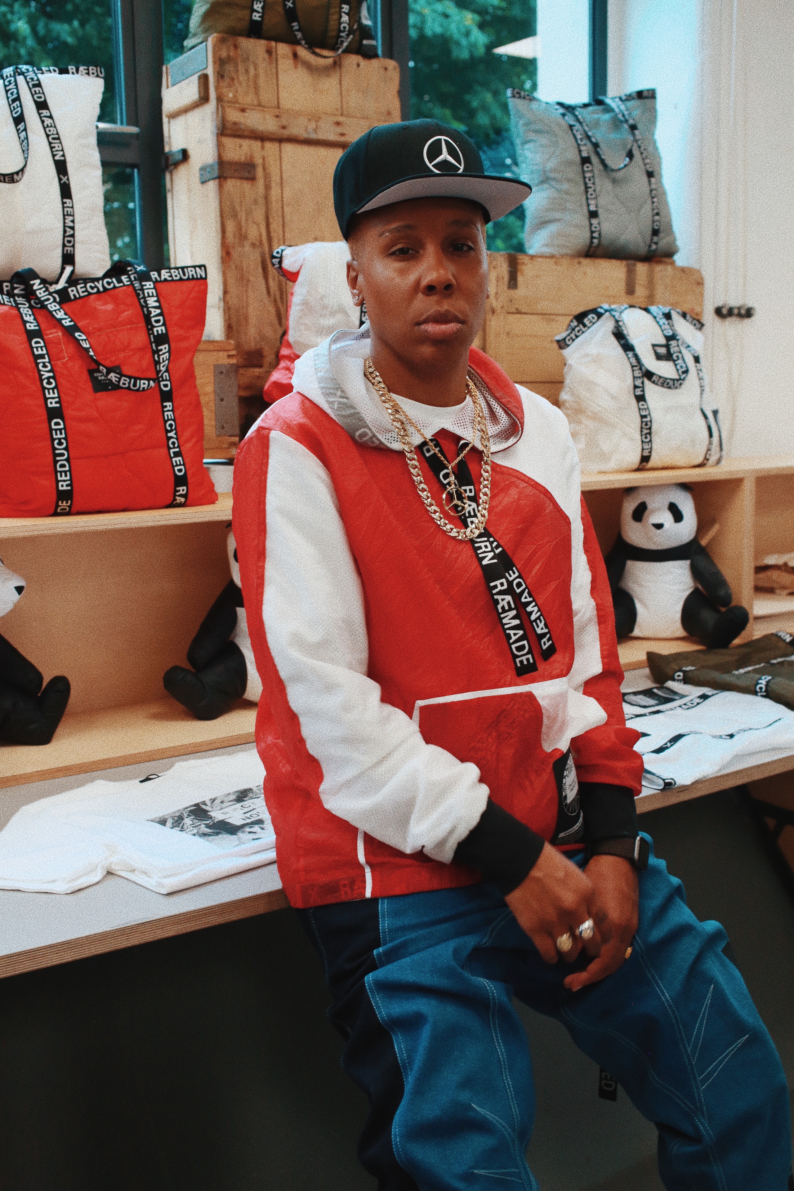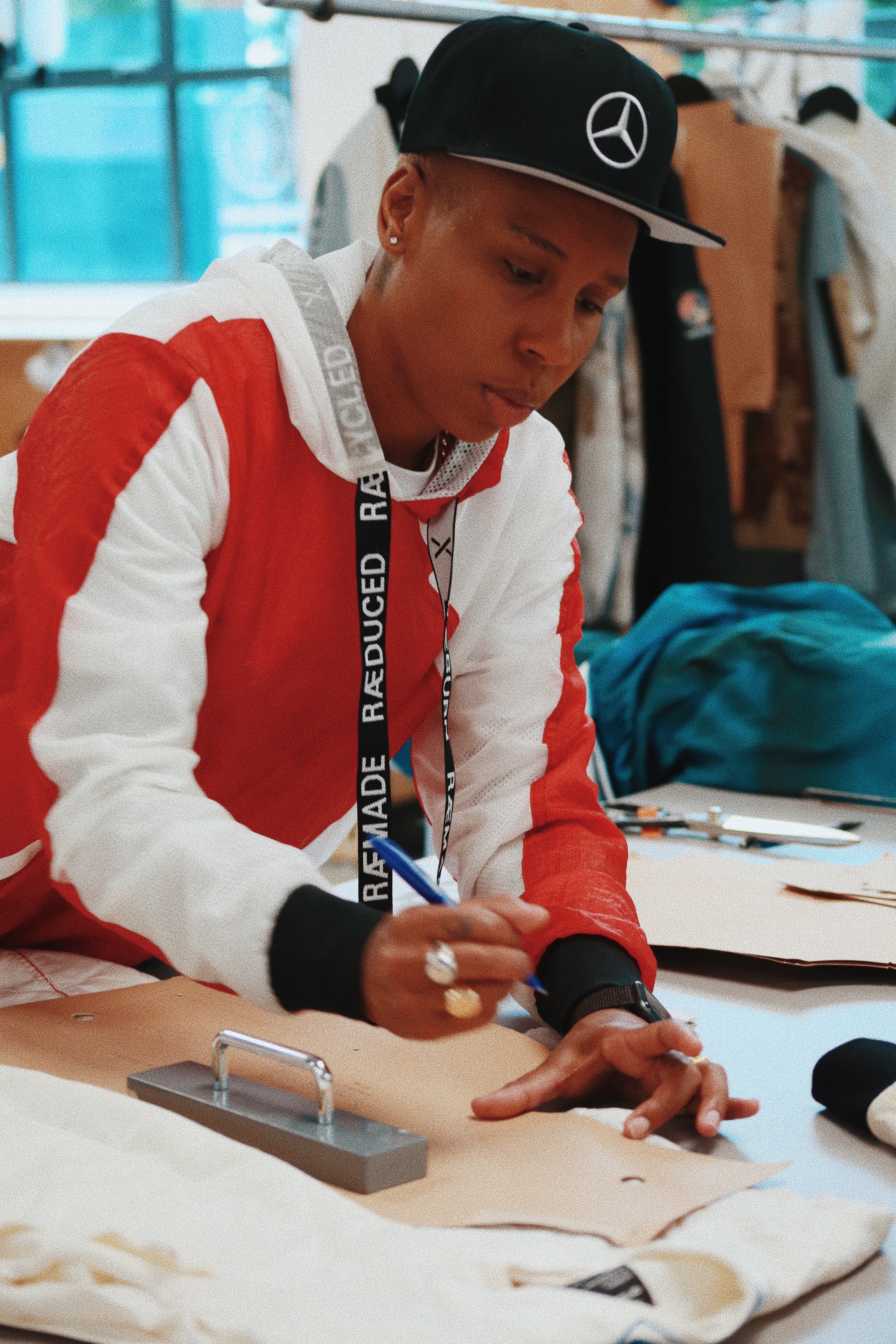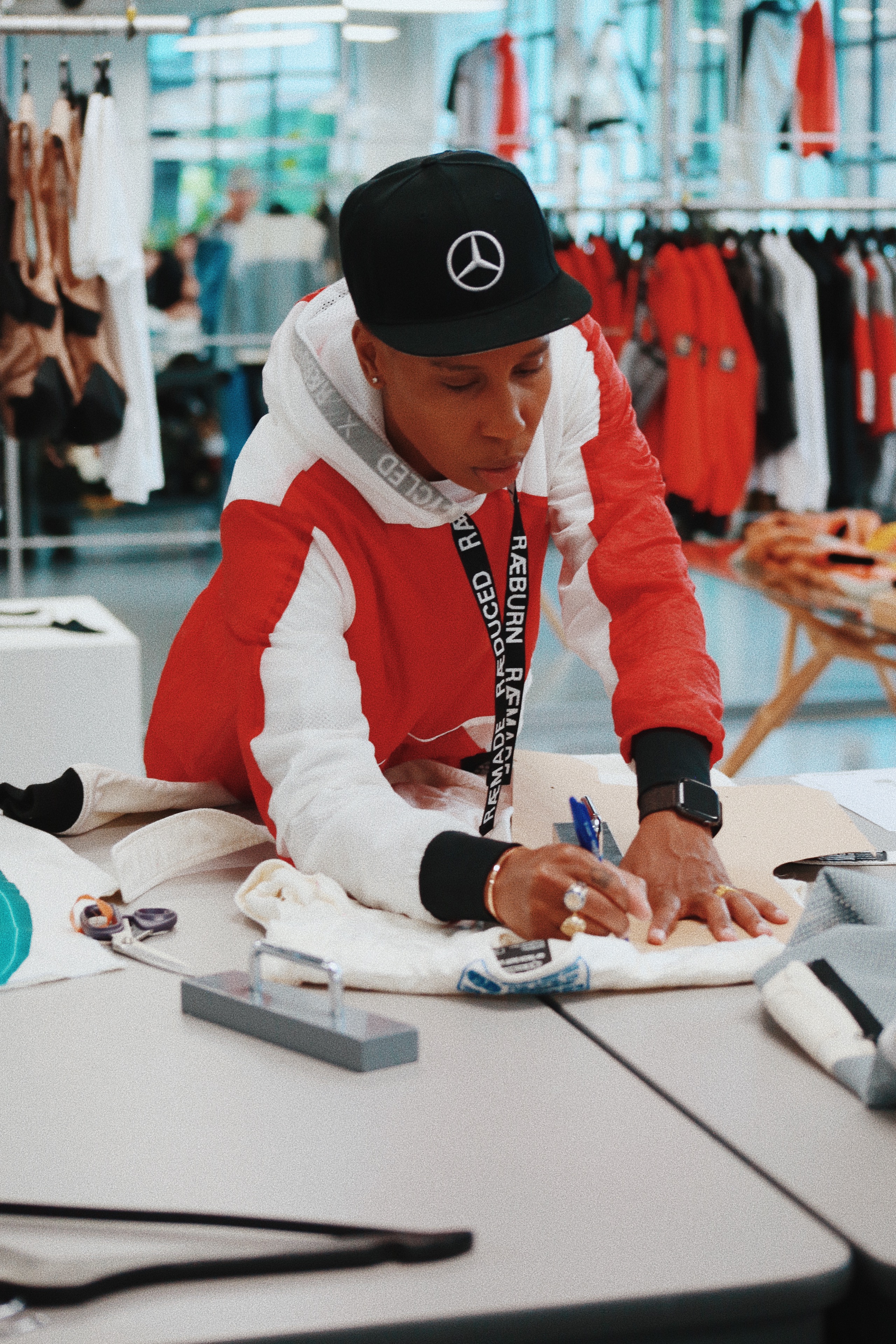 L’initiative How To de Waithe témoigne également de la puissance du nombre. Conjointement avec Mercedes-Benz, Lena s’est laissé guider, dans le cadre de sa mission, par Christopher Raeburn, directeur artistique de sa propre marque RÆBURN, directeur artistique de Timberland et surtout expert en upcycling. Cette année marque le 125e anniversaire de la présence de Mercedes-Benz dans la compétition automobile ; inspiré par cet héritage et par sa future participation à la Formule E, le constructeur automobile a fourni des tenues des équipes de Formule 1 et de Formule E que Raeburn a réutilisé pour en faire un coupe-vent unique pour Waithe. Le créateur néerlandais Duran Lantink a lui aussi aidé Lena Waithe à approfondir sa maîtrise de l’upcycling. Il a ainsi réalisé un « collage » à partir de plusieurs pièces préexistantes de la garde-robe de Lena (technique pour laquelle Lantink est connu et qu’il utilise pour sa marque éponyme) afin de créer pour elle un style entièrement sur-mesure.