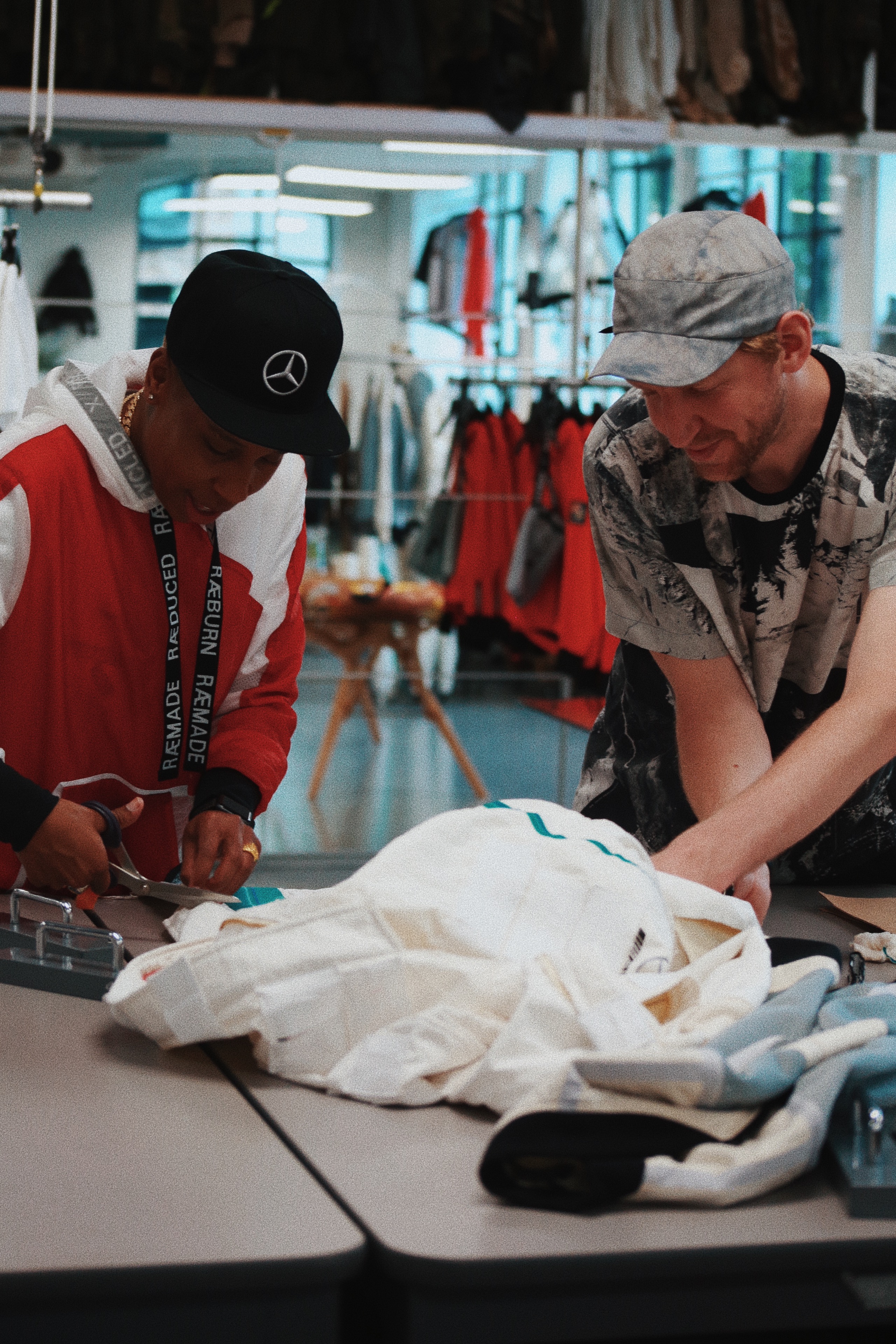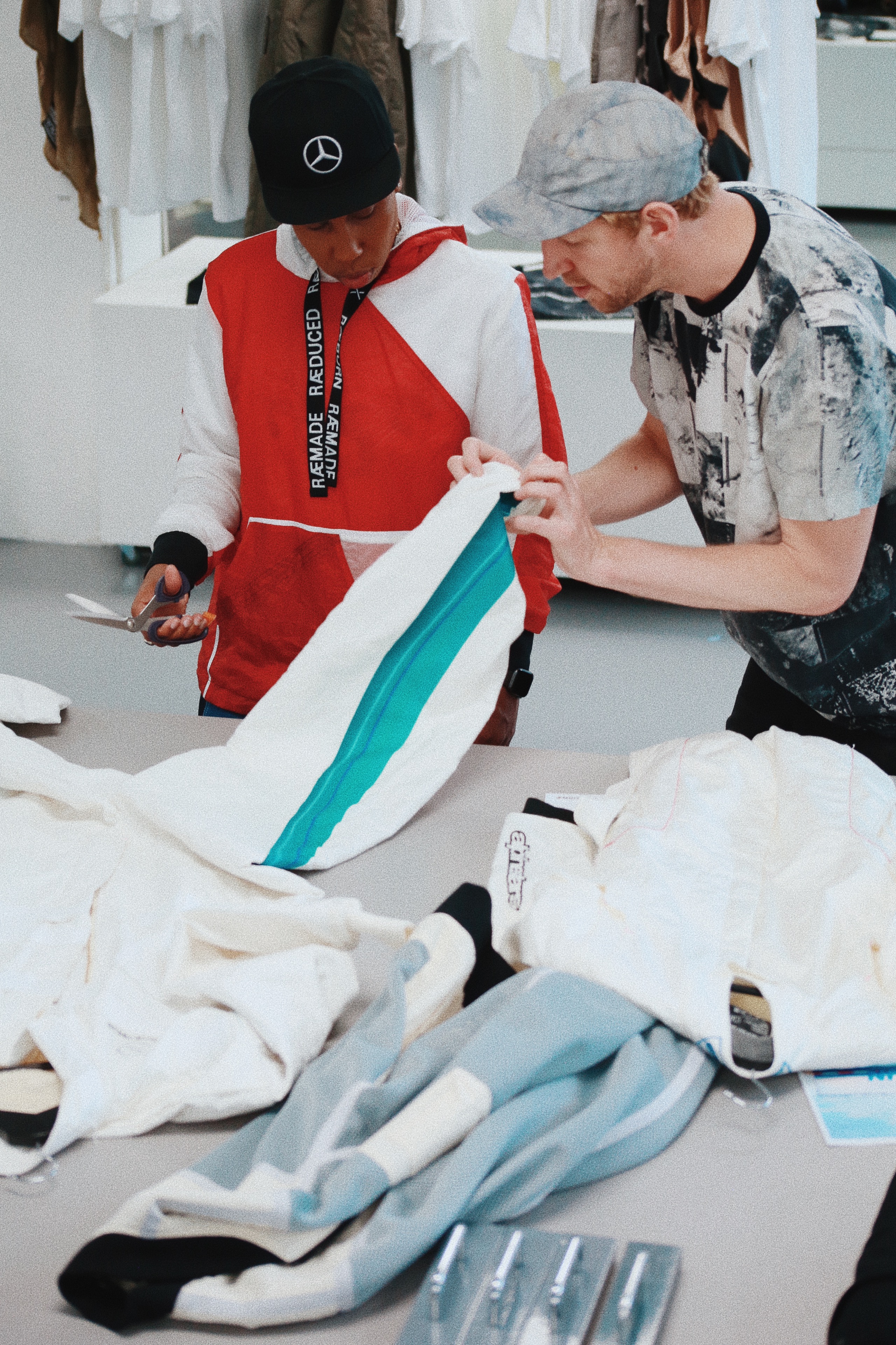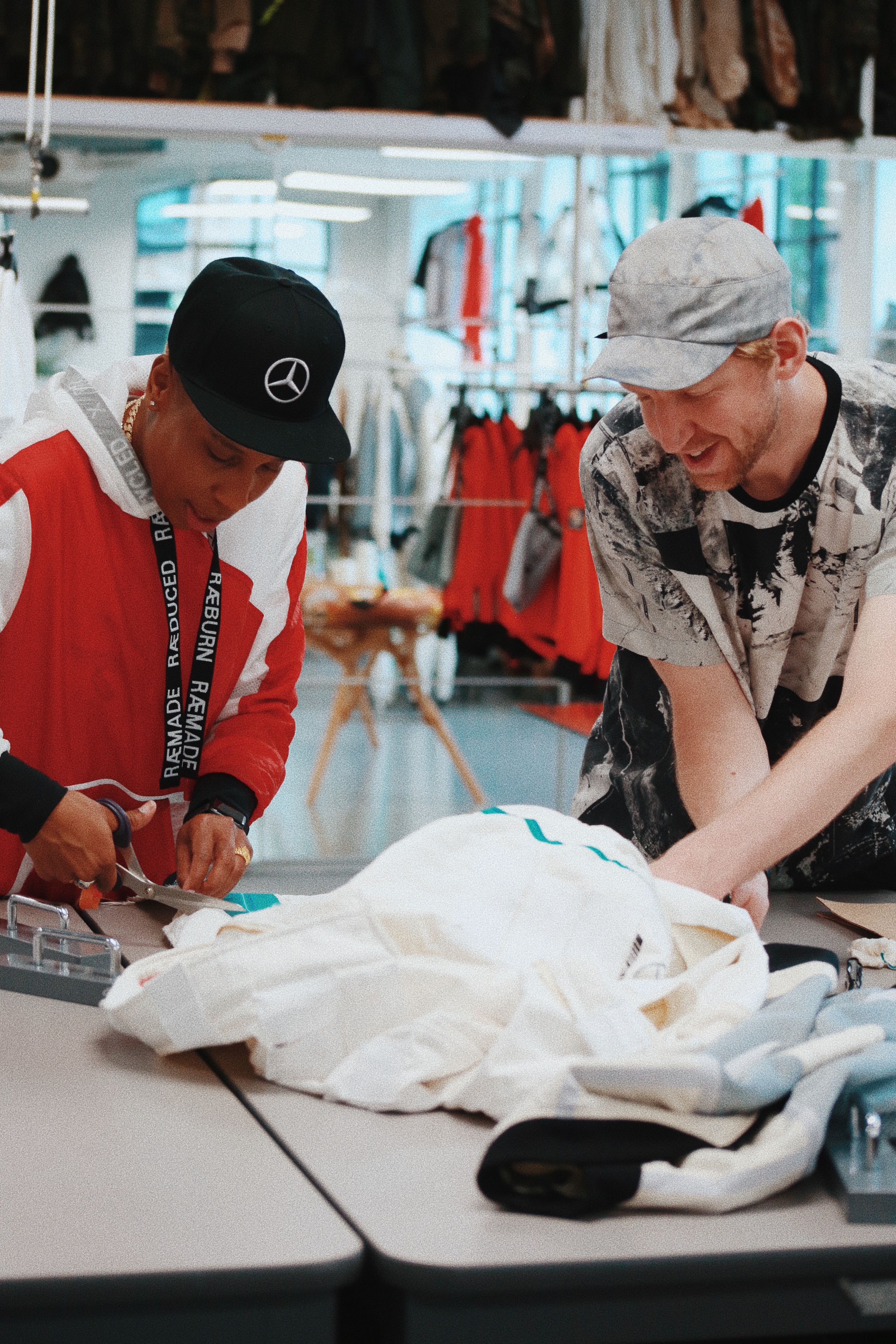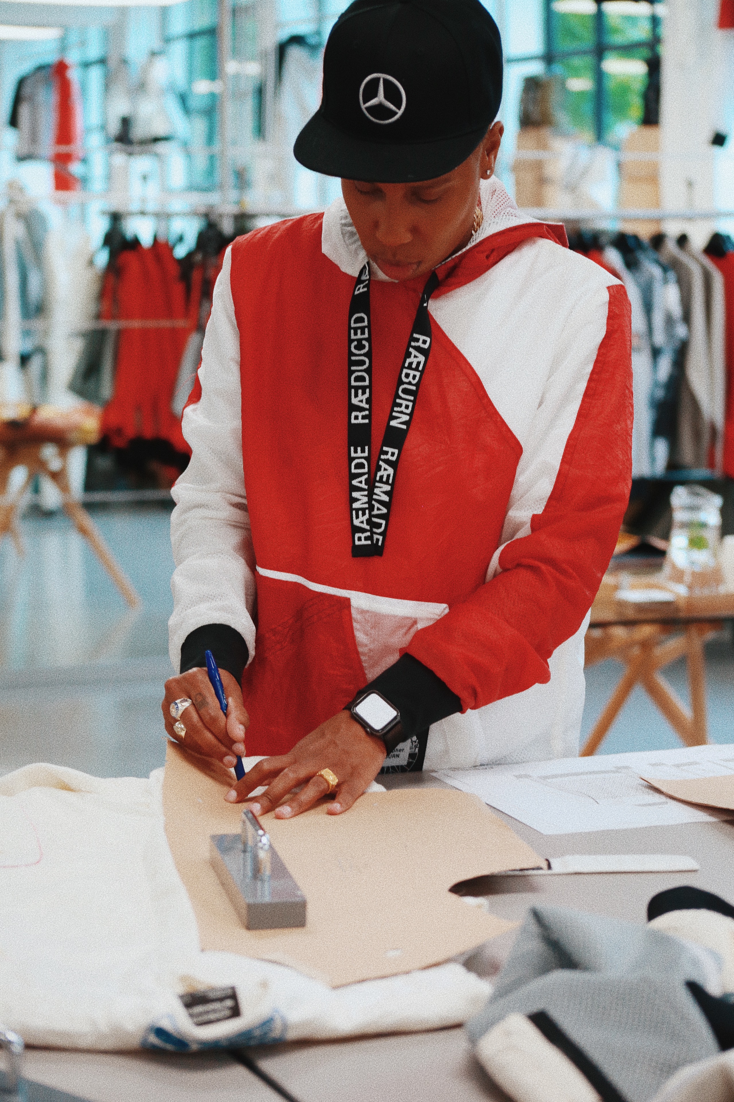 L’initiative How To de Waithe témoigne également de la puissance du nombre. Conjointement avec Mercedes-Benz, Lena s’est laissé guider, dans le cadre de sa mission, par Christopher Raeburn, directeur artistique de sa propre marque RÆBURN, directeur artistique de Timberland et surtout expert en upcycling. Cette année marque le 125e anniversaire de la présence de Mercedes-Benz dans la compétition automobile ; inspiré par cet héritage et par sa future participation à la Formule E, le constructeur automobile a fourni des tenues des équipes de Formule 1 et de Formule E que Raeburn a réutilisé pour en faire un coupe-vent unique pour Waithe. Le créateur néerlandais Duran Lantink a lui aussi aidé Lena Waithe à approfondir sa maîtrise de l’upcycling. Il a ainsi réalisé un « collage » à partir de plusieurs pièces préexistantes de la garde-robe de Lena (technique pour laquelle Lantink est connu et qu’il utilise pour sa marque éponyme) afin de créer pour elle un style entièrement sur-mesure.