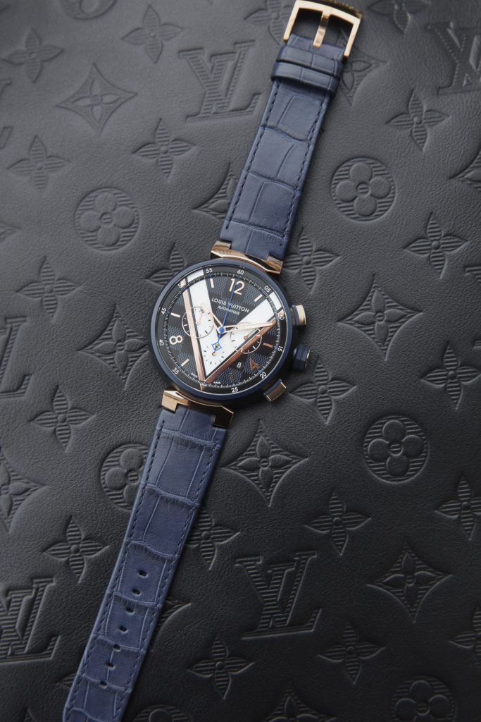 • Boîte en acier inoxydable traité PVD bleu avec cornes et poussoirs en or rose • 46 mm de diamètre • Cadran décalqué et sérigraphié avec motif V et Damier • Aiguilles des heures et des minutes squelettées avec Superluminova • Mouvement automatique visible à travers le fond transparent • Fonctions : date, chronographe, heures, minutes, secondes • Bracelet interchangeable équipé du système breveté par Louis Vuitton, en alligator bicolore • Boucle ardillon • Étanche à 100 mètres