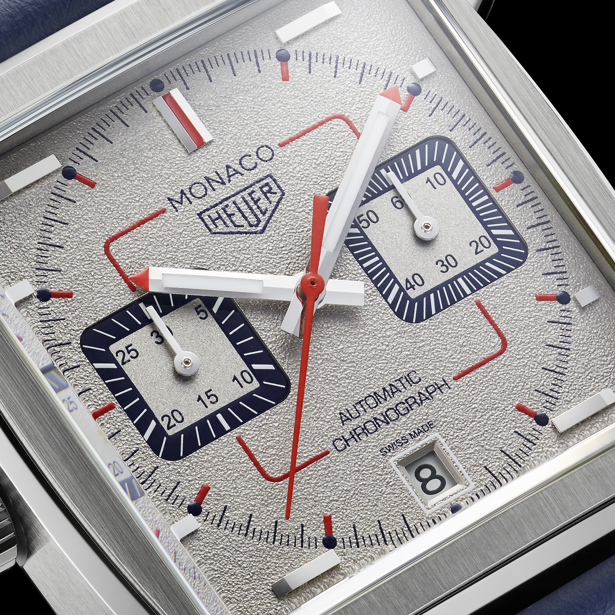 Le troisième des cinq hommages à la Monaco en édition limitée s’inspire des thèmes, styles et tendances des années 1990. Avec un look acier et industriel, reflétant le style caractéristique de cette belle décennie, l’édition spéciale de collection affiche un design aux accents bleu et argent ponctué d’éléments dynamiques rouges. Le chronographe carré en acier inoxydable présente un cadran rhodié grainé et des compteurs bleu sablés. Le réhaut et le logo Heuer sont en bleu, tandis que les index et la seconde centrale sont rouges. Le bleu du logo Heuer et de la minuterie des compteurs des minutes et des secondes offre un contraste saisissant avec les accents rouges des aiguilles, des index et du motif sur le cadran. Cette palette de couleurs se prolonge sur le bracelet en cuir de veau perforé bleu aux surpiqures rouges.