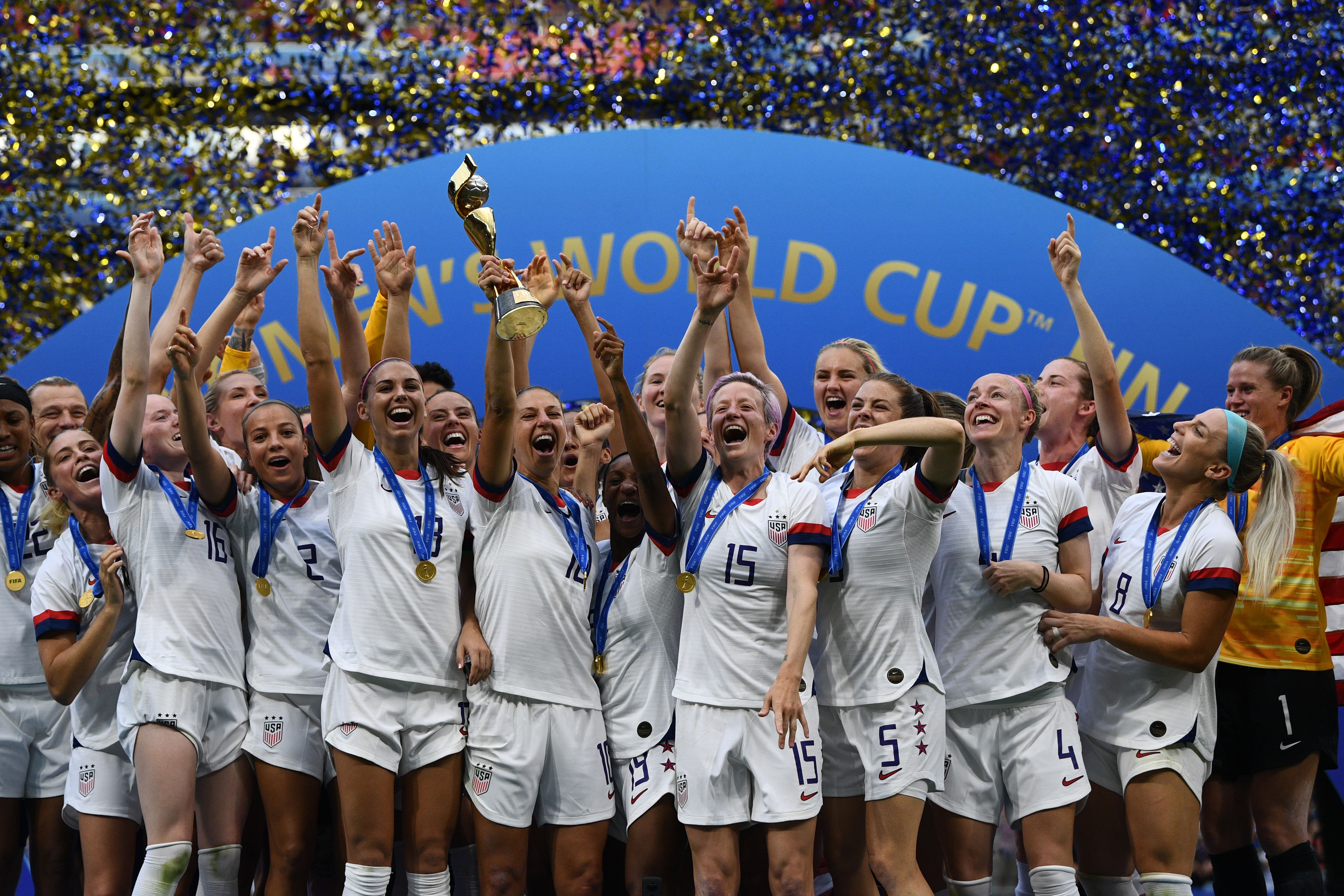 - USA’s players celebrate with the trophy after the France 2019 Womens World Cup football final match between USA and the Netherlands, on July 7, 2019, at the Lyon Stadium in Lyon, central-eastern France. (Photo by FRANCK FIFE / AFP) (Photo credit should read FRANCK FIFE/AFP/Getty Images)