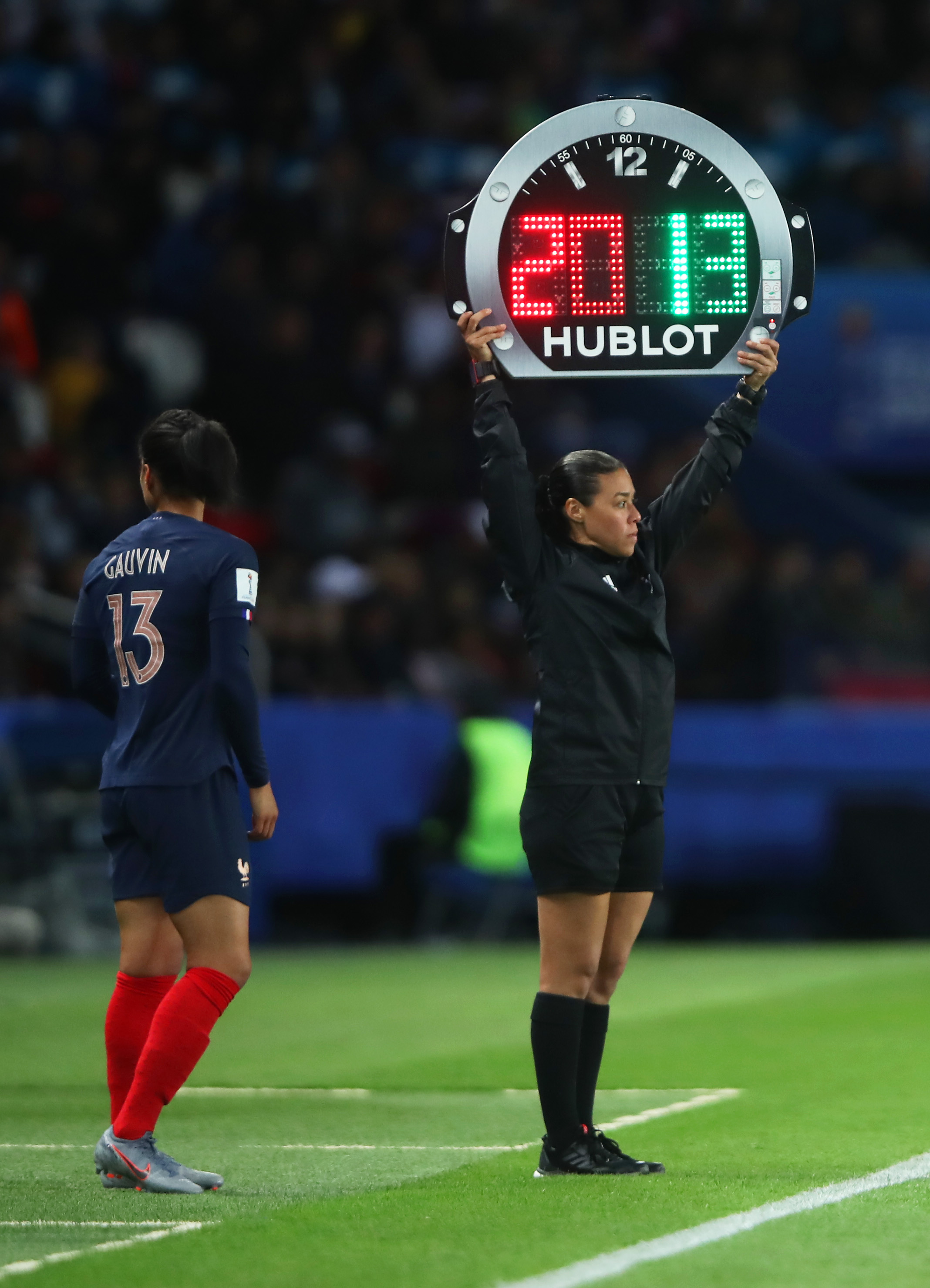 - PARIS, FRANCE – JUNE 07: Fourth official Melissa Borjas signals for a substitution during the 2019 FIFA Women’s World Cup France group A match between France and Korea Republic at Parc des Princes on June 07, 2019 in Paris, France. (Photo by Alex Grimm/Bongarts/Getty Images)