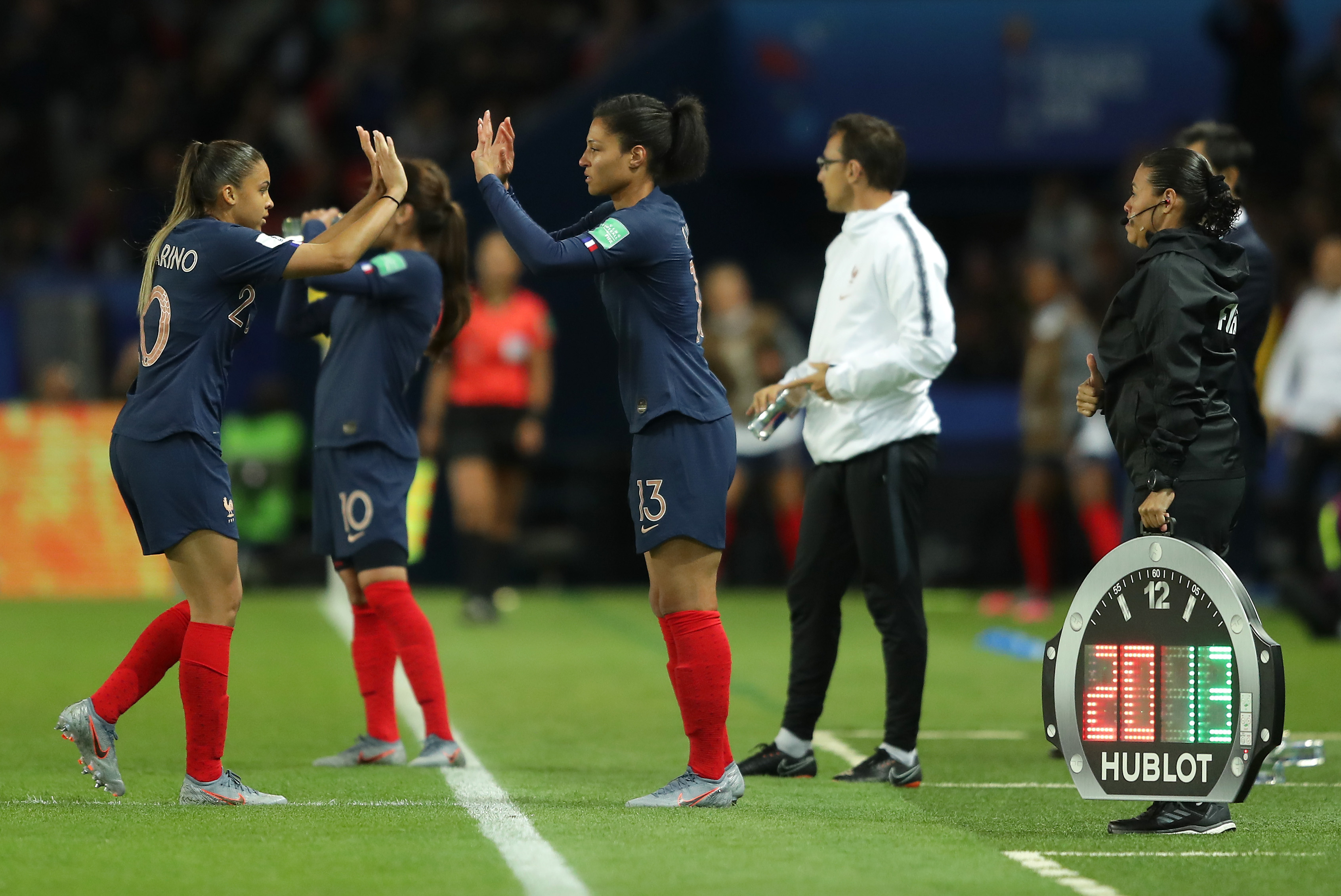 - PARIS, FRANCE – JUNE 07: Delphine Cascarino is replaced by Valerie Gauvin of France during the 2019 FIFA Women’s World Cup France group A match between France and Korea Republic at Parc des Princes on June 07, 2019 in Paris, France. (Photo by Richard Heathcote/Getty Images)