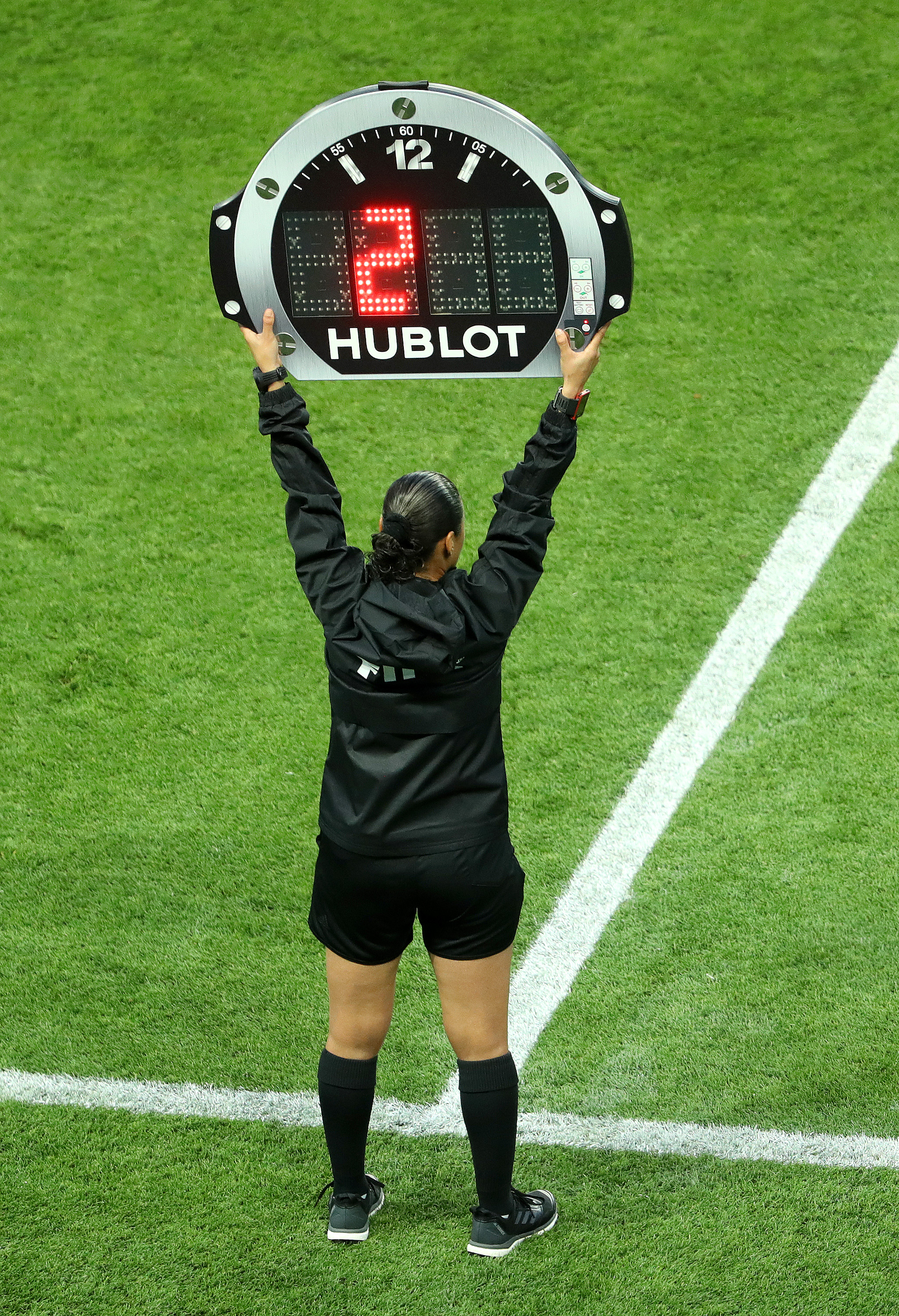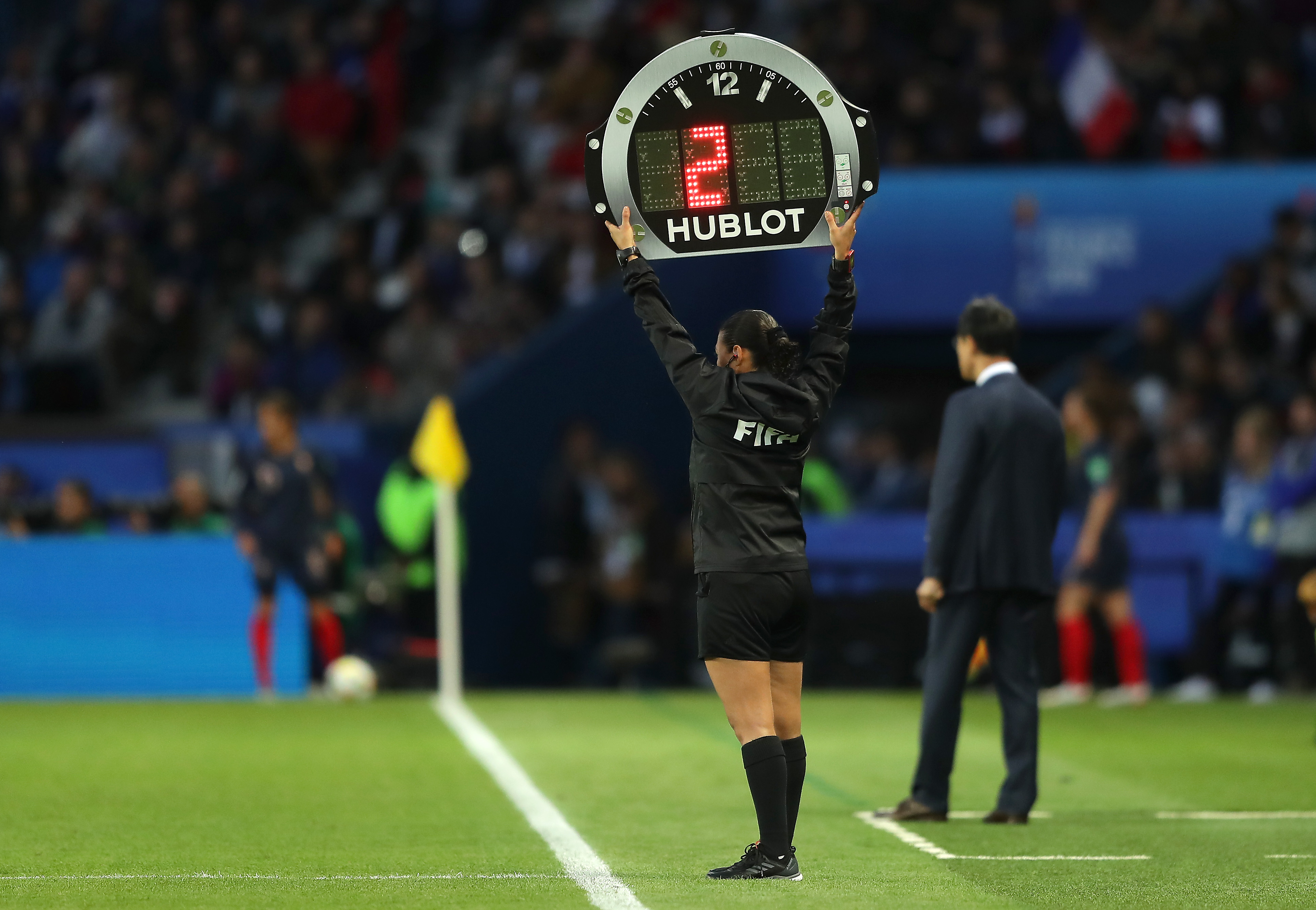 - PARIS, FRANCE – JUNE 07: Fourth official Melissa Borjas signals added time at the end of the first half during the 2019 FIFA Women’s World Cup France group A match between France and Korea Republic at Parc des Princes on June 07, 2019 in Paris, France. (Photo by Robert Cianflone/Getty Images)