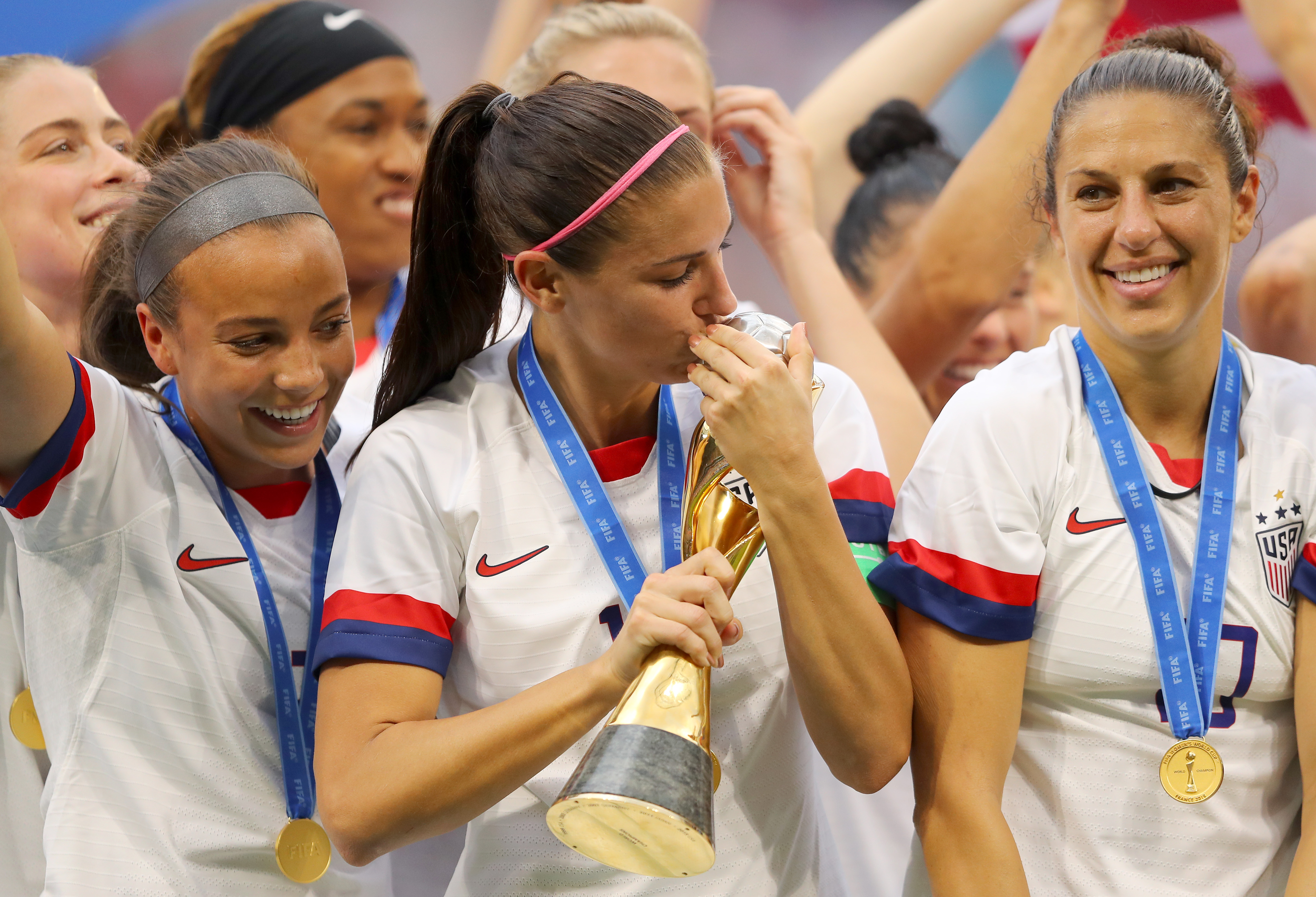 - LYON, FRANCE – JULY 07: Alex Morgan of the USA kisses the FIFA Women’s World Cup Trophy following her team’s victory in the 2019 FIFA Women’s World Cup France Final match between The United States of America and The Netherlands at Stade de Lyon on July 07, 2019 in Lyon, France. (Photo by Richard Heathcote/Getty Images)