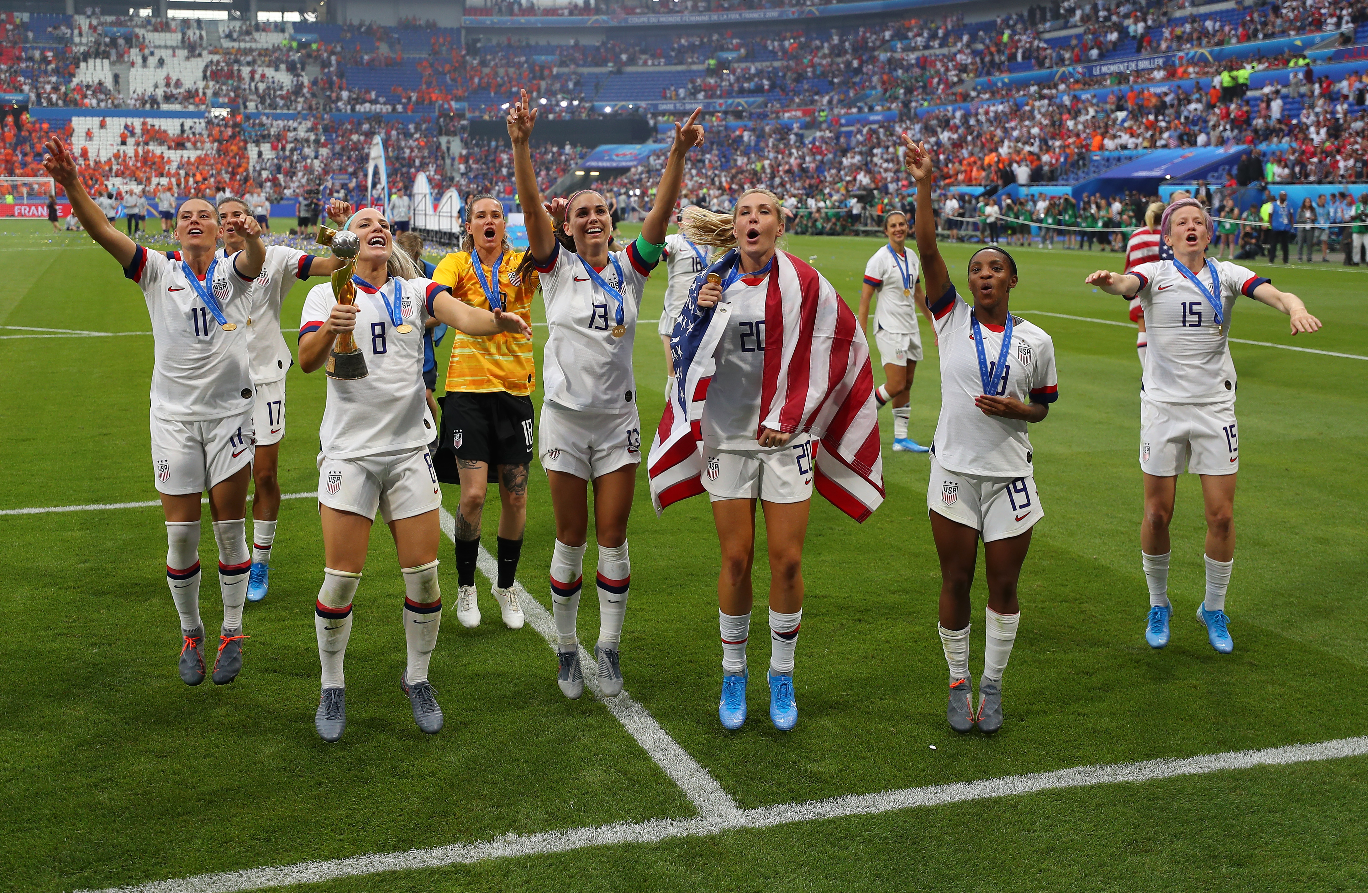 - LYON, FRANCE – JULY 07: Players of the USA celebrate following their sides victory in the 2019 FIFA Women’s World Cup France Final match between The United States of America and The Netherlands at Stade de Lyon on July 07, 2019 in Lyon, France. (Photo by Richard Heathcote/Getty Images)
