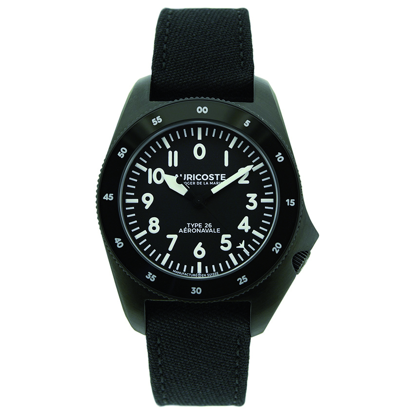 Depuis sa création en 1854, AURICOSTE a conquis ses lettres de noblesse dans les airs et sur les mers avec son chronographe TYPE 20 pour l’Aviation et ses montres de plongée développées pour la Spirotechnique et utilisées par la Marine Nationale. Forte d’un véritable héritage historique dans l’univers des montres militaires, AURICOSTE, maison horlogère de tradition a notamment équipé les Sous-Marins type SNA, les Frégates 2000, le porteavions Charles de GAULLE. Dans la continuité de ce riche passé et pour symboliser ces univers, AURICOSTE présente l’AERONAVALE type 26, montre développée à partir des cadrans des instruments de bord de la Manufacture.