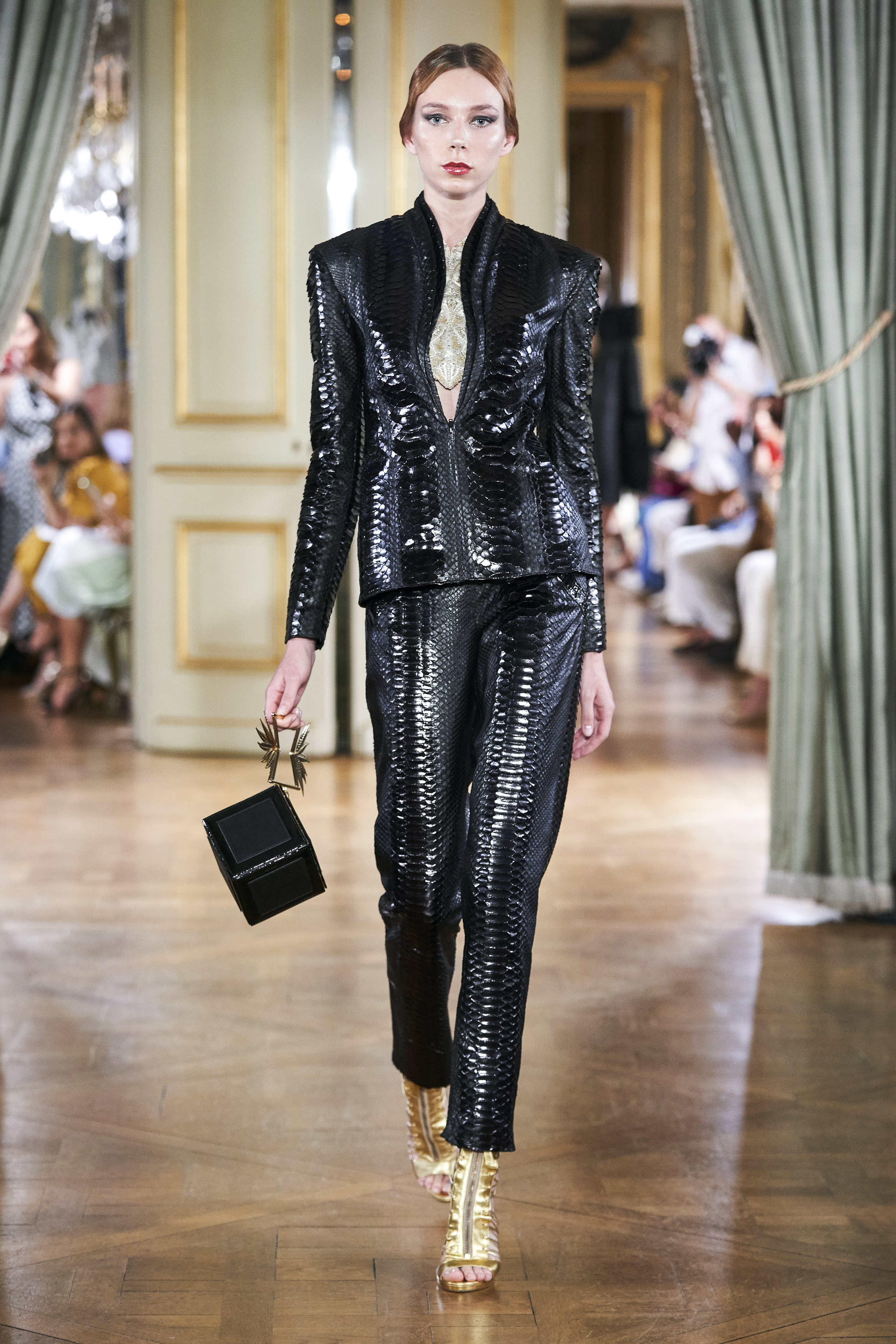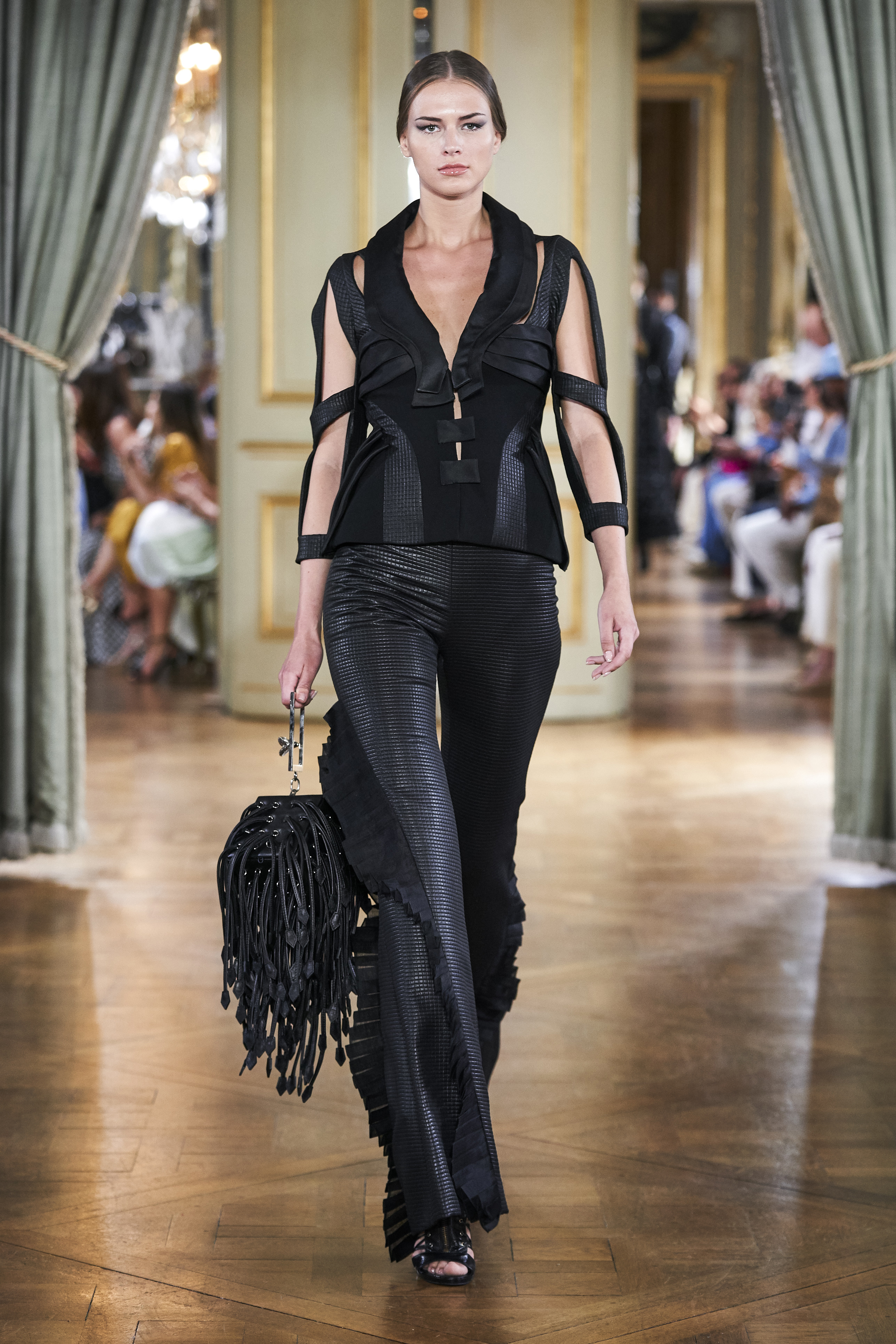 The collection reveals Farhad Re’s love for contrasts by the use of colours and the choice of fabrics, nude- coloured shades combined with the harshness of black, challenging the lightness of organza with the rigidity of python-leather cutting the romantic lines of the silk dresses.