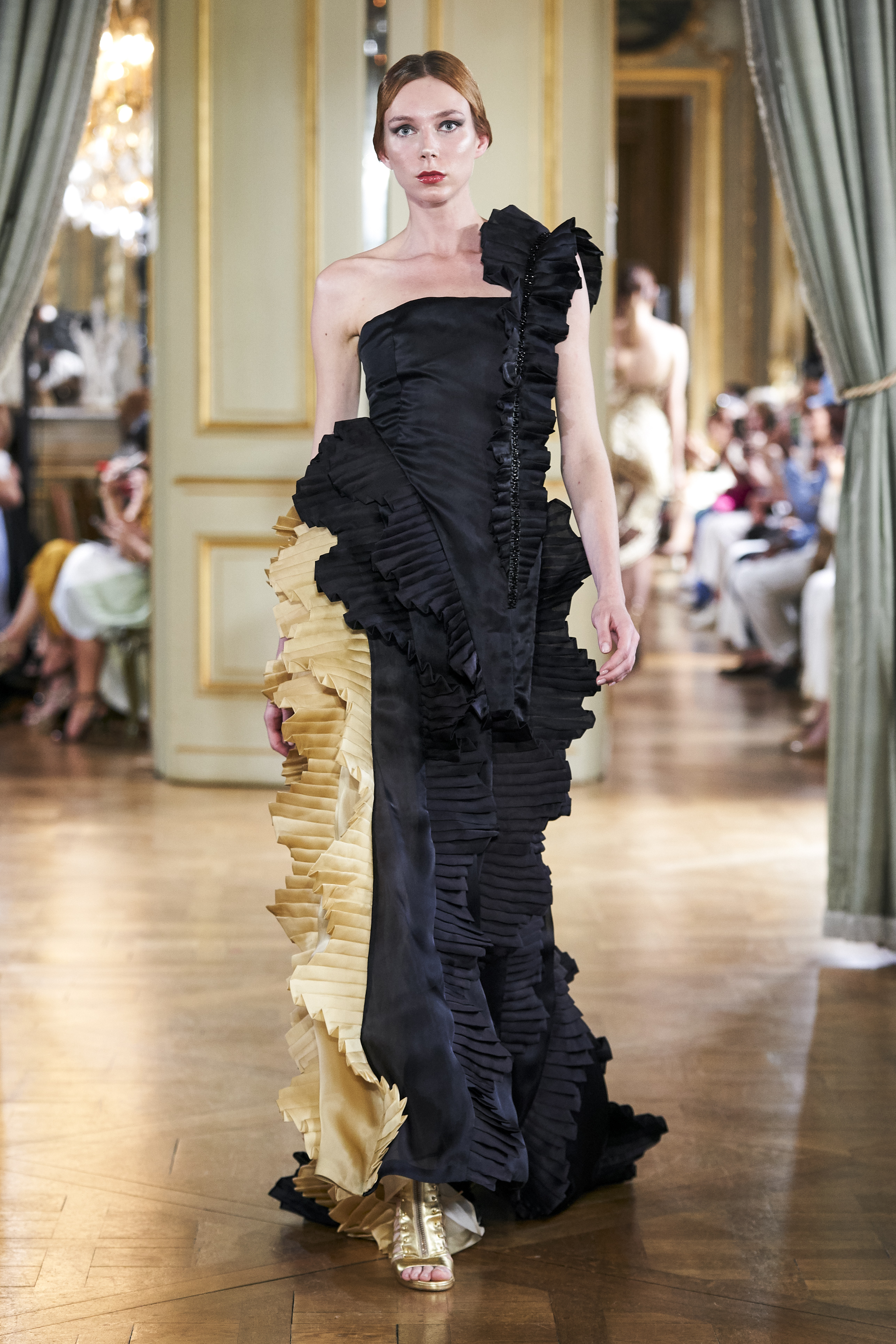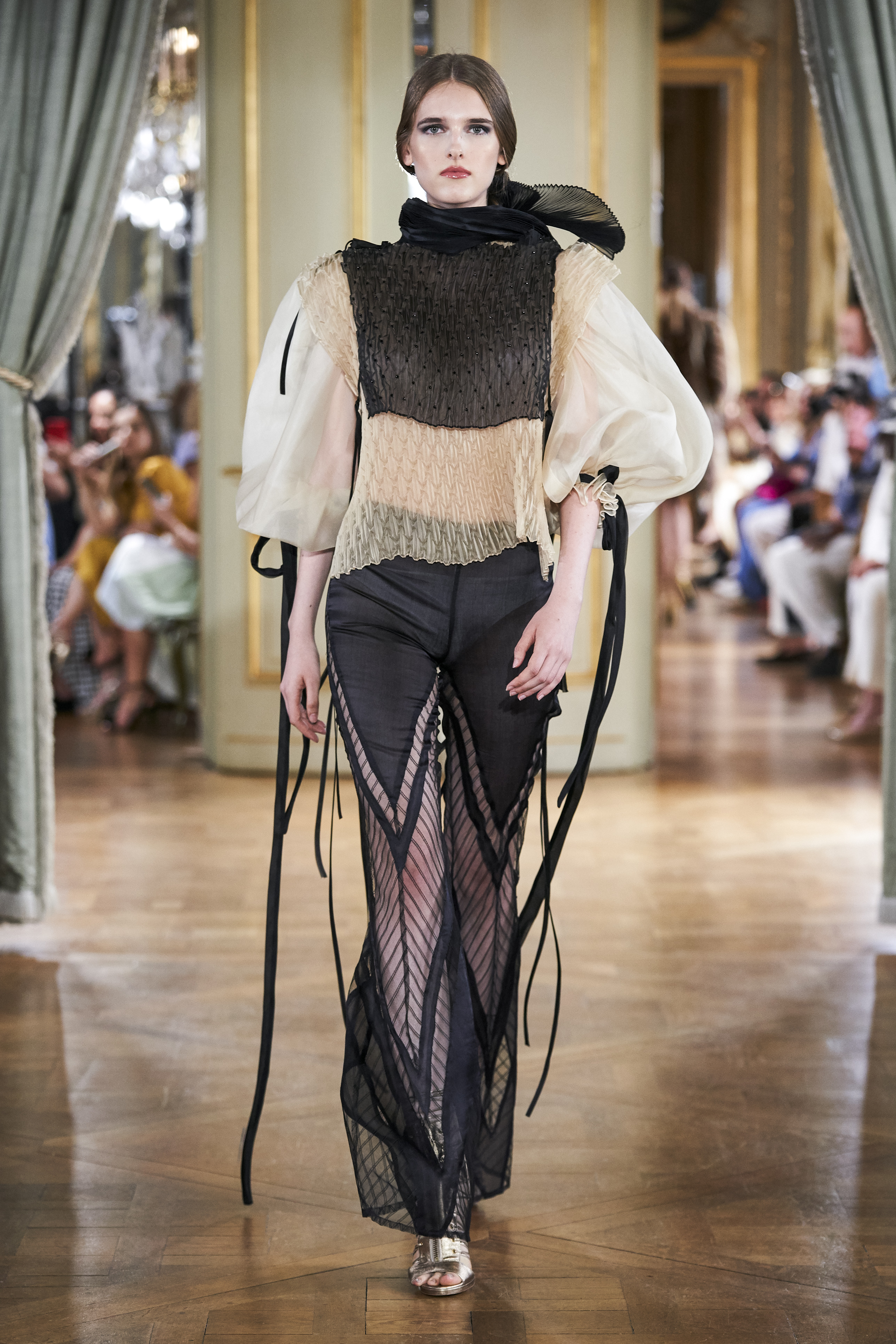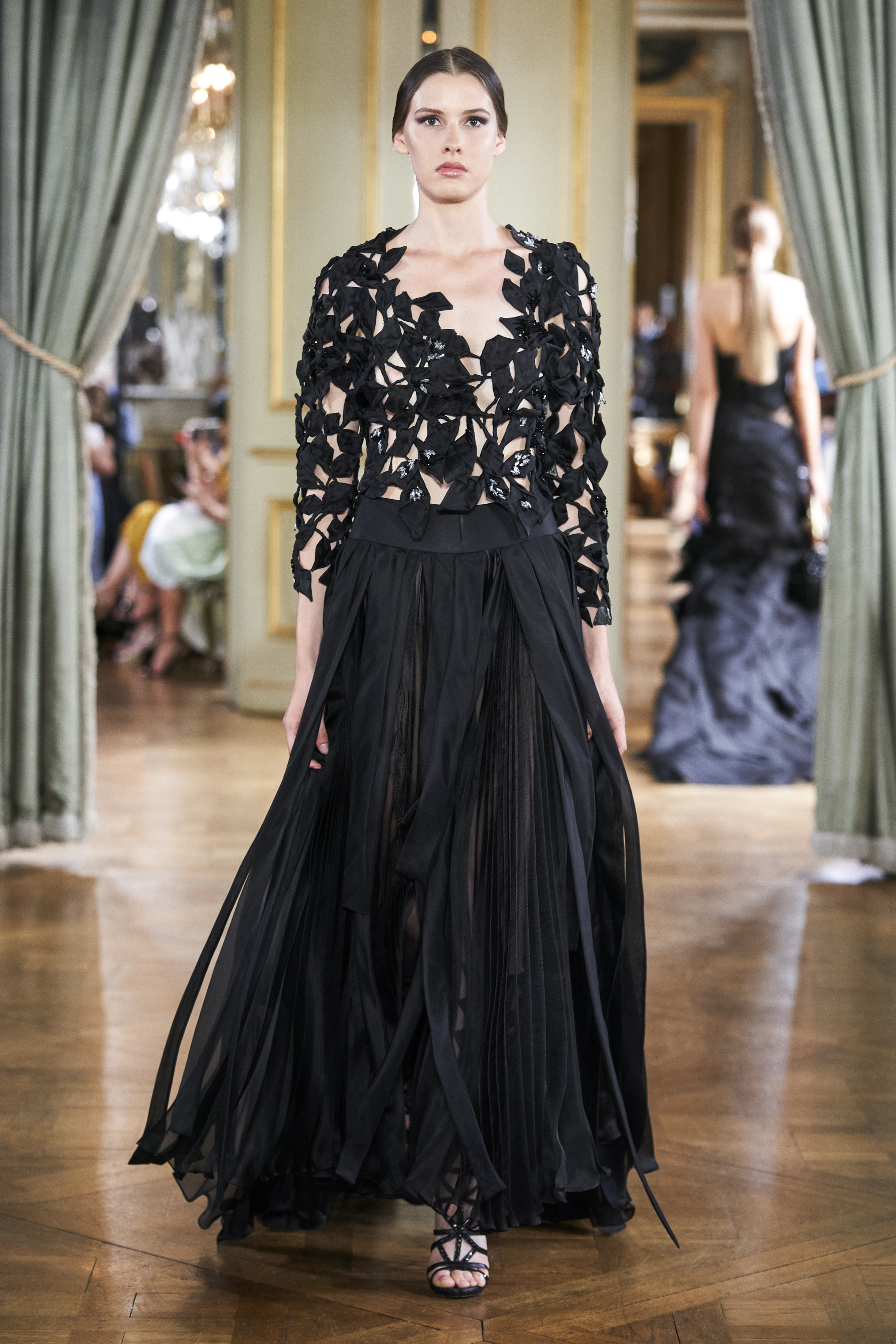 For the realisation of his vision to adorn this fearlessly graceful, yet eminently elegant woman, the designer resorted to silk organza, which is used almost entirely throughout all the 30 looks, mounting to the processing of 500 meters of the sumptuous fabric.