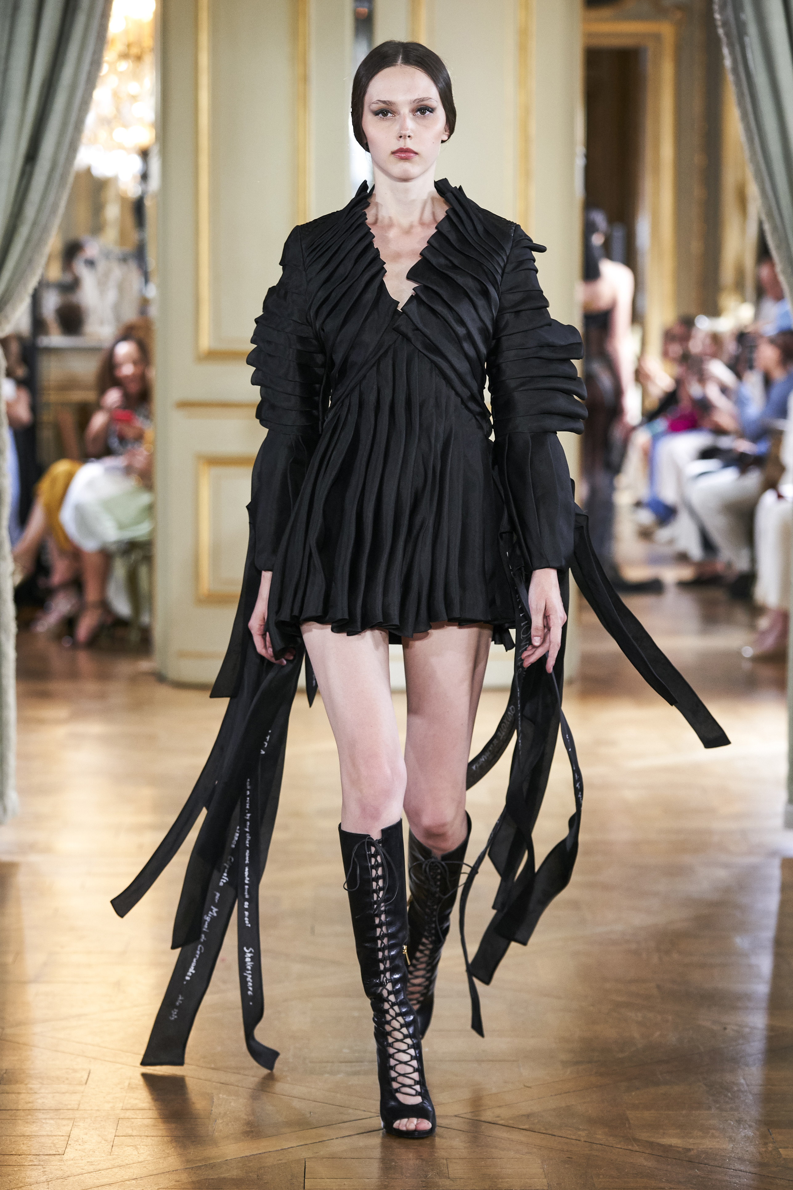 The romantic collection tells the story of the women of the future that leaves an increasingly contaminated earth behind for a new planet. Embodied by the sculptural dresses’ with details as silk ribbons and folded organza that bear the resemblance of the pages of a book, she is taking the most precious creation of humanity, the culture, with her on her quest.