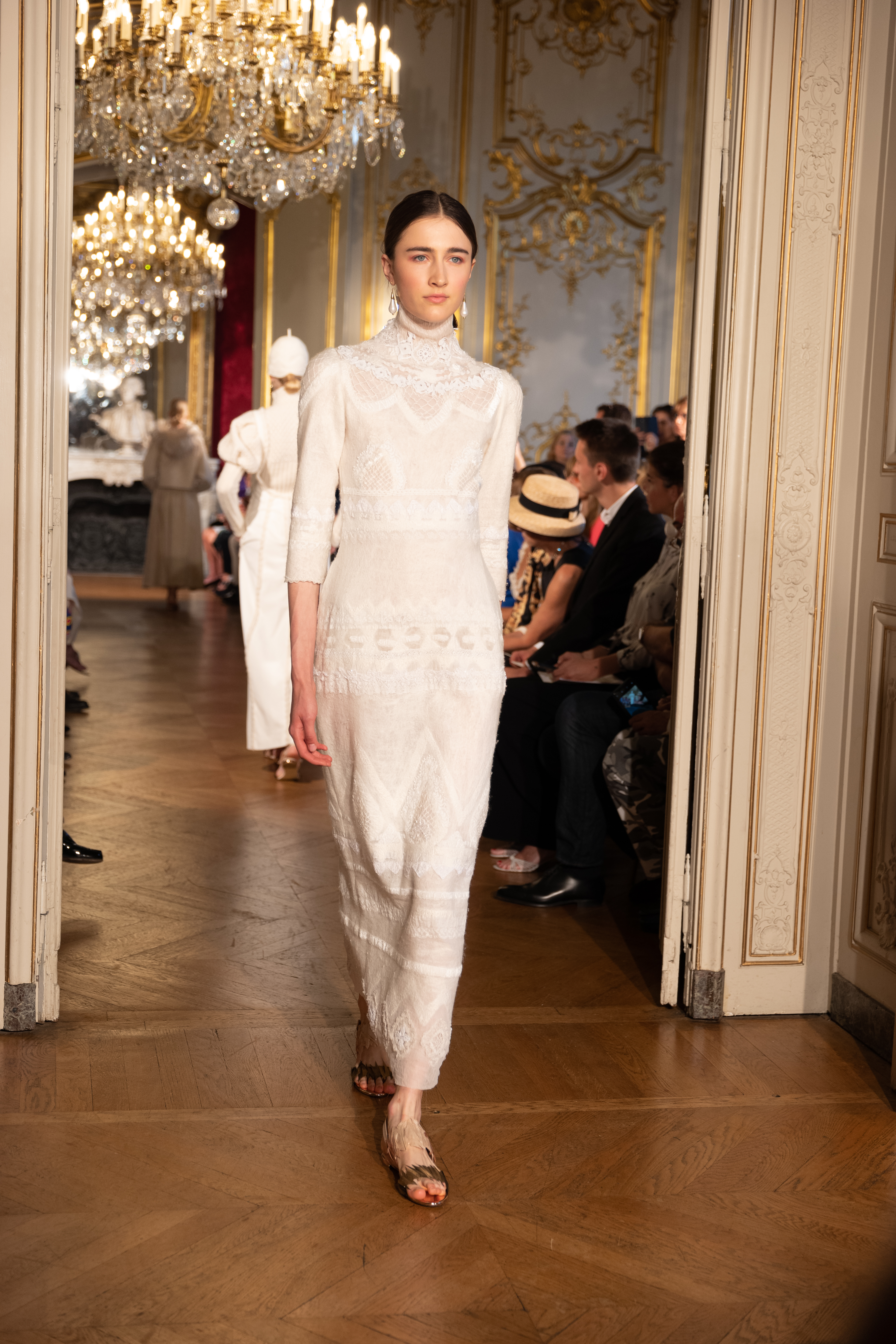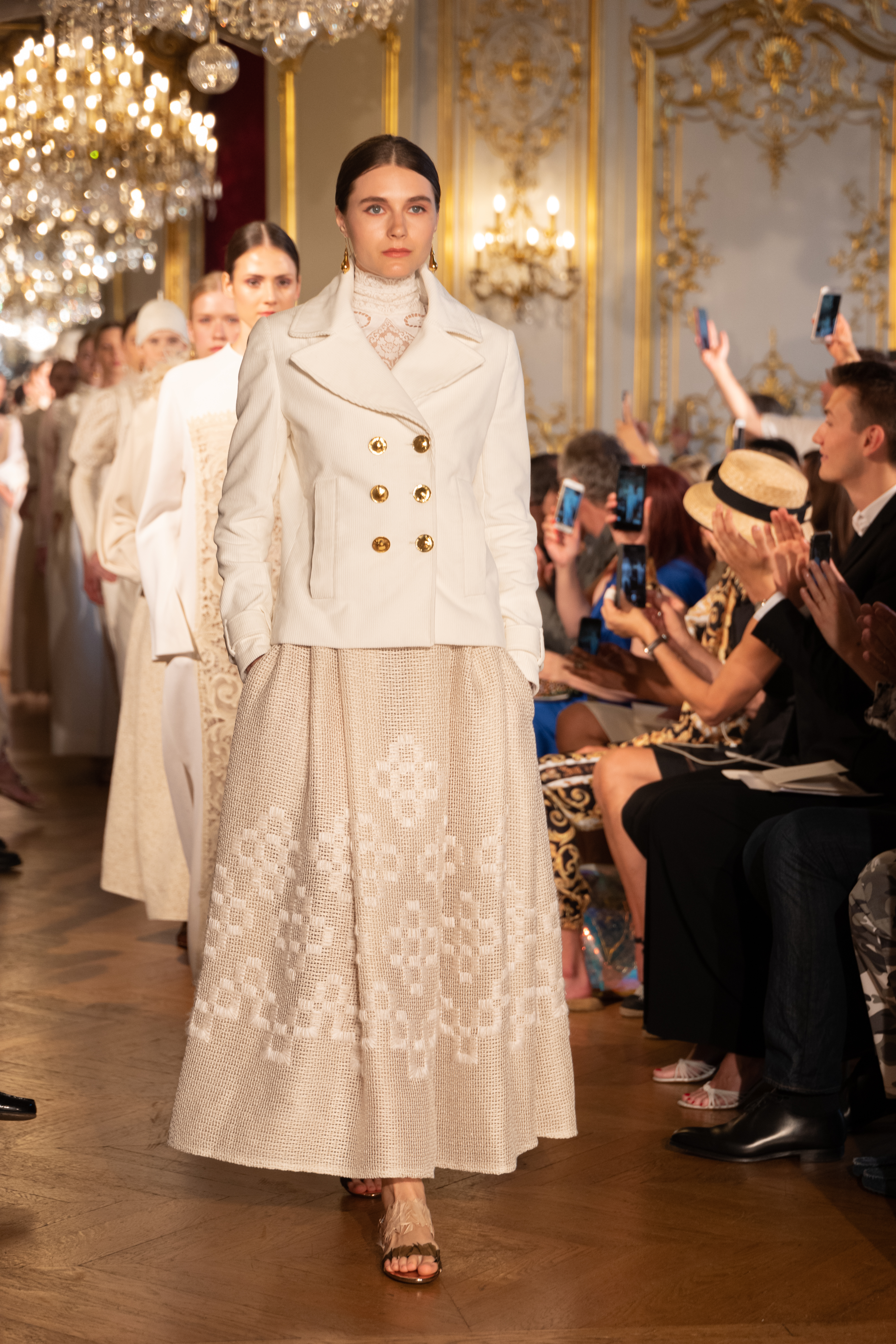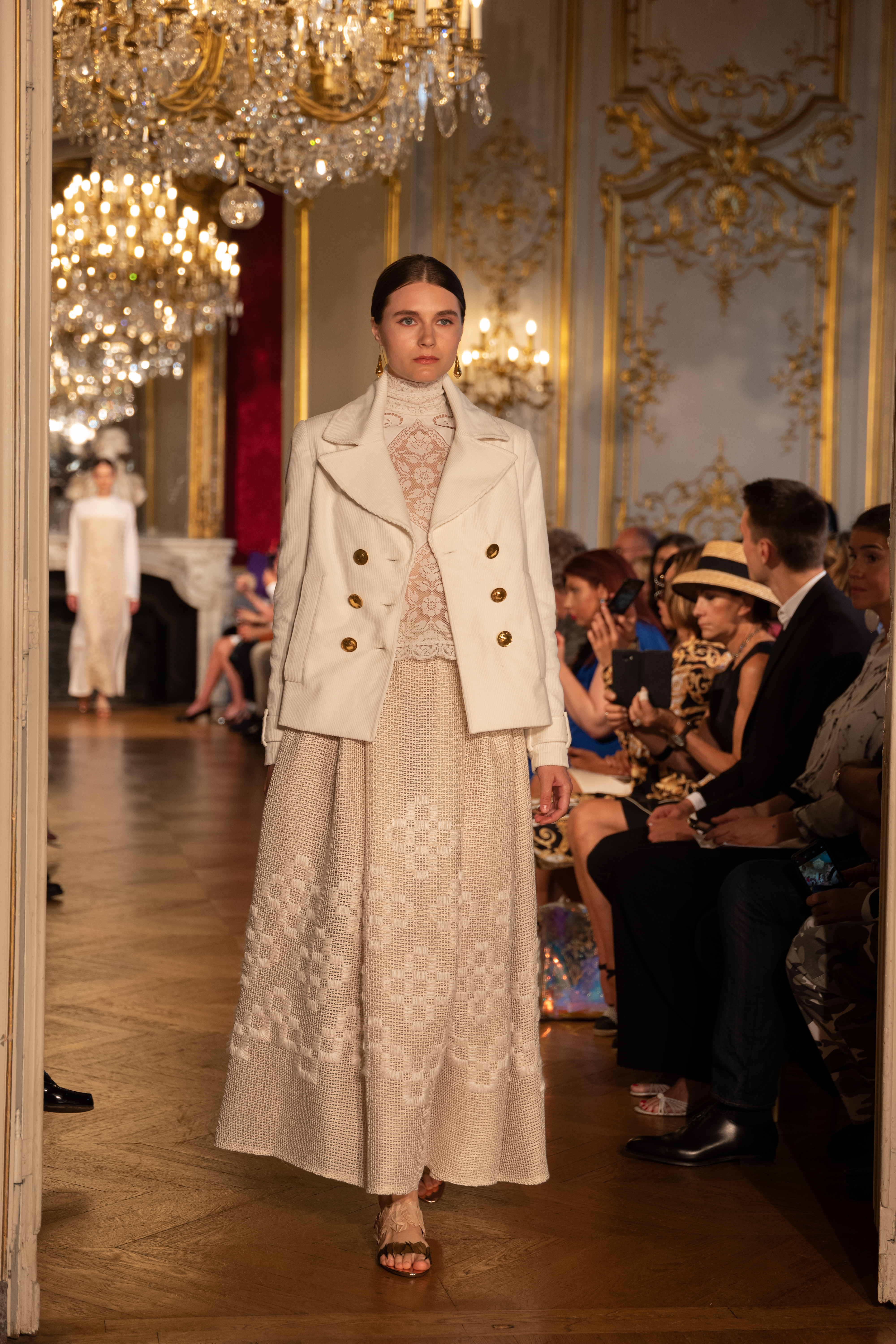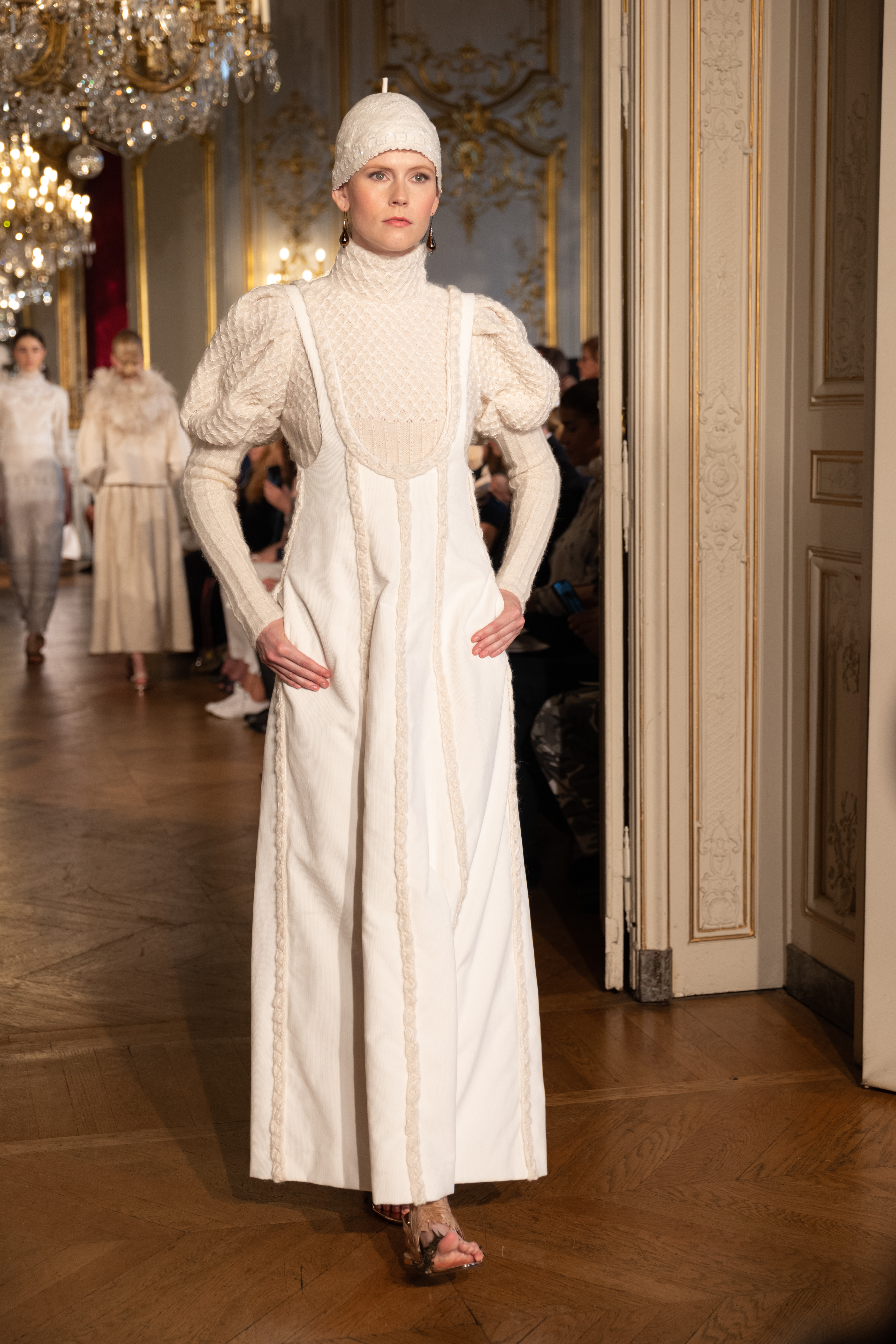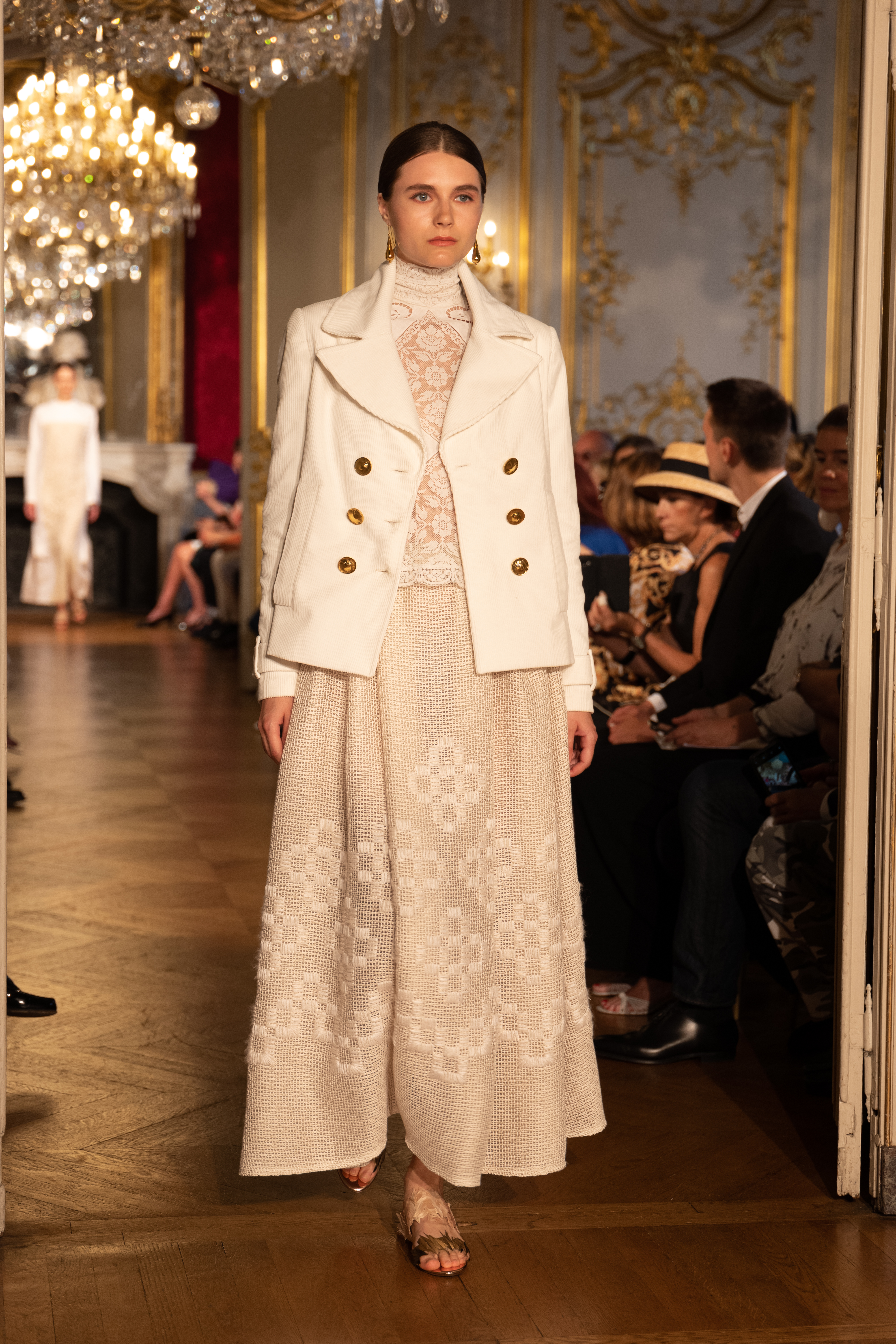 CABAN EN VELOURS BLANC À LARGES CÔTES BLOUSE ÉCRUE EN LIN, BRODERIE RICHELIEU JUPE PAYSANNE EN RÉSILLE DE LIN, BRODERIE DE HARDANGER EN LAINE ROBE DROITE BOUTONNÉE ASYMÉTRIQUE EN CRÊPE DE LAINE CRAIE, INCRUSTÉE D’UN LONG PLASTRON EN GUIPURE BEIGE. ROBE EN VOILE DE LAINE FEUTRÉE CALCAIRE, REBRODÉE DE SOIE GIVRÉE. PULL D’ORGANZA ALBÂTRE REBRODÉ DE CHENILLES DE SOIE. JUPE TAILLE HAUTE EN LAINE FEUTRÉE REBRODÉE DE ROSEAUX DE SOIE ET DE CUIR MÉTALLISÉ BRUN DE MARS. SWEAT GRÈGE, CAPUCHE BRODÉE DE PLUMES. JUPE NERVURÉE EN TWEED IVOIRE ET MICA DORÉ. JUPE EN VELOURS MILLERAIES BLANC, COUTURÉE AU FIL DE LAINE ÉCRU. PULL EN ALPAGA PÂLE IVOIRE À MANCHES SMOCKÉES DE SOIE BLANCHE. BLOUSE EN CIGALINE BLANCHE, POIGNETS TUYAUX D’ORGUES. JUPE À LARGES PLIS EN CIGALINE BLANCHE BRASSIÈRE DE TULLE BRODÉ DE GUIPURES ET DENTELLES. LONGUE ROBE ÉCHARPE EN ORGANZA CRÉPONNÉ TERRE D’OMBRE JUPE TUYAUX D’ORGUES, CEINTURÉE DE LAINE BOURGOGNE. LONGUE ROBE CEINTURÉE EN RÉSILLE DE LIN SEIGLE, PLASTRON BRODÉ DE TULLE ET ÉCLATS D’OR. ROBE DE BERGER EN MOHAIR NATUREL, CEINTURÉE DE CLOUS BIJOUX. ROBE CACHE CŒUR EN SATIN CUIR BRONZE. ROBE ÉTUI ASYMÉTRIQUE, PEINTE DE BRANCHAGES MORDORÉS. ROBE EN RÉSILLE DE LIN BLANC, REBRODÉE DE PASSEMENTERIE CHENILLÉE. LONGUE ROBE EN MAILLE CASHMERE ET COTON MÉTALLISÉ, SOULIGNÉE DE FRANGES ARGENTÉES. ROBE BUSTIER EN SATIN CUIR TAUPÉ, JEUX DE PLIS ET POCHES BESACES