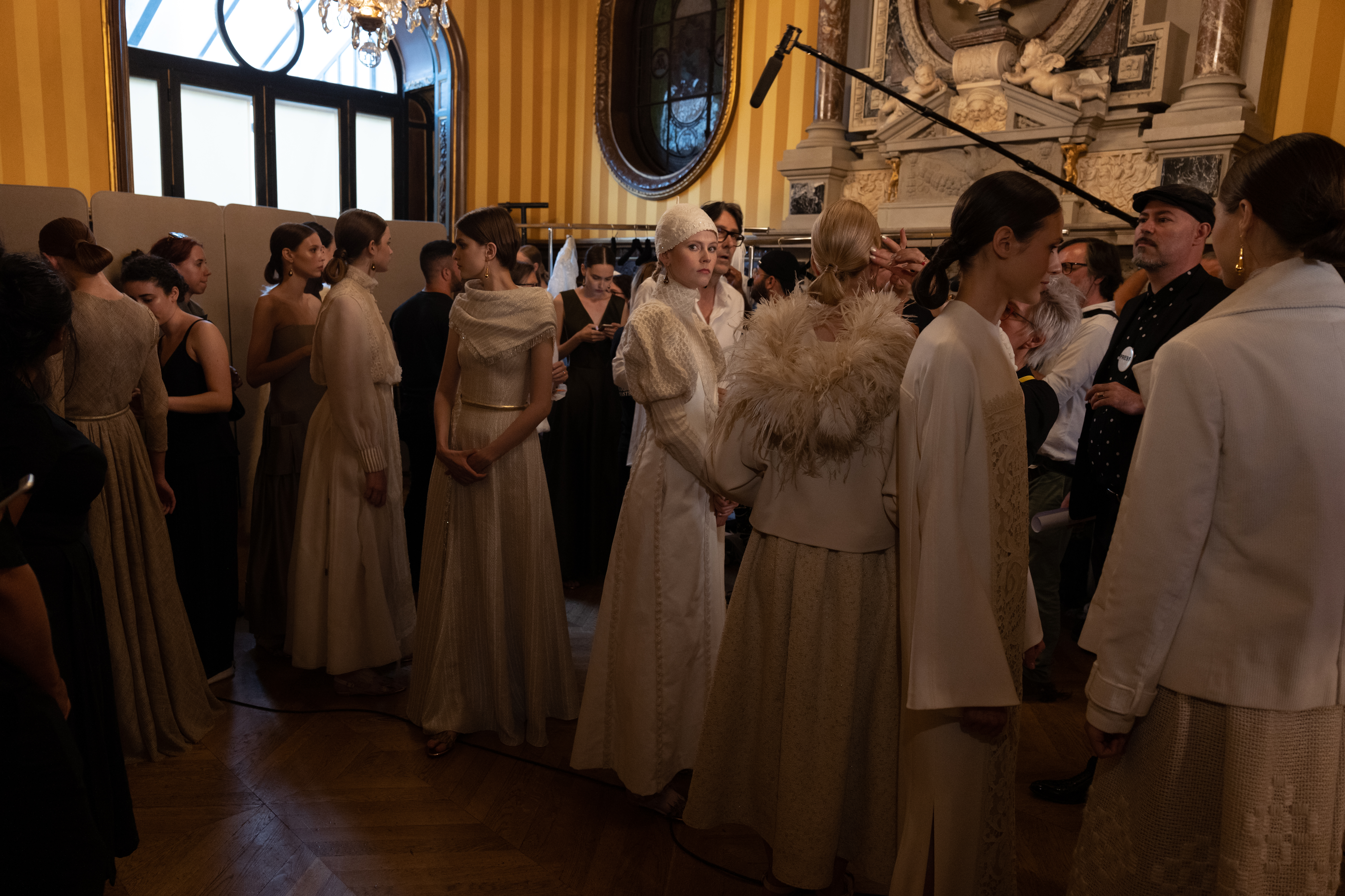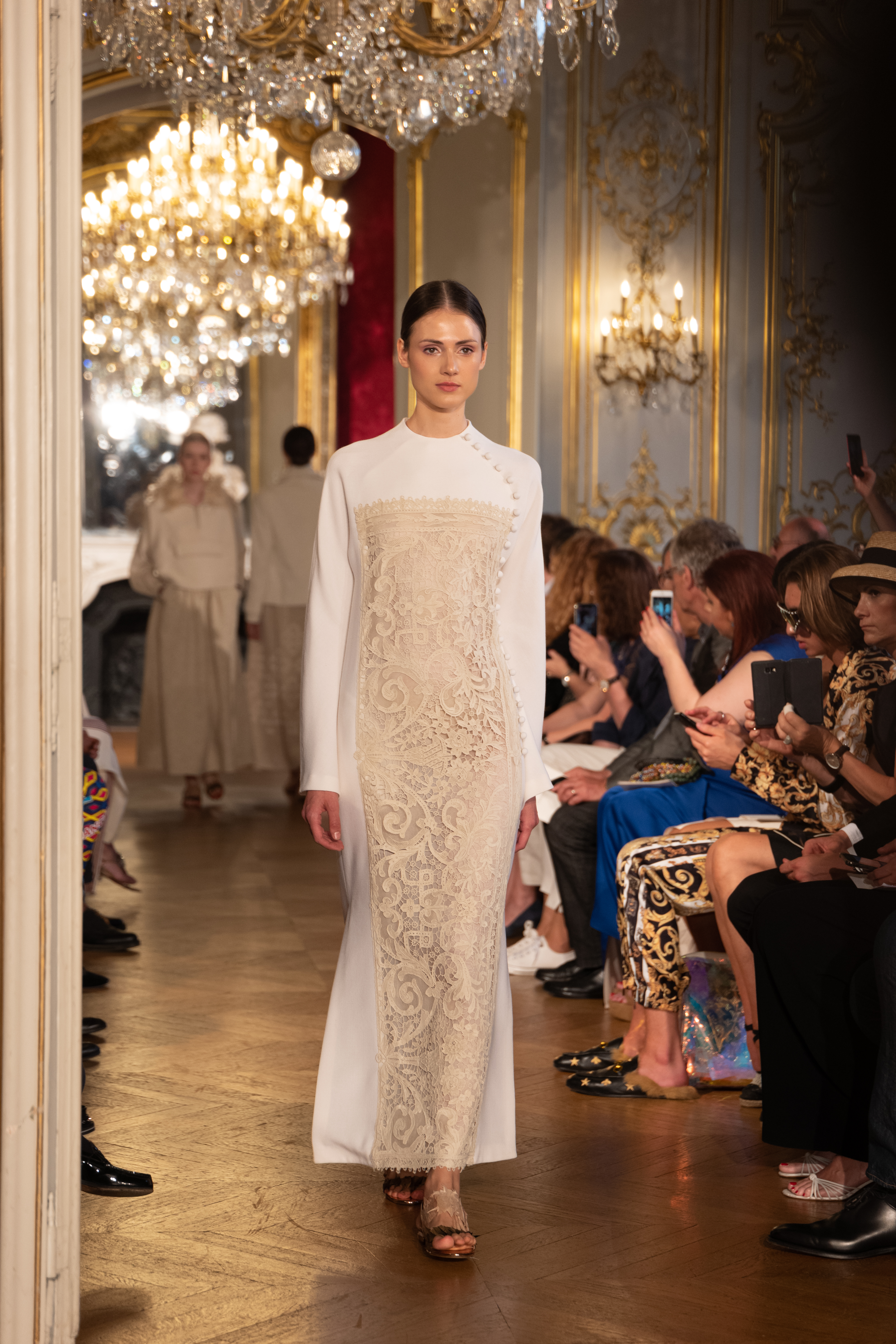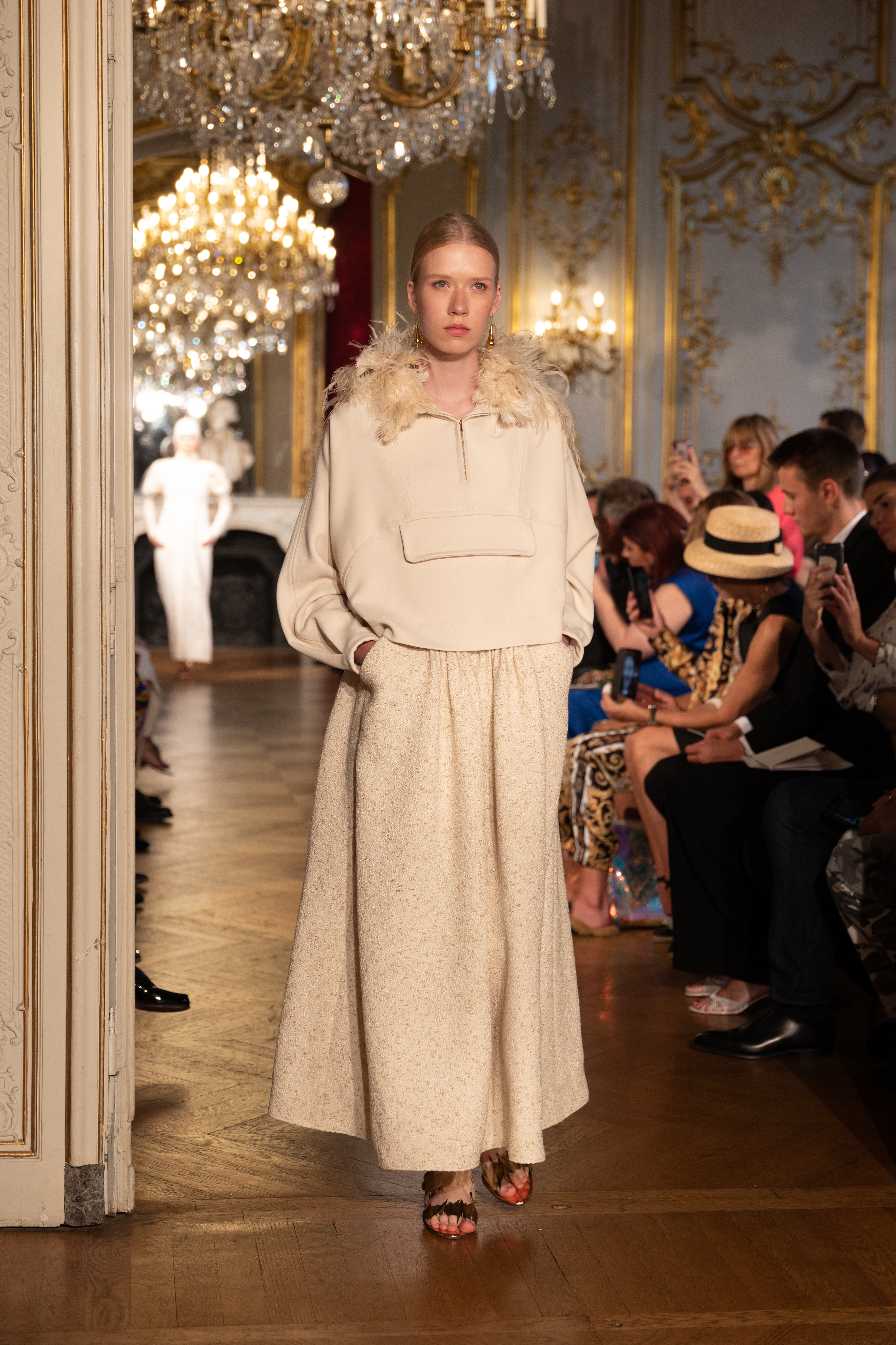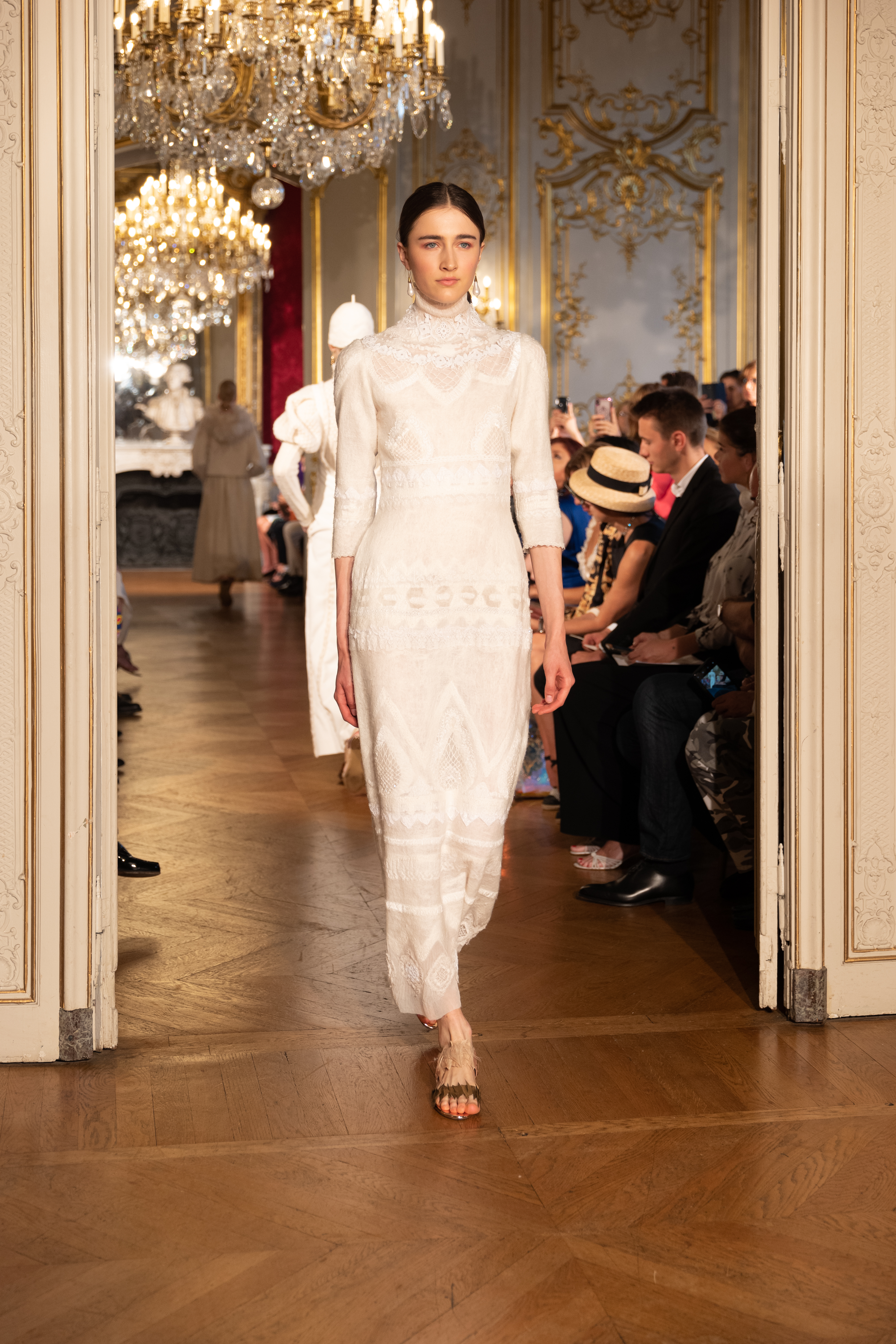 CABAN EN VELOURS BLANC À LARGES CÔTES BLOUSE ÉCRUE EN LIN, BRODERIE RICHELIEU JUPE PAYSANNE EN RÉSILLE DE LIN, BRODERIE DE HARDANGER EN LAINE ROBE DROITE BOUTONNÉE ASYMÉTRIQUE EN CRÊPE DE LAINE CRAIE, INCRUSTÉE D’UN LONG PLASTRON EN GUIPURE BEIGE. ROBE EN VOILE DE LAINE FEUTRÉE CALCAIRE, REBRODÉE DE SOIE GIVRÉE. PULL D’ORGANZA ALBÂTRE REBRODÉ DE CHENILLES DE SOIE. JUPE TAILLE HAUTE EN LAINE FEUTRÉE REBRODÉE DE ROSEAUX DE SOIE ET DE CUIR MÉTALLISÉ BRUN DE MARS. SWEAT GRÈGE, CAPUCHE BRODÉE DE PLUMES. JUPE NERVURÉE EN TWEED IVOIRE ET MICA DORÉ. JUPE EN VELOURS MILLERAIES BLANC, COUTURÉE AU FIL DE LAINE ÉCRU. PULL EN ALPAGA PÂLE IVOIRE À MANCHES SMOCKÉES DE SOIE BLANCHE. BLOUSE EN CIGALINE BLANCHE, POIGNETS TUYAUX D’ORGUES. JUPE À LARGES PLIS EN CIGALINE BLANCHE BRASSIÈRE DE TULLE BRODÉ DE GUIPURES ET DENTELLES. LONGUE ROBE ÉCHARPE EN ORGANZA CRÉPONNÉ TERRE D’OMBRE JUPE TUYAUX D’ORGUES, CEINTURÉE DE LAINE BOURGOGNE. LONGUE ROBE CEINTURÉE EN RÉSILLE DE LIN SEIGLE, PLASTRON BRODÉ DE TULLE ET ÉCLATS D’OR. ROBE DE BERGER EN MOHAIR NATUREL, CEINTURÉE DE CLOUS BIJOUX. ROBE CACHE CŒUR EN SATIN CUIR BRONZE. ROBE ÉTUI ASYMÉTRIQUE, PEINTE DE BRANCHAGES MORDORÉS. ROBE EN RÉSILLE DE LIN BLANC, REBRODÉE DE PASSEMENTERIE CHENILLÉE. LONGUE ROBE EN MAILLE CASHMERE ET COTON MÉTALLISÉ, SOULIGNÉE DE FRANGES ARGENTÉES. ROBE BUSTIER EN SATIN CUIR TAUPÉ, JEUX DE PLIS ET POCHES BESACES