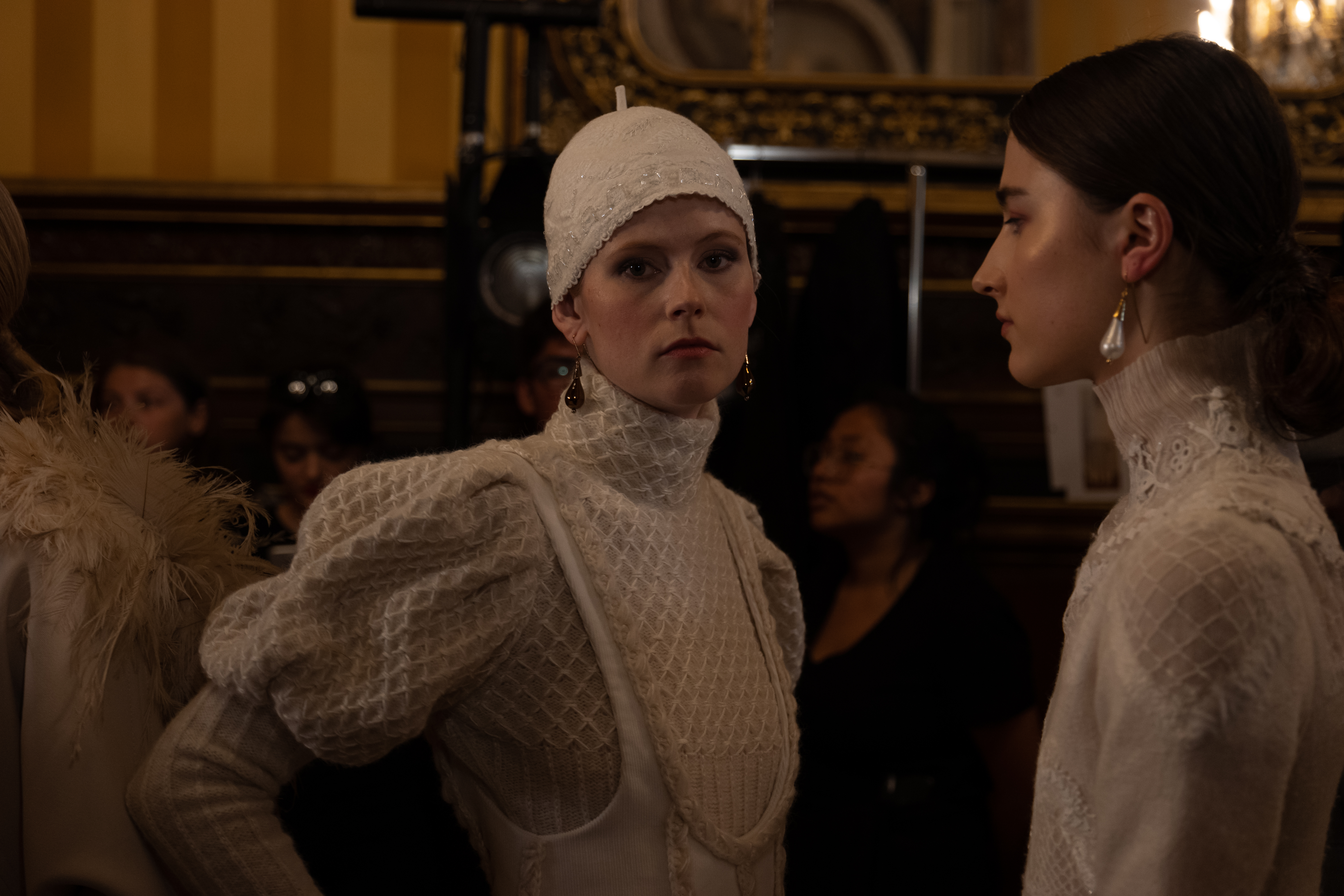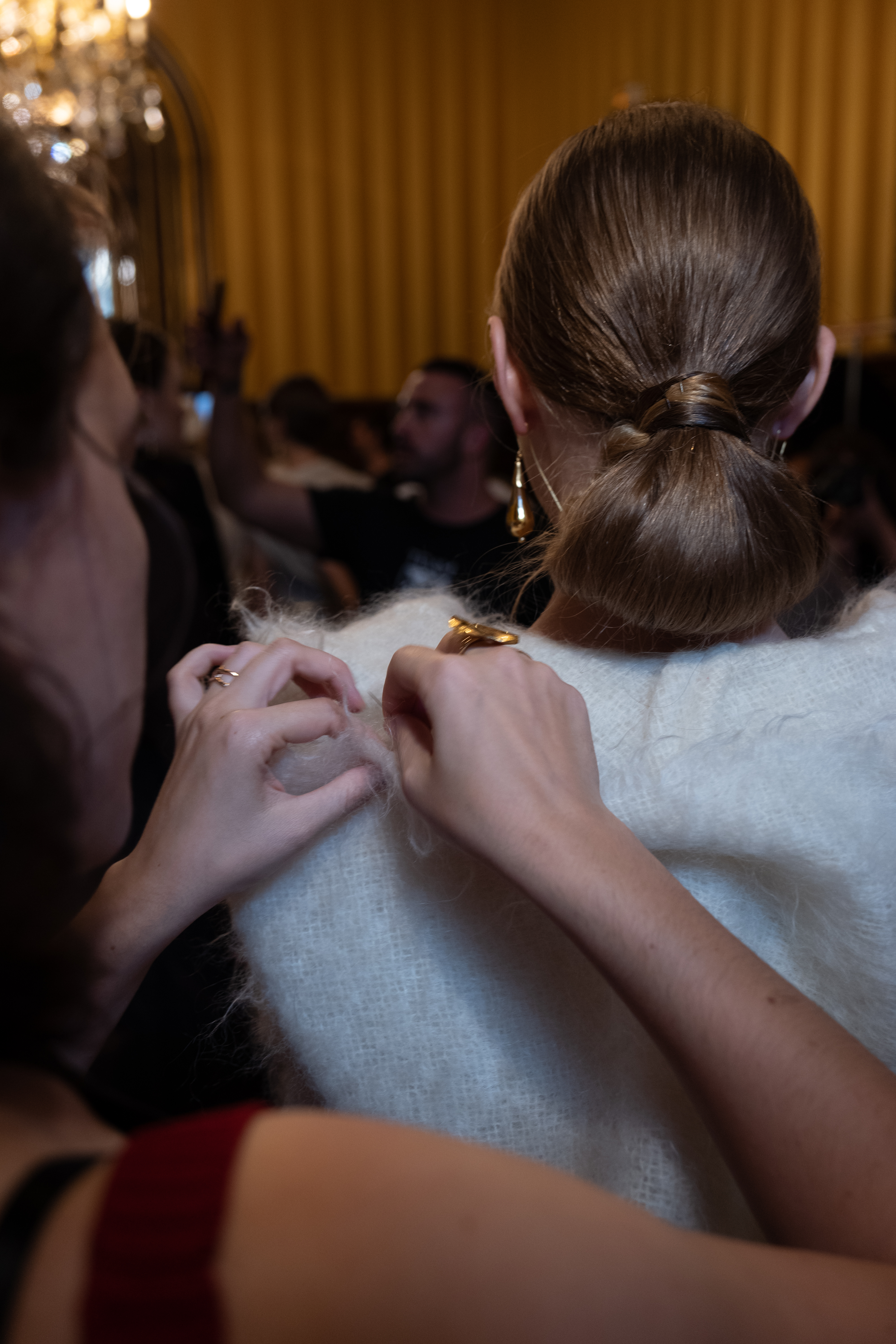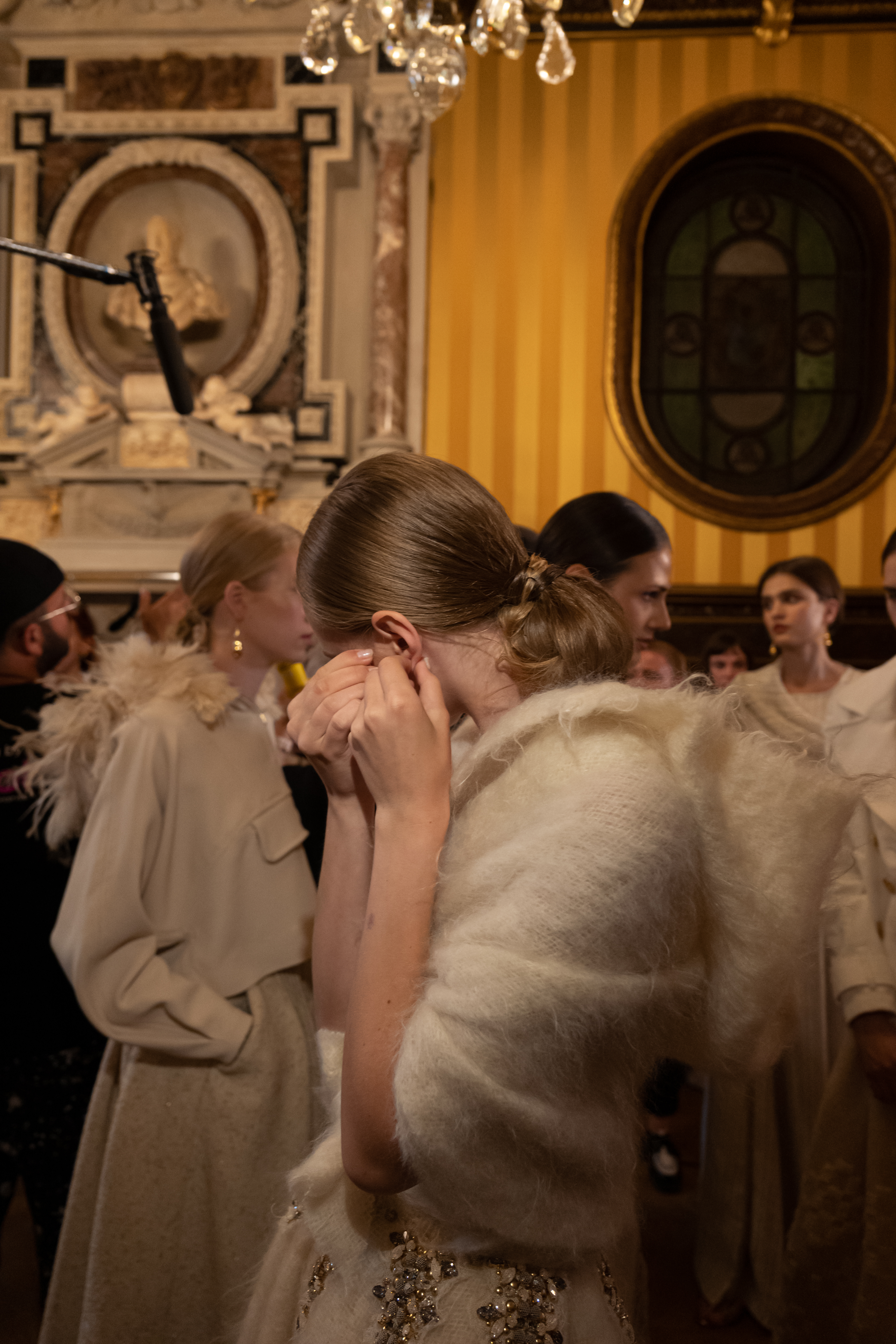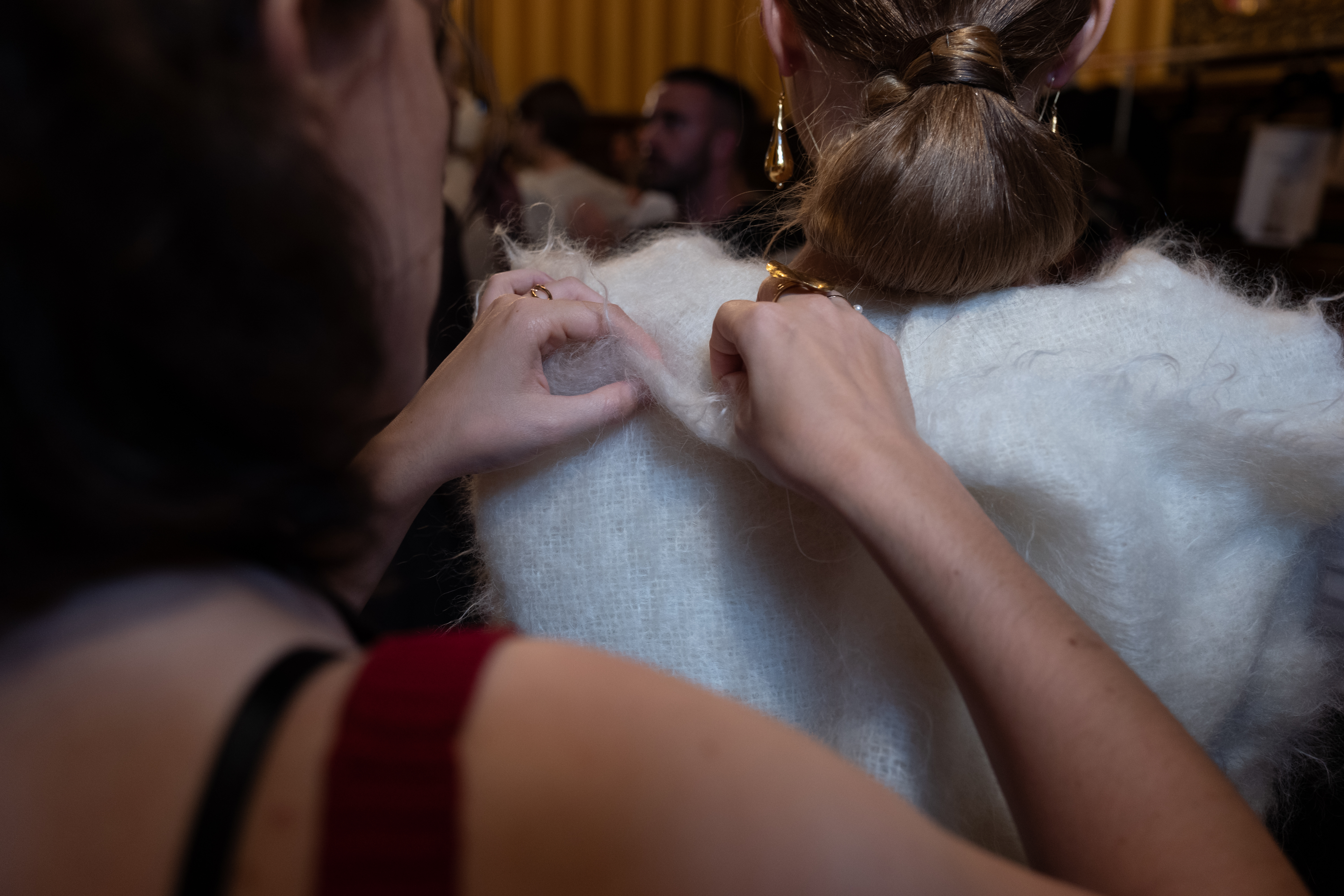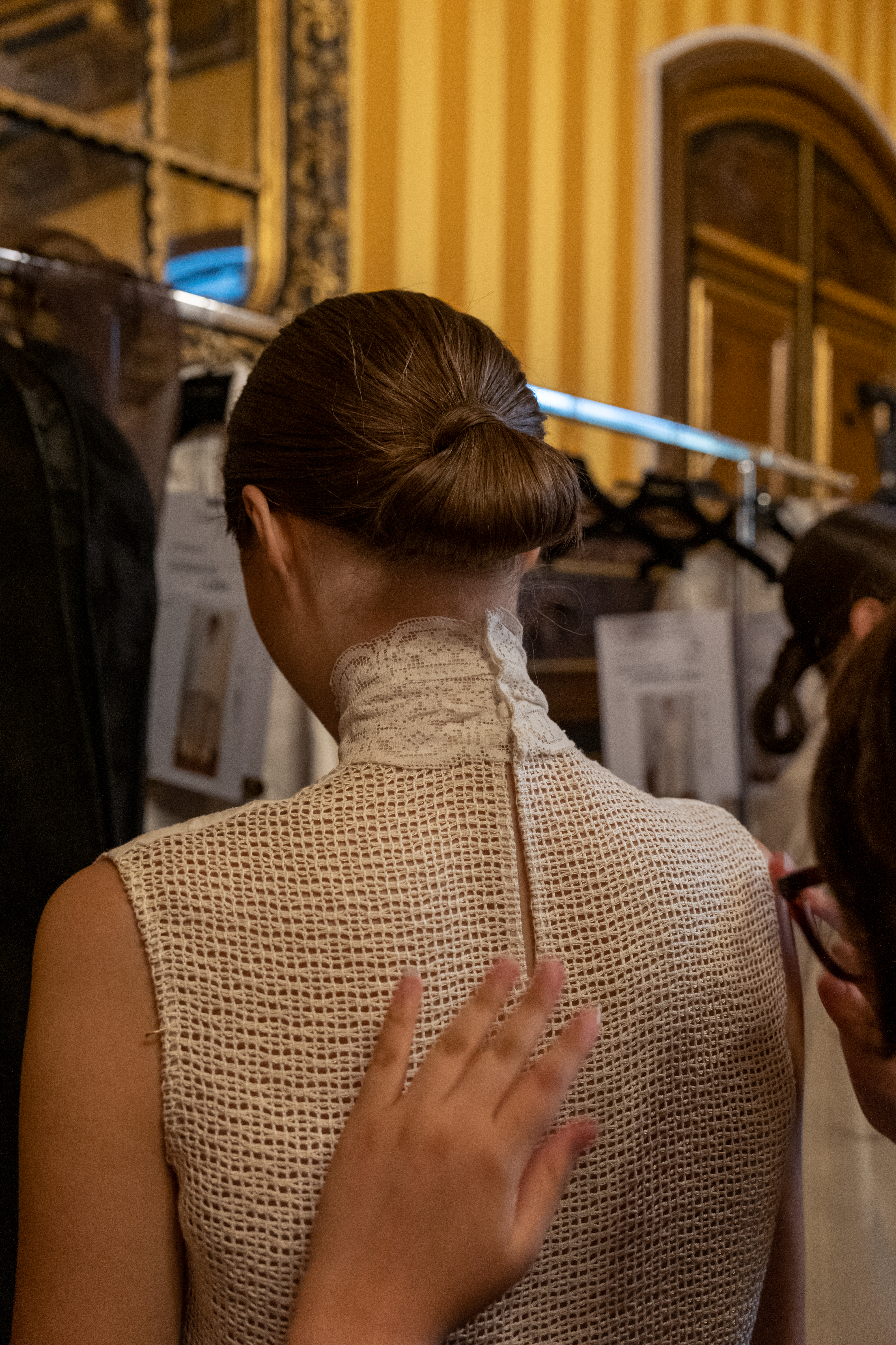 CABAN EN VELOURS BLANC À LARGES CÔTES BLOUSE ÉCRUE EN LIN, BRODERIE RICHELIEU JUPE PAYSANNE EN RÉSILLE DE LIN, BRODERIE DE HARDANGER EN LAINE ROBE DROITE BOUTONNÉE ASYMÉTRIQUE EN CRÊPE DE LAINE CRAIE, INCRUSTÉE D’UN LONG PLASTRON EN GUIPURE BEIGE. ROBE EN VOILE DE LAINE FEUTRÉE CALCAIRE, REBRODÉE DE SOIE GIVRÉE. PULL D’ORGANZA ALBÂTRE REBRODÉ DE CHENILLES DE SOIE. JUPE TAILLE HAUTE EN LAINE FEUTRÉE REBRODÉE DE ROSEAUX DE SOIE ET DE CUIR MÉTALLISÉ BRUN DE MARS. SWEAT GRÈGE, CAPUCHE BRODÉE DE PLUMES. JUPE NERVURÉE EN TWEED IVOIRE ET MICA DORÉ. JUPE EN VELOURS MILLERAIES BLANC, COUTURÉE AU FIL DE LAINE ÉCRU. PULL EN ALPAGA PÂLE IVOIRE À MANCHES SMOCKÉES DE SOIE BLANCHE. BLOUSE EN CIGALINE BLANCHE, POIGNETS TUYAUX D’ORGUES. JUPE À LARGES PLIS EN CIGALINE BLANCHE BRASSIÈRE DE TULLE BRODÉ DE GUIPURES ET DENTELLES. LONGUE ROBE ÉCHARPE EN ORGANZA CRÉPONNÉ TERRE D’OMBRE JUPE TUYAUX D’ORGUES, CEINTURÉE DE LAINE BOURGOGNE. LONGUE ROBE CEINTURÉE EN RÉSILLE DE LIN SEIGLE, PLASTRON BRODÉ DE TULLE ET ÉCLATS D’OR. ROBE DE BERGER EN MOHAIR NATUREL, CEINTURÉE DE CLOUS BIJOUX. ROBE CACHE CŒUR EN SATIN CUIR BRONZE. ROBE ÉTUI ASYMÉTRIQUE, PEINTE DE BRANCHAGES MORDORÉS. ROBE EN RÉSILLE DE LIN BLANC, REBRODÉE DE PASSEMENTERIE CHENILLÉE. LONGUE ROBE EN MAILLE CASHMERE ET COTON MÉTALLISÉ, SOULIGNÉE DE FRANGES ARGENTÉES. ROBE BUSTIER EN SATIN CUIR TAUPÉ, JEUX DE PLIS ET POCHES BESACES