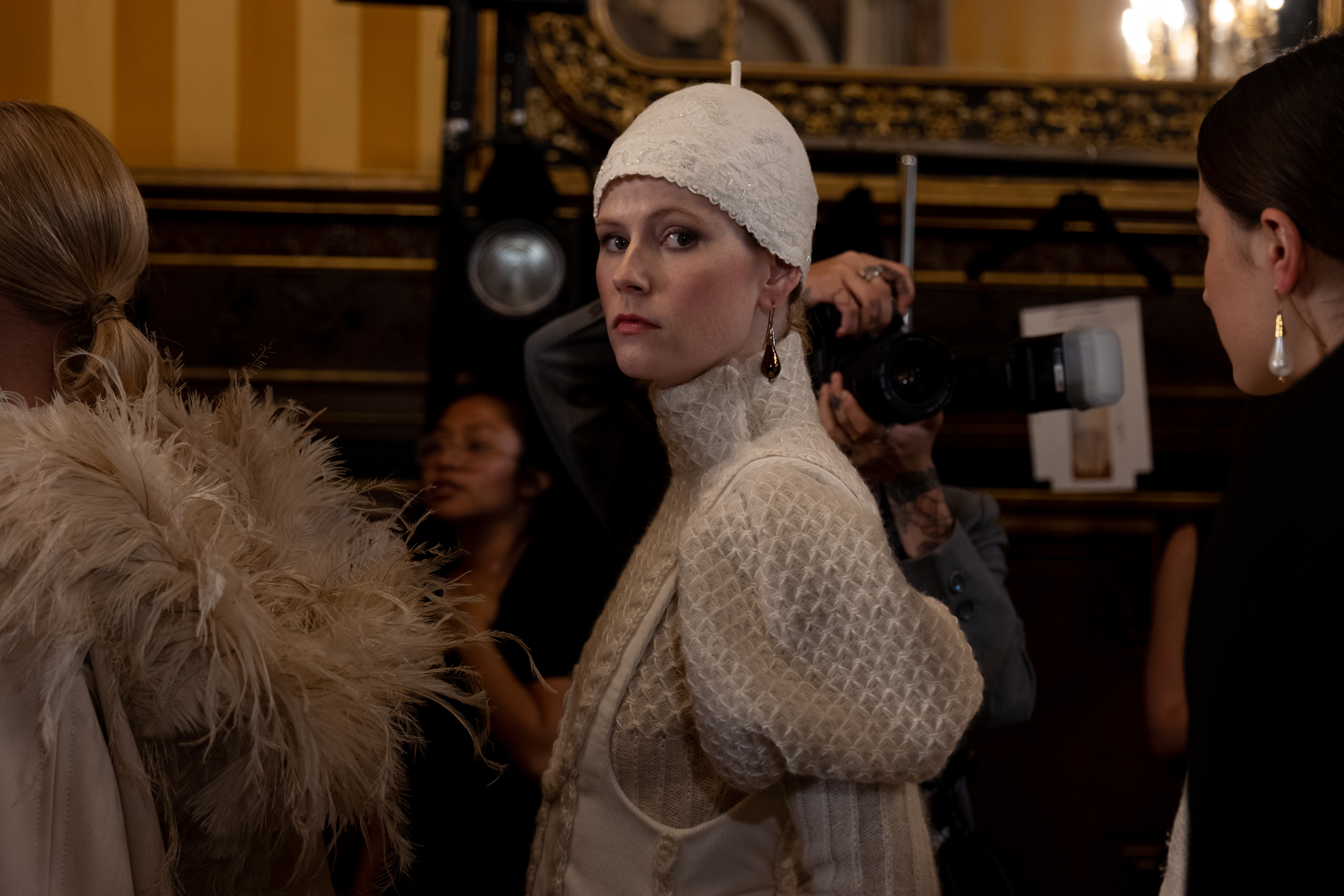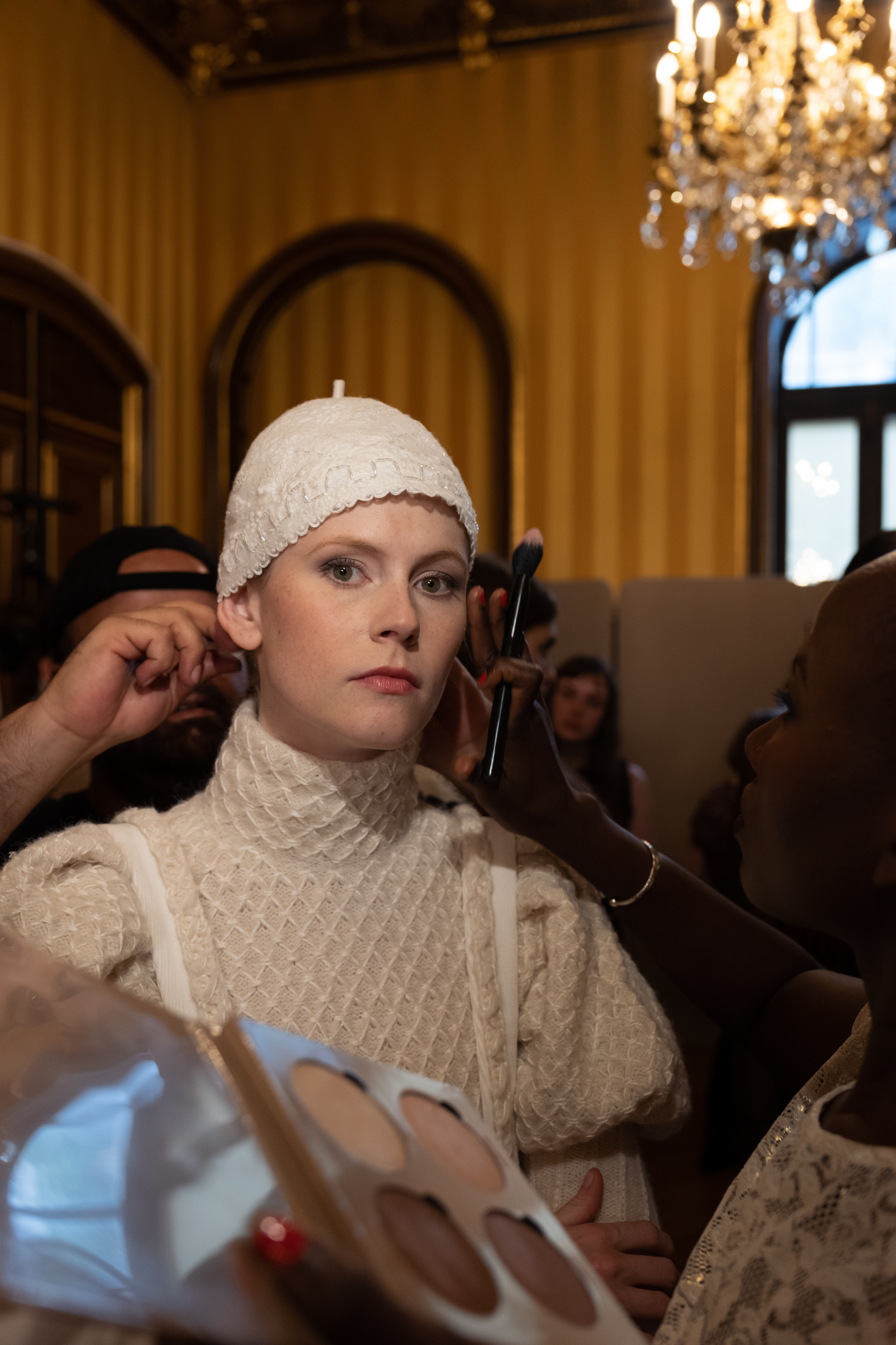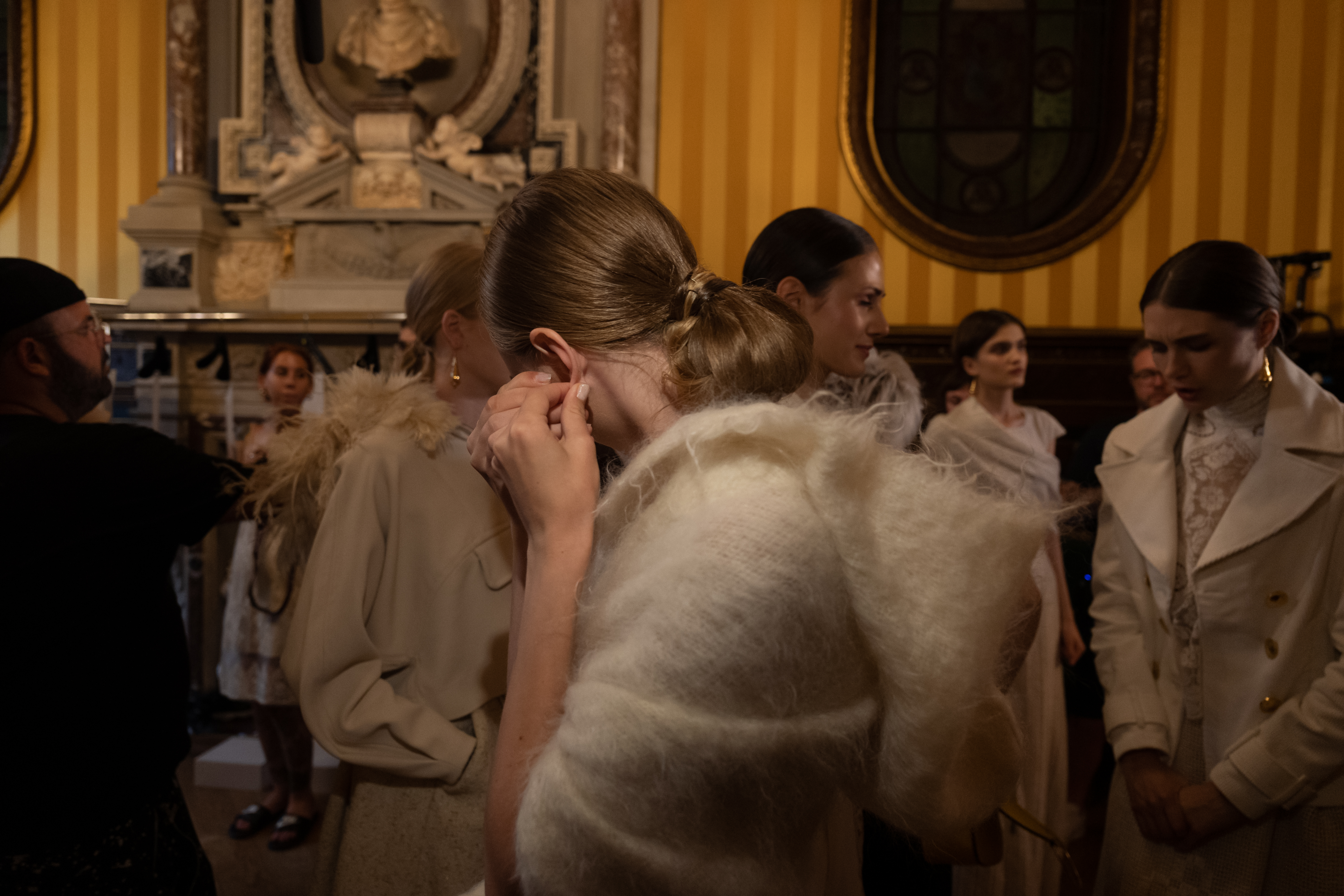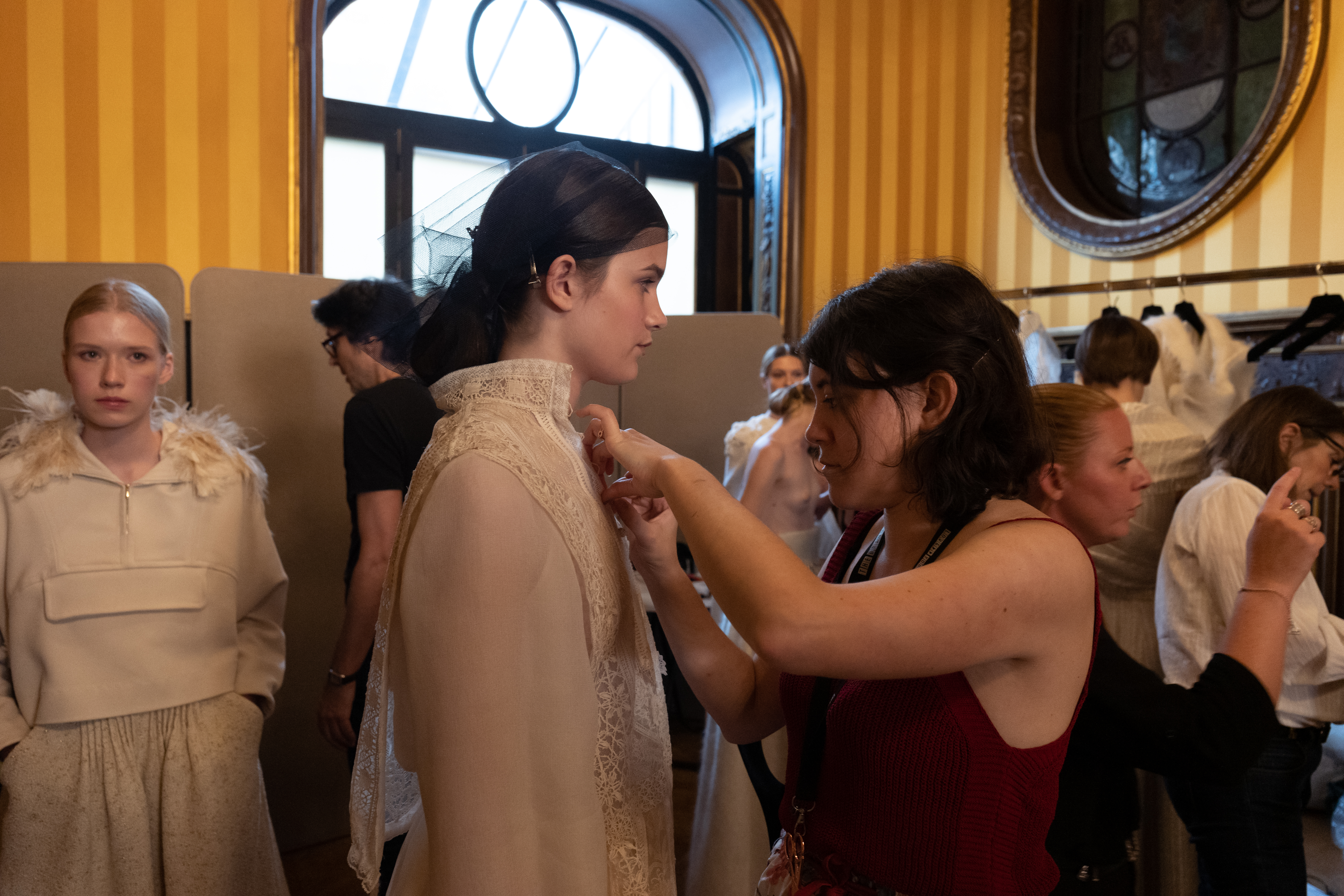 CABAN EN VELOURS BLANC À LARGES CÔTES BLOUSE ÉCRUE EN LIN, BRODERIE RICHELIEU JUPE PAYSANNE EN RÉSILLE DE LIN, BRODERIE DE HARDANGER EN LAINE ROBE DROITE BOUTONNÉE ASYMÉTRIQUE EN CRÊPE DE LAINE CRAIE, INCRUSTÉE D’UN LONG PLASTRON EN GUIPURE BEIGE. ROBE EN VOILE DE LAINE FEUTRÉE CALCAIRE, REBRODÉE DE SOIE GIVRÉE. PULL D’ORGANZA ALBÂTRE REBRODÉ DE CHENILLES DE SOIE. JUPE TAILLE HAUTE EN LAINE FEUTRÉE REBRODÉE DE ROSEAUX DE SOIE ET DE CUIR MÉTALLISÉ BRUN DE MARS. SWEAT GRÈGE, CAPUCHE BRODÉE DE PLUMES. JUPE NERVURÉE EN TWEED IVOIRE ET MICA DORÉ. JUPE EN VELOURS MILLERAIES BLANC, COUTURÉE AU FIL DE LAINE ÉCRU. PULL EN ALPAGA PÂLE IVOIRE À MANCHES SMOCKÉES DE SOIE BLANCHE. BLOUSE EN CIGALINE BLANCHE, POIGNETS TUYAUX D’ORGUES. JUPE À LARGES PLIS EN CIGALINE BLANCHE BRASSIÈRE DE TULLE BRODÉ DE GUIPURES ET DENTELLES. LONGUE ROBE ÉCHARPE EN ORGANZA CRÉPONNÉ TERRE D’OMBRE JUPE TUYAUX D’ORGUES, CEINTURÉE DE LAINE BOURGOGNE. LONGUE ROBE CEINTURÉE EN RÉSILLE DE LIN SEIGLE, PLASTRON BRODÉ DE TULLE ET ÉCLATS D’OR. ROBE DE BERGER EN MOHAIR NATUREL, CEINTURÉE DE CLOUS BIJOUX. ROBE CACHE CŒUR EN SATIN CUIR BRONZE. ROBE ÉTUI ASYMÉTRIQUE, PEINTE DE BRANCHAGES MORDORÉS. ROBE EN RÉSILLE DE LIN BLANC, REBRODÉE DE PASSEMENTERIE CHENILLÉE. LONGUE ROBE EN MAILLE CASHMERE ET COTON MÉTALLISÉ, SOULIGNÉE DE FRANGES ARGENTÉES. ROBE BUSTIER EN SATIN CUIR TAUPÉ, JEUX DE PLIS ET POCHES BESACES