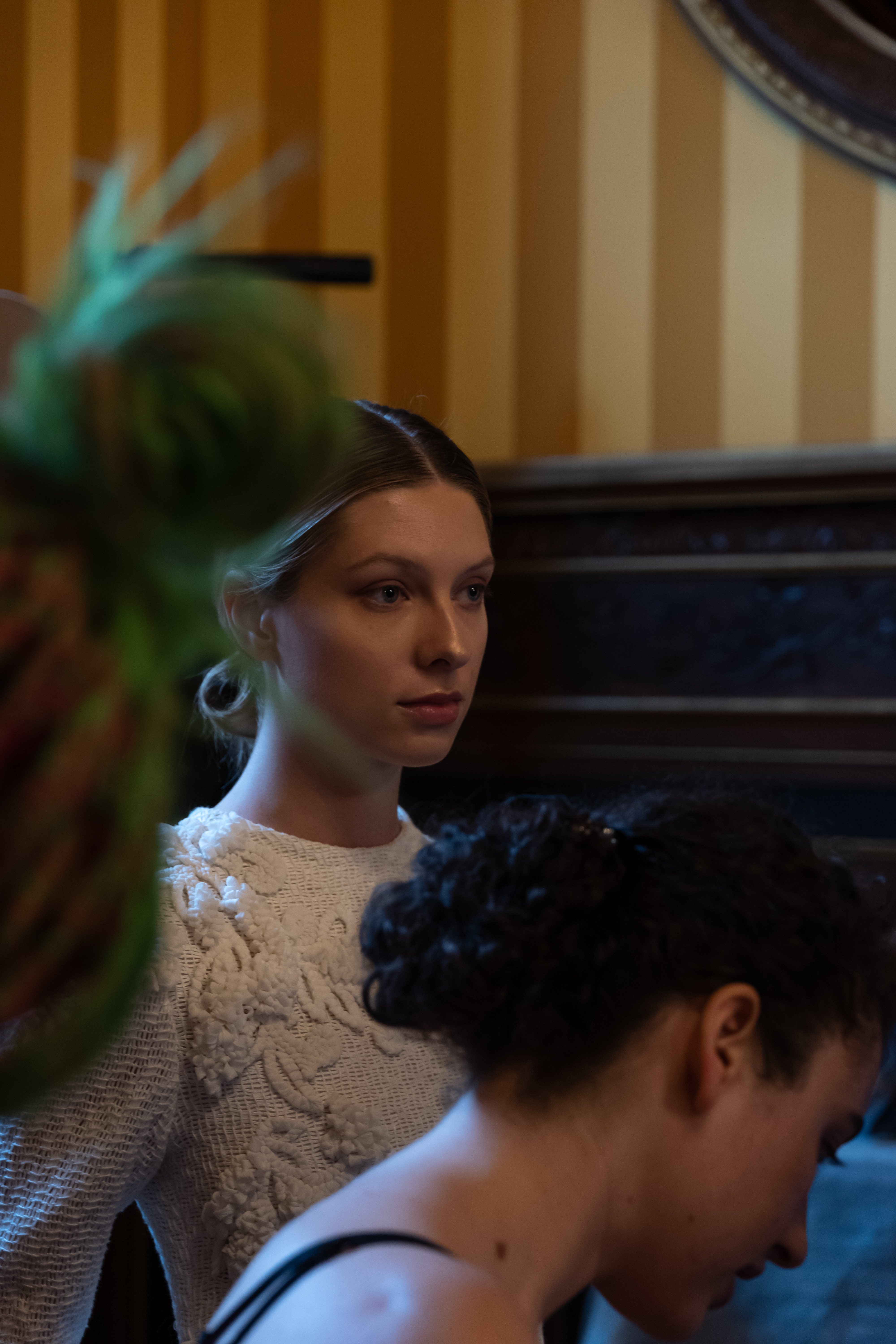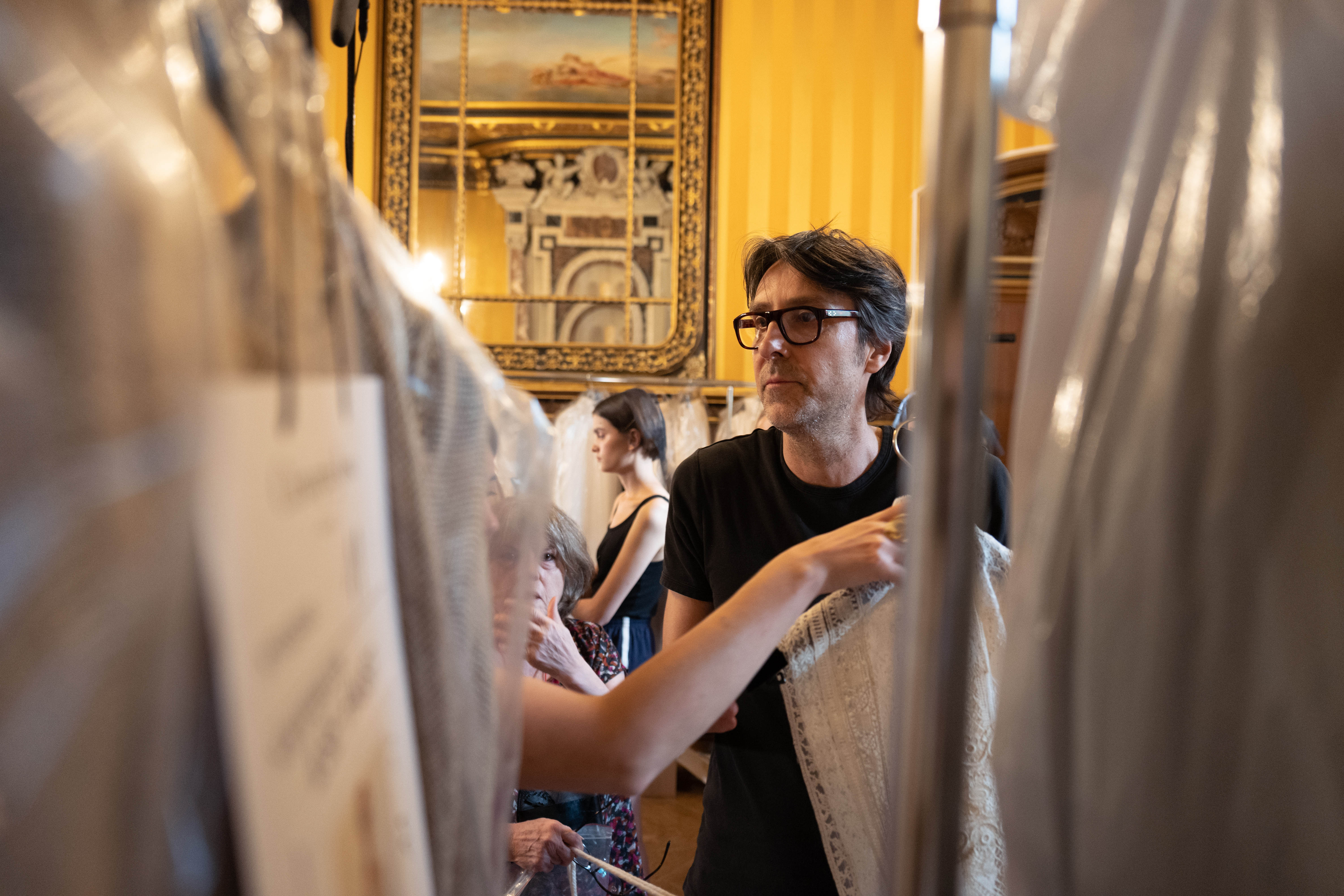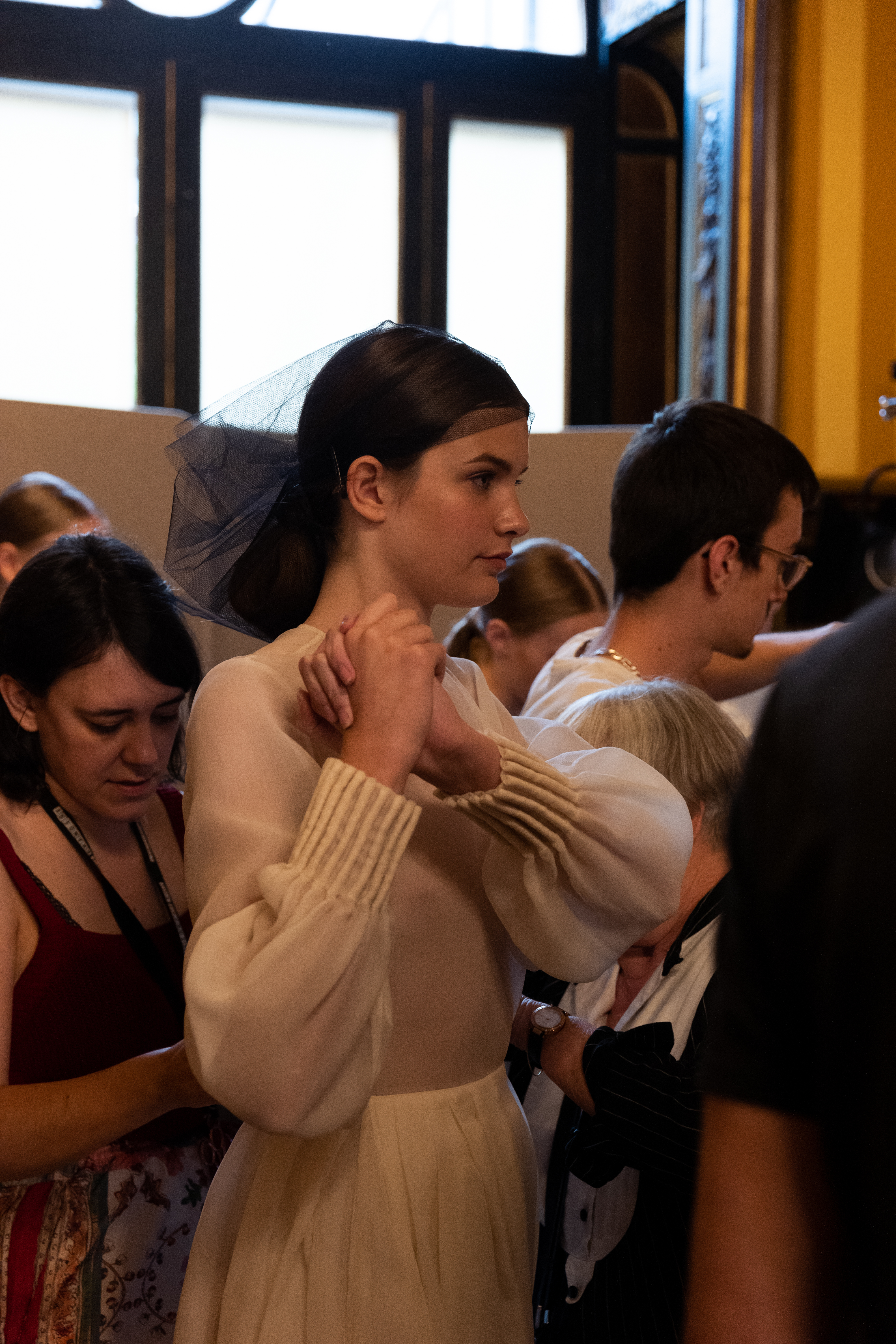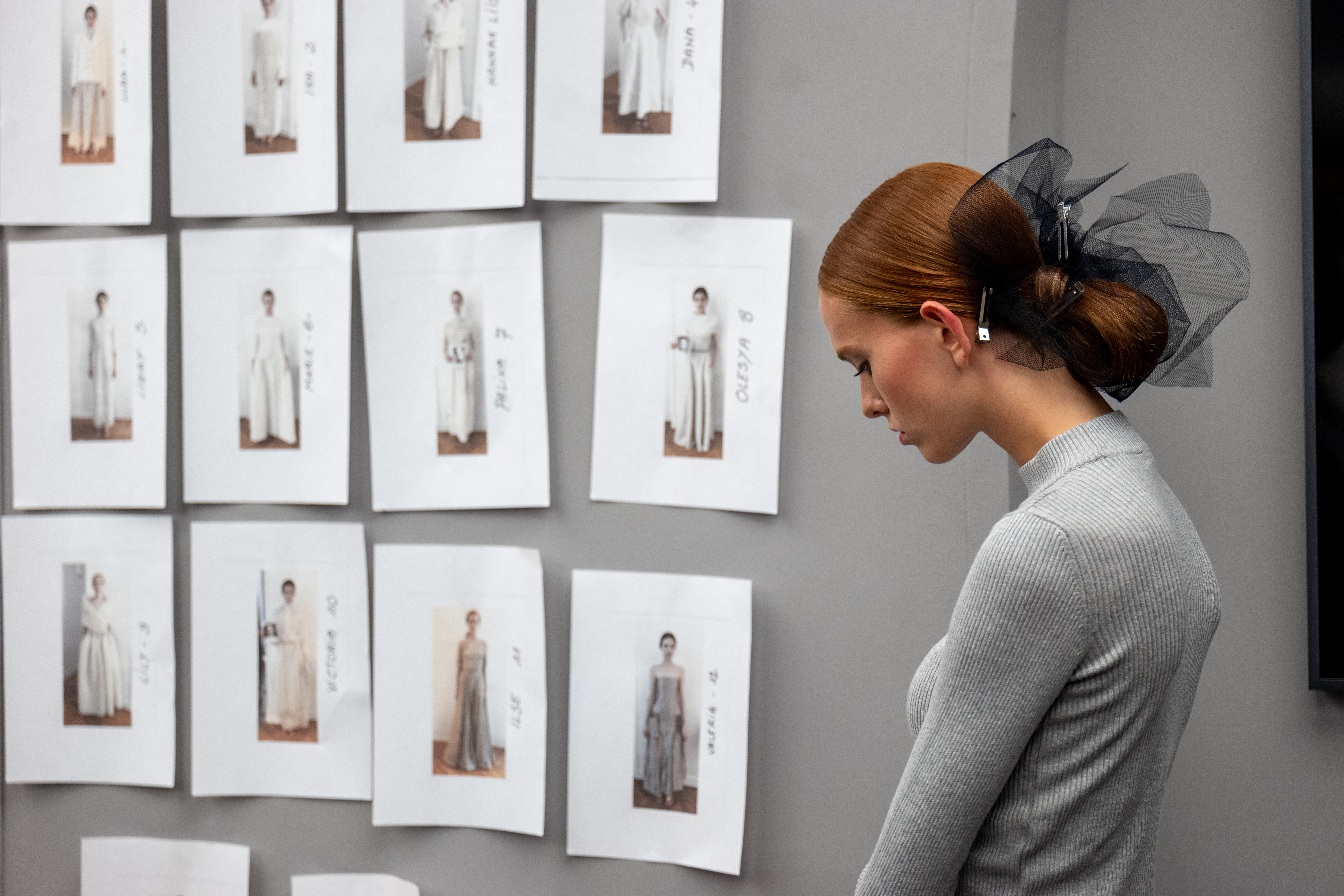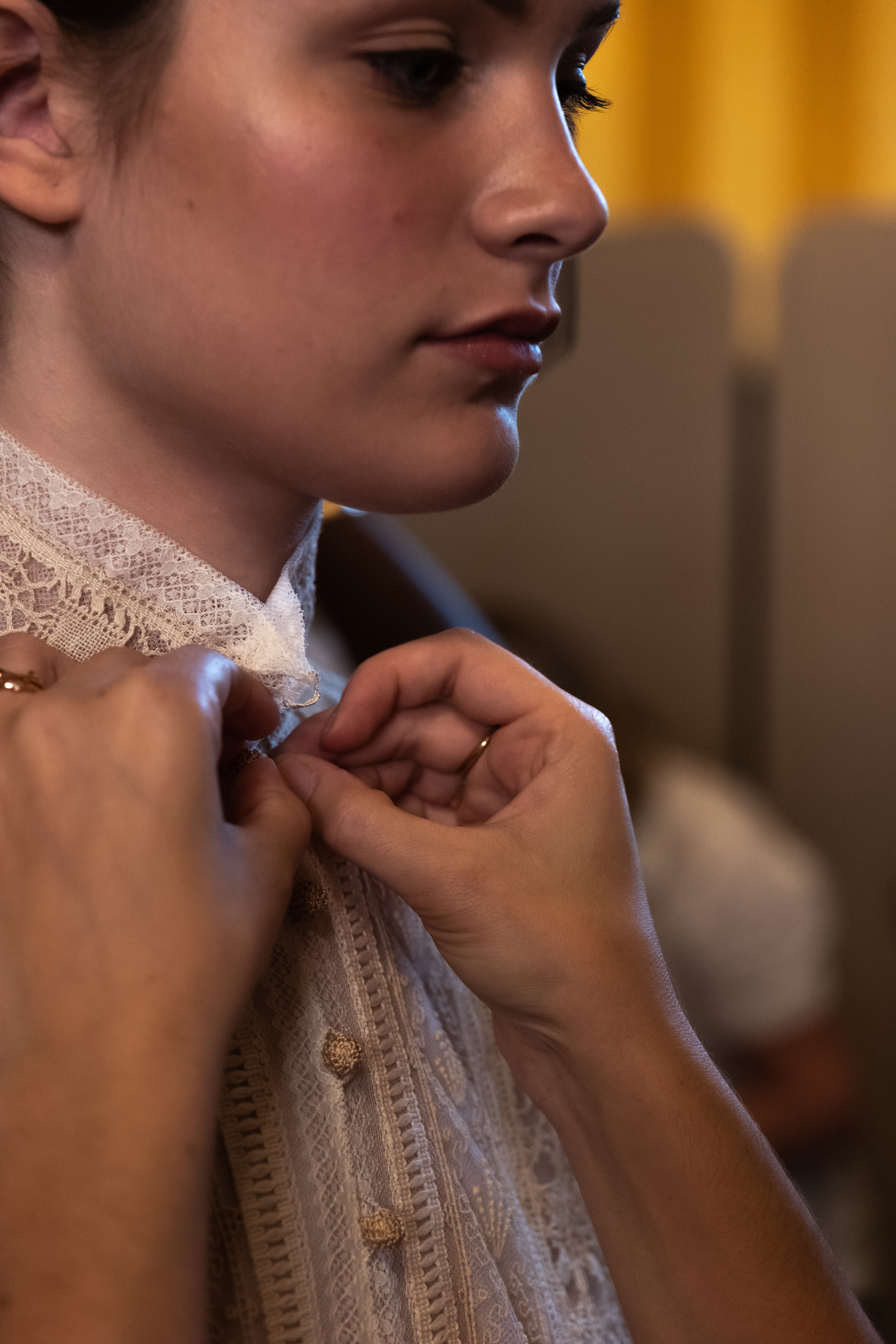 CABAN EN VELOURS BLANC À LARGES CÔTES BLOUSE ÉCRUE EN LIN, BRODERIE RICHELIEU JUPE PAYSANNE EN RÉSILLE DE LIN, BRODERIE DE HARDANGER EN LAINE ROBE DROITE BOUTONNÉE ASYMÉTRIQUE EN CRÊPE DE LAINE CRAIE, INCRUSTÉE D’UN LONG PLASTRON EN GUIPURE BEIGE. ROBE EN VOILE DE LAINE FEUTRÉE CALCAIRE, REBRODÉE DE SOIE GIVRÉE. PULL D’ORGANZA ALBÂTRE REBRODÉ DE CHENILLES DE SOIE. JUPE TAILLE HAUTE EN LAINE FEUTRÉE REBRODÉE DE ROSEAUX DE SOIE ET DE CUIR MÉTALLISÉ BRUN DE MARS. SWEAT GRÈGE, CAPUCHE BRODÉE DE PLUMES. JUPE NERVURÉE EN TWEED IVOIRE ET MICA DORÉ. JUPE EN VELOURS MILLERAIES BLANC, COUTURÉE AU FIL DE LAINE ÉCRU. PULL EN ALPAGA PÂLE IVOIRE À MANCHES SMOCKÉES DE SOIE BLANCHE. BLOUSE EN CIGALINE BLANCHE, POIGNETS TUYAUX D’ORGUES. JUPE À LARGES PLIS EN CIGALINE BLANCHE BRASSIÈRE DE TULLE BRODÉ DE GUIPURES ET DENTELLES. LONGUE ROBE ÉCHARPE EN ORGANZA CRÉPONNÉ TERRE D’OMBRE JUPE TUYAUX D’ORGUES, CEINTURÉE DE LAINE BOURGOGNE. LONGUE ROBE CEINTURÉE EN RÉSILLE DE LIN SEIGLE, PLASTRON BRODÉ DE TULLE ET ÉCLATS D’OR. ROBE DE BERGER EN MOHAIR NATUREL, CEINTURÉE DE CLOUS BIJOUX. ROBE CACHE CŒUR EN SATIN CUIR BRONZE. ROBE ÉTUI ASYMÉTRIQUE, PEINTE DE BRANCHAGES MORDORÉS. ROBE EN RÉSILLE DE LIN BLANC, REBRODÉE DE PASSEMENTERIE CHENILLÉE. LONGUE ROBE EN MAILLE CASHMERE ET COTON MÉTALLISÉ, SOULIGNÉE DE FRANGES ARGENTÉES. ROBE BUSTIER EN SATIN CUIR TAUPÉ, JEUX DE PLIS ET POCHES BESACES