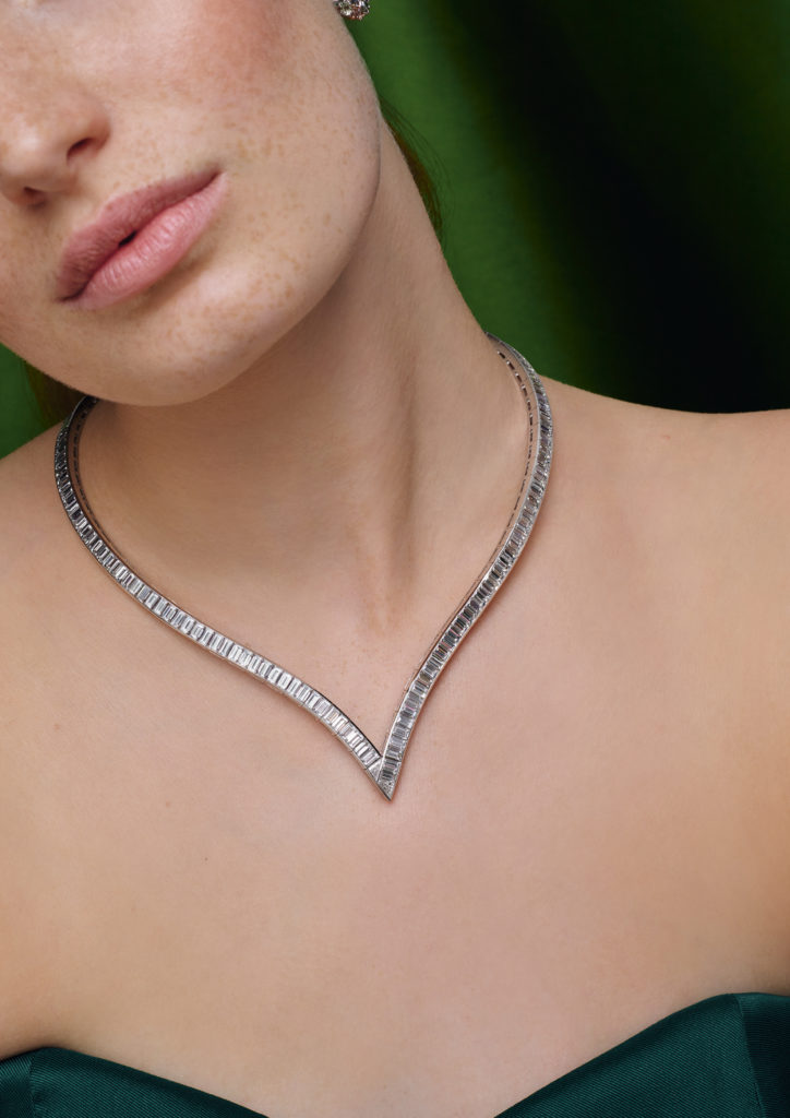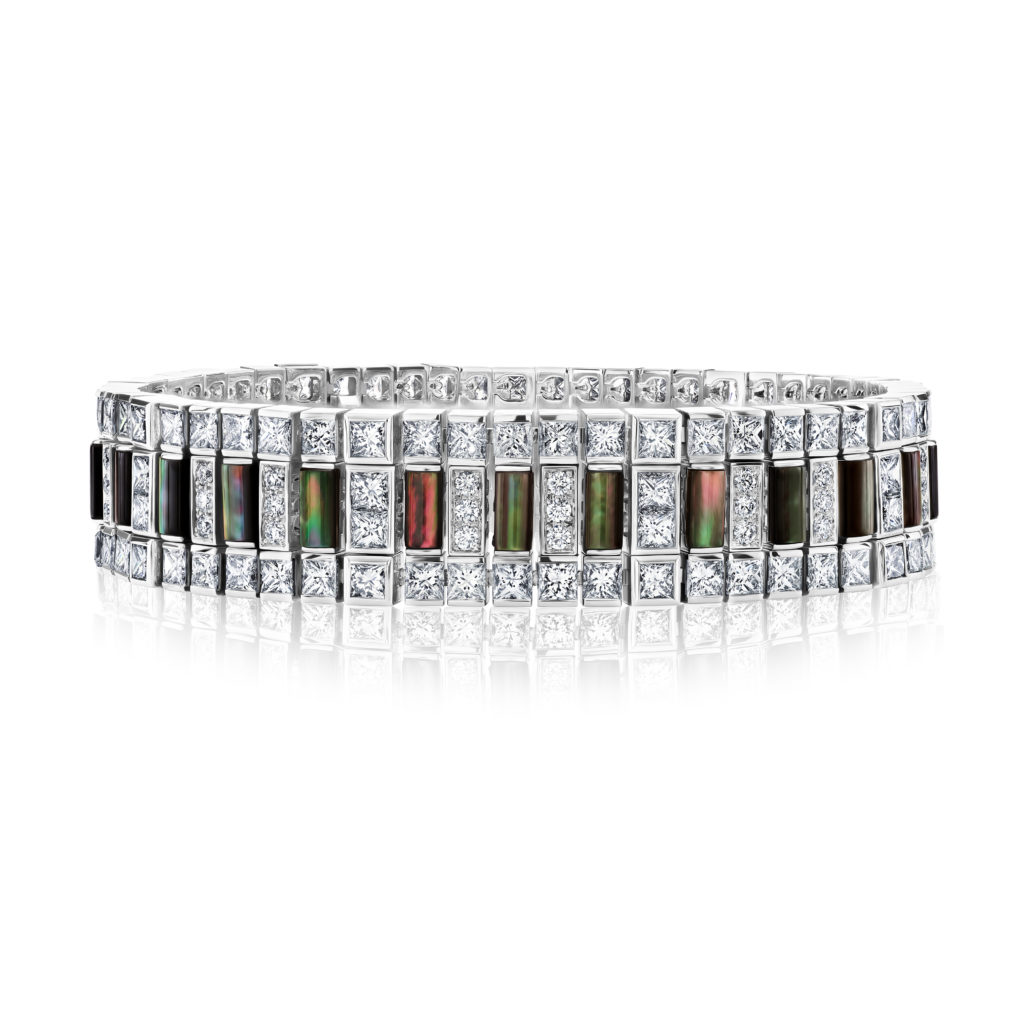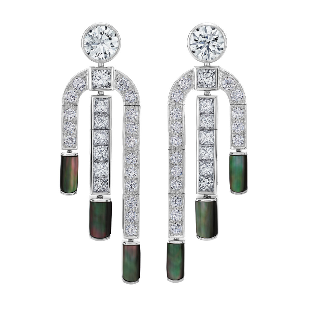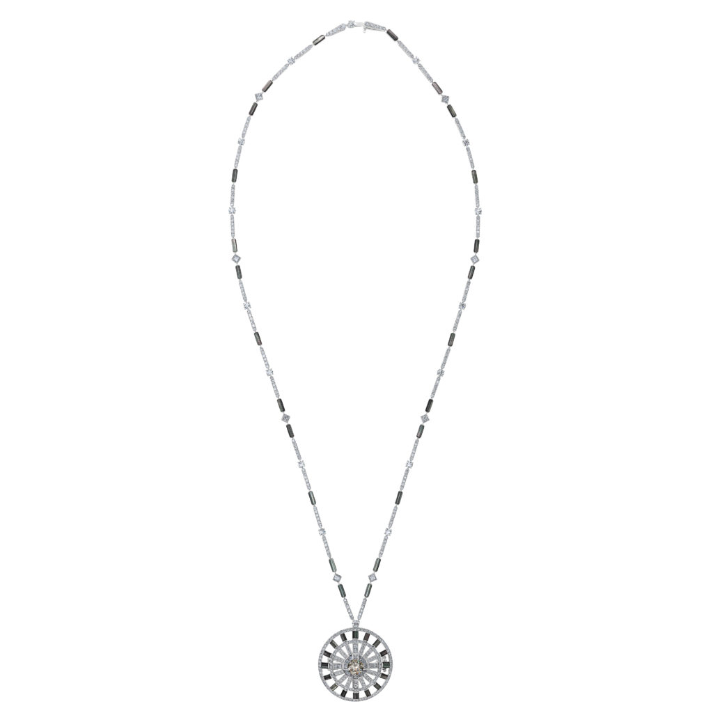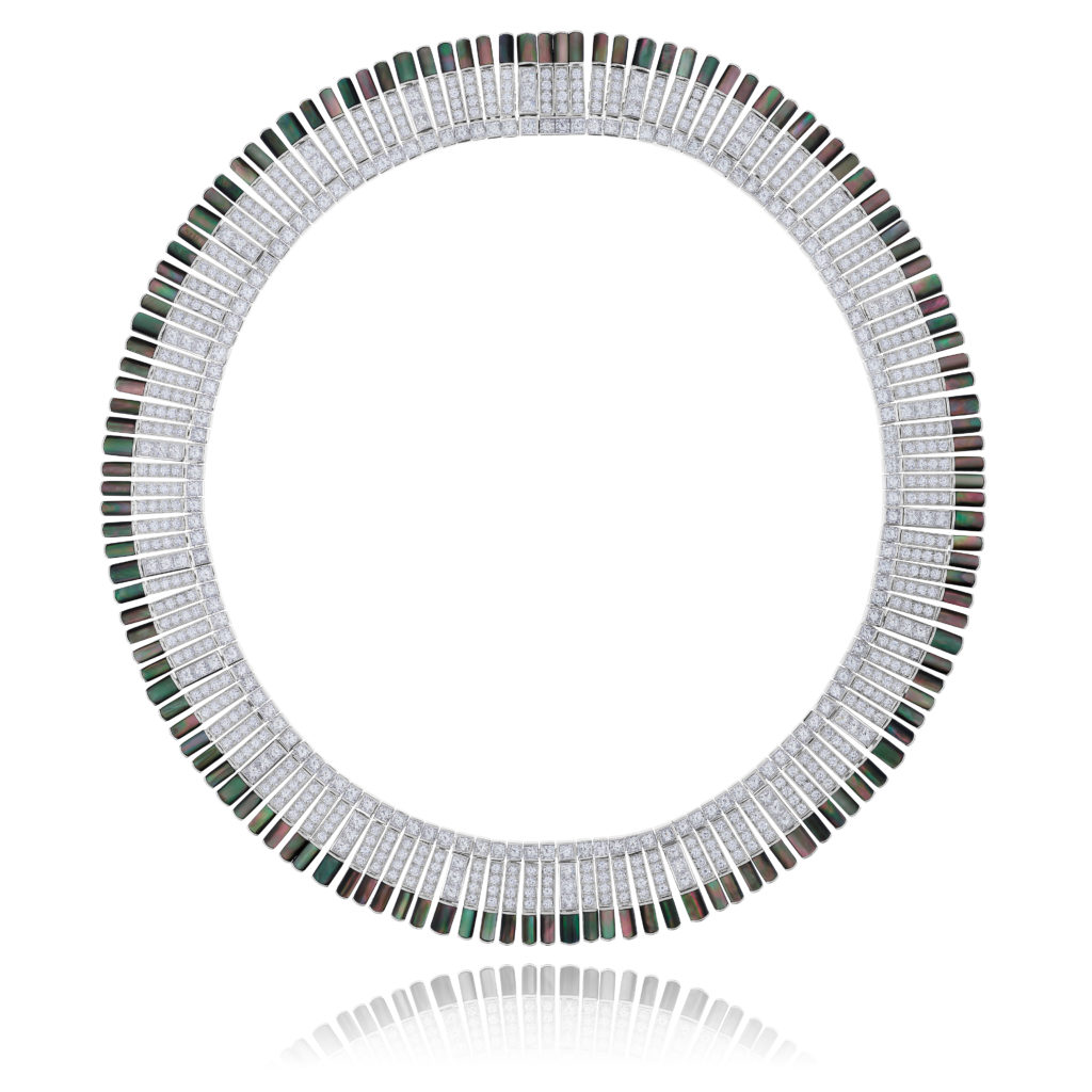 Le zèbre est l’un des animaux au monde dont l’apparence est la plus étonnante, avec ses rayures graphiques noires et blanches. Parcourant plaines et montagnes, chaque animal est unique et possède son propre motif. Symbole de l’équilibre entre communauté et individualité, et représentant la manière dont des forces opposées et des idées contrastées peuvent se marier harmonieusement. Le collier Chapman’s Zebra fait alterner diamants blancs taille princesse et diamants blancs ronds brillants, étroitement associés par leur sertissage et articulés avec précision. Pour un effet de contraste, la ligne de diamants blancs se termine en nacre grise iridescente, symbole de protection et de pureté. Le médaillon est orné d’un diamant central de 3 carats, de couleur grise et ajouré, représentant les rayures du zèbre, un bijou créé pour incarner un esprit optimiste et libre. Le bracelet et les boucles d’oreilles qui l’accompagnent, s’inspirent également des rayures du zèbre et particulièrement de sa crinière frémissante, avec une alternance spectaculaire de diamants et de nacre.