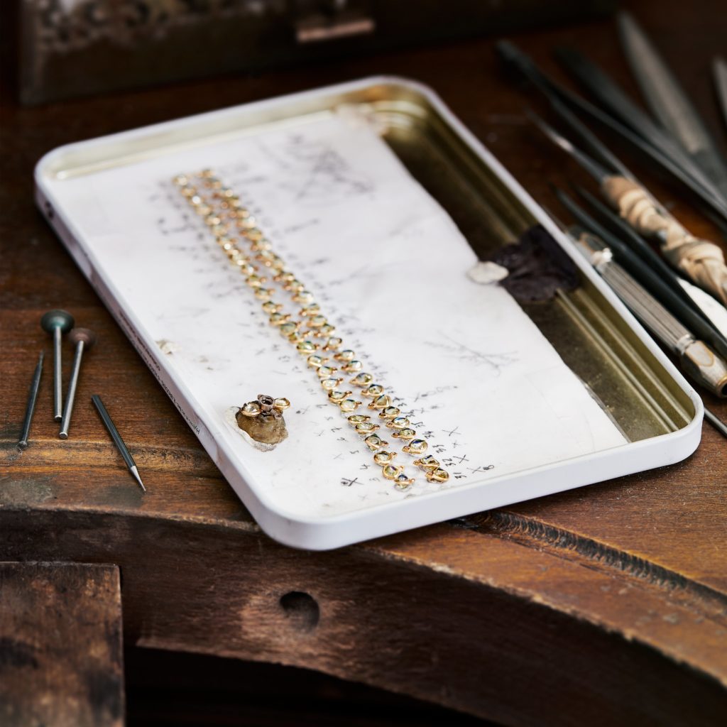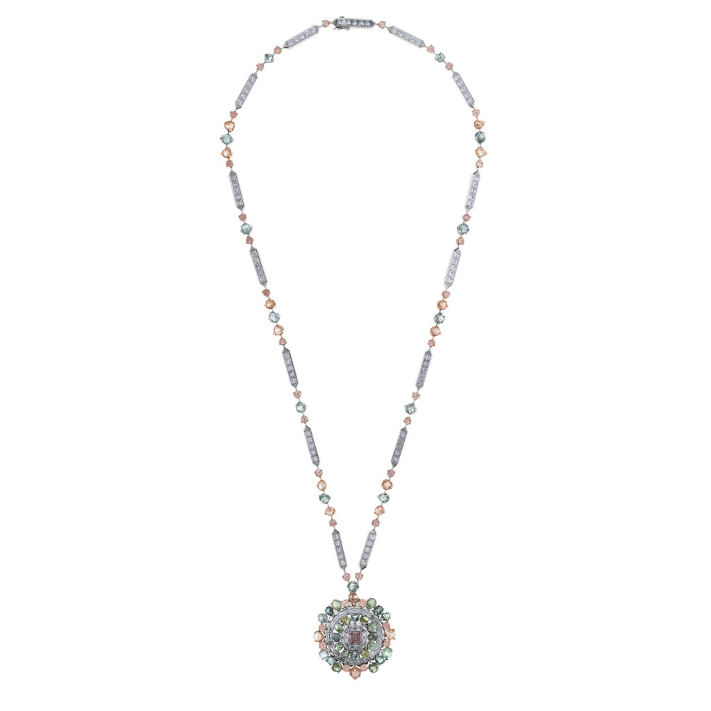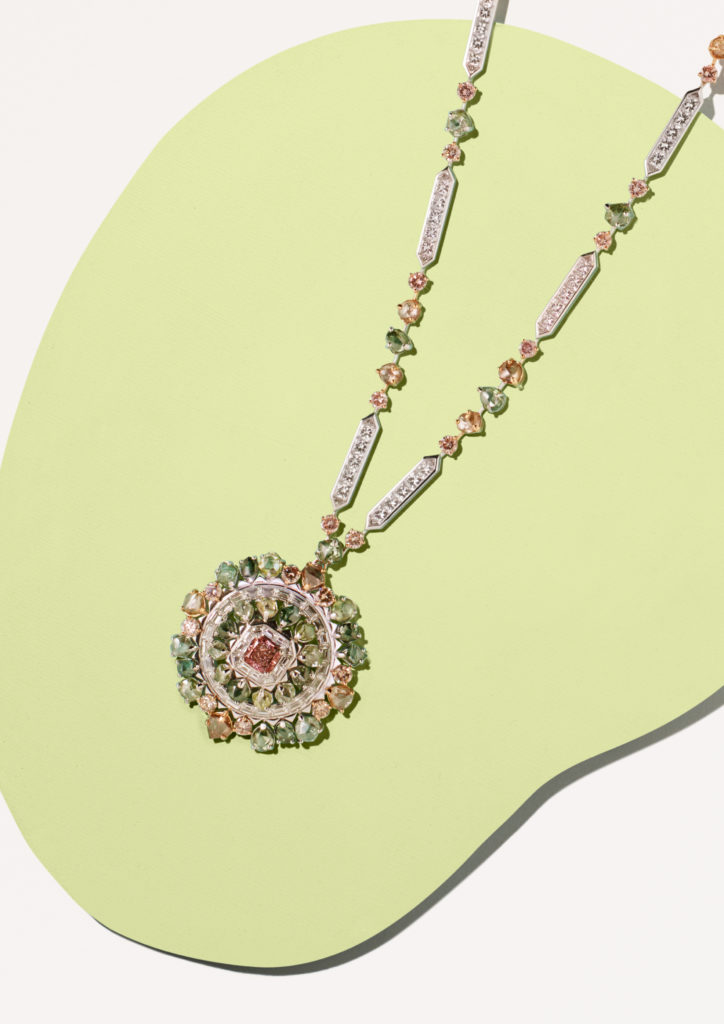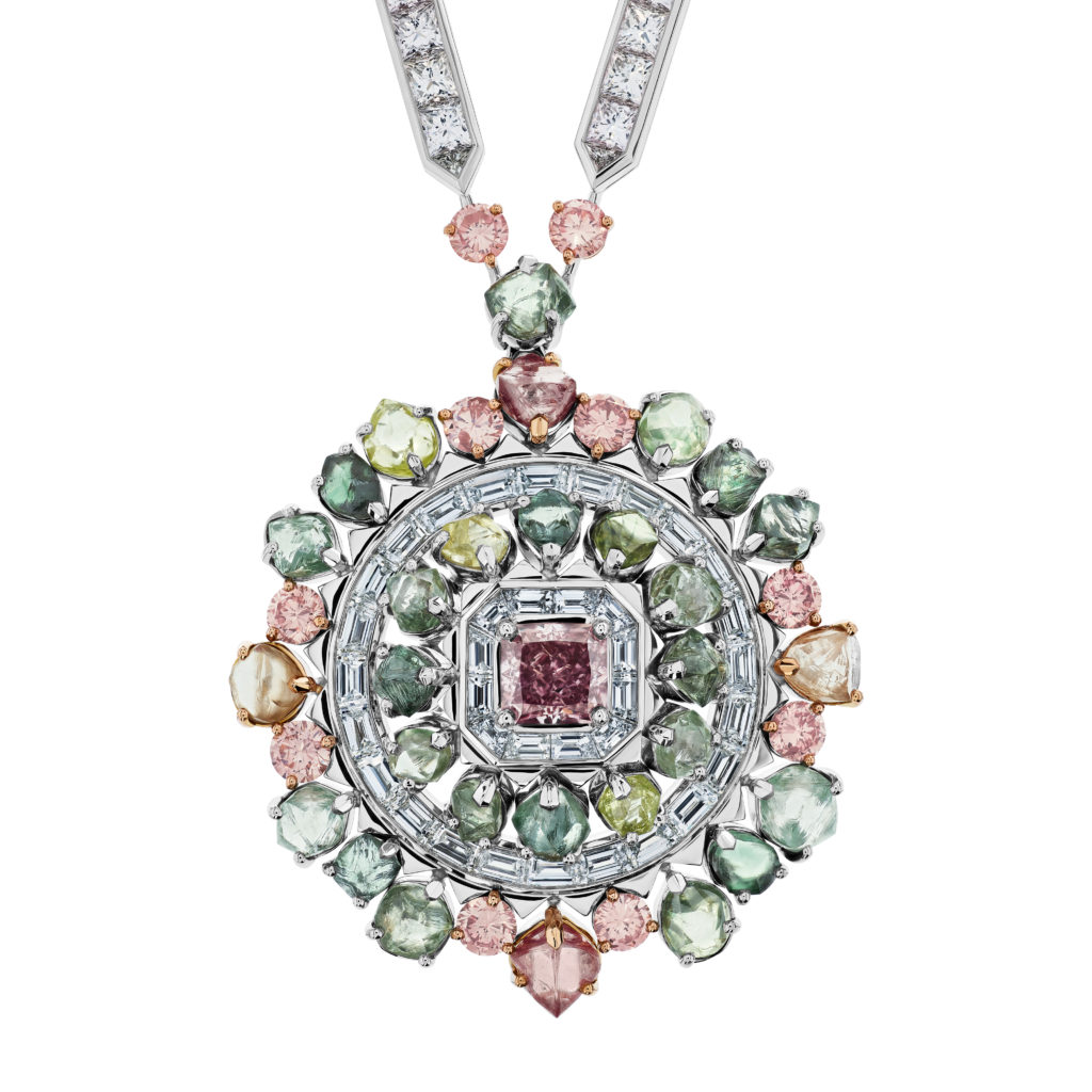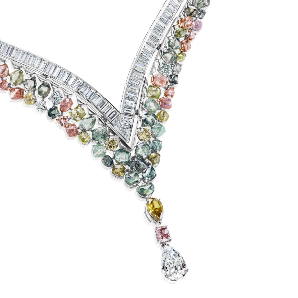 Capable de changer de couleur rapidement et de voir à 360 degrés, le caméléon est un symbole d’intuition, de sensibilité, de calme et de clair voyance. Le secret de son pouvoir polychromatique réside dans les milliers de minuscules cristaux qui couvrent sa peau, et qui se réorganisent spontanément pour répondre à une émotion. La parure Knysna Chameleon présente un ensemble de diamants dont les tons traduisent non seulement les couleurs intenses de ce caméléon kaléidoscopique mais aussi la dualité texturale de ses écailles, de celles qui couvrent son ventre souple à celles qui ornent sa tête et son dos. Deux rangées exceptionnelles de diamants colorés détachables, dont des diamants bruts bleu-vert et rose clair, ondulent aux côtés d’une ligne de diamants blancs baguette articulés avec précision. Un diamant de 2,01 carats, brun jaune profond Fancy, taille poire, y est suspendu, ainsi qu’un diamant d’1,11 carat, rose brun Fancy, taille radiant. Ces trois éléments distinctifs du collier sont détachables, offrant ainsi quatre façons différentes de le porter et transformant instantanément son apparence et son état d’esprit. Des anneaux encerclent l’oreille comme la queue d’un caméléon. Une bague cocktail ovale ornée d’un ensemble de diamants colorés dont des diamants bruts bleu vert, vert et jaune, et des diamants polis rose Fancy, entoure un diamant Fancy de 1,50 carat brun jaune foncé de taille ovale. Des bagues contemporaines qui peuvent être portées ensemble s’enroulent autour du doigt, avec deux rangées de diamants bruts entourant un diamant solitaire de 4,04 carats, taille émeraude, gris jaune foncé Fancy. Le médaillon est composé d’une chaîne de diamants blancs taille princesse alternant avec un ensemble de diamants colorés, à laquelle est suspendue un pendentif détachable.