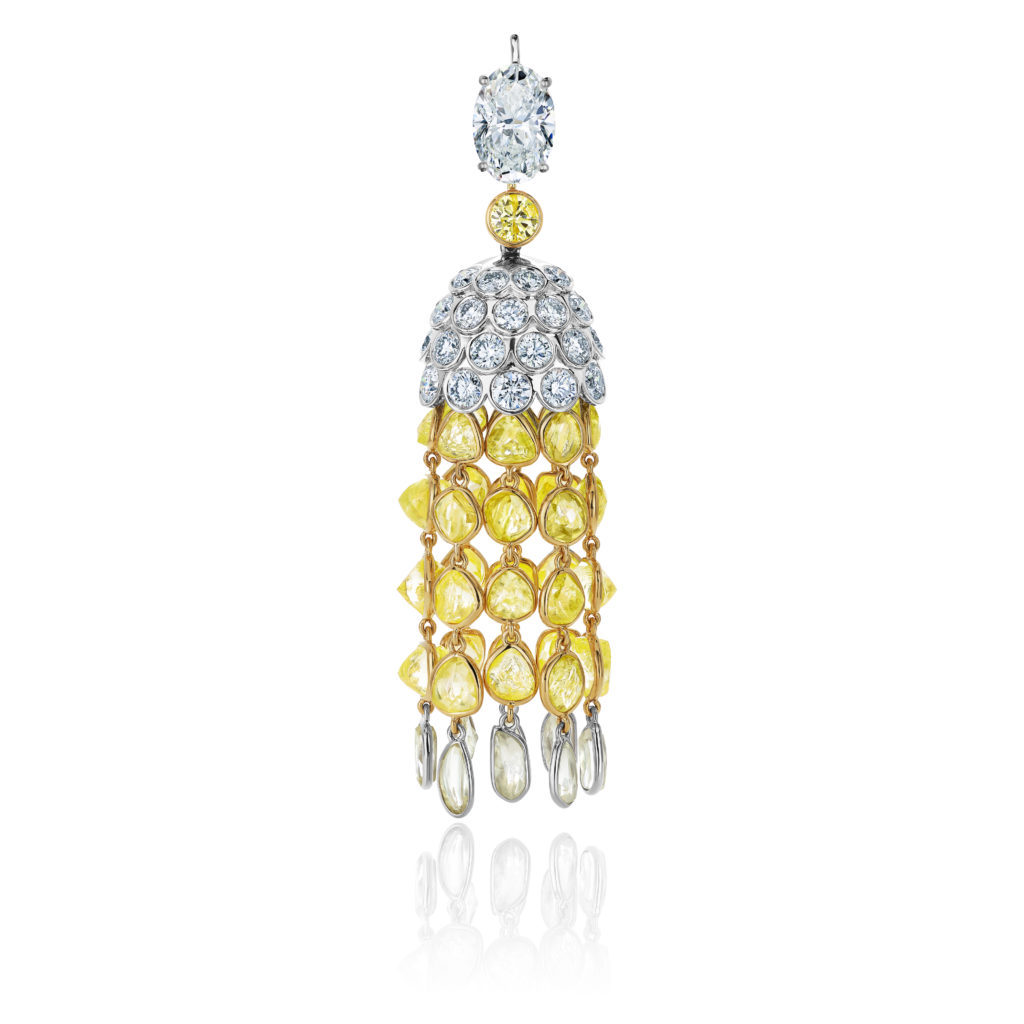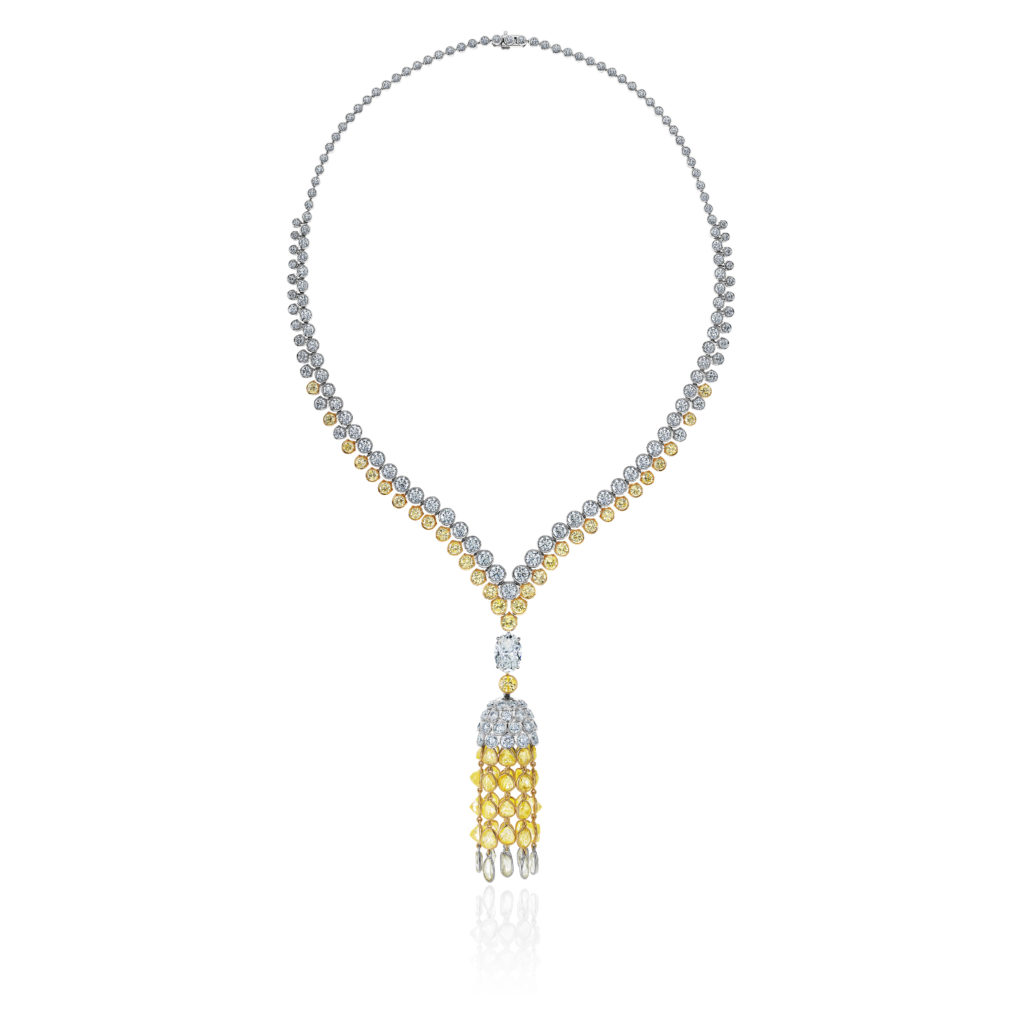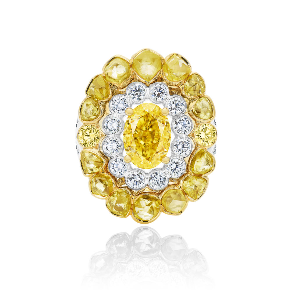 Les couleurs éclatantes et chatoyantes des poissons sont créées par de minuscules cristaux posés sur leurs écailles qui reflètent puissamment la lumière, ainsi que de nombreuses couches qui accentuent leur brillance. La parure Electric Cichlid est composée de diamants jaunes Fancy associés à des diamants bruts jaunes. Alliés à des diamants blancs éclatants, les bijoux scintillent, reflétant sur la peau un miroitement presque aquatique. La liberté de mouvement des poissons, symboles de bonheur, d’abondance et de chance, est exprimé par une rangée éclatante de diamants blancs associée à une vague de diamants jaunes polis qui composent le collier. Celui-ci se termine par une queue de poisson ornée de diamants bruts blancs qui ressemblent aux bords étincelants de leurs nageoires. Articulée et détachable, cette pièce est une création toute en fluidité, accompagnée de boucles d’oreilles pendantes composées de diamants blancs, de diamants jaunes Fancy et de diamants bruts jaunes. Le bracelet rappelle les mouvements du poisson qui ondule, file et plonge, tandis que le médaillon irradie de 163 diamants, et qu’une bague cocktail étincelle avec un diamant jaune Fancy taille ovale de 2,02 carats.