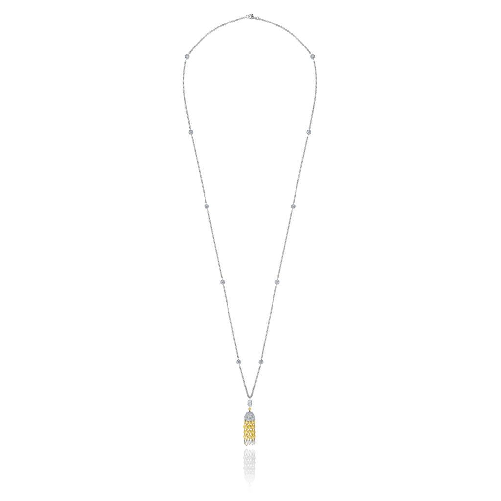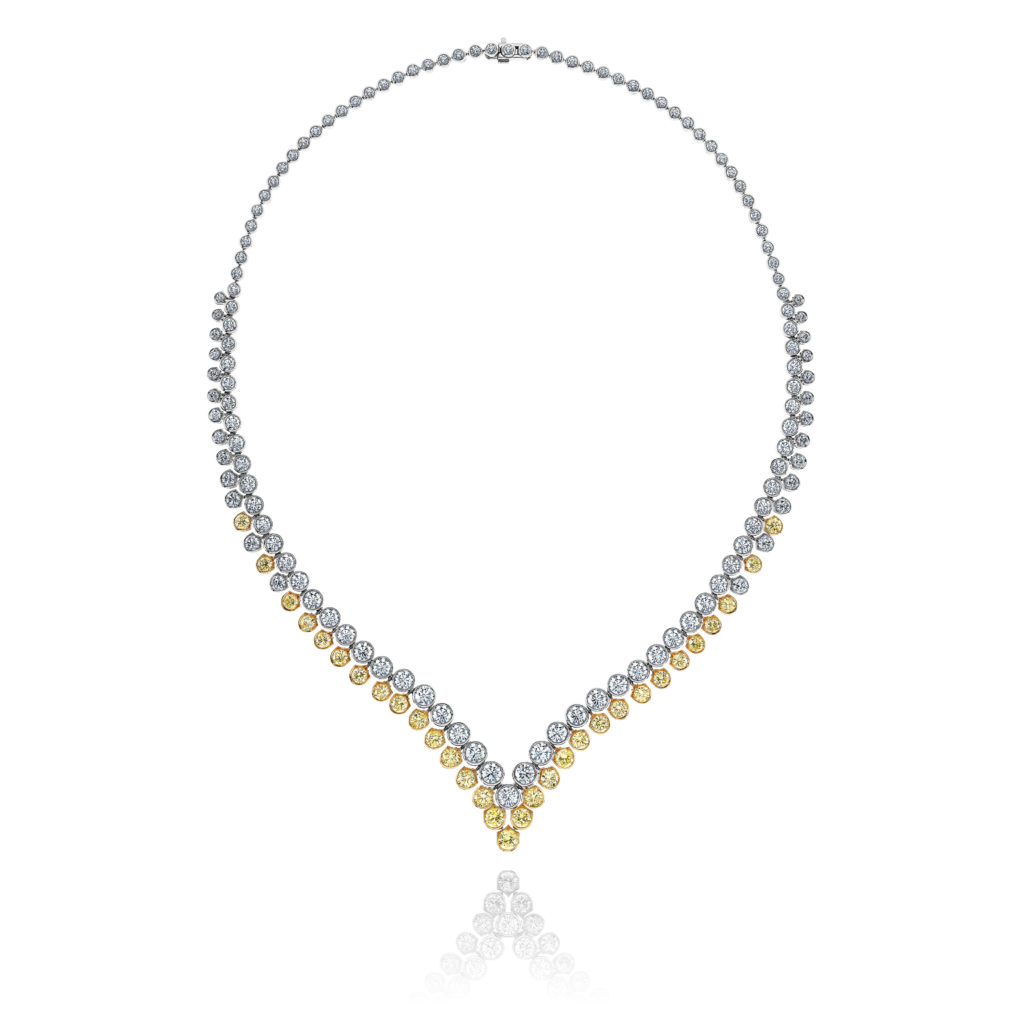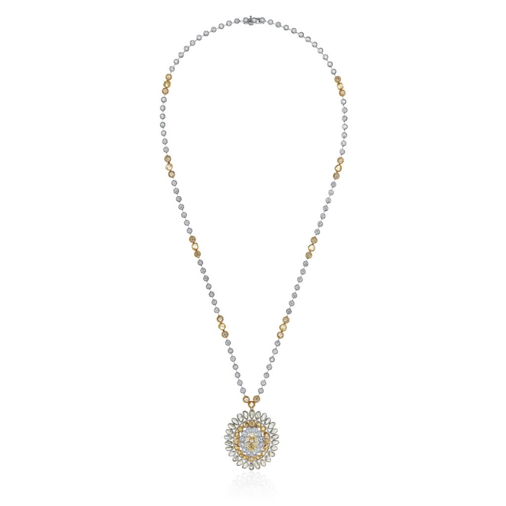 Les couleurs éclatantes et chatoyantes des poissons sont créées par de minuscules cristaux posés sur leurs écailles qui reflètent puissamment la lumière, ainsi que de nombreuses couches qui accentuent leur brillance. La parure Electric Cichlid est composée de diamants jaunes Fancy associés à des diamants bruts jaunes. Alliés à des diamants blancs éclatants, les bijoux scintillent, reflétant sur la peau un miroitement presque aquatique. La liberté de mouvement des poissons, symboles de bonheur, d’abondance et de chance, est exprimé par une rangée éclatante de diamants blancs associée à une vague de diamants jaunes polis qui composent le collier. Celui-ci se termine par une queue de poisson ornée de diamants bruts blancs qui ressemblent aux bords étincelants de leurs nageoires. Articulée et détachable, cette pièce est une création toute en fluidité, accompagnée de boucles d’oreilles pendantes composées de diamants blancs, de diamants jaunes Fancy et de diamants bruts jaunes. Le bracelet rappelle les mouvements du poisson qui ondule, file et plonge, tandis que le médaillon irradie de 163 diamants, et qu’une bague cocktail étincelle avec un diamant jaune Fancy taille ovale de 2,02 carats.