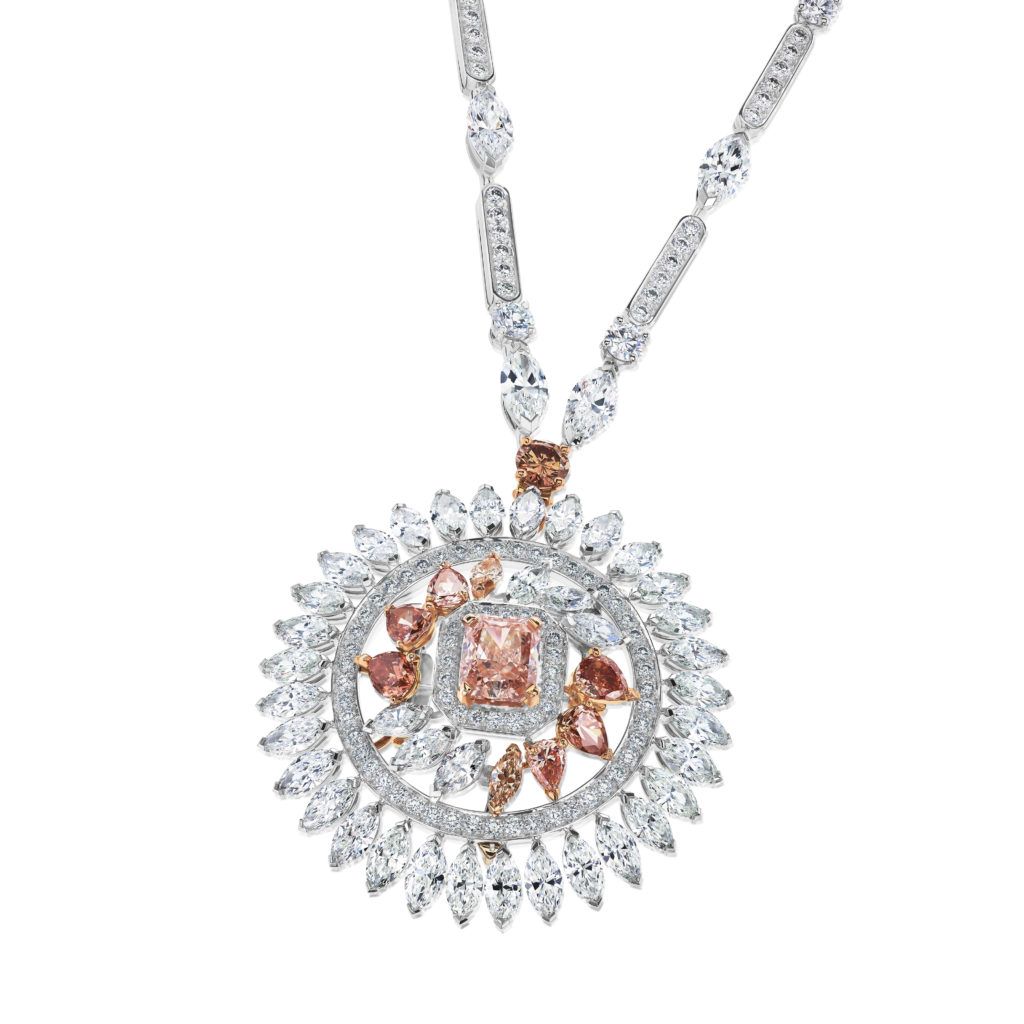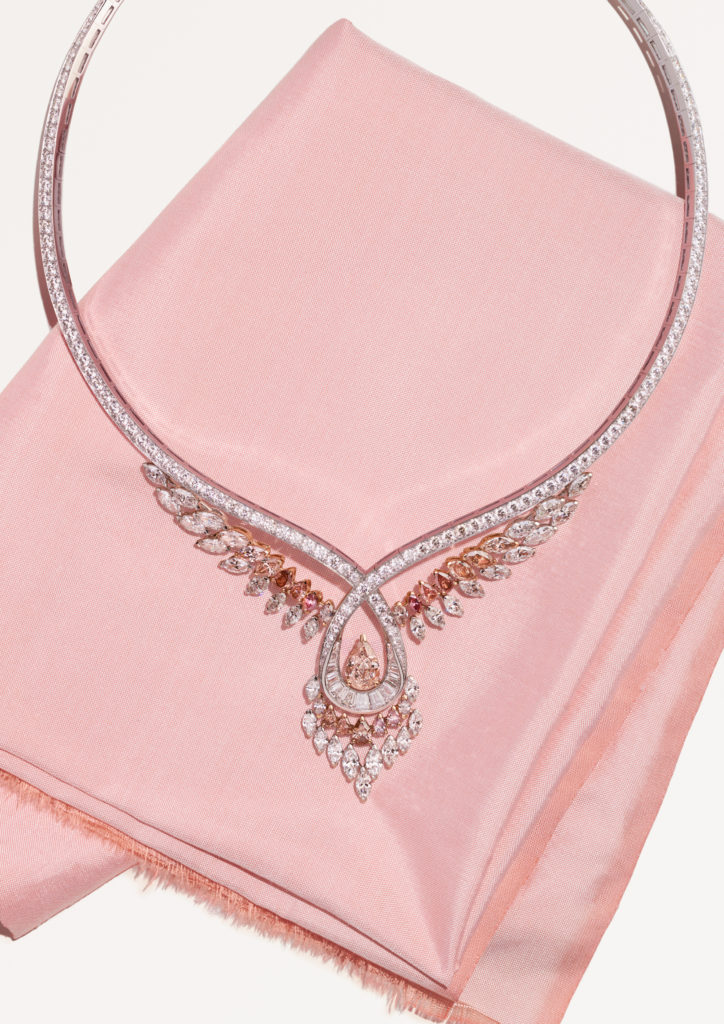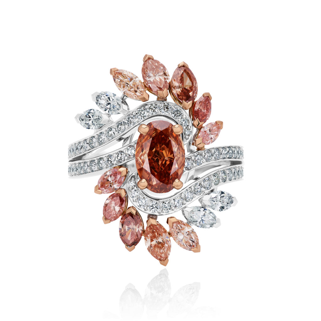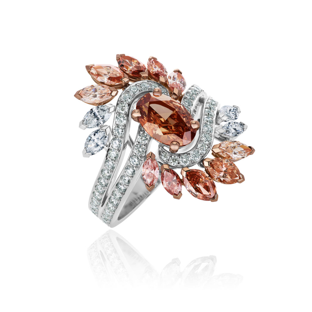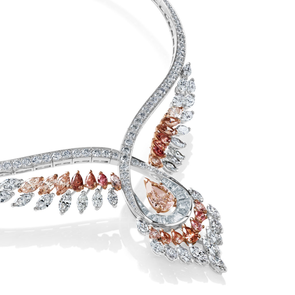La parure Greater Flamingo est inspirée par les flamants roses qui embellissent les rives des grands lacs du monde, avec leur plumage coloré de rose et de corail. Elle présente une collection de diamants Fancy roses, bruns et rose orangé profond, dont les tons ont été créés il y a des milliards d’années par différents degrés de pression et de températures extrêmes alors qu’ils étaient encore sous terre, changeant la façon dont ils interagissent avec la lumière aujourd’hui. Les flamants roses sont un symbole d’assurance, de légèreté et de finesse. Ce collier, véritable pièce maîtresse, représente le plumage élégant du flamant rose, avec un diamant Fancy brun-rose taille poire de 3,01 carats au centre, entouré d’un ensemble de diamants colorés Fancy dans des tons rose poudré. Porté, le collier allonge le cou et reflète sur la peau sa lumière rose. L’association de diamants blancs et de diamants colorés créent l’effet séduisant d’un plumage vibrant. Le médaillon est entouré d’une myriade de diamants colorés, avec en leur centre un éclatant diamant Fancy rose orangé de 1,02 carat. Les boucles d’oreilles, comme des ailes étendues, font étalage de plumes de diamants blancs et colorés, tout comme l’éblouissant bracelet, tandis que des bagues cocktail se déploient sur les doigts, l’une ornée d’un diamant Fancy brun orangé foncé de taille ovale et d’1,04 carat, l’autre d’un diamant Fancy brun orangé de taille poire et d’1,55 carat. Chacune de ces pièces est aussi précieuse qu’éclatante.