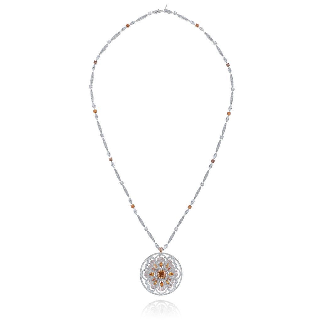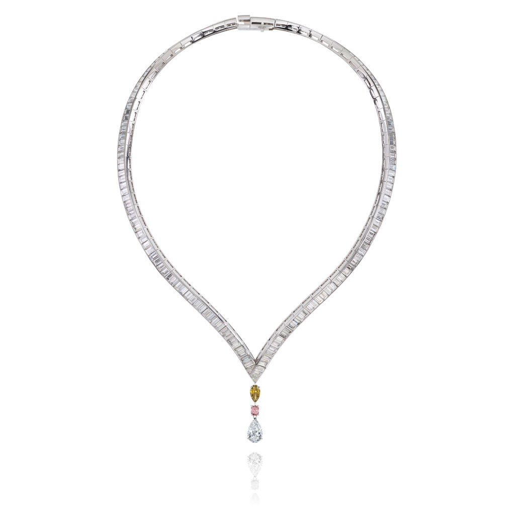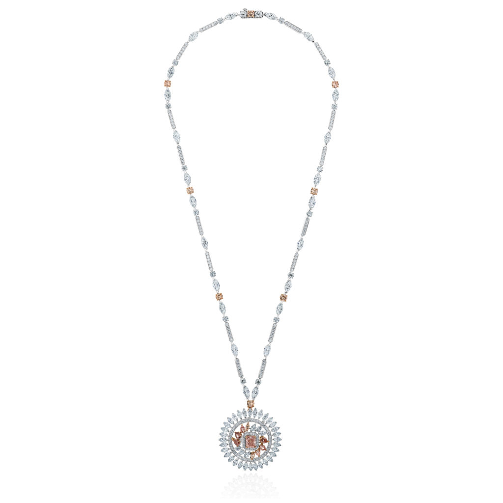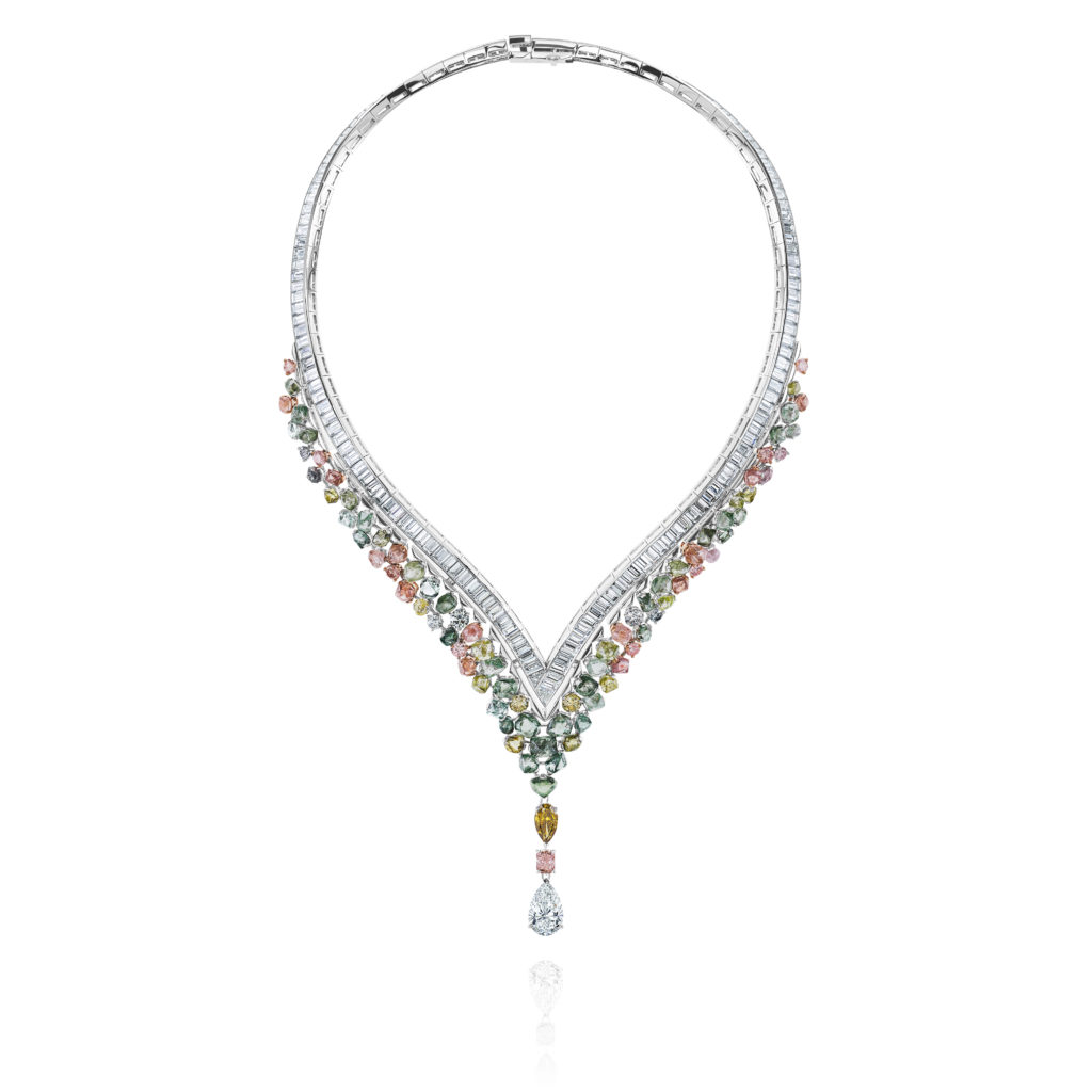 La parure Greater Flamingo est inspirée par les flamants roses qui embellissent les rives des grands lacs du monde, avec leur plumage coloré de rose et de corail. Elle présente une collection de diamants Fancy roses, bruns et rose orangé profond, dont les tons ont été créés il y a des milliards d’années par différents degrés de pression et de températures extrêmes alors qu’ils étaient encore sous terre, changeant la façon dont ils interagissent avec la lumière aujourd’hui. Les flamants roses sont un symbole d’assurance, de légèreté et de finesse. Ce collier, véritable pièce maîtresse, représente le plumage élégant du flamant rose, avec un diamant Fancy brun-rose taille poire de 3,01 carats au centre, entouré d’un ensemble de diamants colorés Fancy dans des tons rose poudré. Porté, le collier allonge le cou et reflète sur la peau sa lumière rose. L’association de diamants blancs et de diamants colorés créent l’effet séduisant d’un plumage vibrant. Le médaillon est entouré d’une myriade de diamants colorés, avec en leur centre un éclatant diamant Fancy rose orangé de 1,02 carat. Les boucles d’oreilles, comme des ailes étendues, font étalage de plumes de diamants blancs et colorés, tout comme l’éblouissant bracelet, tandis que des bagues cocktail se déploient sur les doigts, l’une ornée d’un diamant Fancy brun orangé foncé de taille ovale et d’1,04 carat, l’autre d’un diamant Fancy brun orangé de taille poire et d’1,55 carat. Chacune de ces pièces est aussi précieuse qu’éclatante.