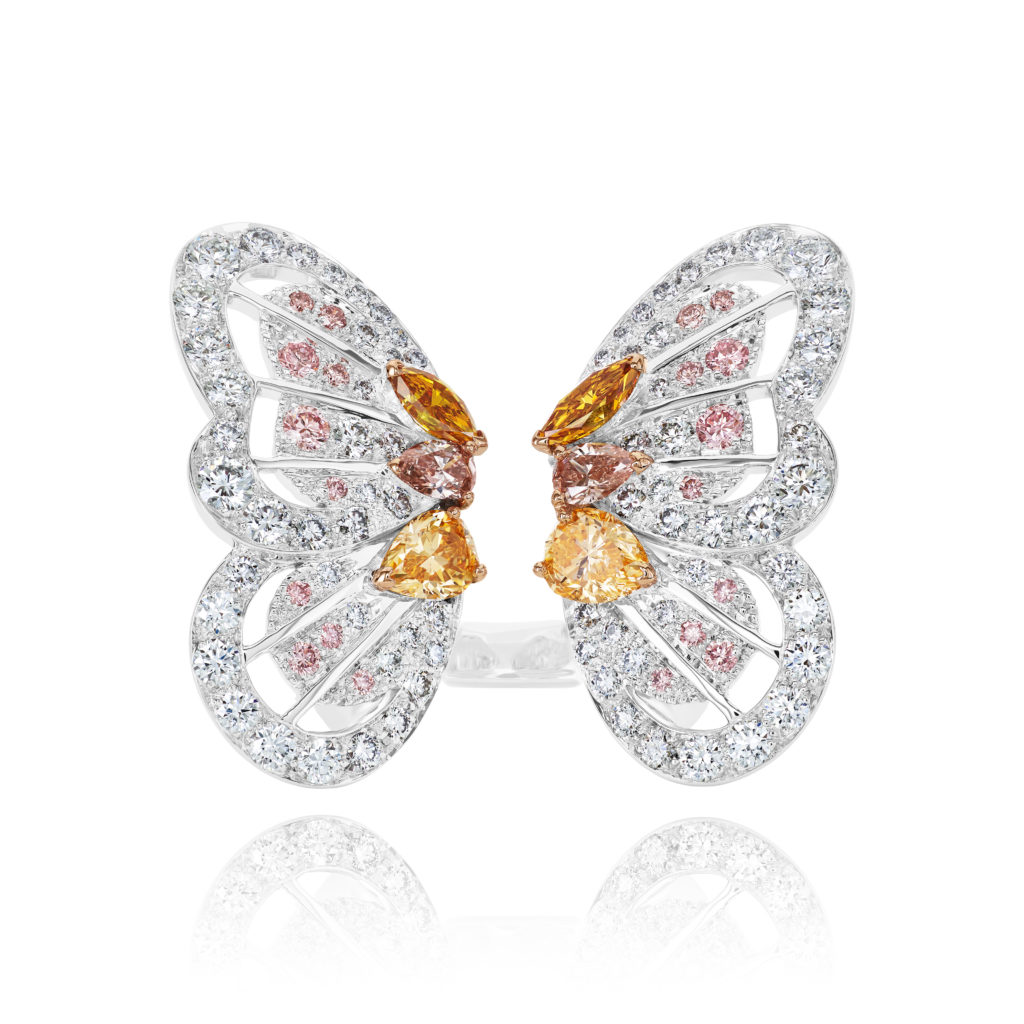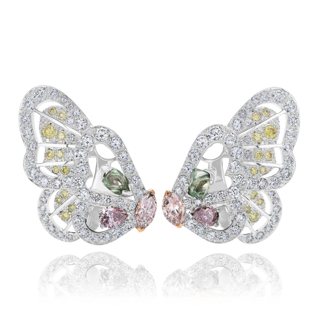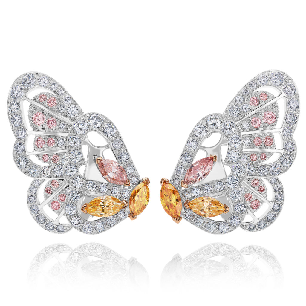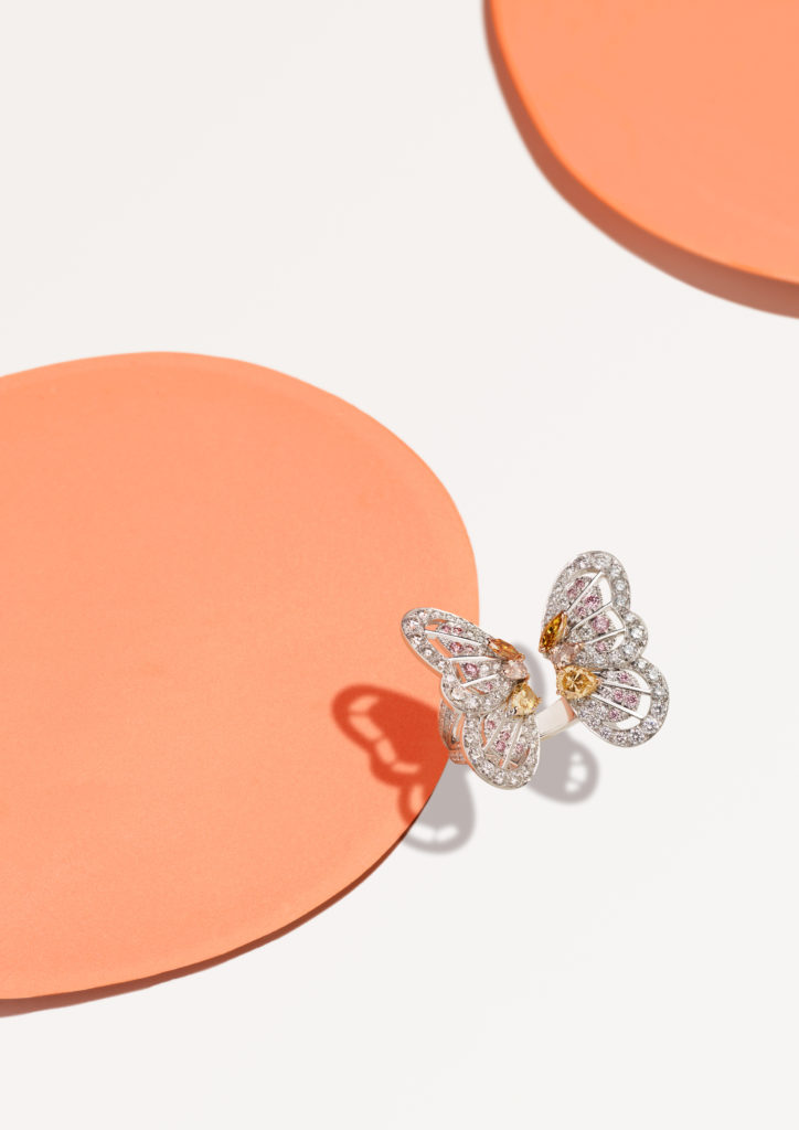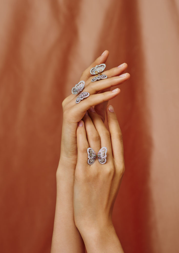 La couleur captivante d’un papillon iridescent et le symbole de transformation qu’il représente ont inspiré la parure Monarch Butterfly, serti de diamants allant de l’orange vif et du rose-violet Fancy aux diamants bruts bleu-vert Fancy. Ces pièces reflètent une lumière délicate qui danse sur la peau. Les couleurs des papillons ne sont pas seulement dues aux pigments. Leurs ailes sont faites d’écailles microscopiques sur lesquelles de minuscules structures en trois dimensions manipulent la lumière, créant certaines des teintes les plus iridescentes trouvées dans la nature. De la même manière, les diamants colorés font partie des trésors les plus rares formés sur terre. La parure Monarch Butterfly présente un trio de palettes colorées. La première associe diamants rose Fancy, orange vif, et orange-jaune Fancy, pour un collier dont le médaillon interprète la métamorphose du papillon lorsqu’il déploie ses ailes pour la première fois. Il porte en son cœur un diamant rare, Fancy brun jaune, taille coussin, de 4,11 carats, entouré de diamants blancs, et dessine la silhouette délicate du papillon, trouvant écho dans la bague et les boucles d’oreilles. Deux autres parures proposent des coloris éblouissants. Le premier se compose de diamants Fancy rose violet et de diamants brun rose clair, tandis que l’autre allie des diamants Fancy rose violet et d’extraordinaires diamants bruts bleu-vert. Ces pièces sont audacieuses et surprenantes : les boucles d’oreilles se posent à la fois devant et derrière l’oreille, tandis que les bagues donnent une sensation de détente et de liberté d’esprit, comme si un papillon s’était posé sur une main.