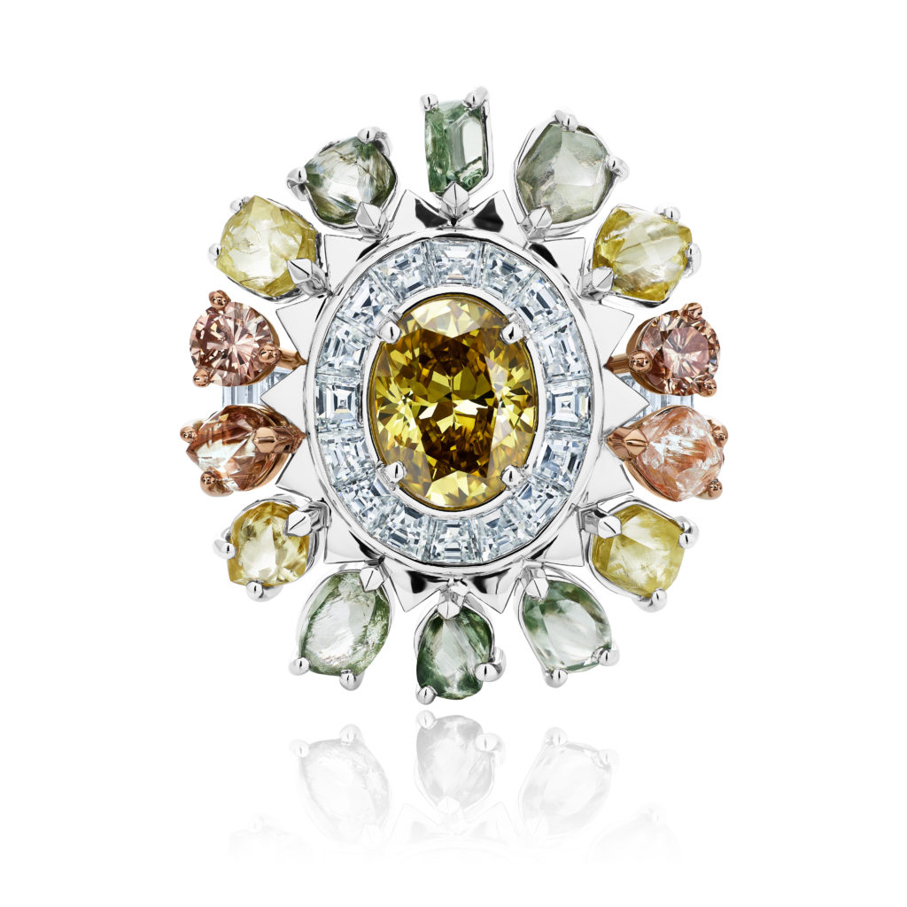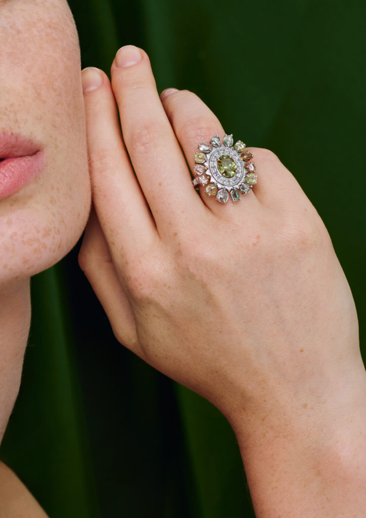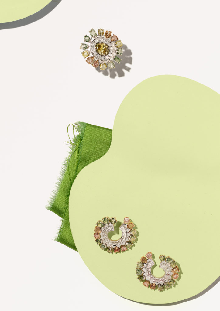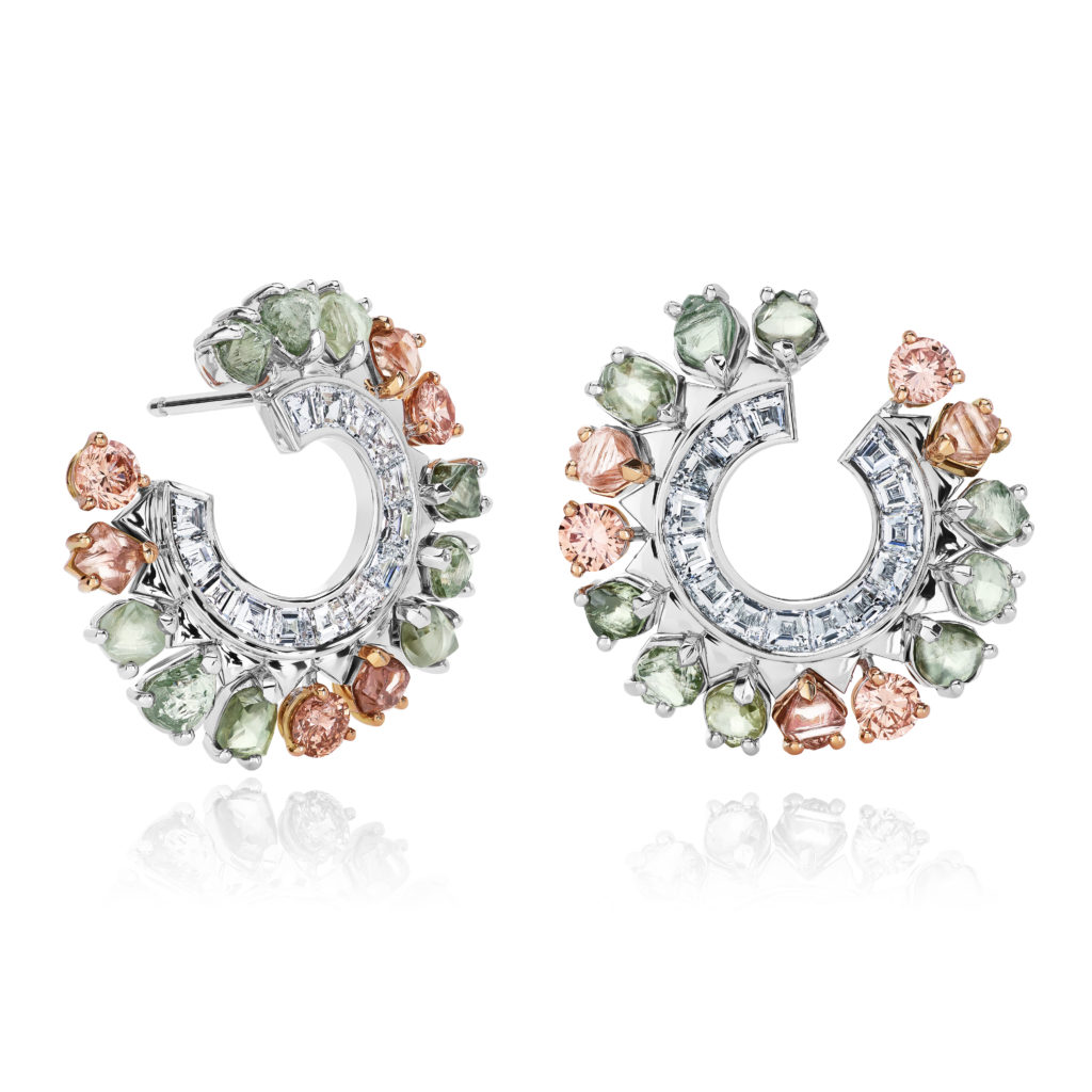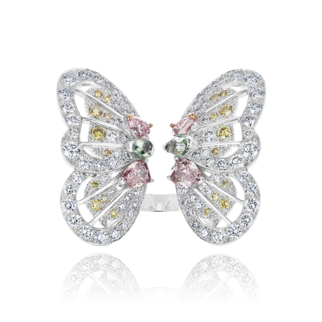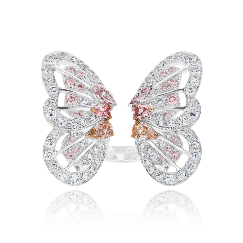 La couleur captivante d’un papillon iridescent et le symbole de transformation qu’il représente ont inspiré la parure Monarch Butterfly, serti de diamants allant de l’orange vif et du rose-violet Fancy aux diamants bruts bleu-vert Fancy. Ces pièces reflètent une lumière délicate qui danse sur la peau. Les couleurs des papillons ne sont pas seulement dues aux pigments. Leurs ailes sont faites d’écailles microscopiques sur lesquelles de minuscules structures en trois dimensions manipulent la lumière, créant certaines des teintes les plus iridescentes trouvées dans la nature. De la même manière, les diamants colorés font partie des trésors les plus rares formés sur terre. La parure Monarch Butterfly présente un trio de palettes colorées. La première associe diamants rose Fancy, orange vif, et orange-jaune Fancy, pour un collier dont le médaillon interprète la métamorphose du papillon lorsqu’il déploie ses ailes pour la première fois. Il porte en son cœur un diamant rare, Fancy brun jaune, taille coussin, de 4,11 carats, entouré de diamants blancs, et dessine la silhouette délicate du papillon, trouvant écho dans la bague et les boucles d’oreilles. Deux autres parures proposent des coloris éblouissants. Le premier se compose de diamants Fancy rose violet et de diamants brun rose clair, tandis que l’autre allie des diamants Fancy rose violet et d’extraordinaires diamants bruts bleu-vert. Ces pièces sont audacieuses et surprenantes : les boucles d’oreilles se posent à la fois devant et derrière l’oreille, tandis que les bagues donnent une sensation de détente et de liberté d’esprit, comme si un papillon s’était posé sur une main.