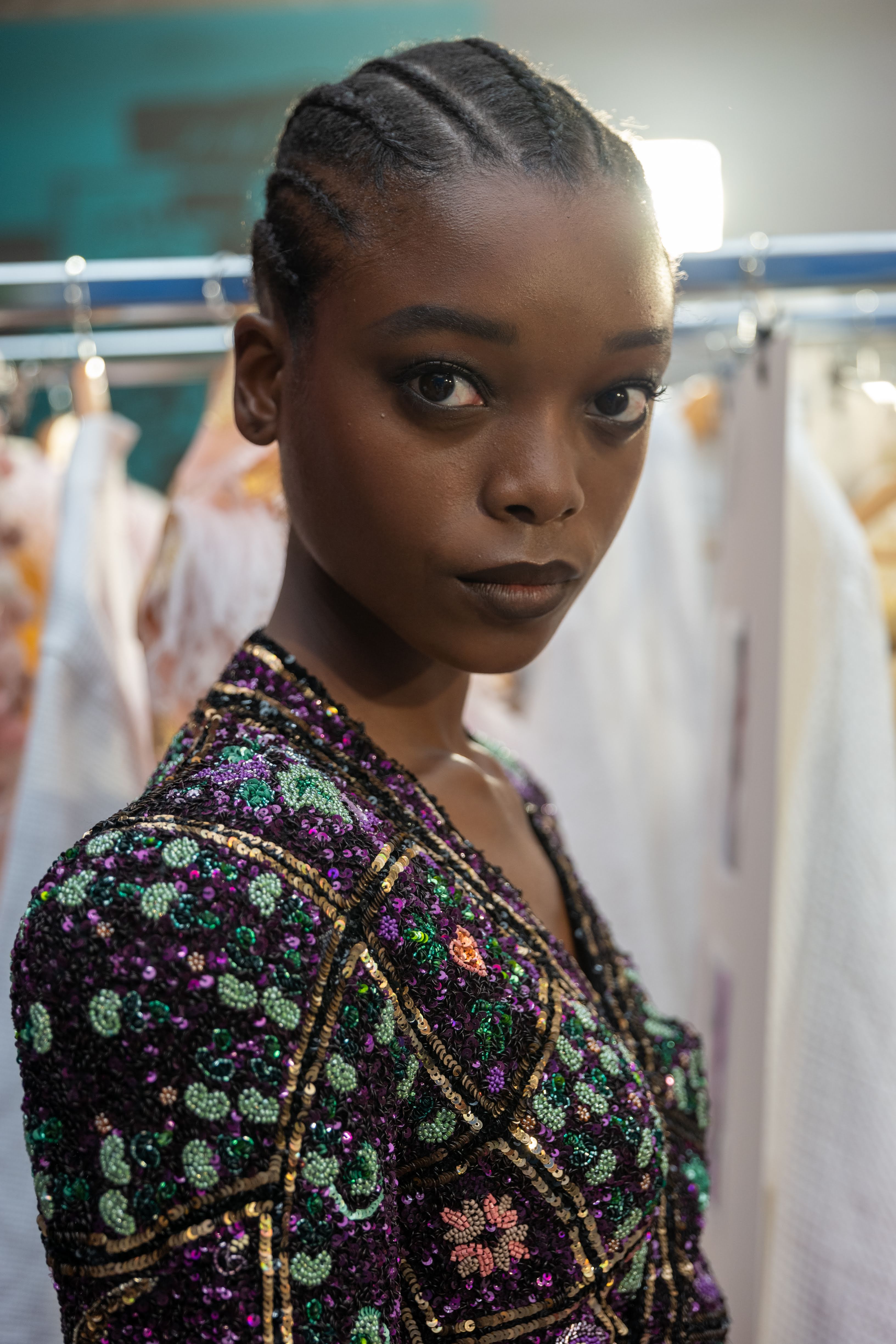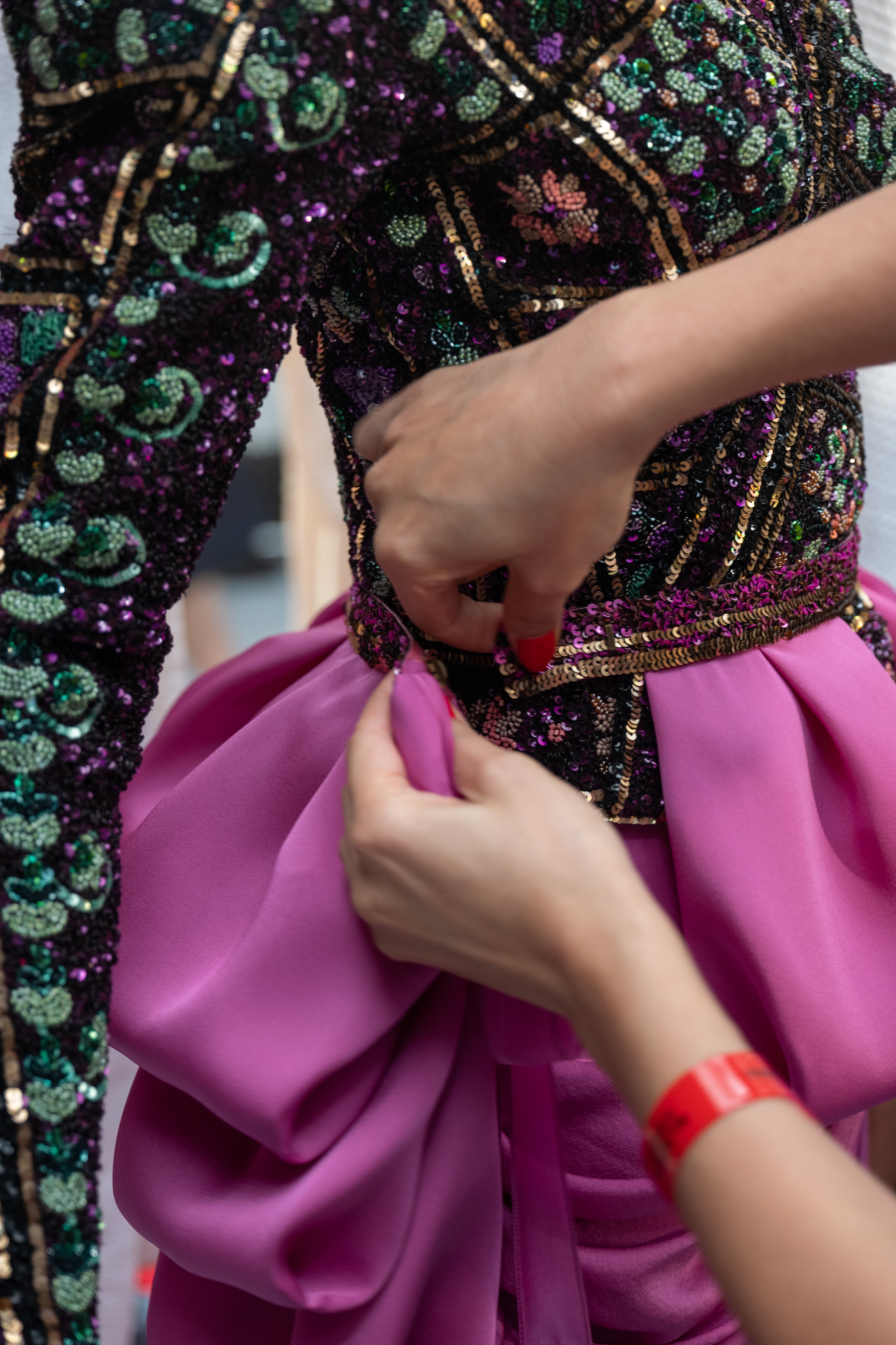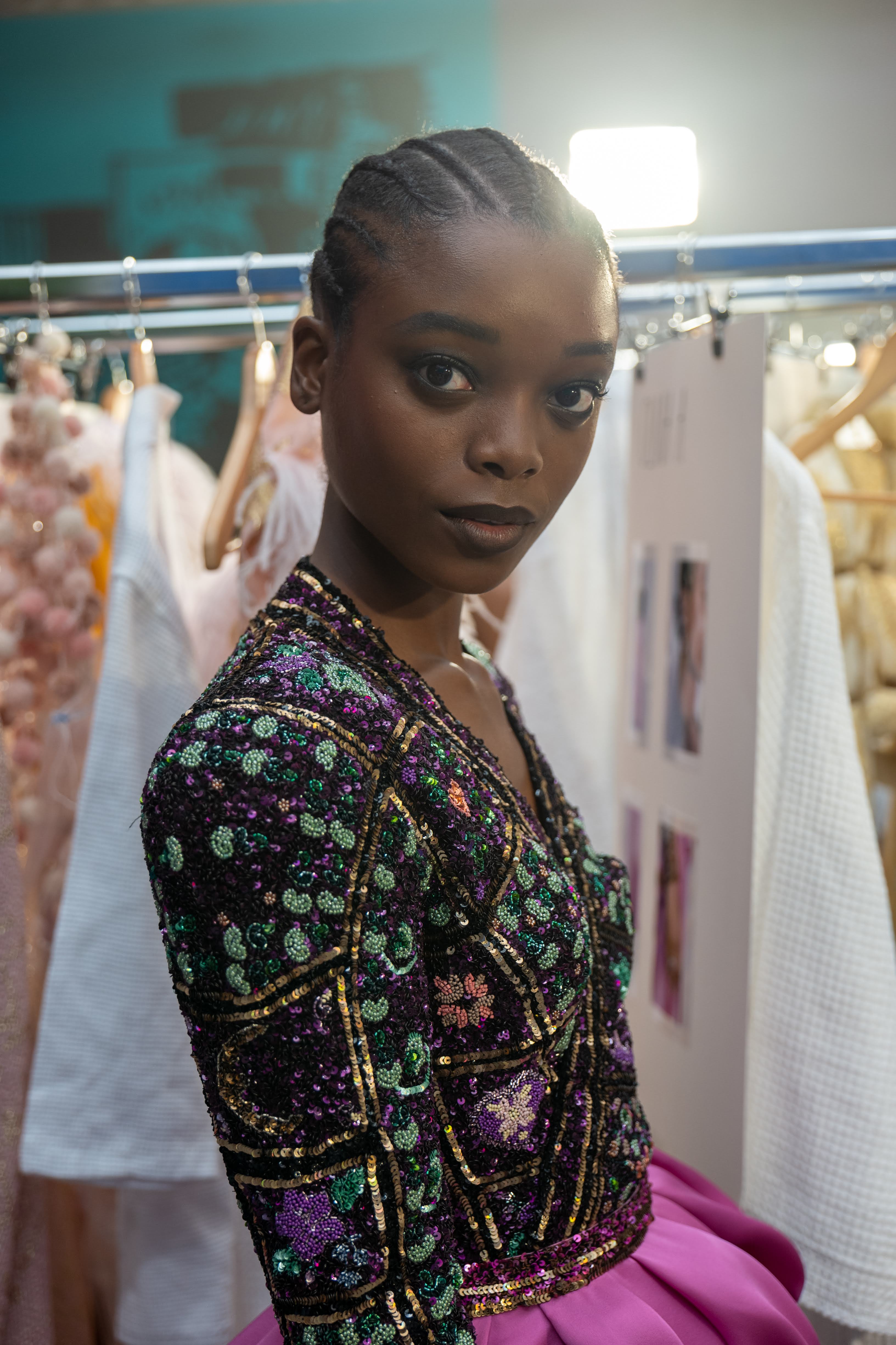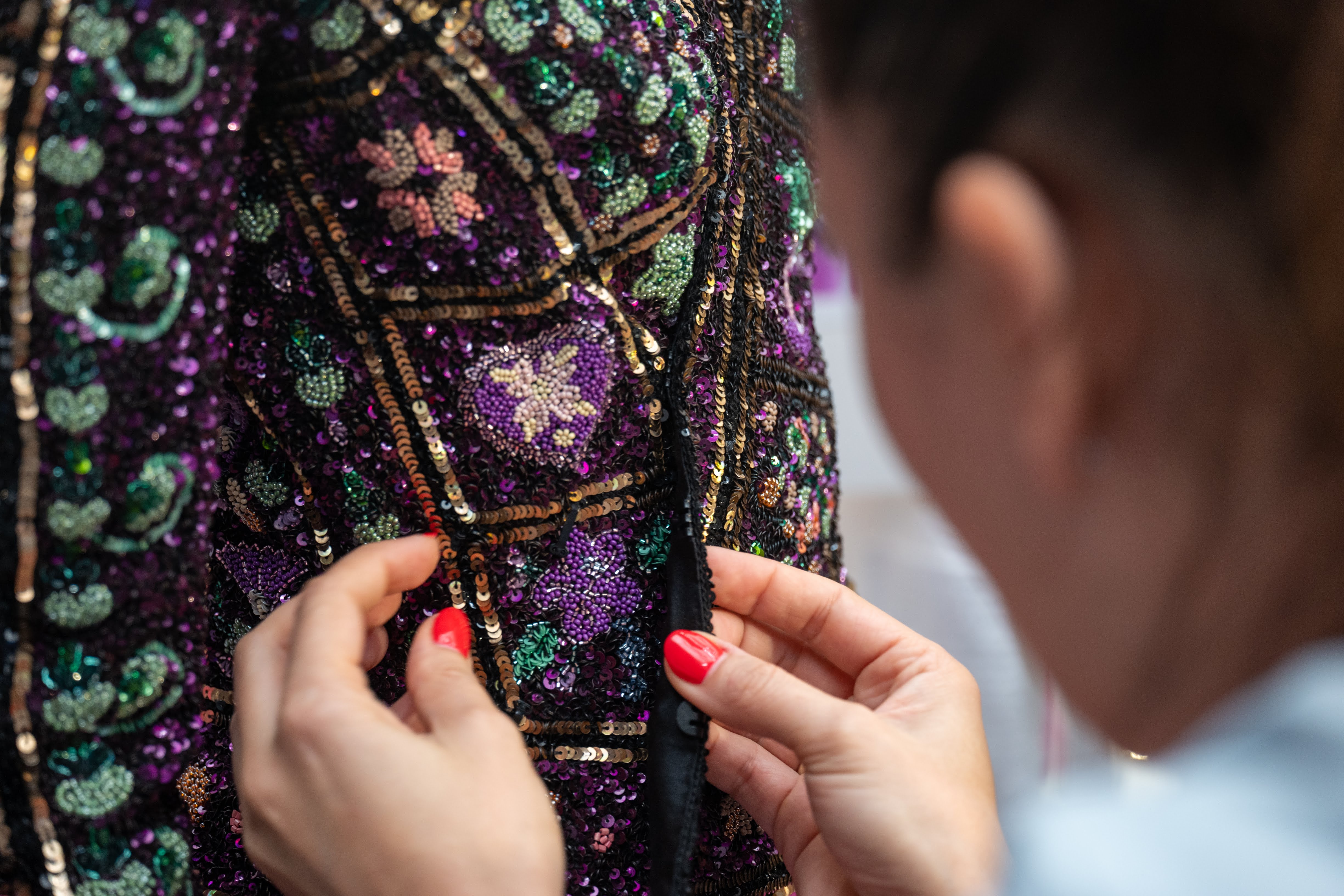 For Fall-Winter 2019/2020, opening once again the magic box of fantasy, Ulyana Sergeenko brings her heroine on an enriching, exotic journey around the world. One decided overnight, grabbing a few belongings and hitting the road. Along the way, the heroine swaps her things for local artifacts. Gradually, her wardrobe bursts with colorful pieces from different cultures, which she mixes freely. We meet her in the souk of Samarkand, Uzbekistan, right in the middle of her journey, free and happy. She is wrapped in a multicolored fur coat, and wears trousers; her local Ikat robe is embroidered with crystals and colored stones. On warm days, she layers weightless dresses made of mesh and transparent organza and swarming with singular patters. Her capes are embroidered with the motifs of local carpets. As usual, she favors a shapely silhouette with a nipped waist, and is all for a soulful touch of craft: floral ornament applied by hand and then embroidered; bomber jackets and skirts made to resemble the Uzbekistan kourpeshkas (national pillows), with hanging beaded tassels; intricate crochet and beading. Images of herbs and flowers are blurred, following the Ikat technique. Precious and tactile materials such as silk, atlas, sateen, chiffon, jacquard silk, lurex, crochet, taffeta, patent leather come in a palette of black, gold, green, purple and blue, interspersed with shades of pink – from powdery and pastel to electric to deep.