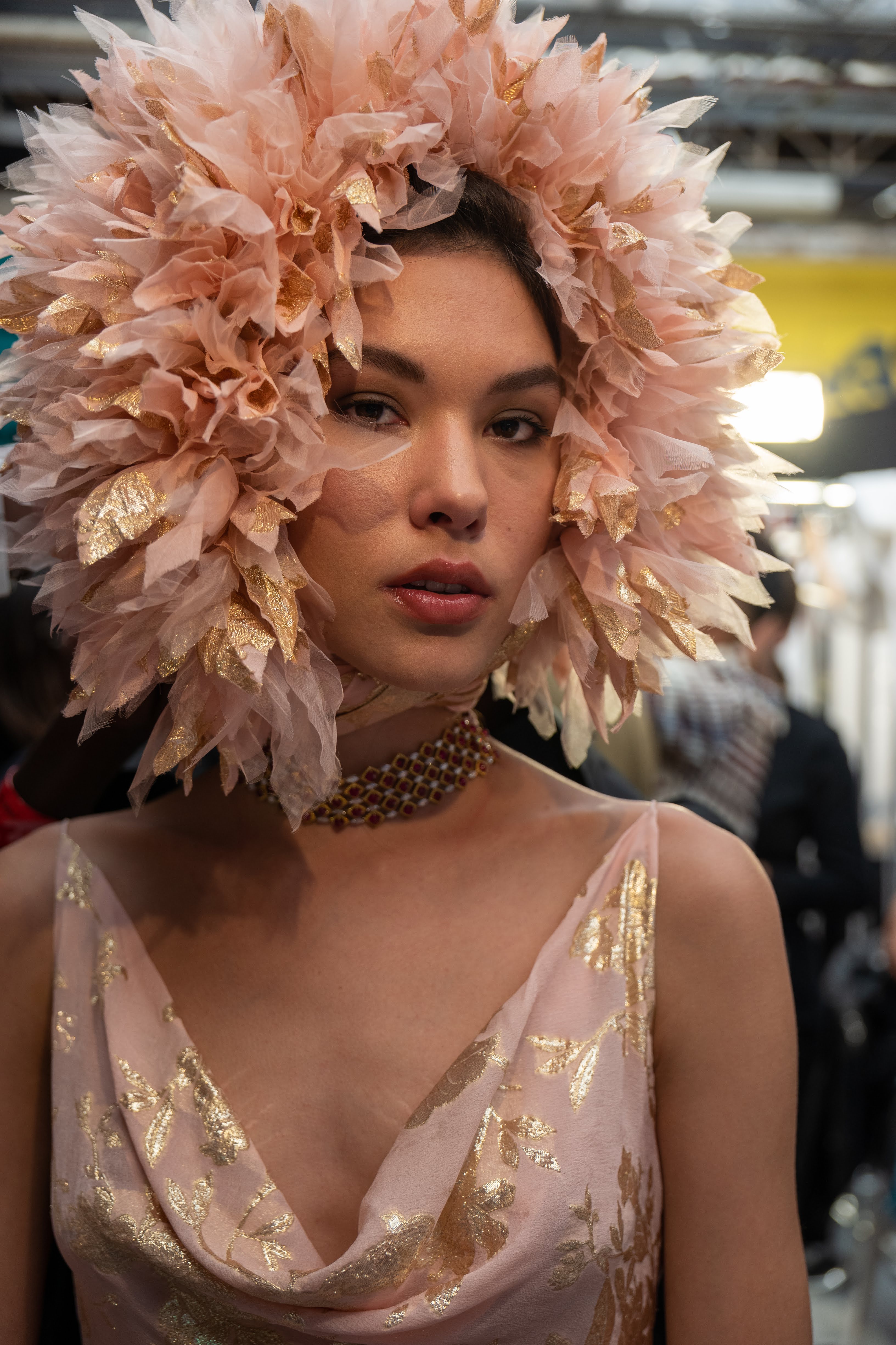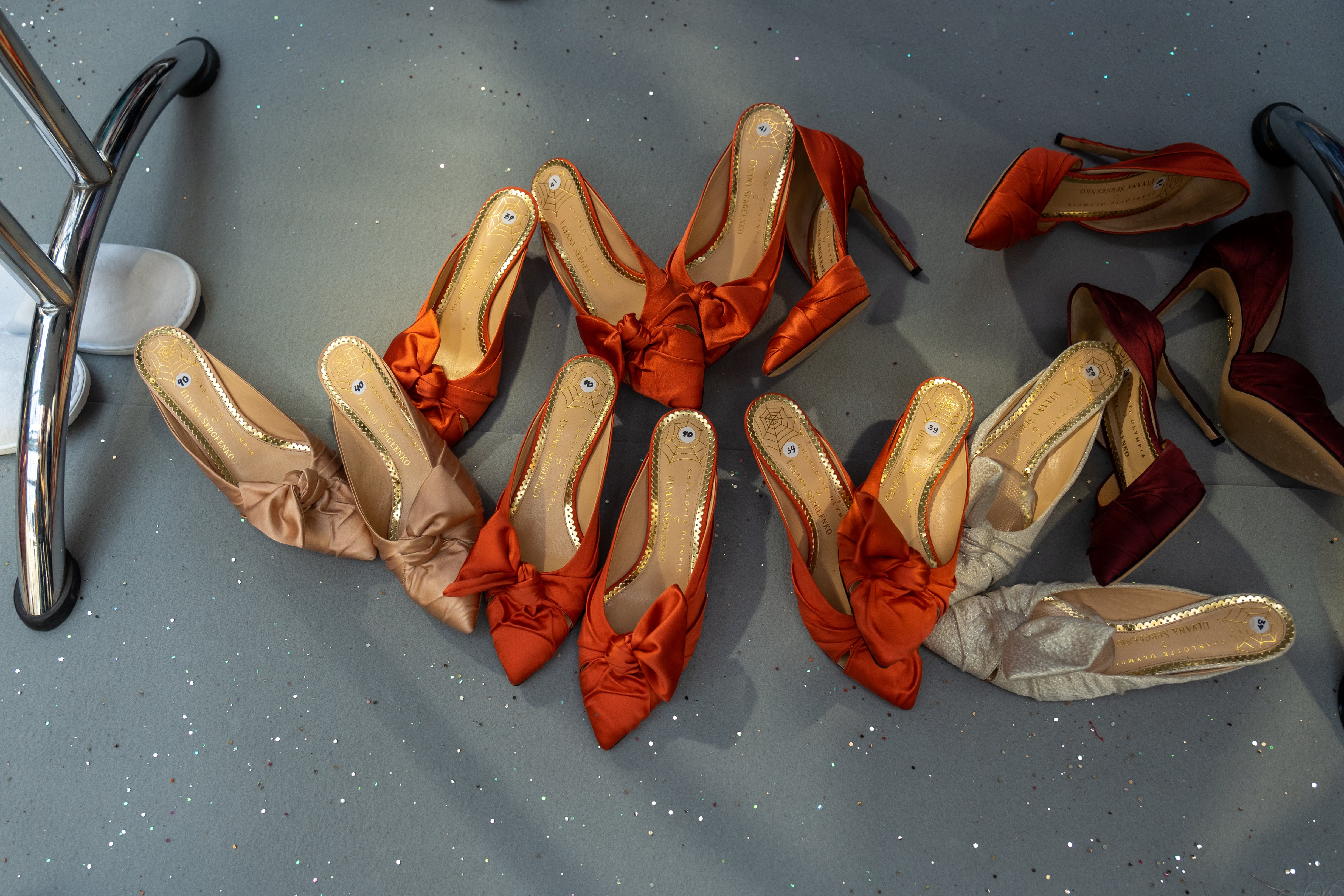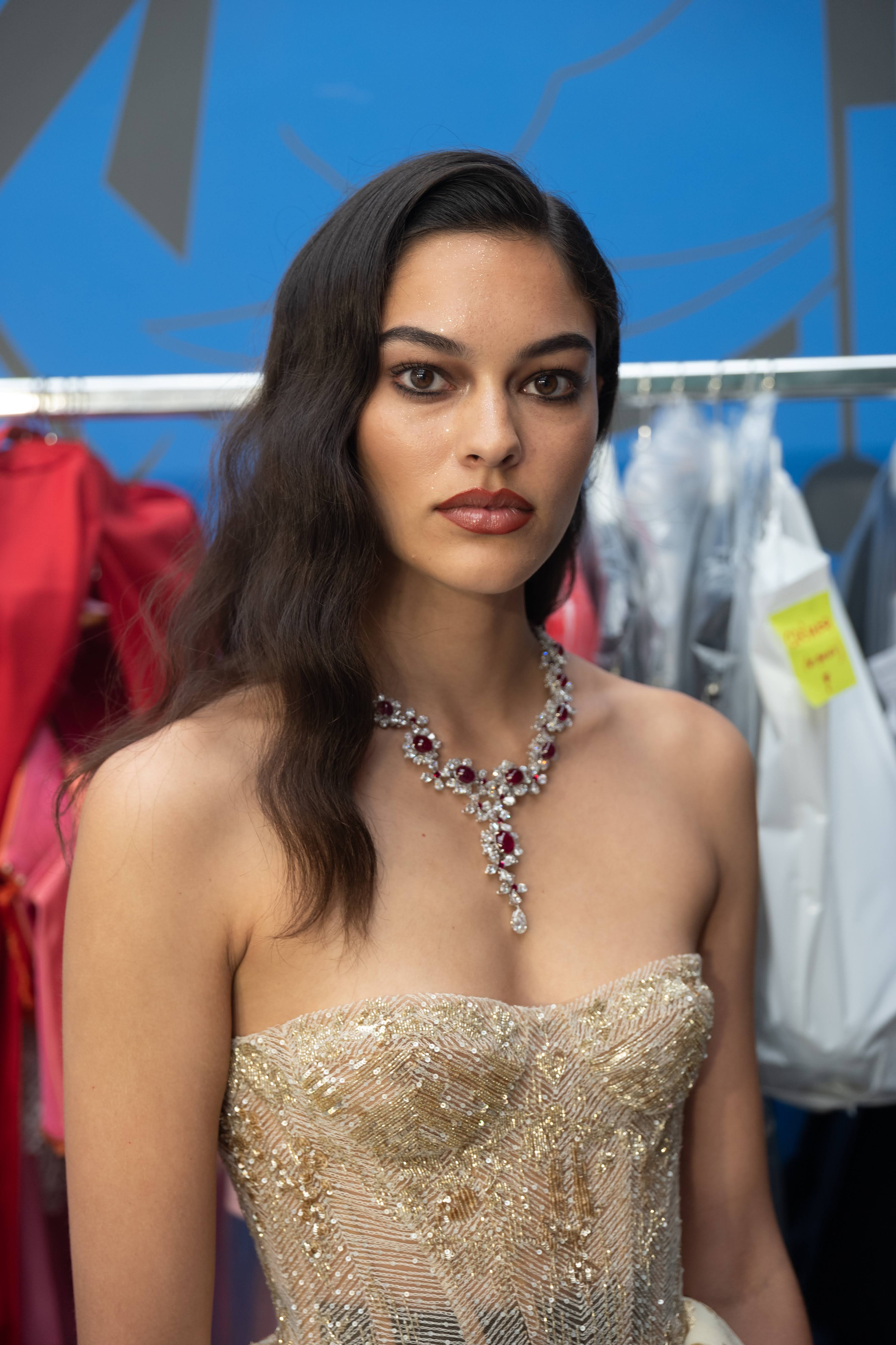 Accessories homage the Uzbekistan culture. Bags are inspired by the local torba, the sack tied with a gold cord, and are made in leather, taffeta or velvet. There are small knitted bags, and bags with long straps made of gold coins. Jewels, gathered along the journey, cover the outfits. Pointy mules with lavish bows and small heels and classic high court shoes in bright colors, devised with Charlotte Olympia, complete the image. Rubies, sapphires, diamonds and emeralds from Faidee complete podium looks.