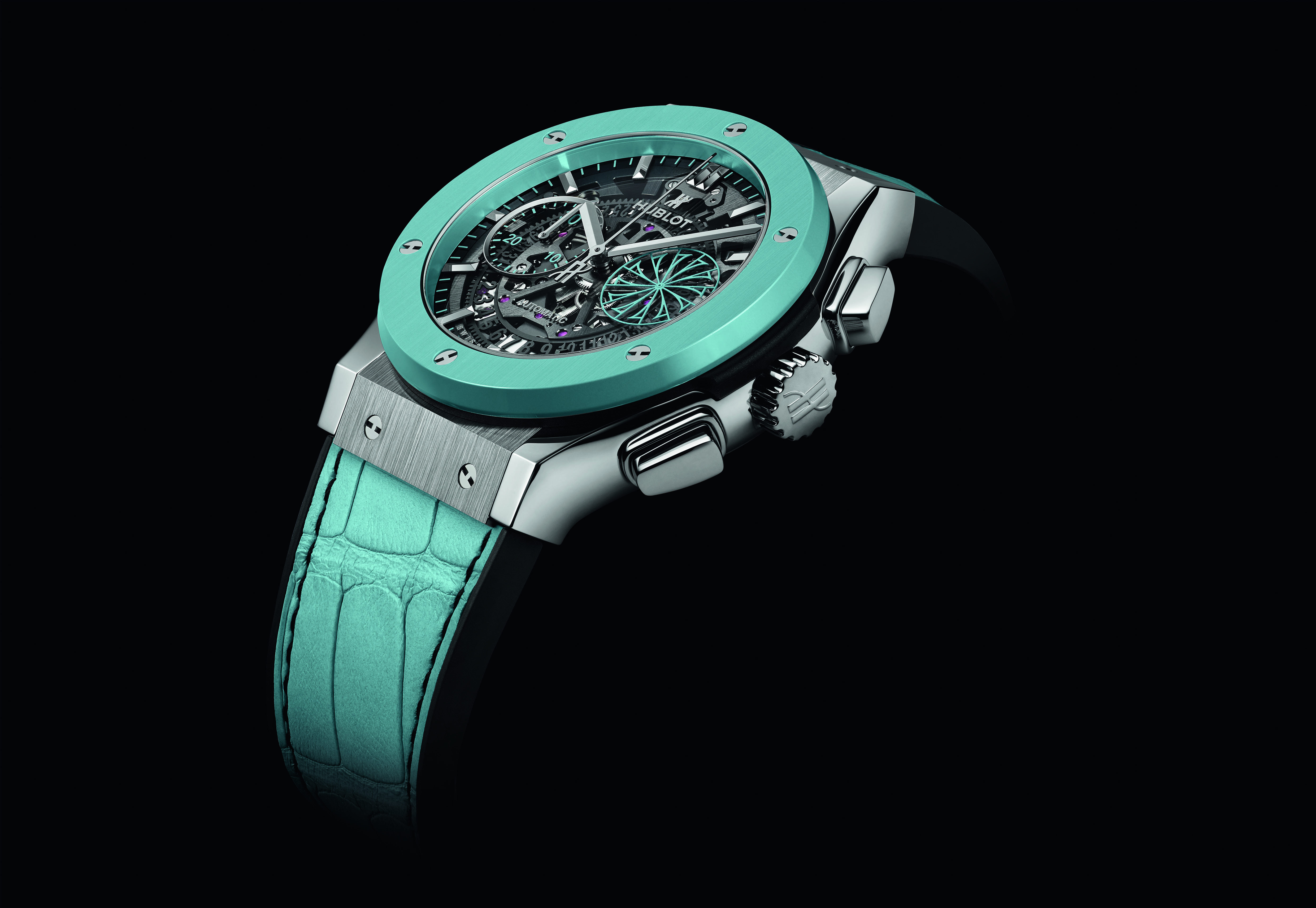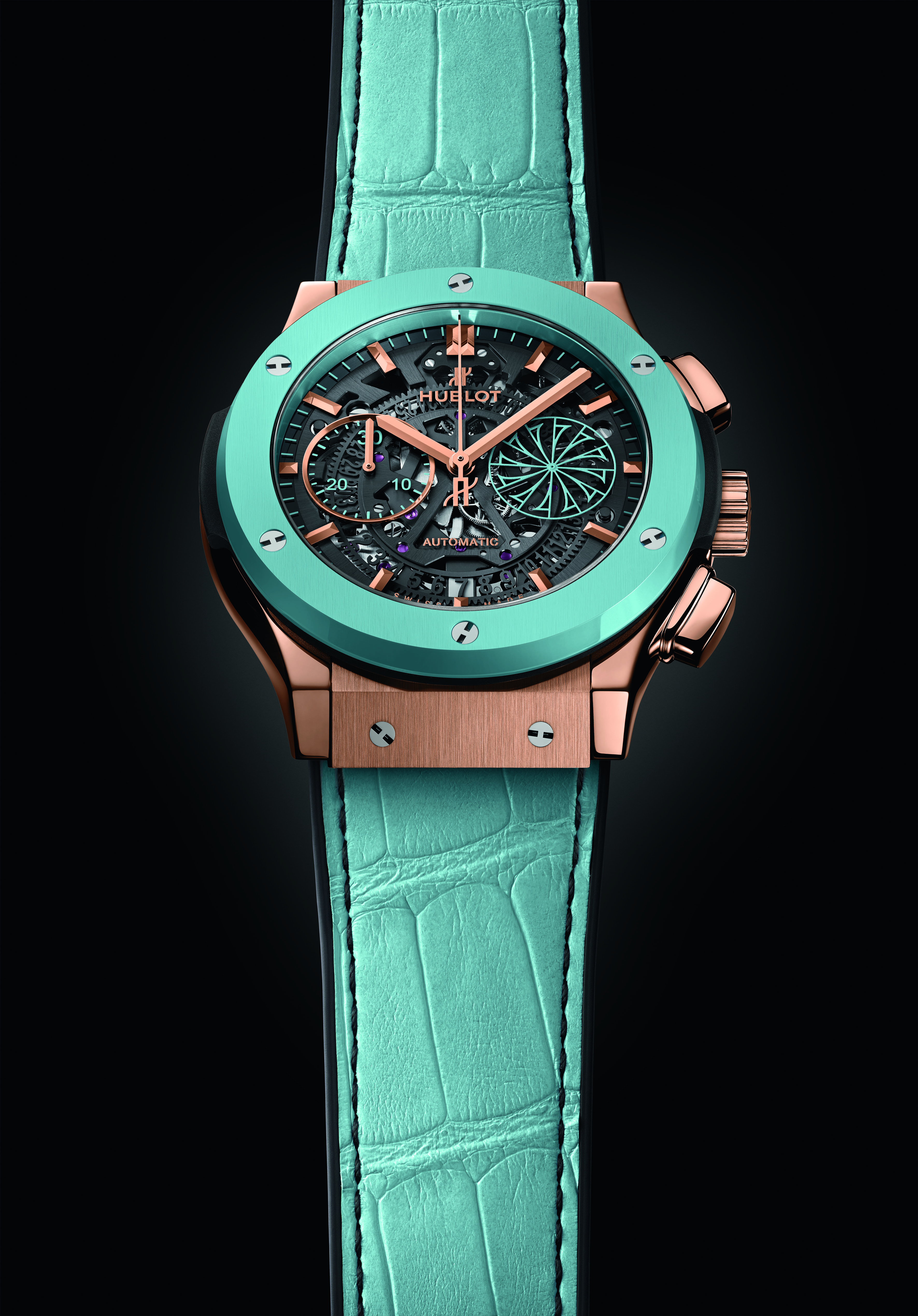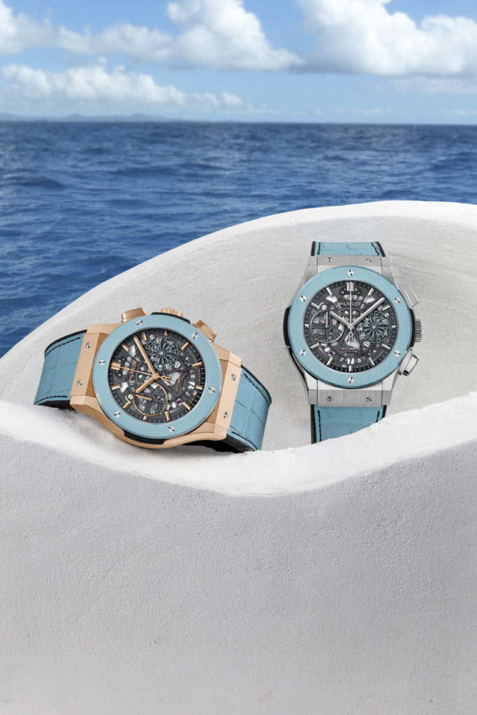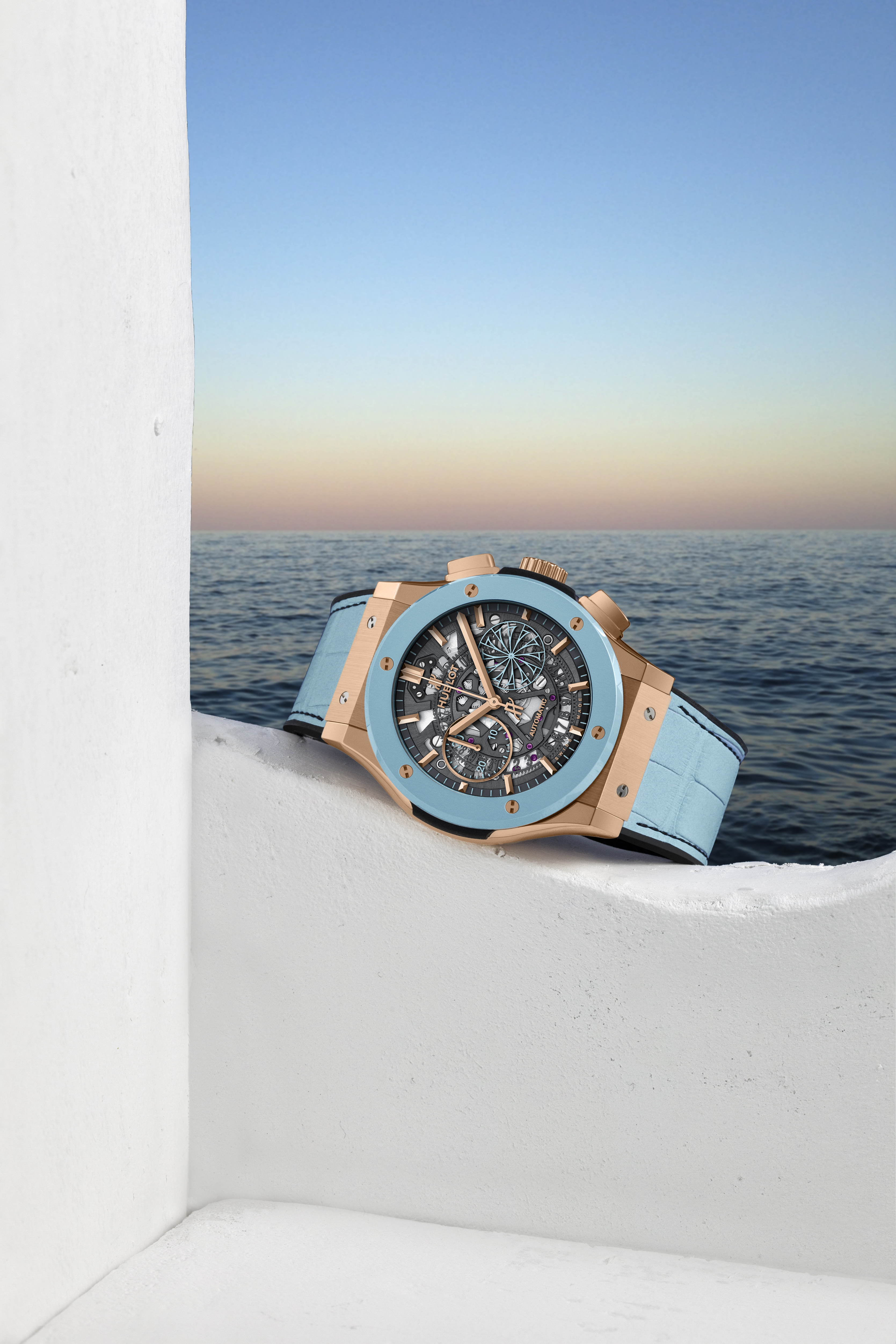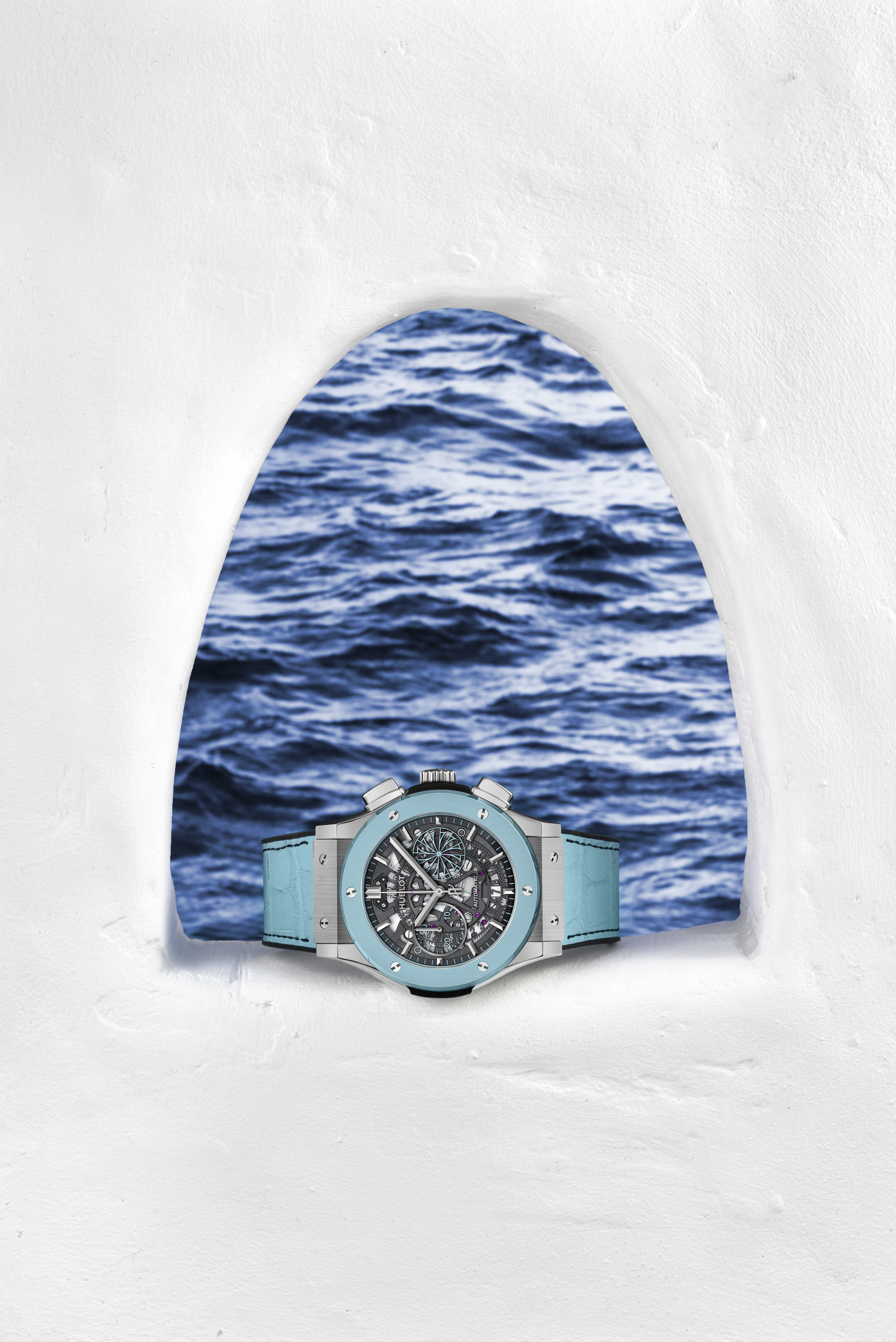 La tendance perpétuée par Hublot, à savoir de montrer le mouvement plutôt que de le cacher, se révèle encore plus impressionnante avec cette collection, uniquement disponible à Mykonos.