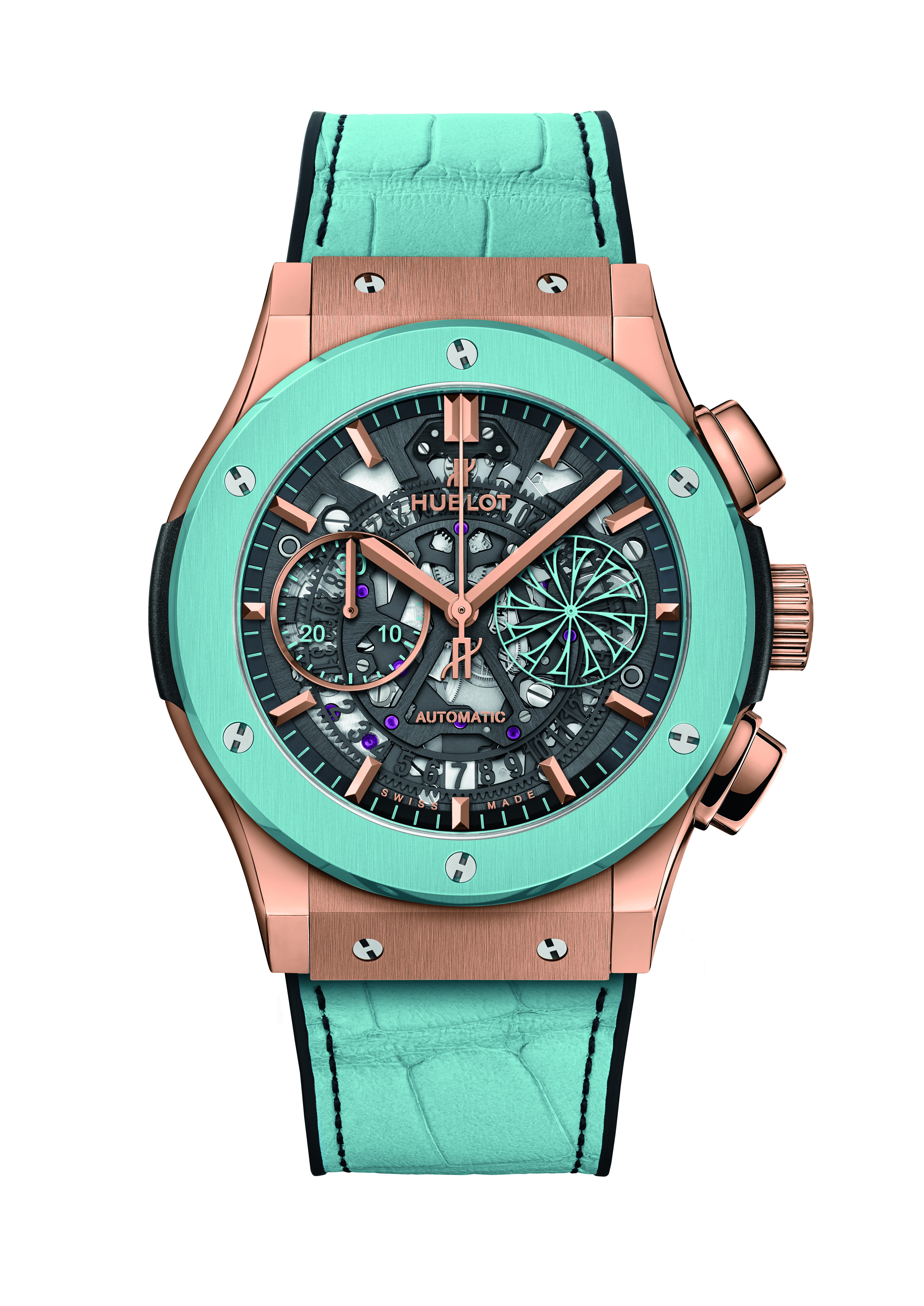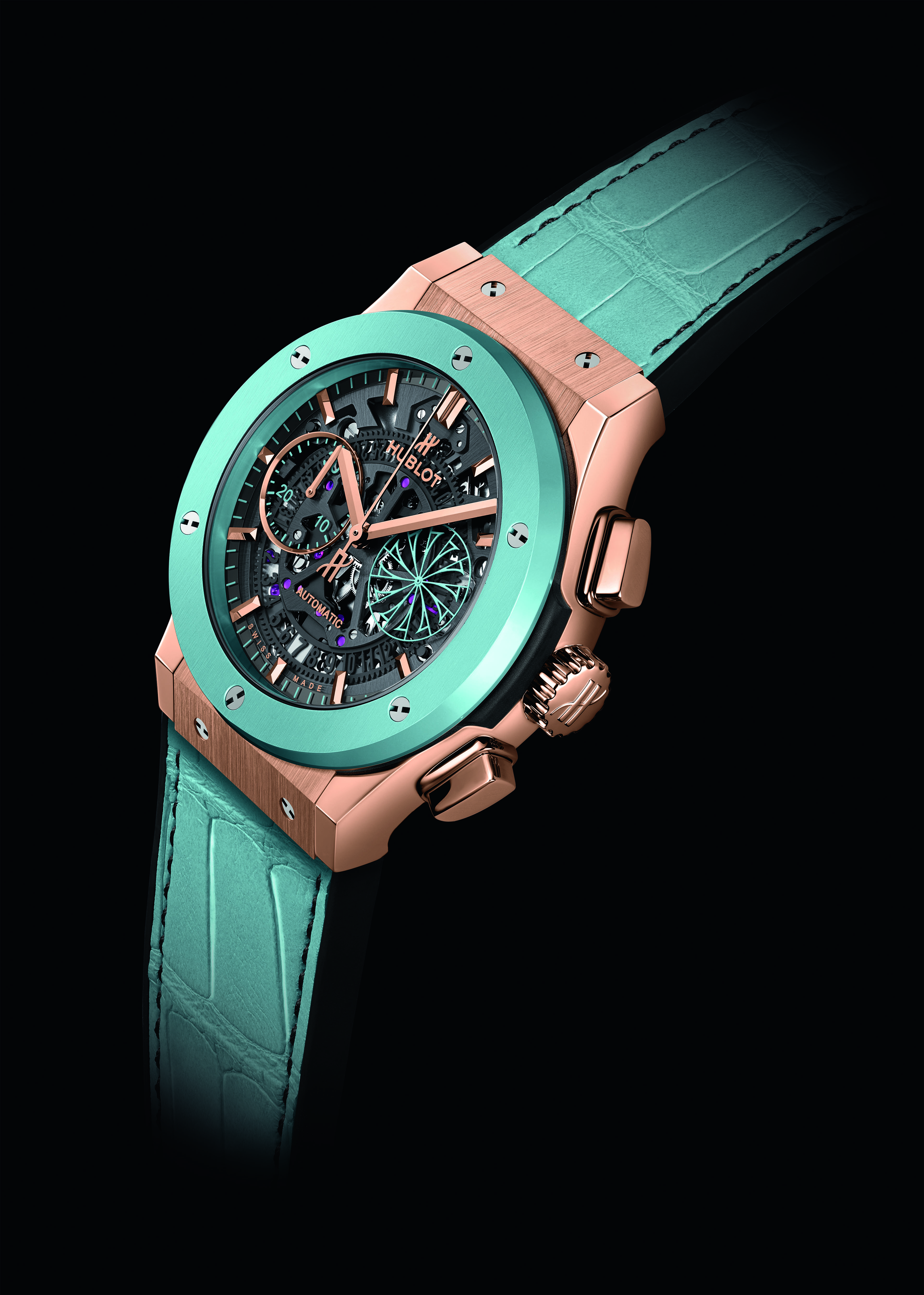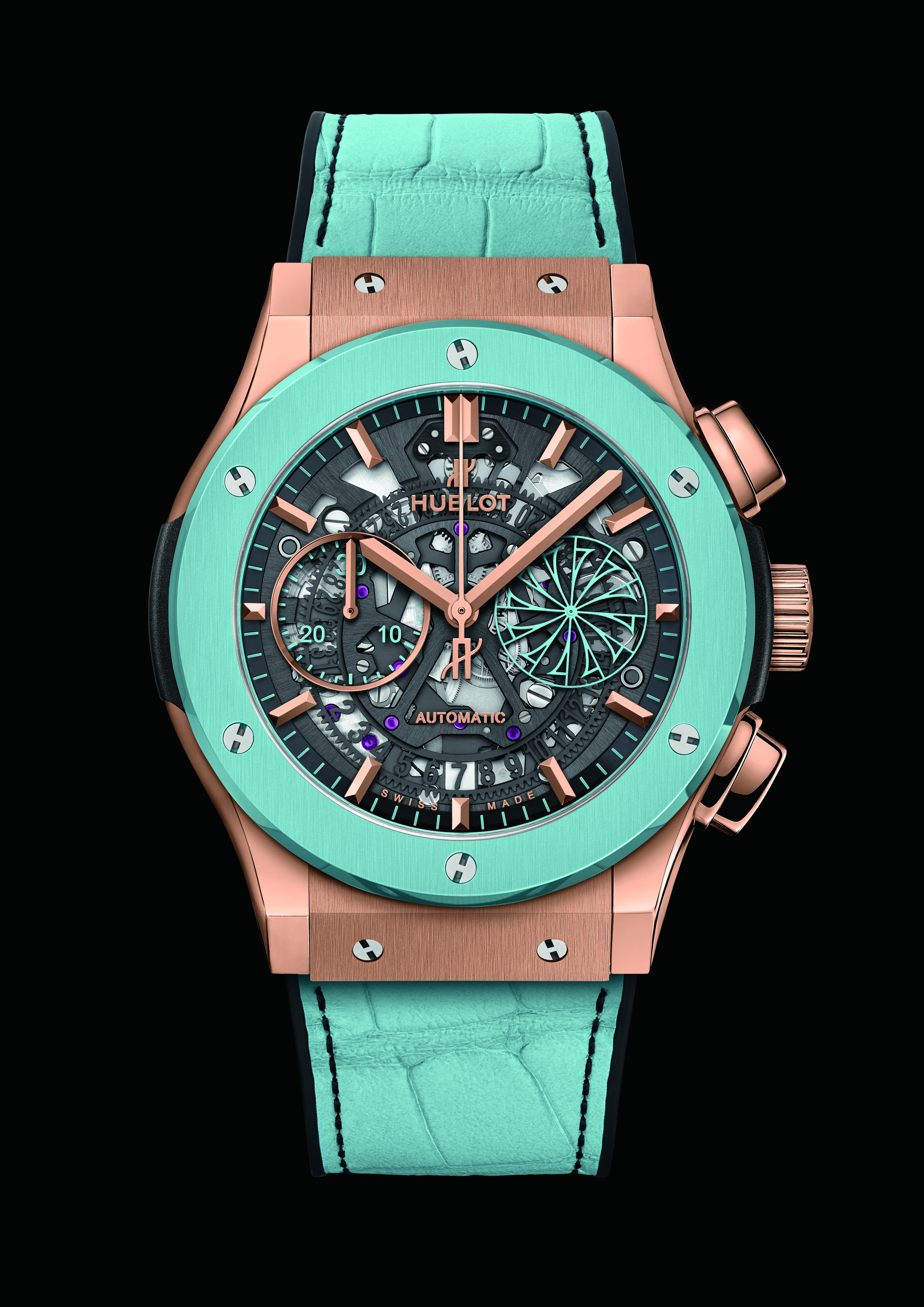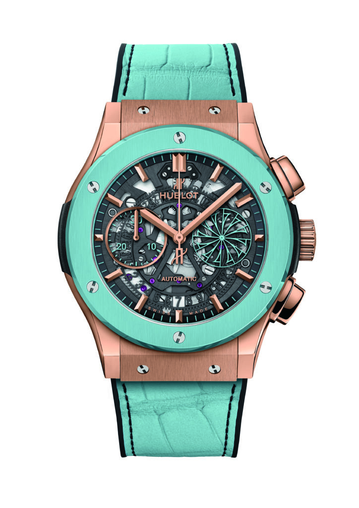 La tendance perpétuée par Hublot, à savoir de montrer le mouvement plutôt que de le cacher, se révèle encore plus impressionnante avec cette collection, uniquement disponible à Mykonos.
