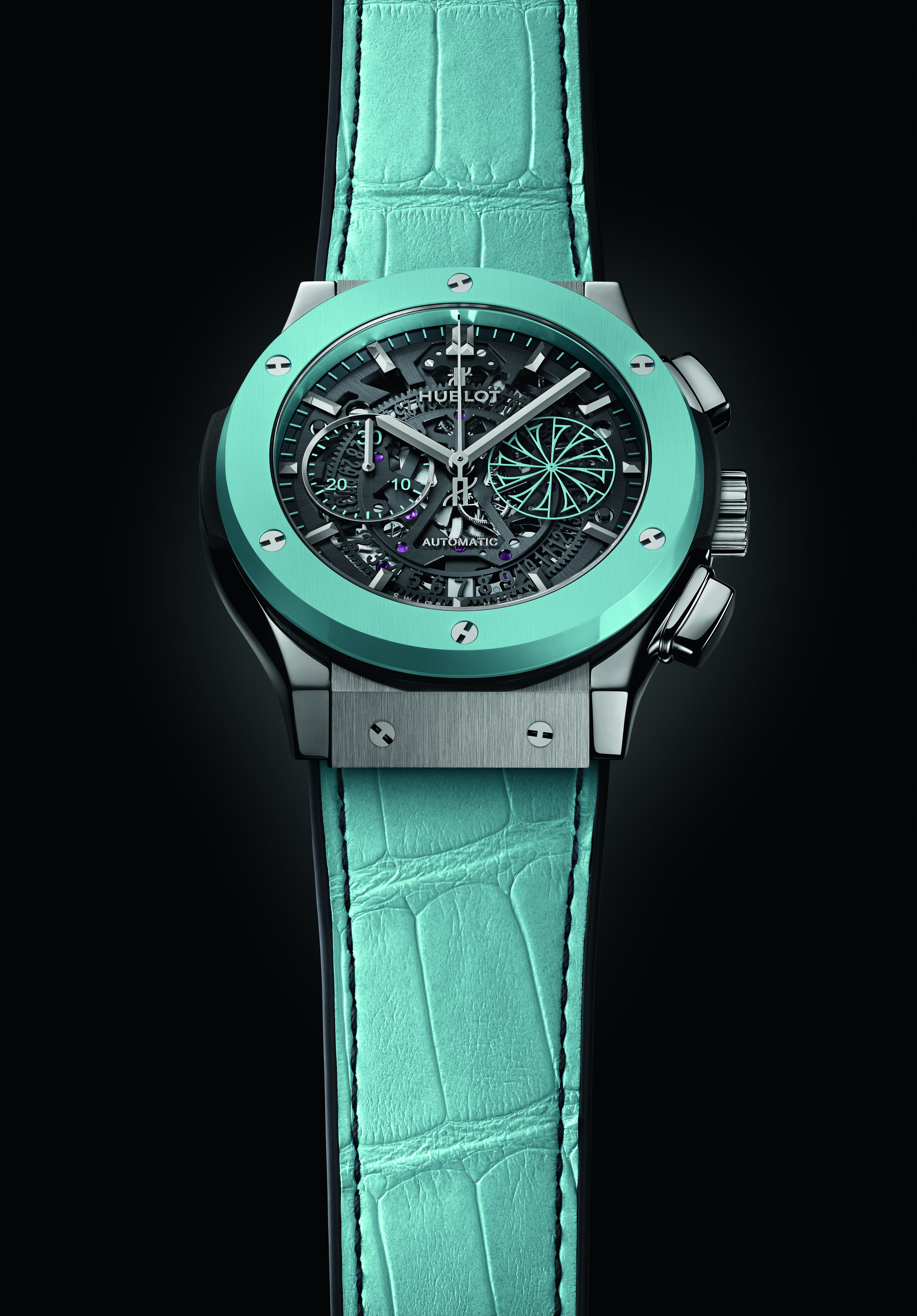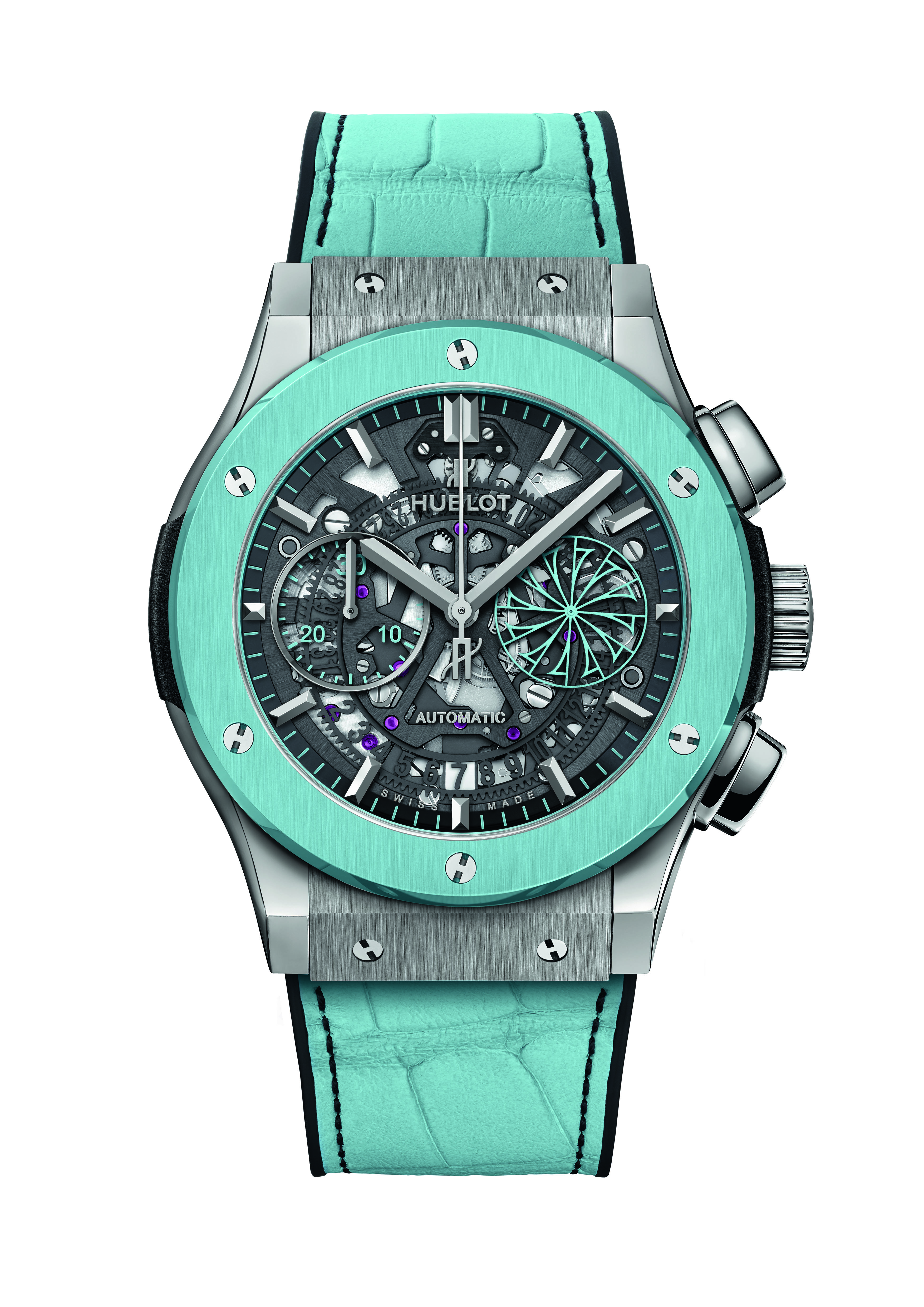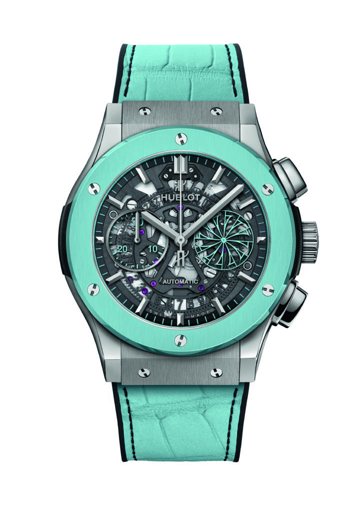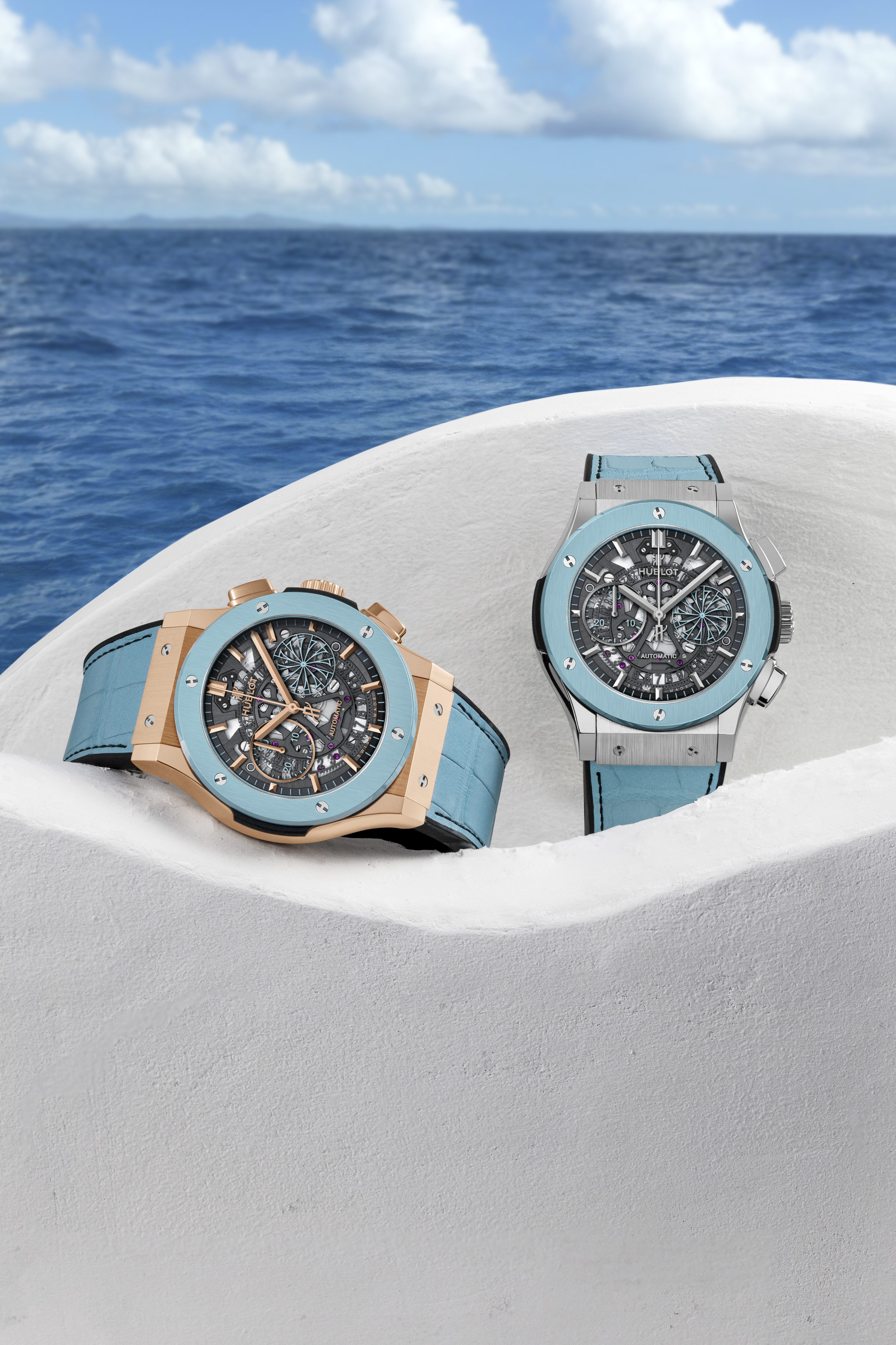 Afin de célébrer l’été, Hublot consacre son modèle de chronographe Classic Fusion Mykonos à cette île ainsi qu’à son symbole emblématique : le discret et élégant moulin à vent. Couronné d’une lunette en céramique bleu ciel, le boîtier de 45 mm comprend un mouvement chronographe squelette à remontage automatique, et est équipé d’un bracelet bi-matière en caoutchouc noir et alligator bleu ciel. Le cadran saphir met en valeur le logo Hublot gravé sur la couronne en King Gold ou titane polis.