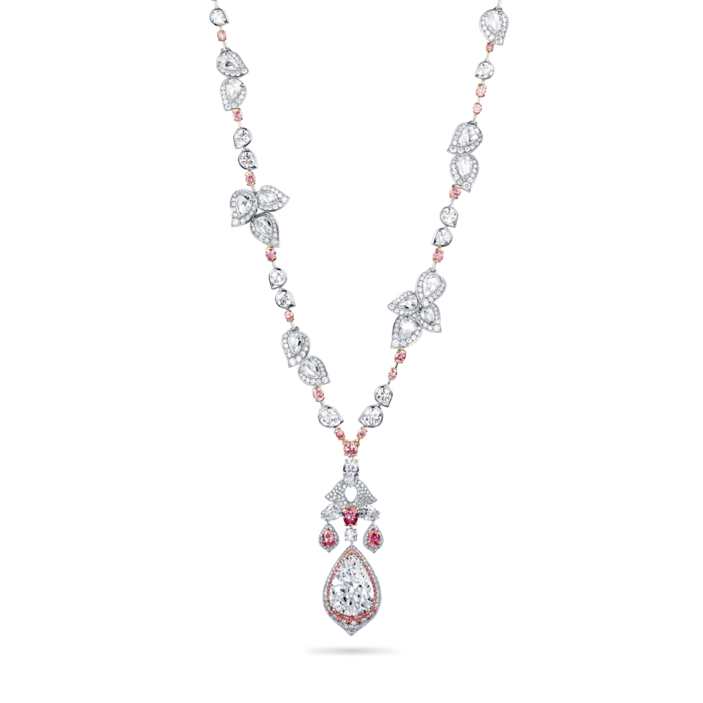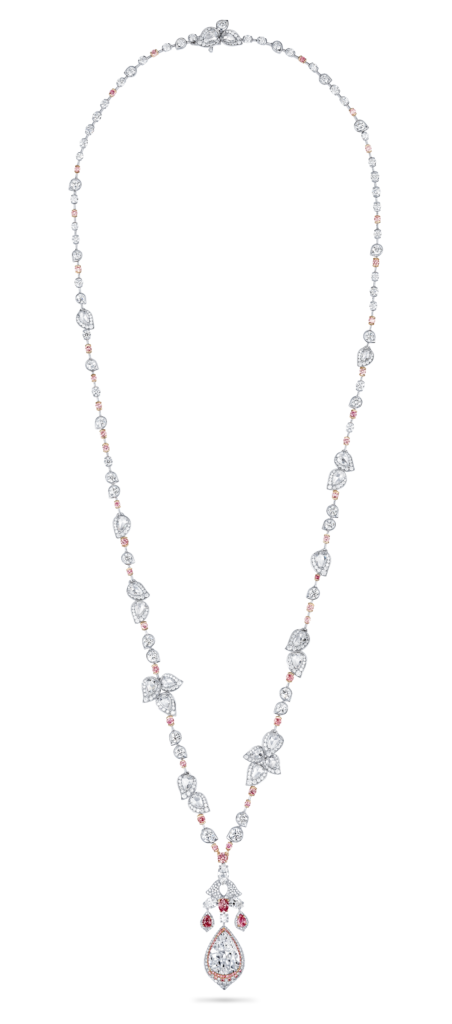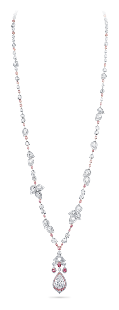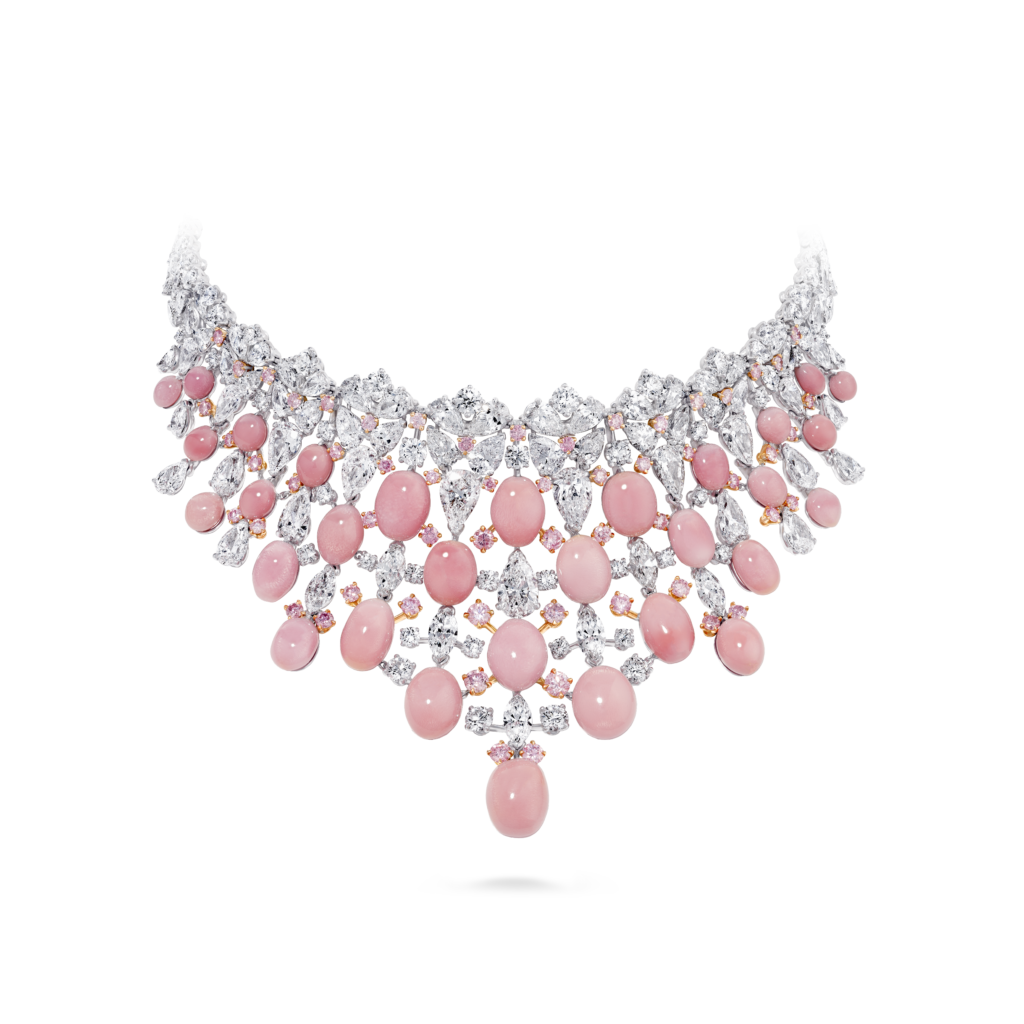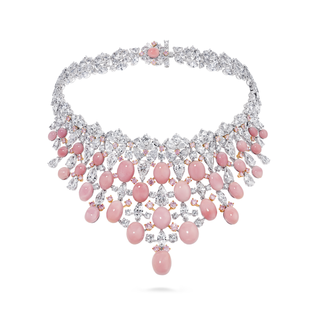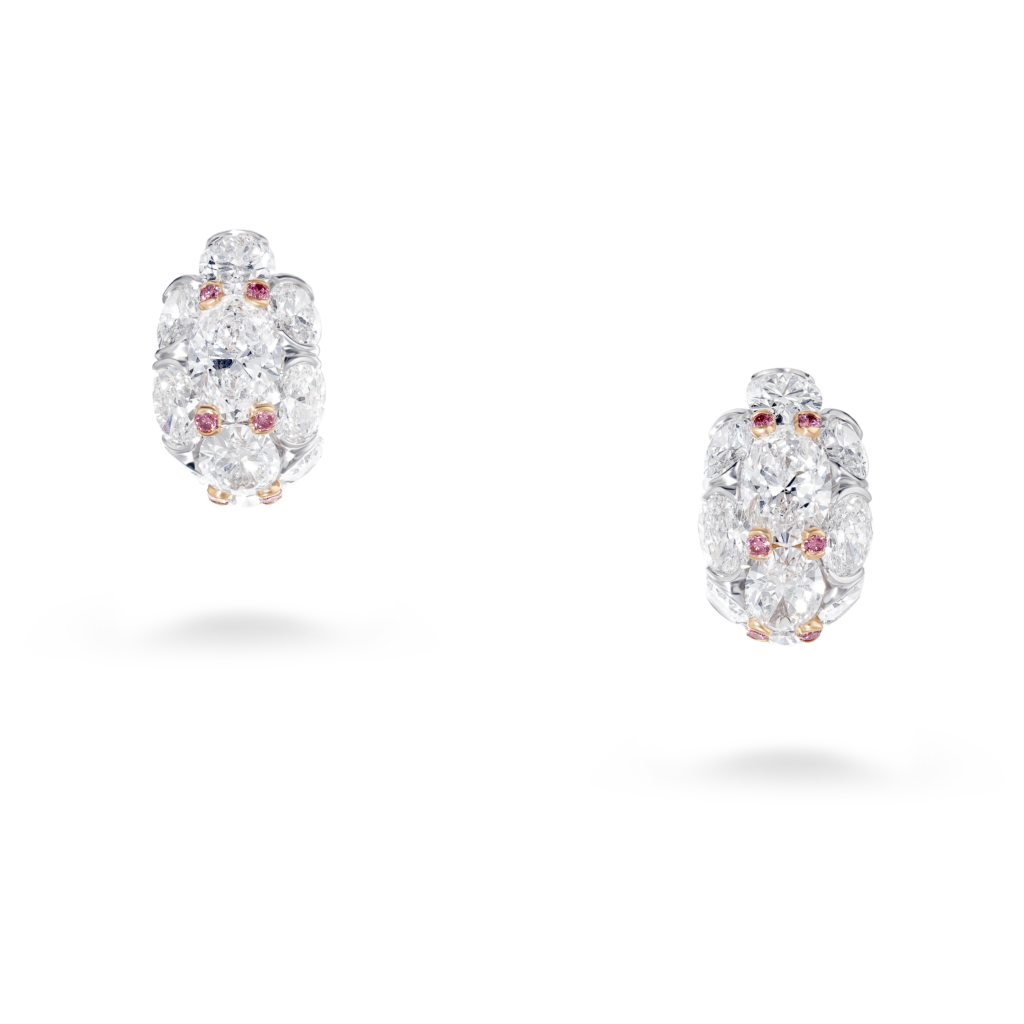 La perle de conche, choisie par Jeremy Morris pour évoquer la beauté d’un coucher de soleil rosé à l’horizon de l’océan, est la plus rare de ses découvertes. Elle est placée au centre d’un collier et de boucles d’oreilles à couper le souffle, tous deux sertis de diamants blancs spectaculaires.