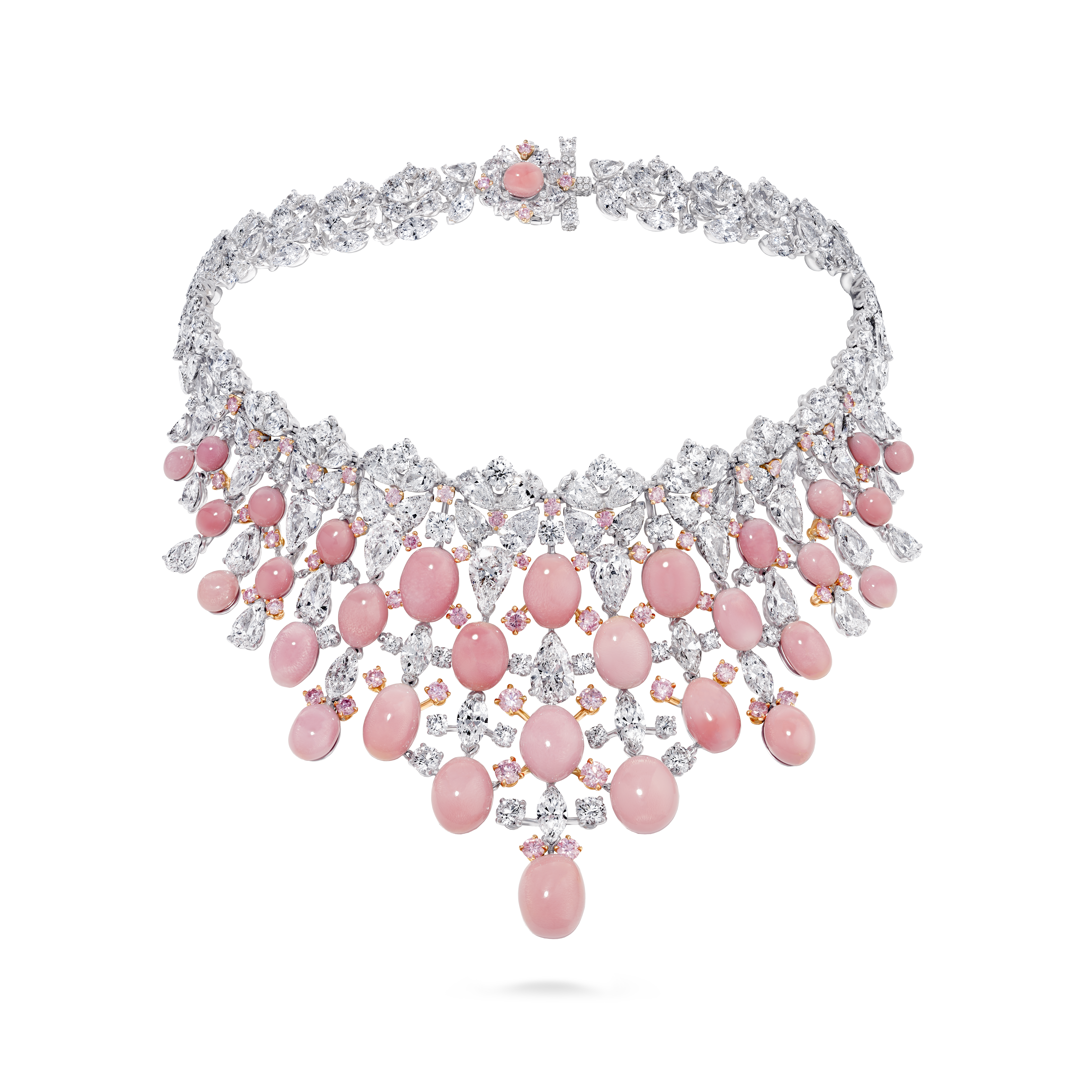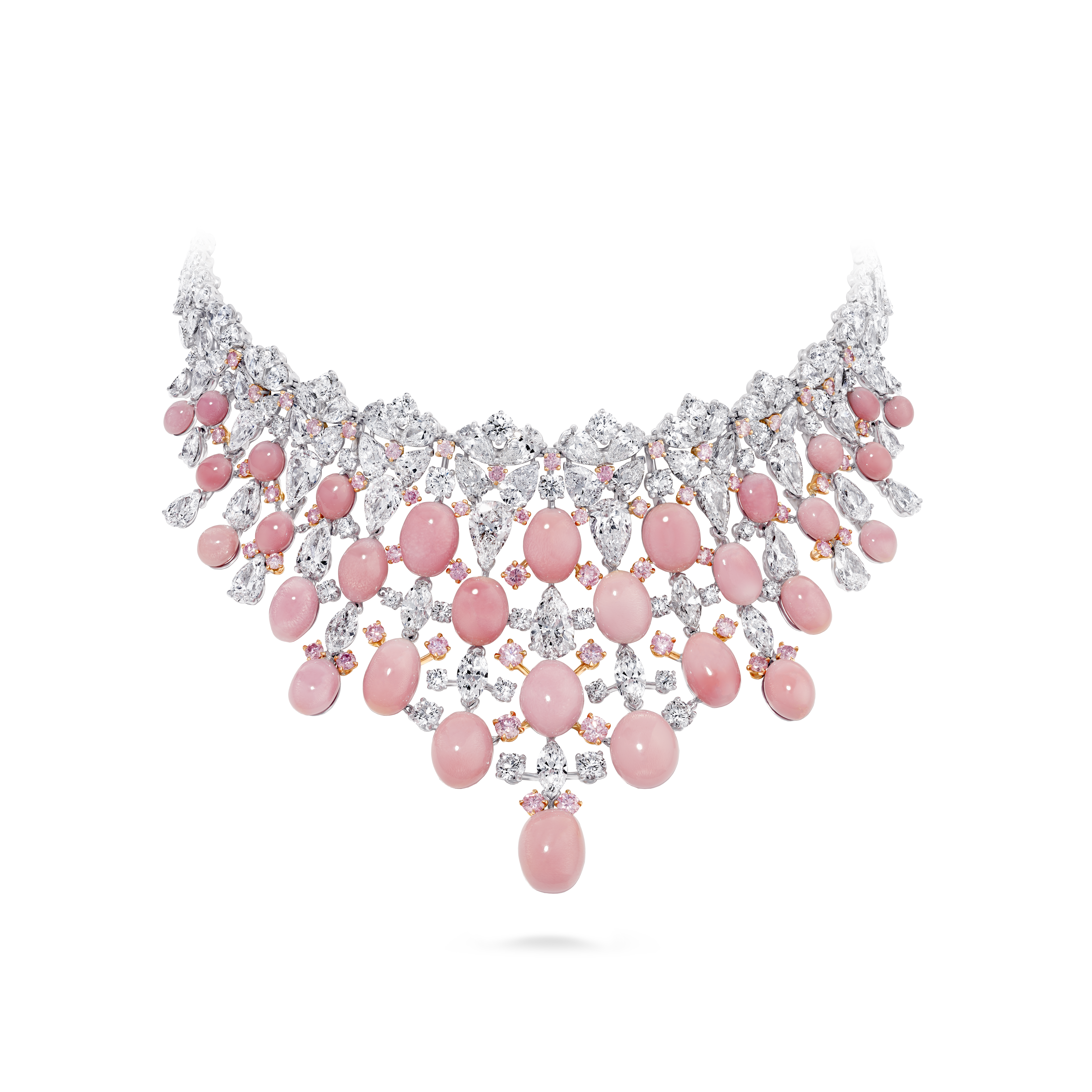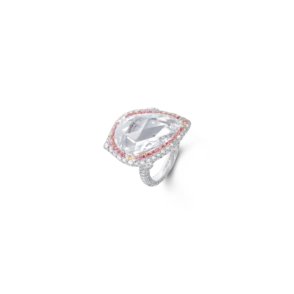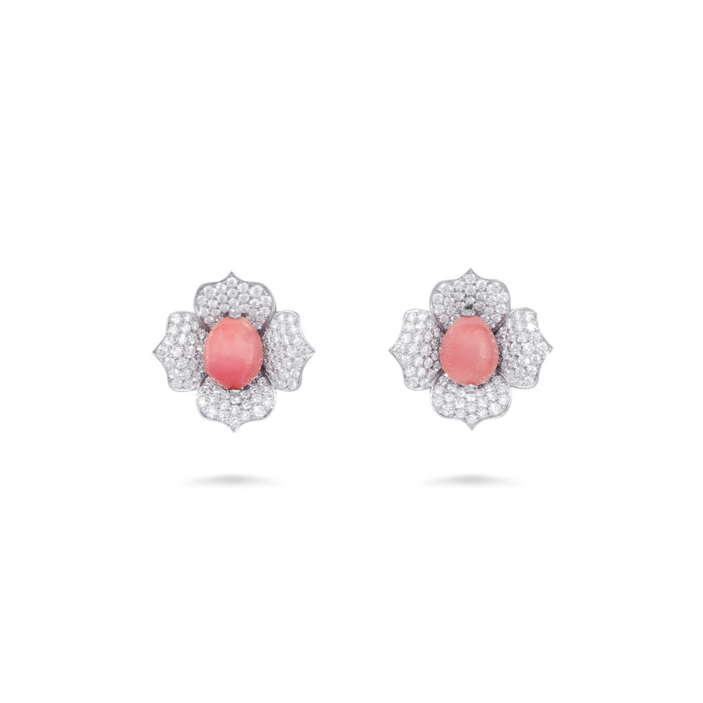 La perle de conche, choisie par Jeremy Morris pour évoquer la beauté d’un coucher de soleil rosé à l’horizon de l’océan, est la plus rare de ses découvertes. Elle est placée au centre d’un collier et de boucles d’oreilles à couper le souffle, tous deux sertis de diamants blancs spectaculaires.