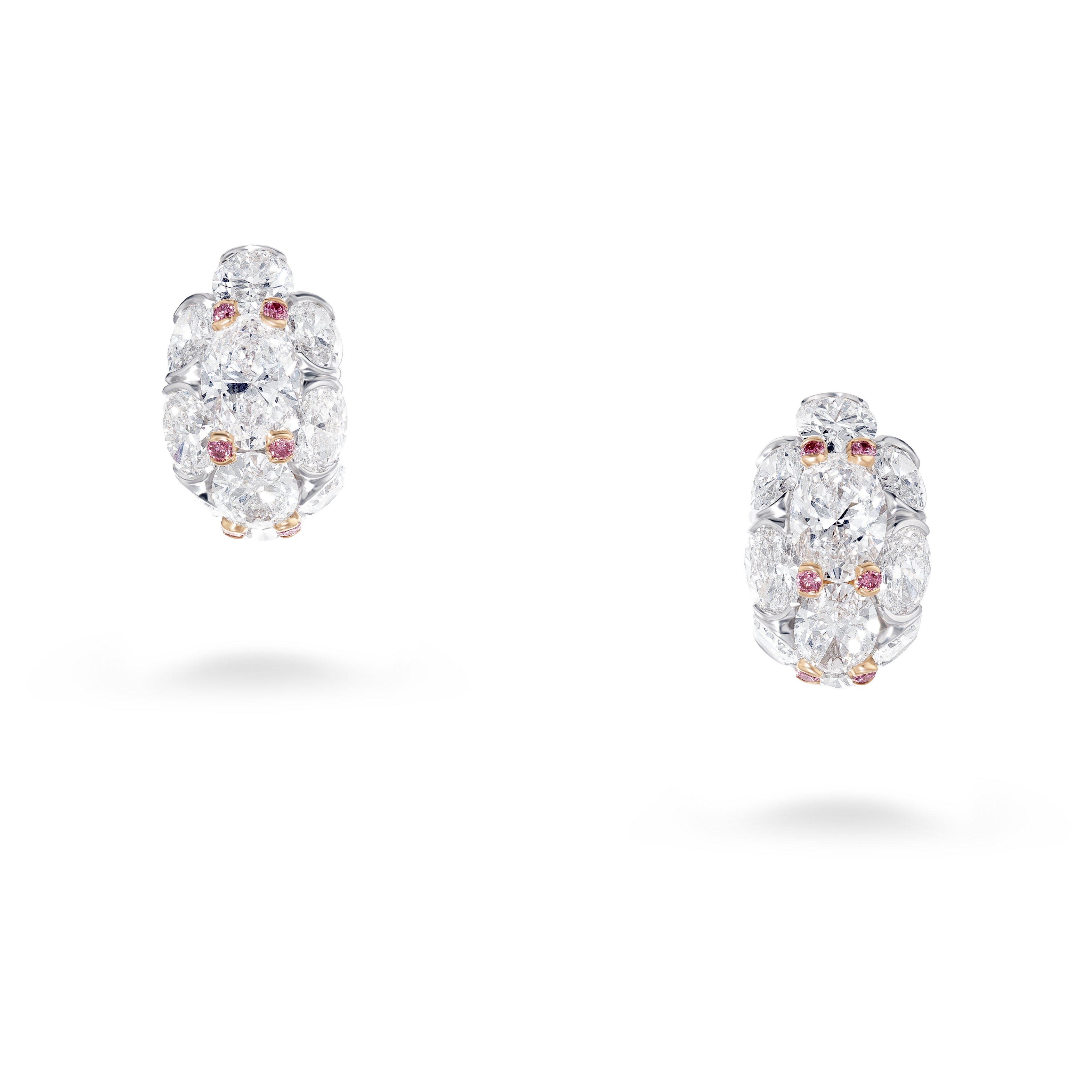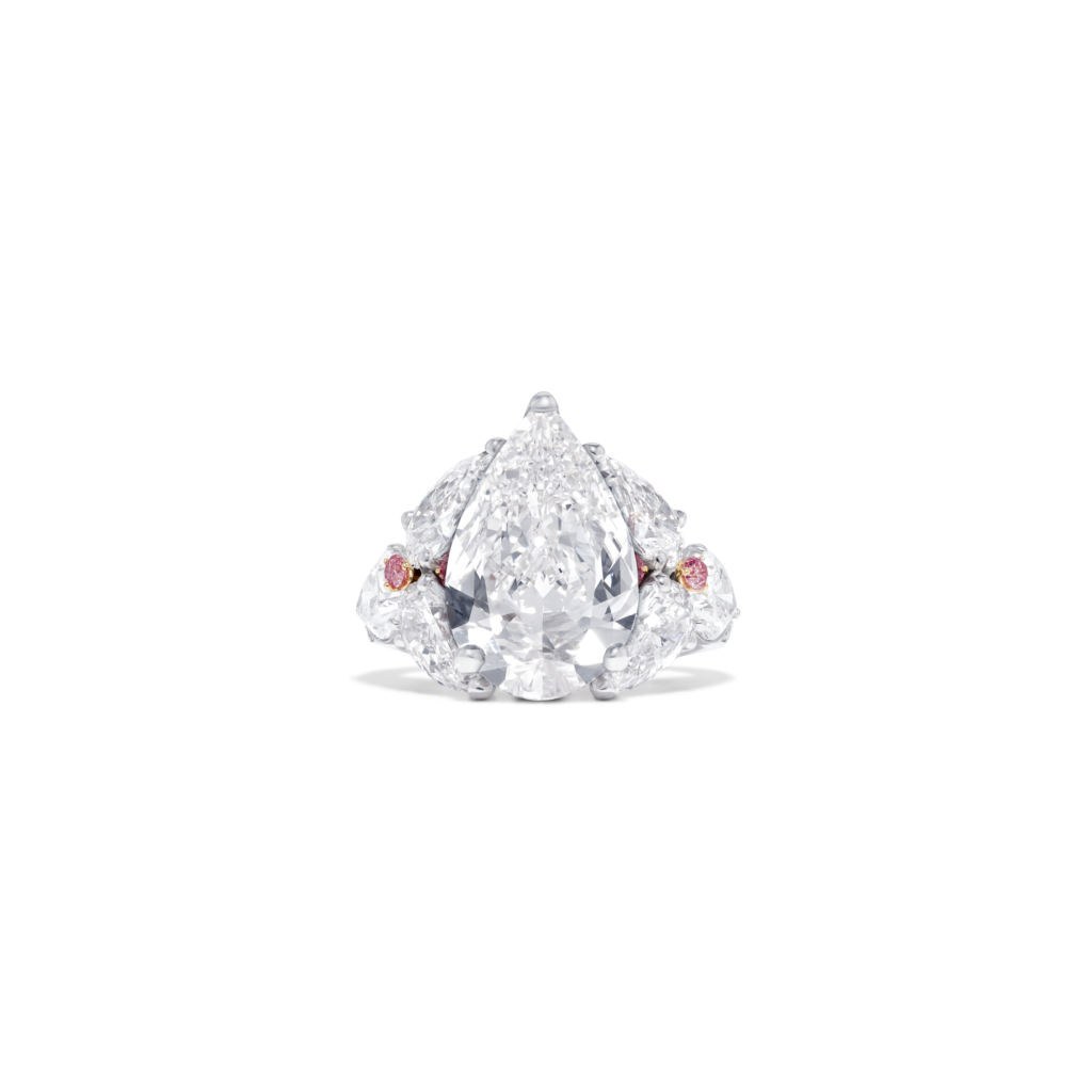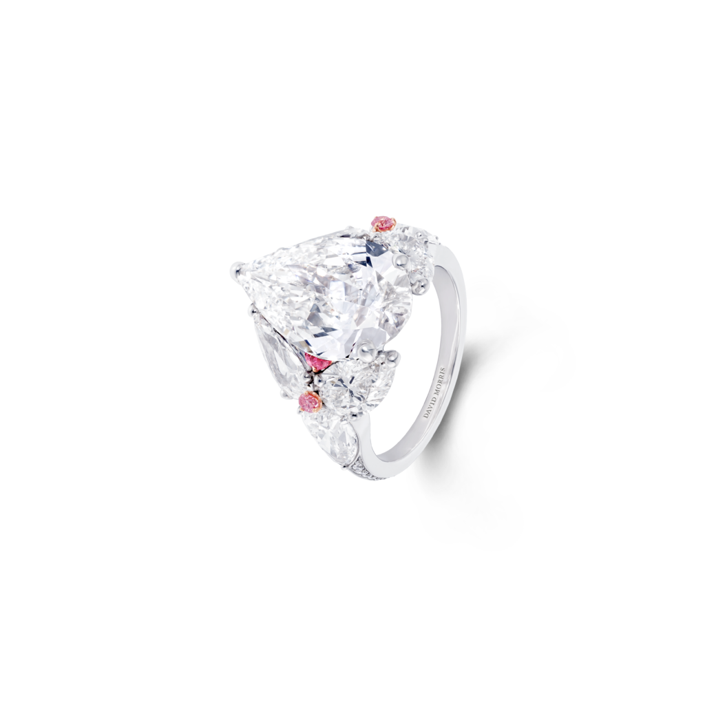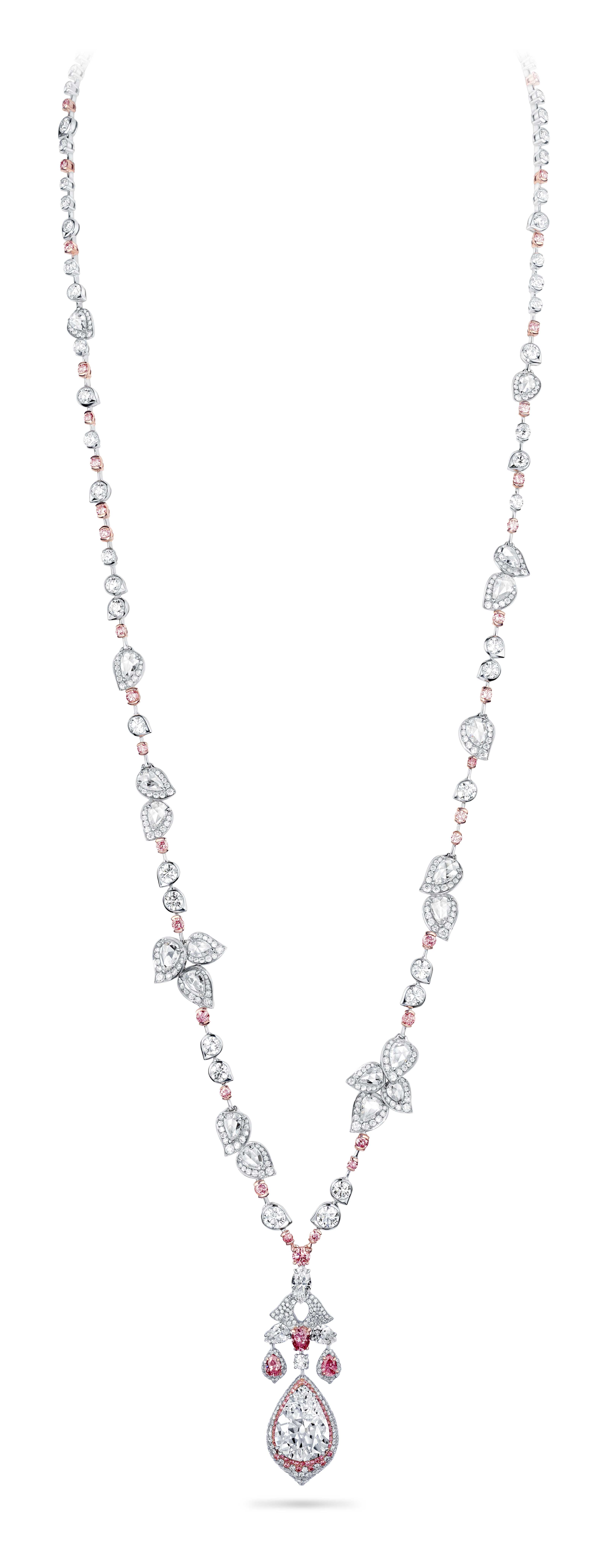 La perle de conche, choisie par Jeremy Morris pour évoquer la beauté d’un coucher de soleil rosé à l’horizon de l’océan, est la plus rare de ses découvertes. Elle est placée au centre d’un collier et de boucles d’oreilles à couper le souffle, tous deux sertis de diamants blancs spectaculaires.
