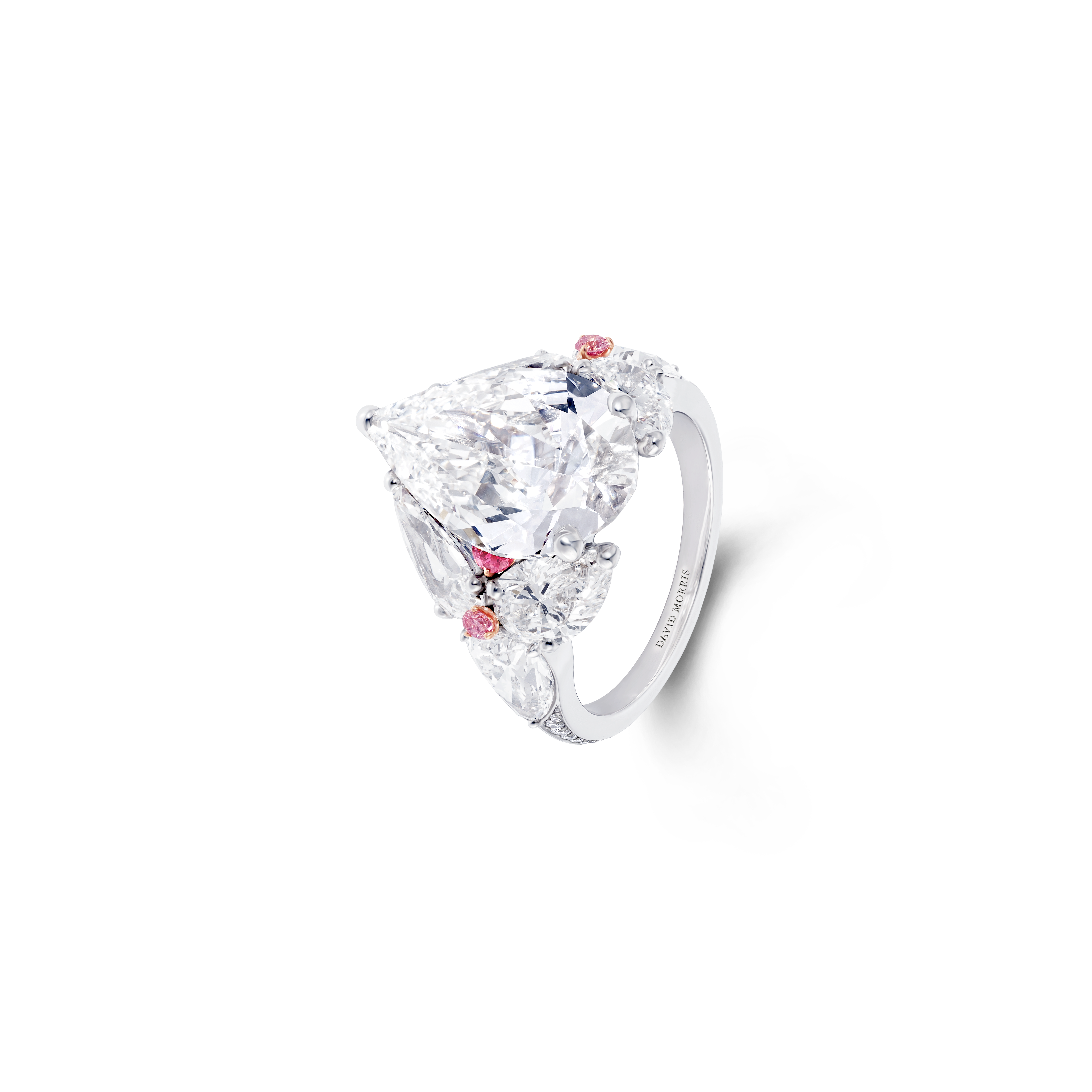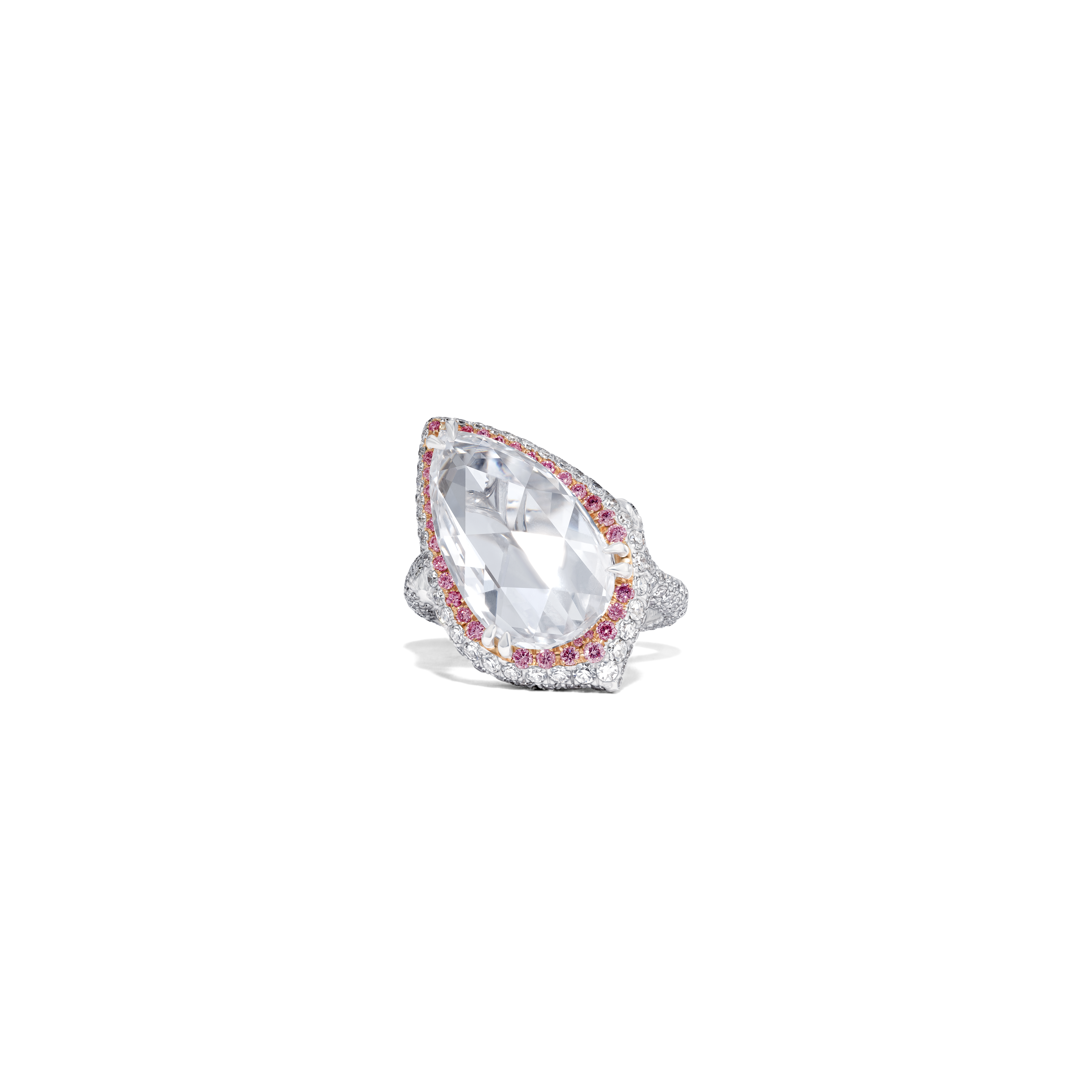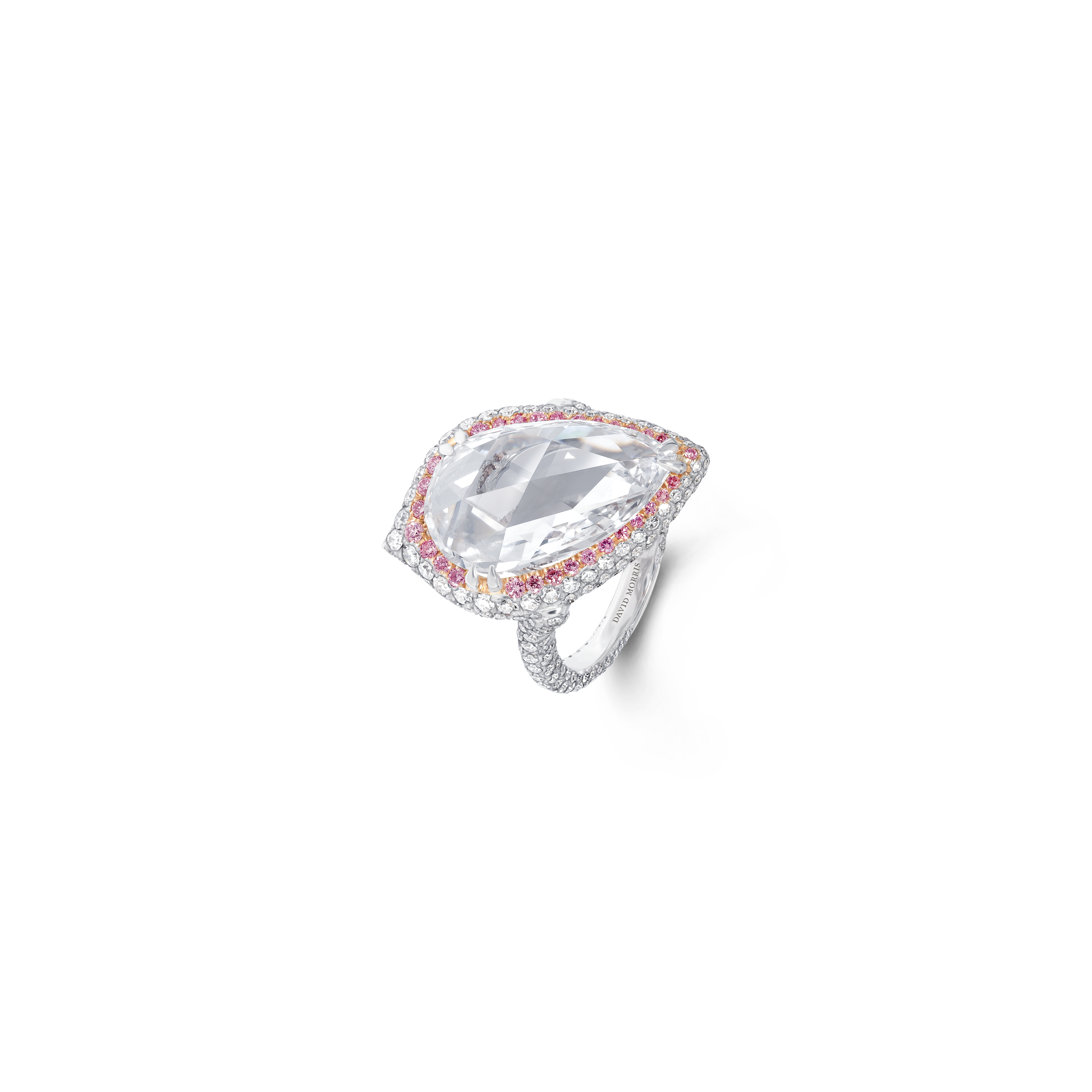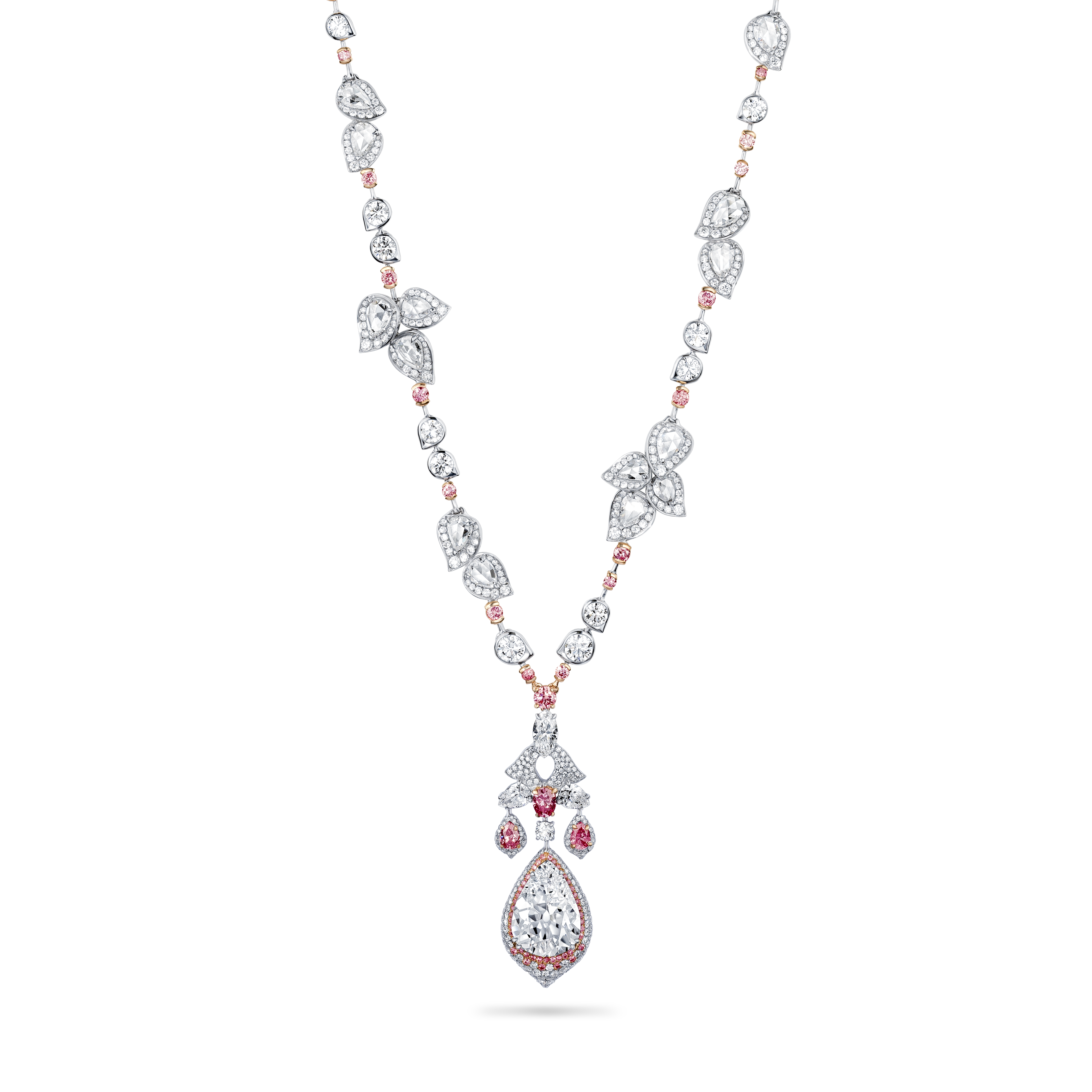 La perle de conche, choisie par Jeremy Morris pour évoquer la beauté d’un coucher de soleil rosé à l’horizon de l’océan, est la plus rare de ses découvertes. Elle est placée au centre d’un collier et de boucles d’oreilles à couper le souffle, tous deux sertis de diamants blancs spectaculaires.