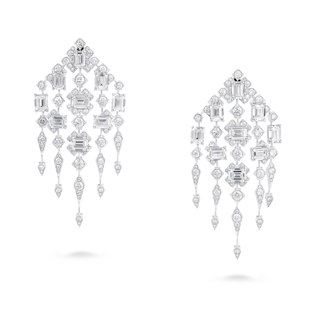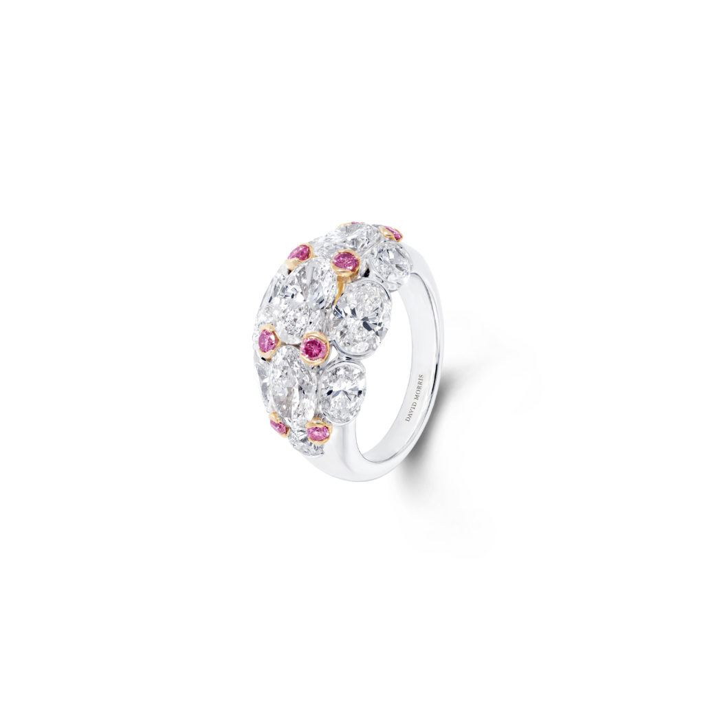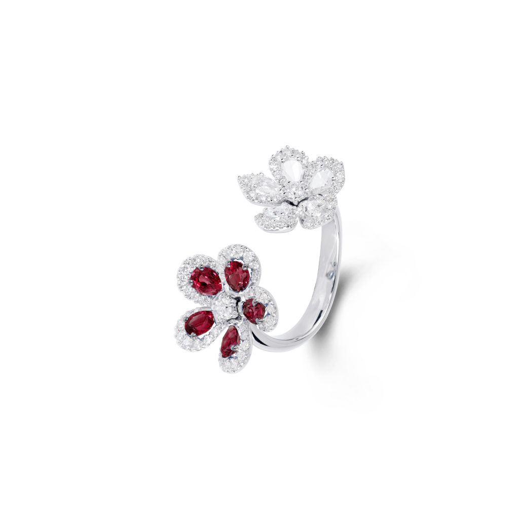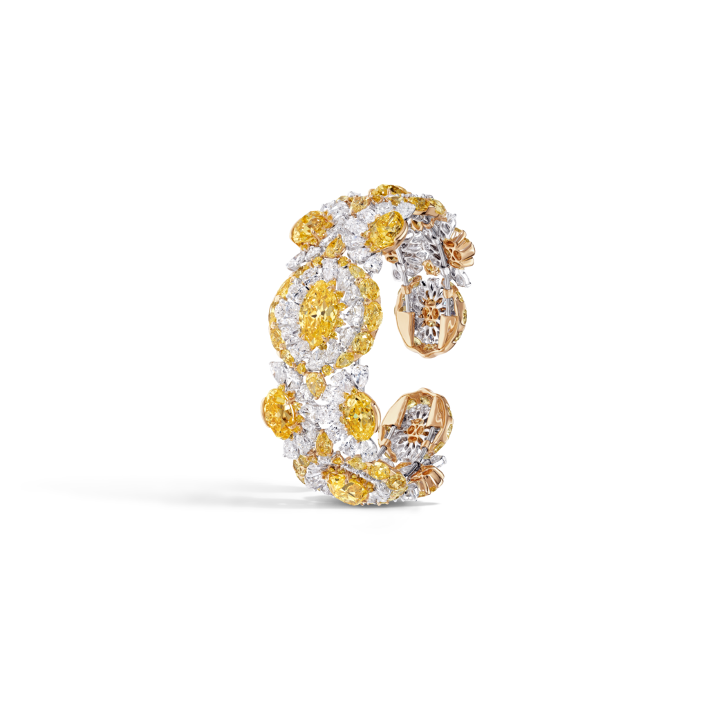 Ces oliveraies verdoyantes parsemées de fleurs sauvages exubérantes rappellent certaines couleurs d’émeraudes les plus rares, ces bougainvilliers en fleurs prennent vie tels les rubis dans ce somptueux collier aux motifs floraux. Cette manchette dont les tonalités de diamants jaunes ne sont pas sans rappeler certains poissons rares que l’on découvre parmi les récifs de corail de l’ile. Vous y trouverez également de plus petits trésors, tels que des boucles d’oreilles délicates serties de tourmalines Paraíba. – un clin d’œil aux eaux turquoise de la plage isolée préférée de Jeremy Morris – et des bagues cocktail classiques serties de diamants blancs amplifiés par des diamants roses éclatants
