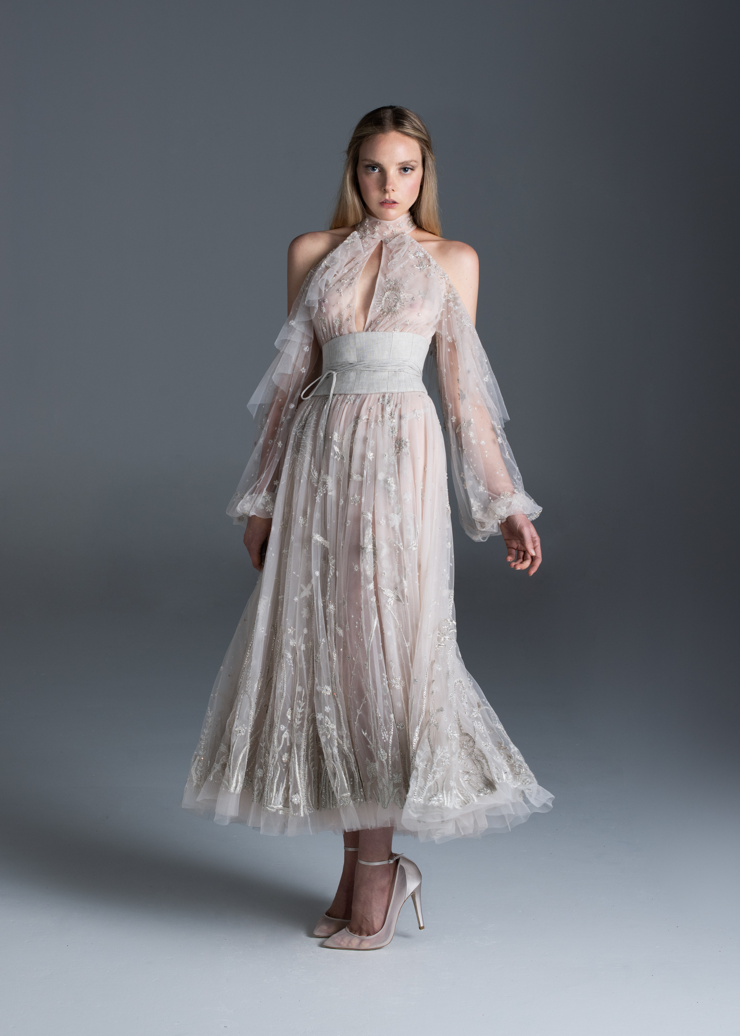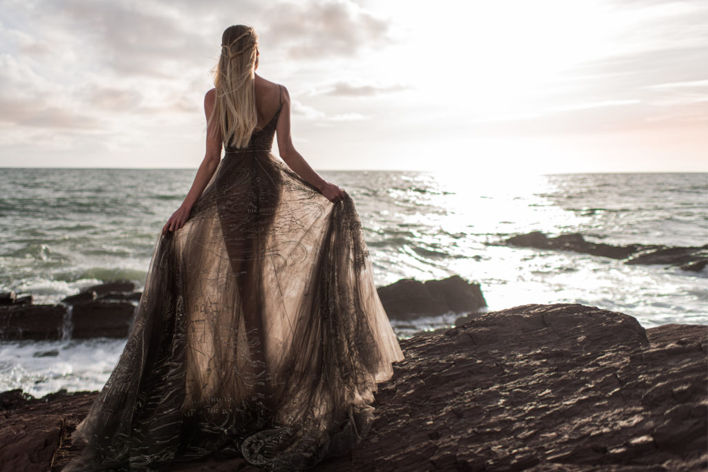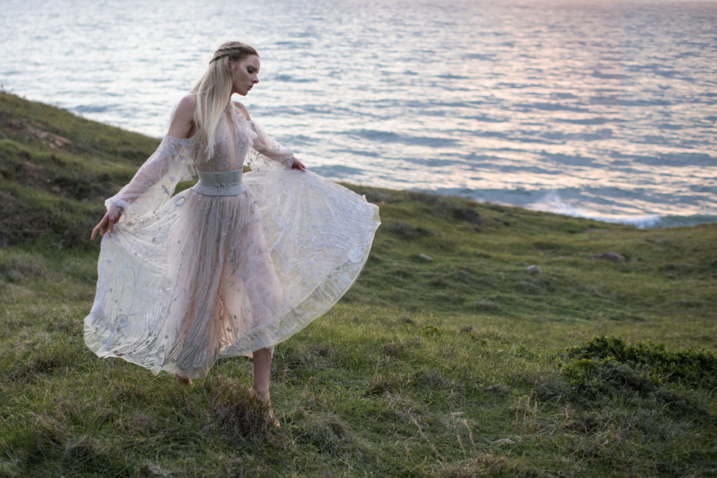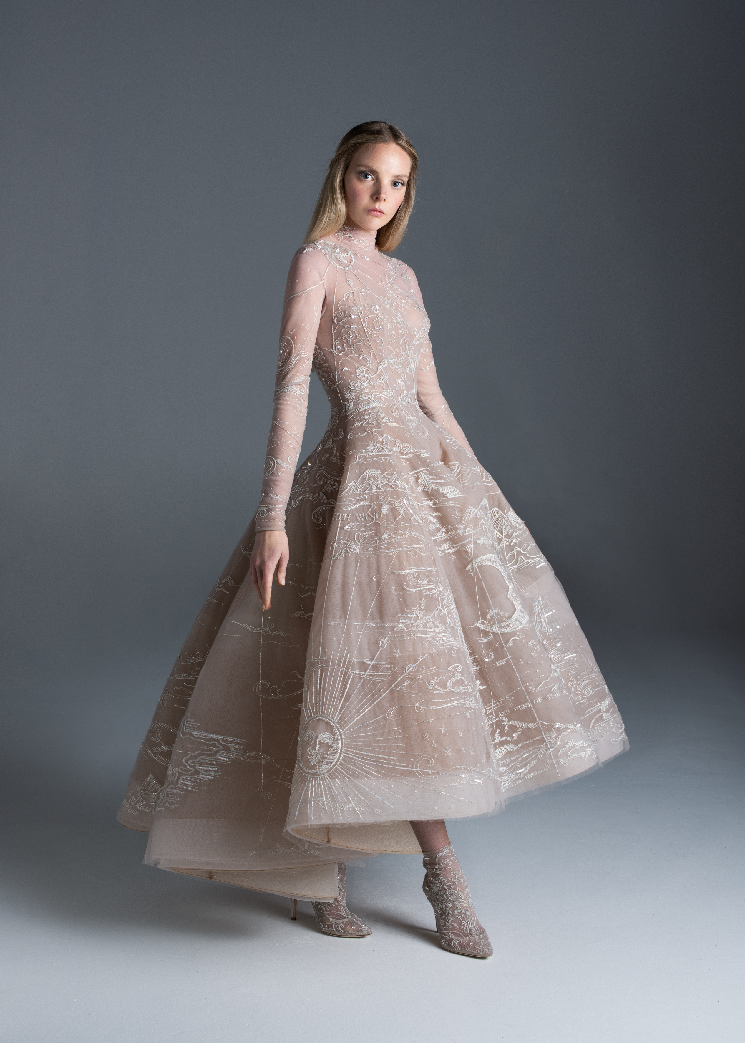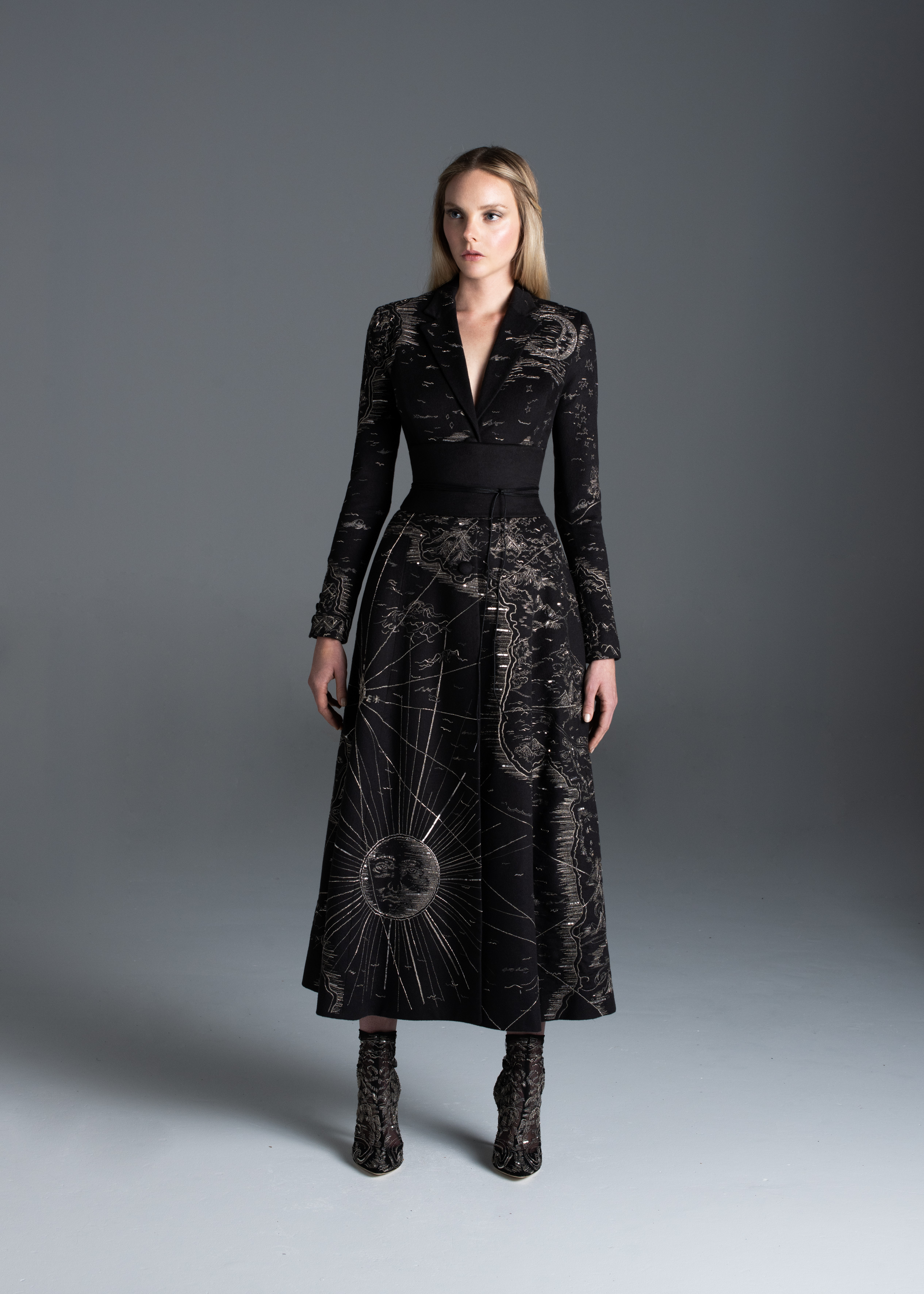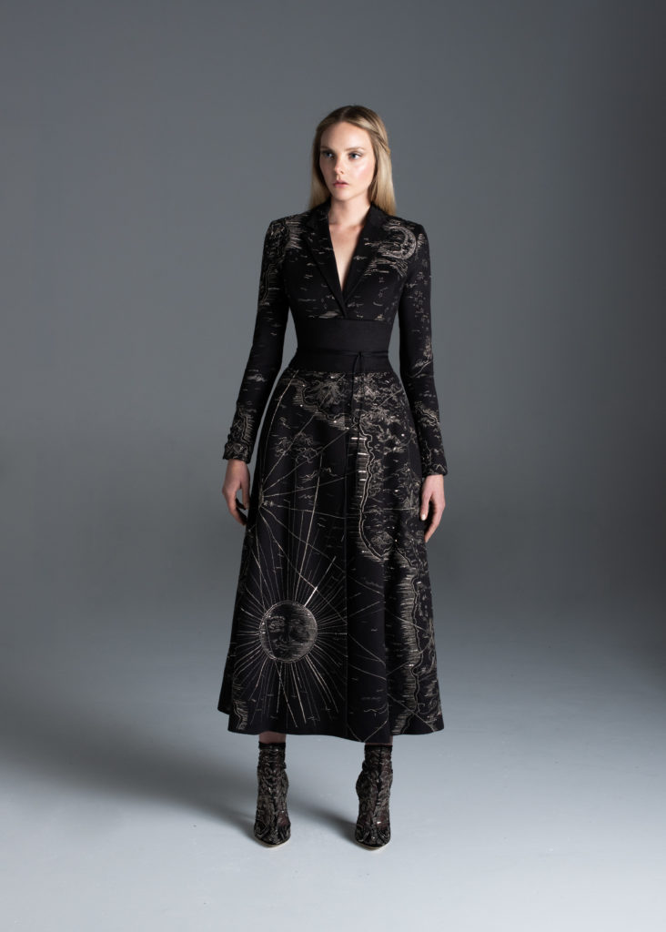 Stand out pieces include a tailored cashmere coat and dégradé sleeved cocktail gown, each gilded with celestial-inspired map embroidery; illustrating the heroine’s journey through the northern, southern, eastern and western winds of the tale. Whilst corsetry creates beautifully defined waisted silhouette, showcasing the artisanal vigour of the Paolo Sebastian atelier.