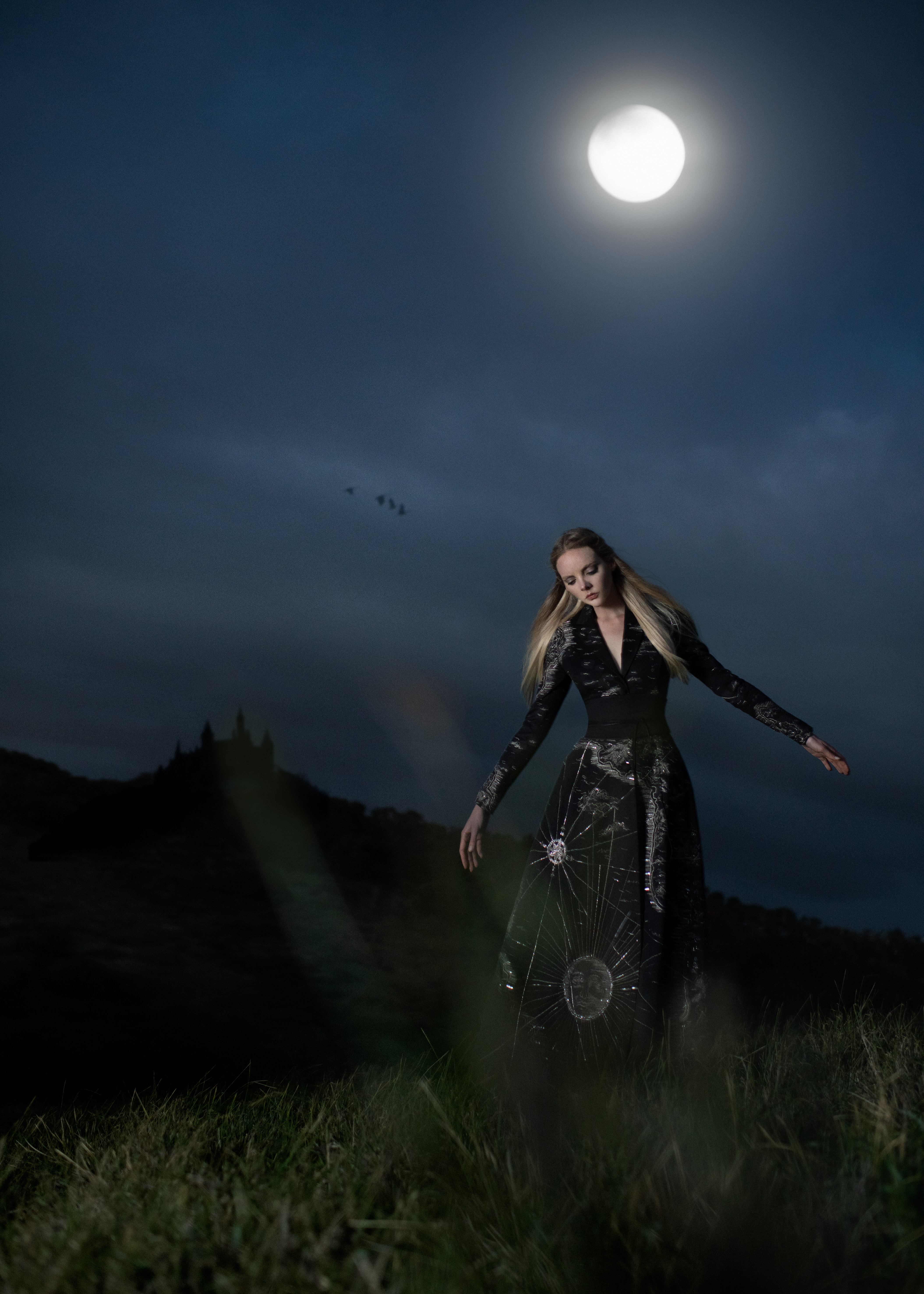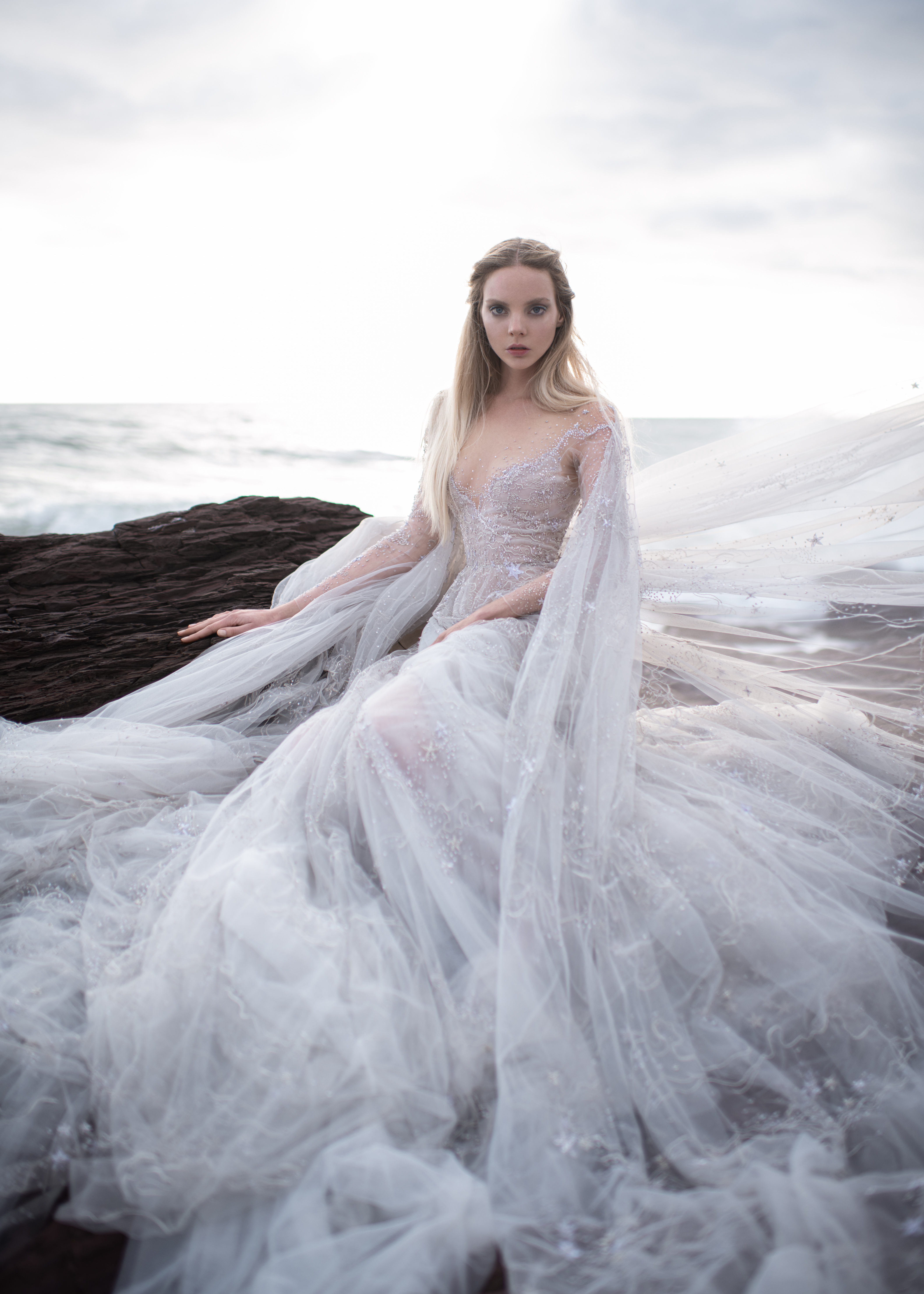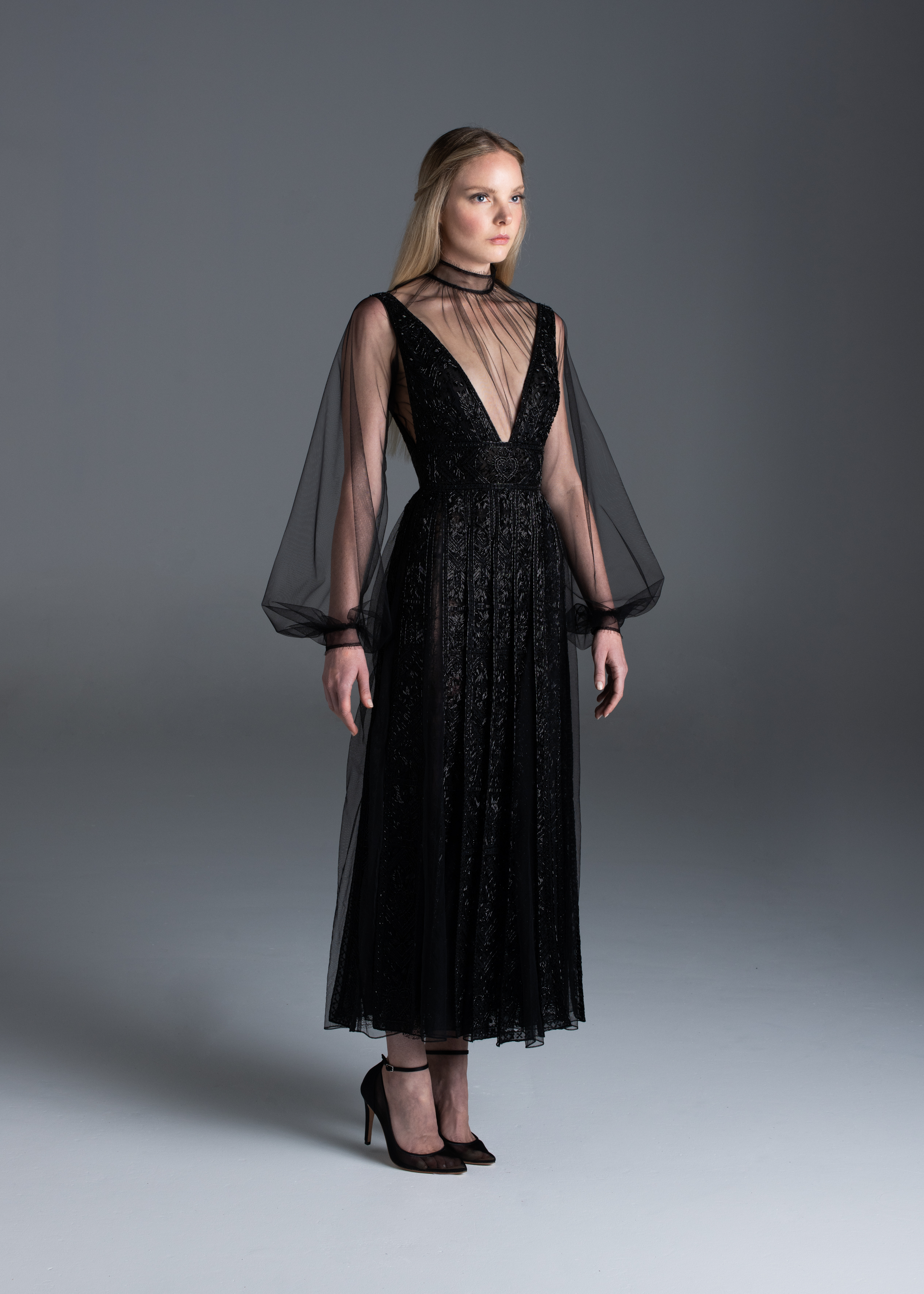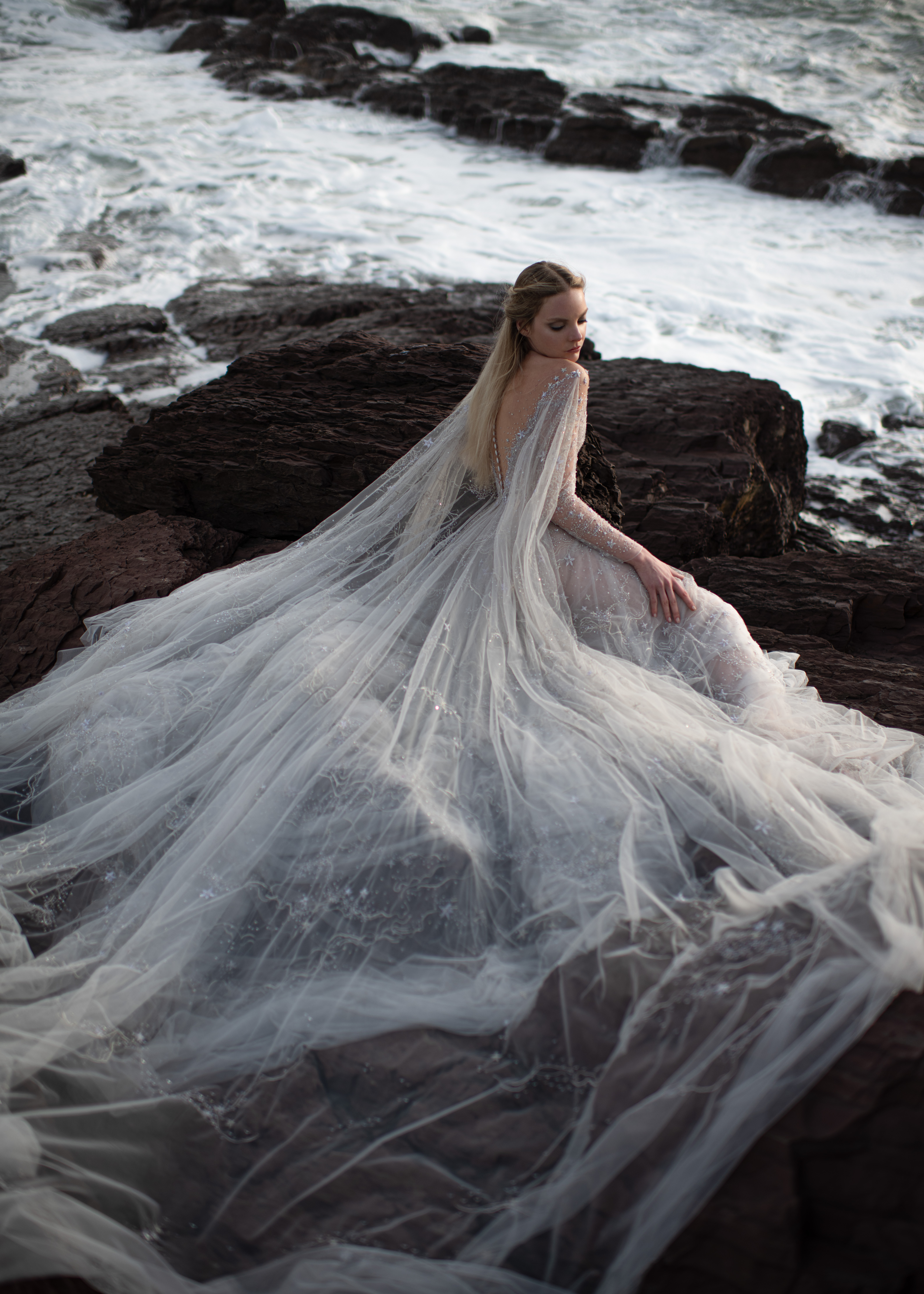 Stand out pieces include a tailored cashmere coat and dégradé sleeved cocktail gown, each gilded with celestial-inspired map embroidery; illustrating the heroine’s journey through the northern, southern, eastern and western winds of the tale. Whilst corsetry creates beautifully defined waisted silhouette, showcasing the artisanal vigour of the Paolo Sebastian atelier.