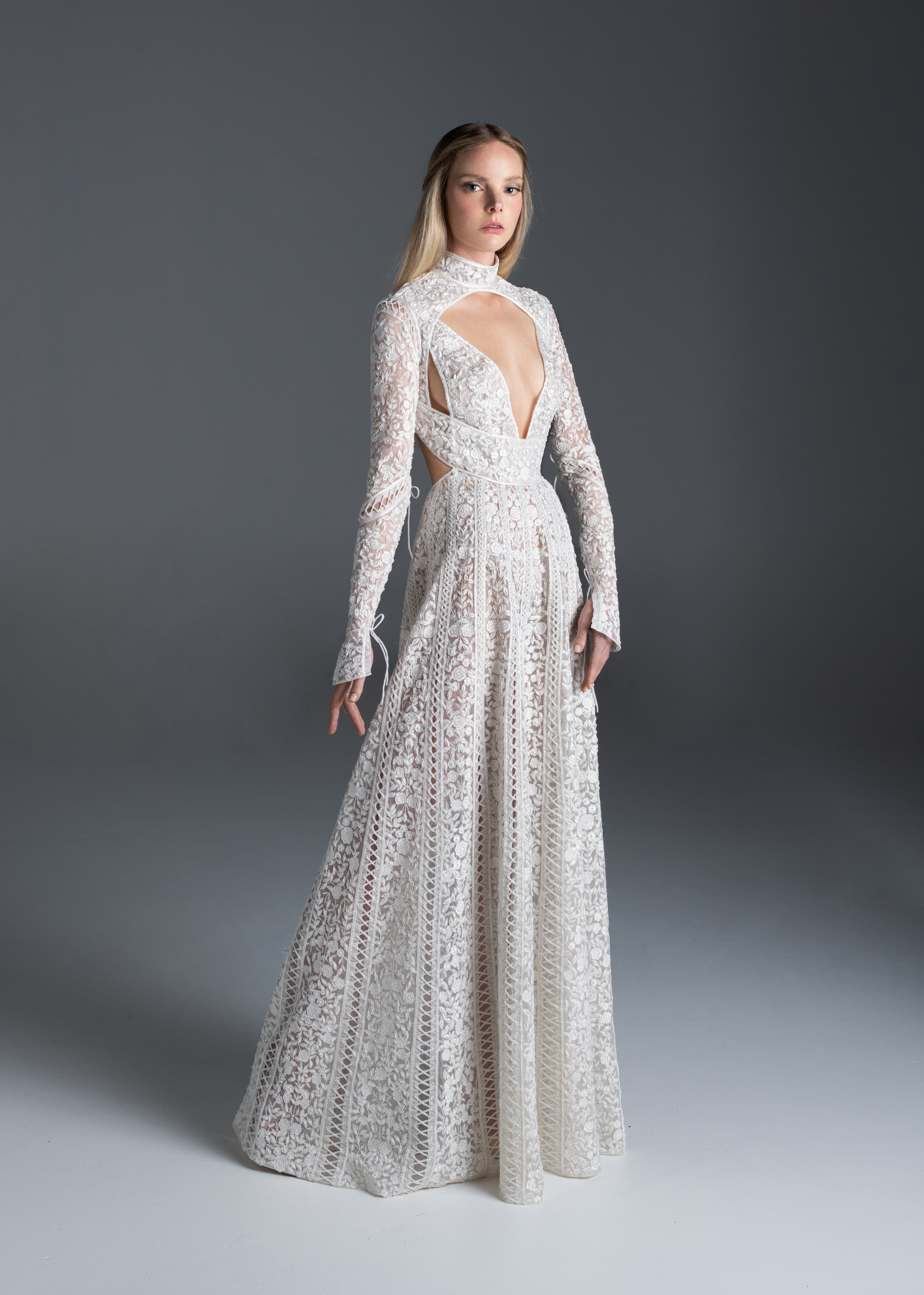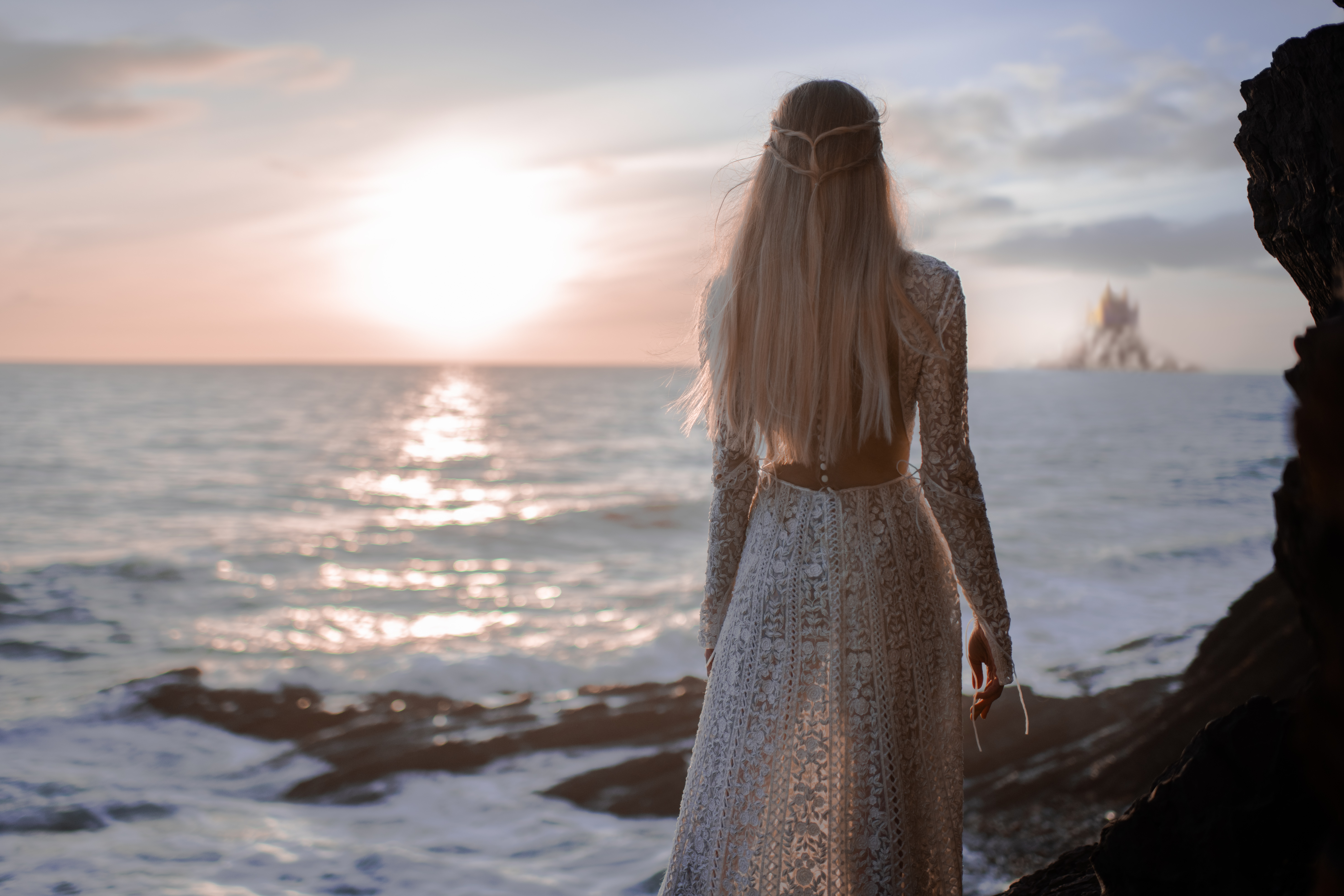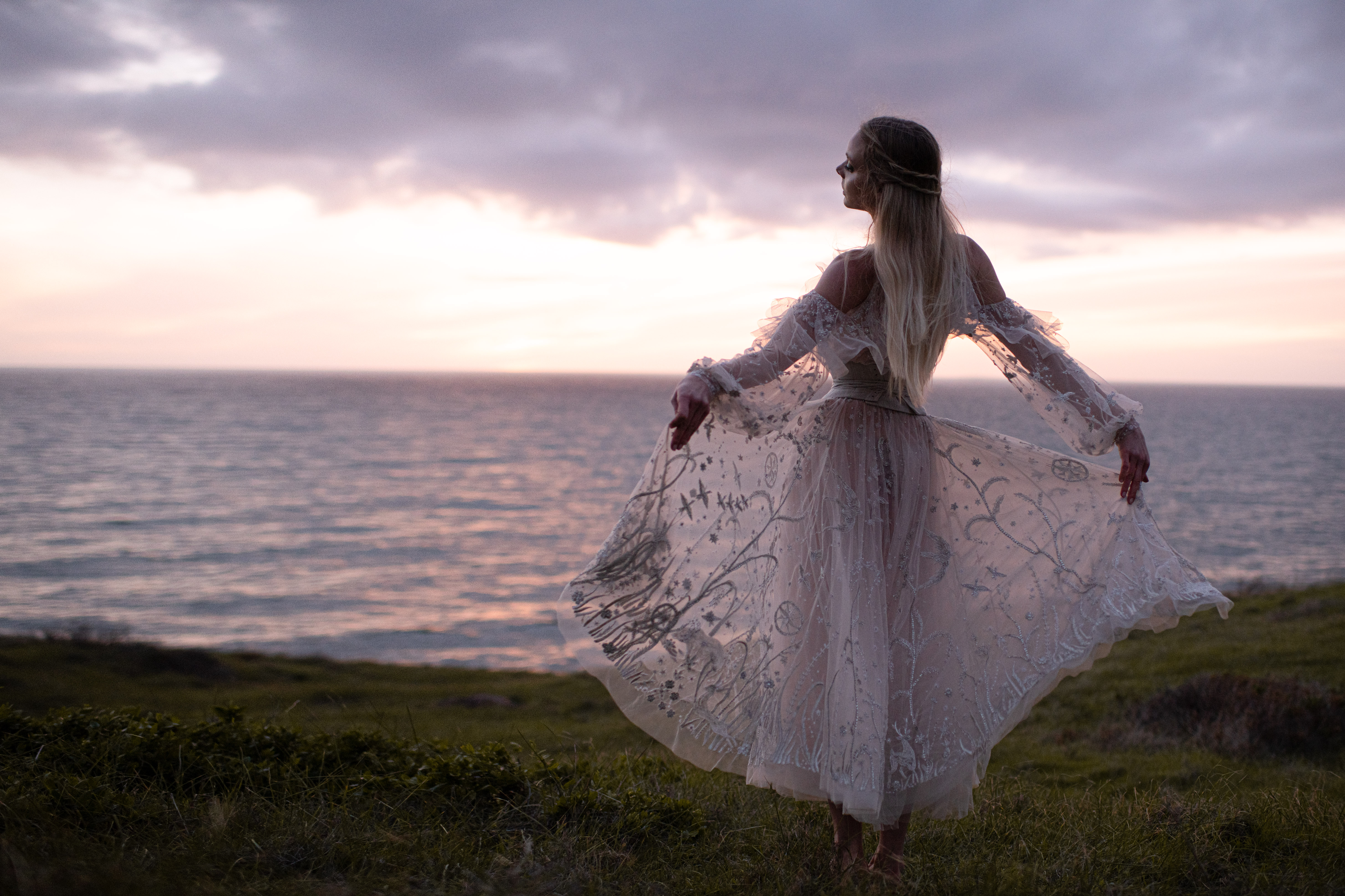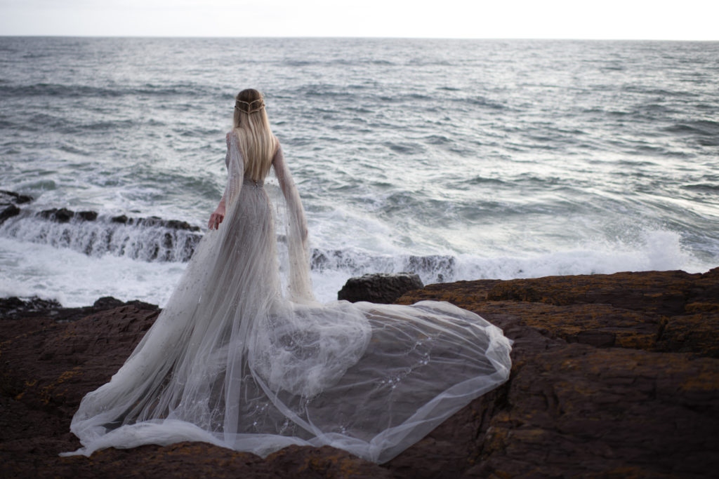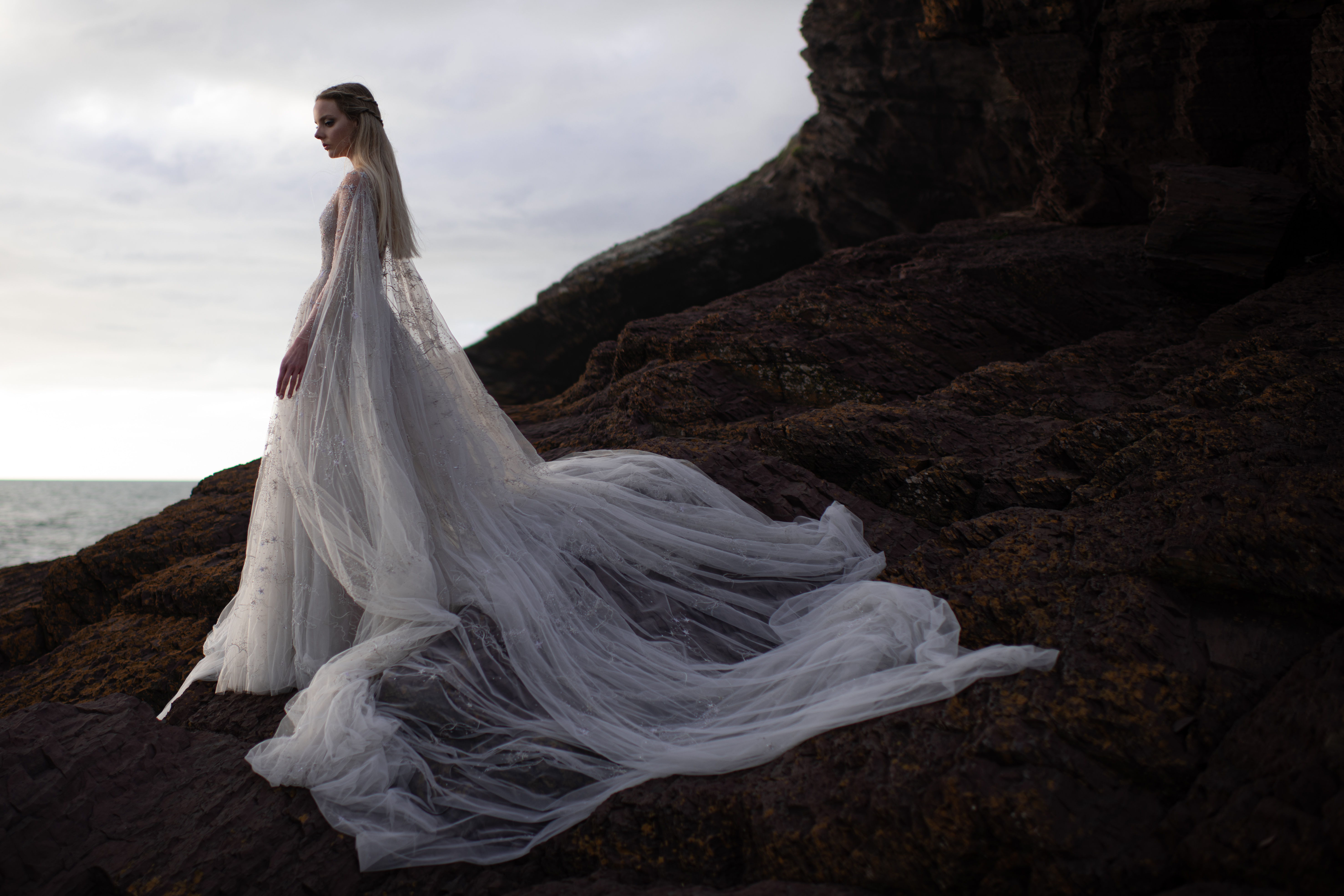 Stand out pieces include a tailored cashmere coat and dégradé sleeved cocktail gown, each gilded with celestial-inspired map embroidery; illustrating the heroine’s journey through the northern, southern, eastern and western winds of the tale. Whilst corsetry creates beautifully defined waisted silhouette, showcasing the artisanal vigour of the Paolo Sebastian atelier.