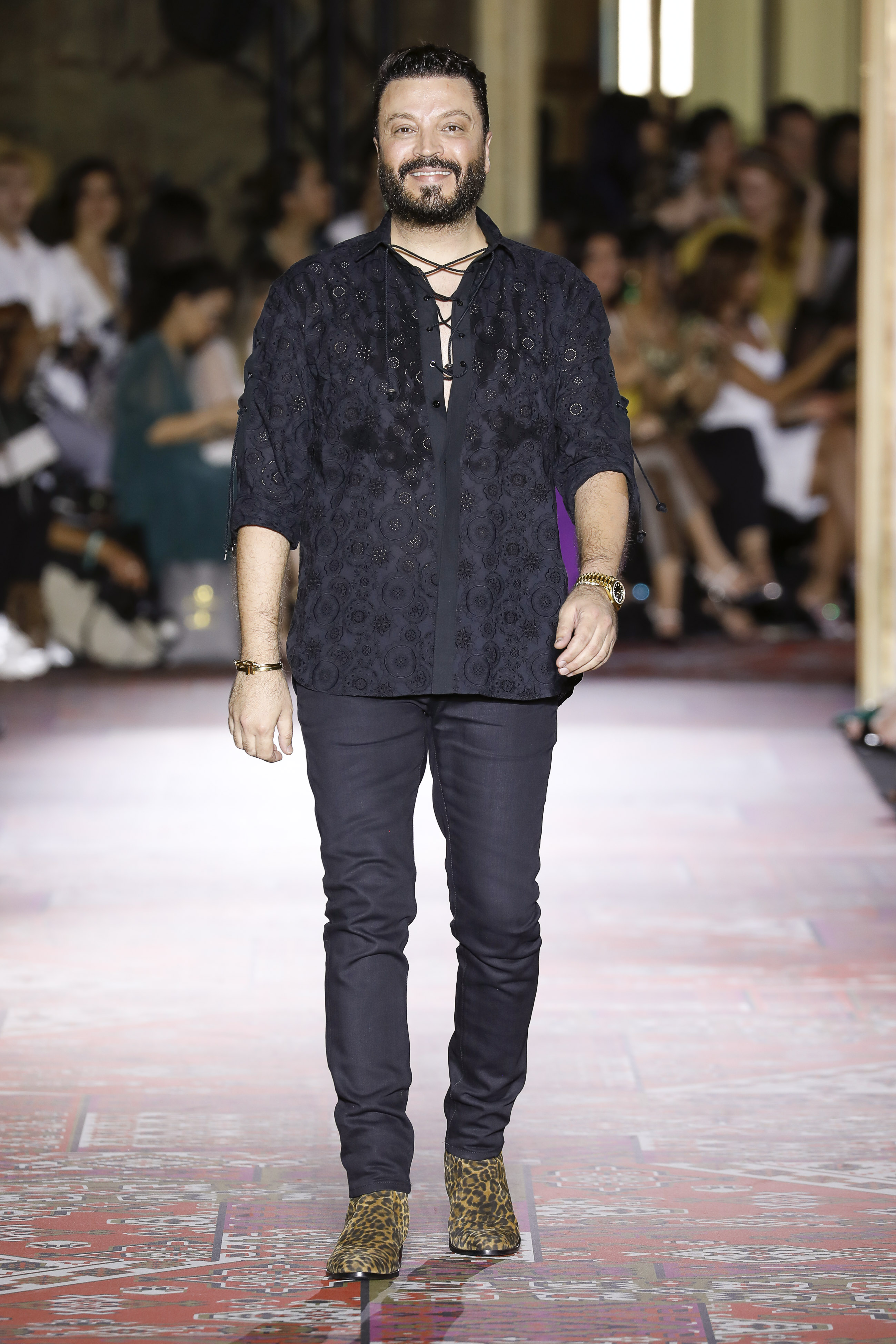 In the middle of these ethnic references drawn from ancient cities, the collection introduces pieces in equal part fluid and dream-like. A bustier dress bears a crossover neckline, another model is cut into a boat neck, and overalls are figure-hugging, scintillating tone-on-tone, evoking tattoos in a trompe l’oeil fashion. This collection sits at the crossover between epochs and traditions. Collars are cut high, lurex jacquard is pleated, Lavallière bows are overembroided with pearls, and medieval sleeves are embellished with feathers.