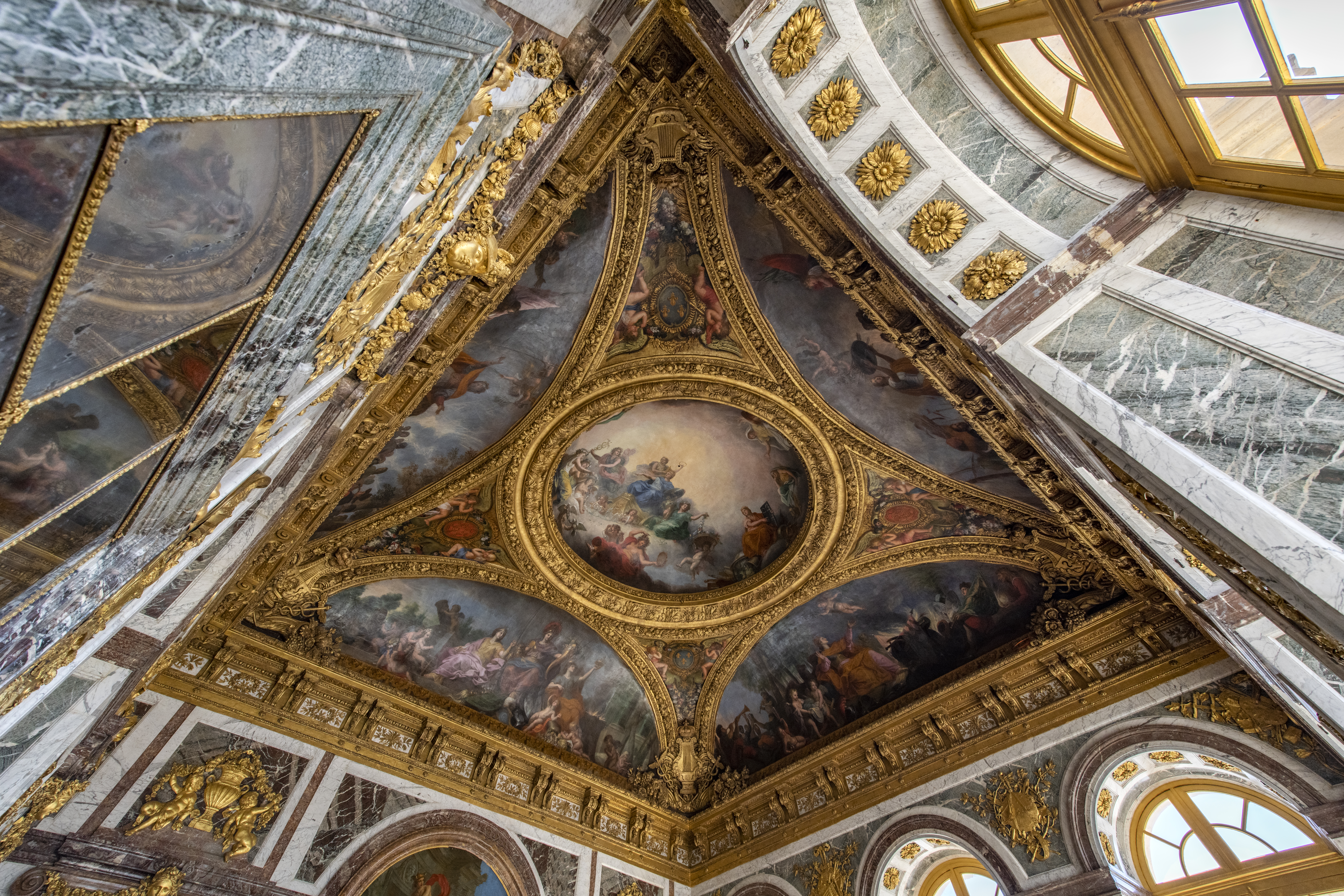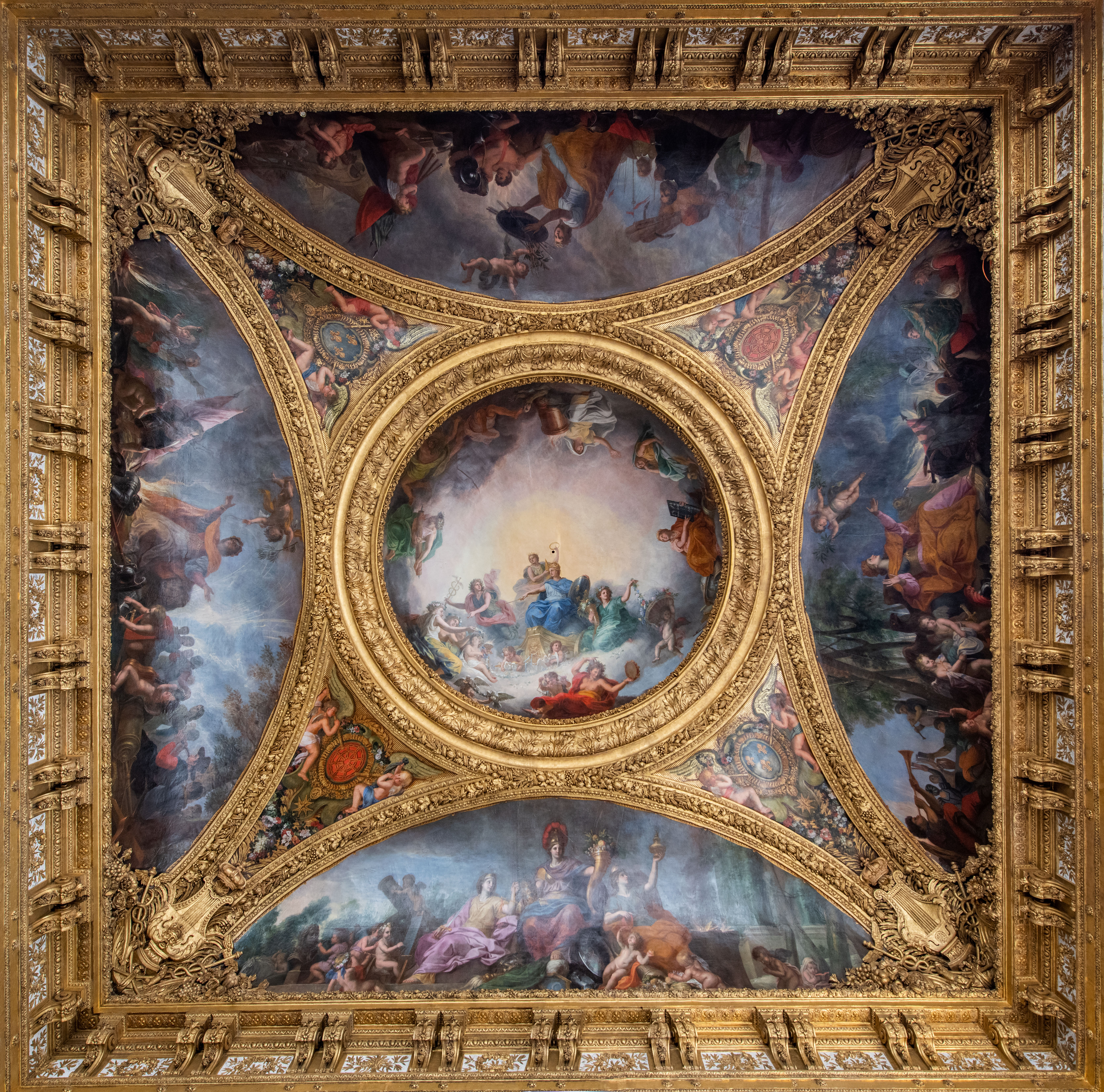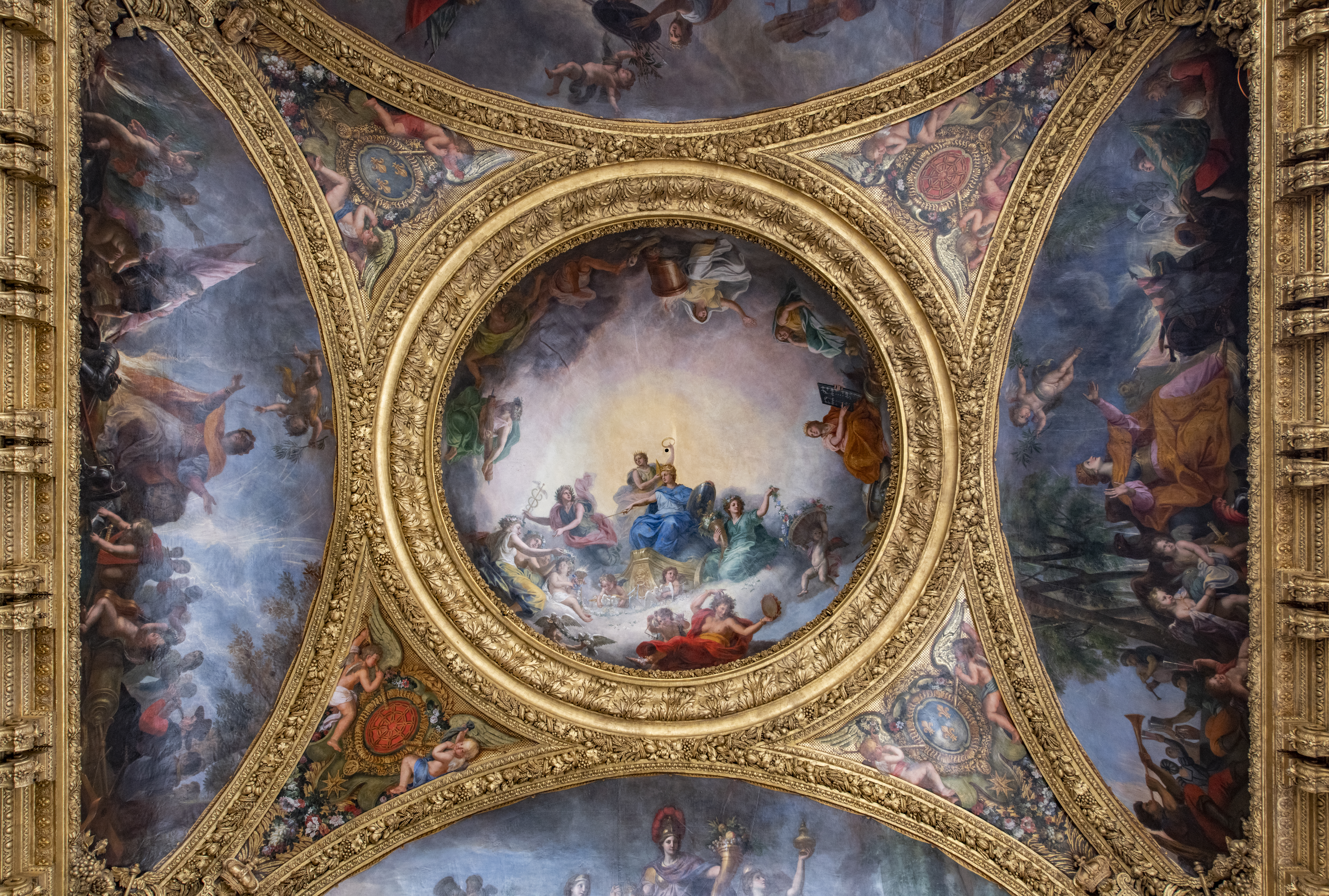 Œuvre de Charles Le Brun et de son atelier, la coupole du plafond est couverte d’une composition peinte, riche en symboles, représentant les bienfaits de la paix apportée par la France sur l’Europe, dont la subdivision est semblable à celle du salon de la Guerre, clôture ainsi le cycle de l’Histoire du Roi, qui s’était développé majestueusement dans la Grande Galerie. Les stucs entourant le plafond furent exécutés par les sculpteurs Jean‐Baptiste Tuby et Pierre Mazeline.
