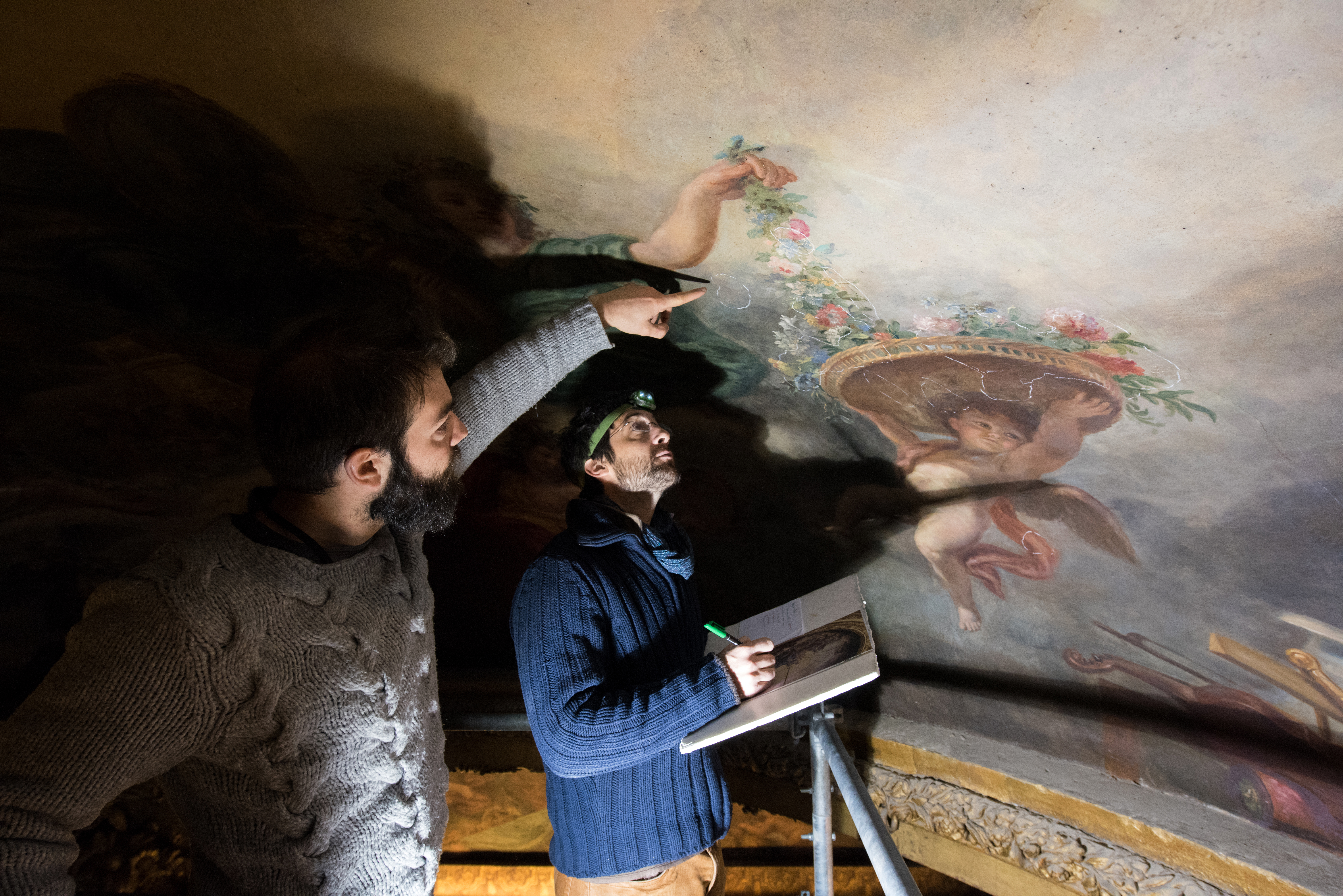 - Le décor peint : Une part importante de la restauration a porté sur le dégagement de l’œuvre originale et de la couche de repeints de 1814, c’est‐à‐dire la suppression de l’intervention très couvrante, parfois caricaturale et chromatiquement fausse des années 1950. Les équipes ont ensuite procédé aux retouches illusionnistes des usures et des lacunes, à l’harmonisation des repeints anciens et enfin, au vernissage.