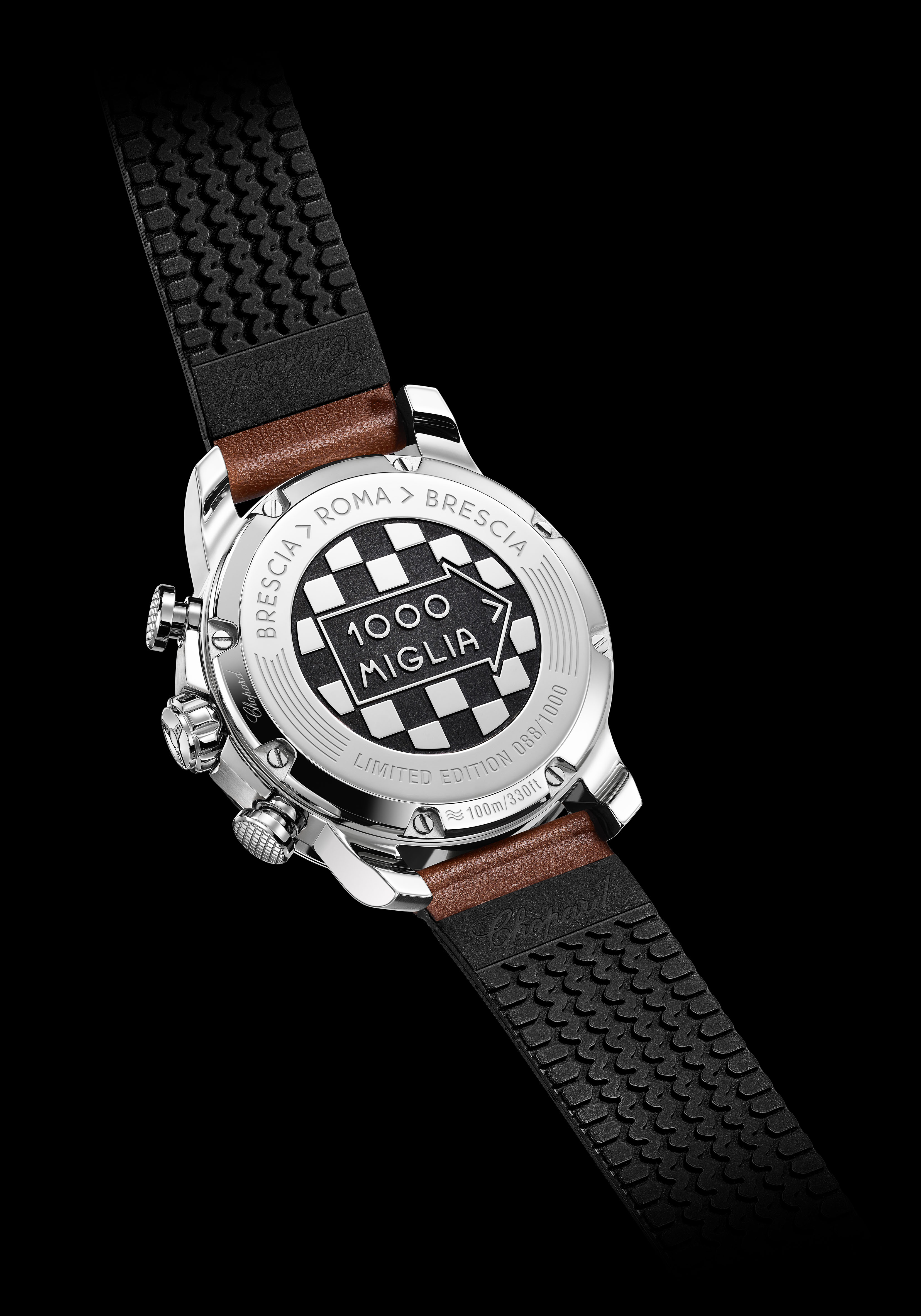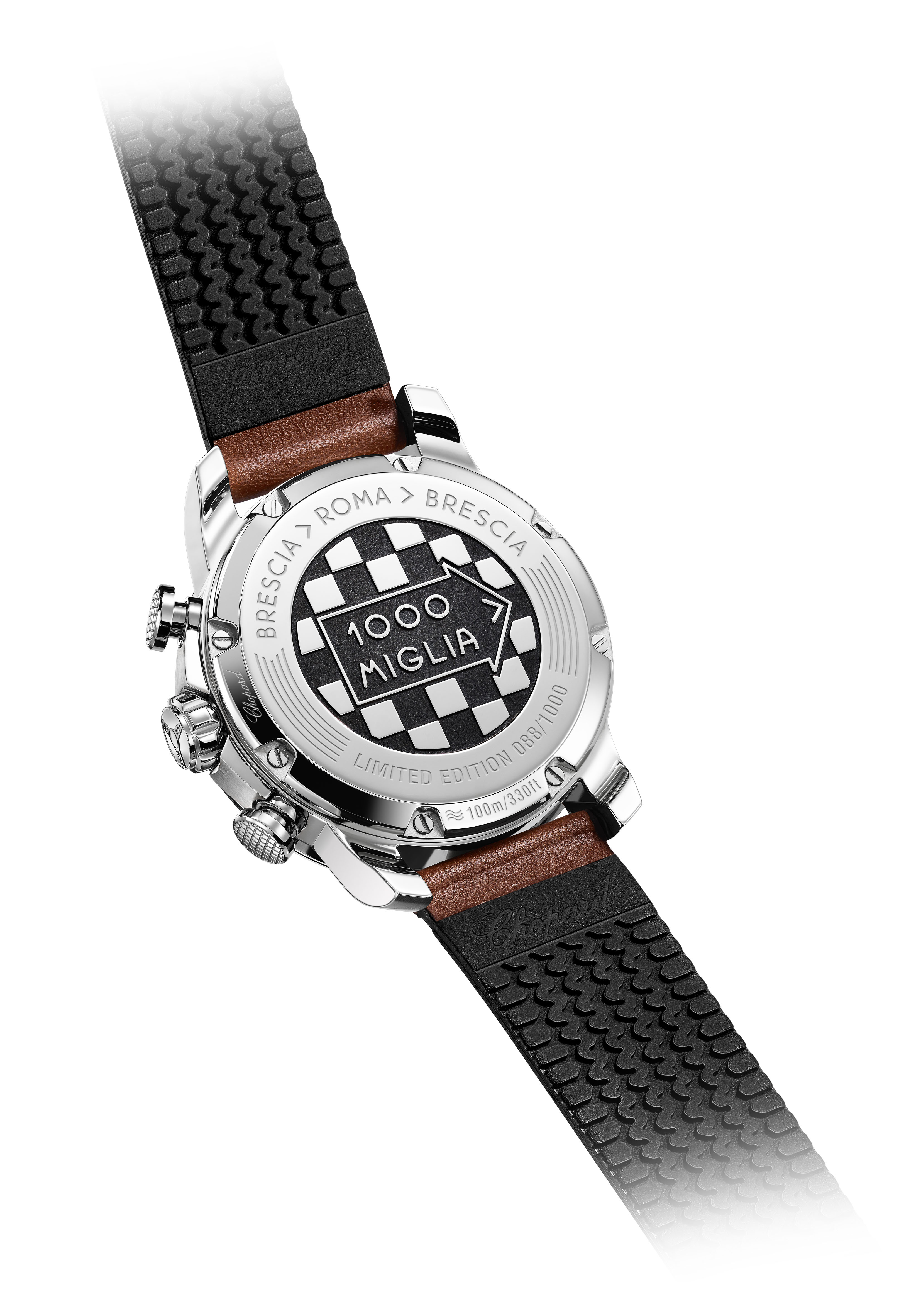 Dans ses deux déclinaisons, cette Mille Miglia 2019 Race Edition est d’abord et avant tout une montre taillée pour la course, un véritable bolide horloger. Robuste et endurante d’abord, elle offre un généreux boîtier de 44 mm au fond vissé et garantie d’une étanchéité à 100 mètres. Le fond est en outre gravé du logo Mille Miglia sur une trame en forme de damier traité PVD noir qui rappelle le drapeau du commissaire de course. Efficace et performant ensuite, le modèle embarque un mouvement chronographe automatique dont la précision est certifiée par le Contrôle Officiel Suisse des Chronomètres (COSC) pour une réserve de marche de deux jours pleins. Cadencée à 28’800 alternances/heure, cette motorisation assure une mesure des temps courts au 1/8e de seconde, parfaitement adaptée aux exploits sur route des oldtimers. Pour ceux qui avalent les kilomètres, l’échelle tachymétrique gravée sur l’insert en aluminium noirci de la lunette permet de calculer la vitesse moyenne en course. Une information essentielle pour les pilotes, en sachant qu’une épreuve d’endurance comme la course de la Mille Miglia se remporte grâce sur la régularité.
