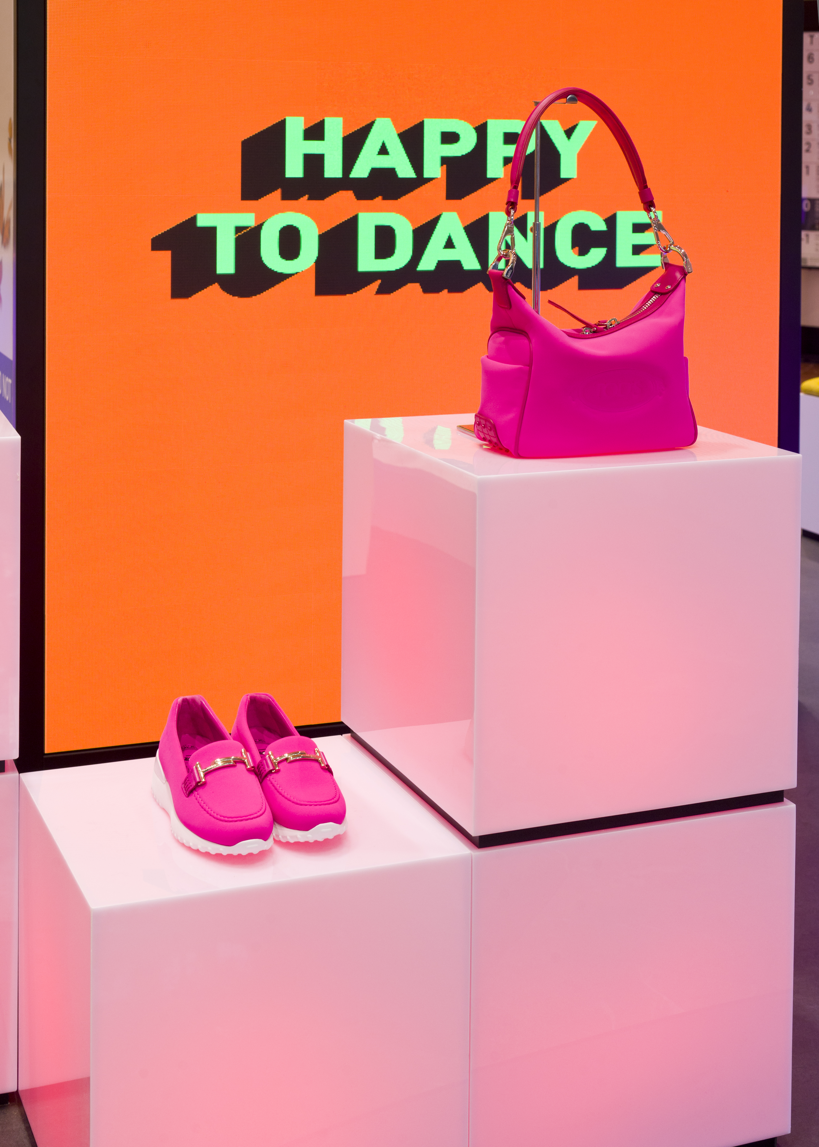 Tod’s: Happy to Dance avec sa réinterprétation du mocassin Tod’s, transformé en sneaker aérodynamique, mixant le néoprène technique à une touche de brillance avec la célèbre boucle Double-T, le tout monté sur une semelle en gomme ultra légère ; sont présentées au public dans un espace mêlant technologie digitale avec murs de LEDS vitaminées, messages lumineux circulants sur toute l’installation et cubes aux coloris pop luminescents.