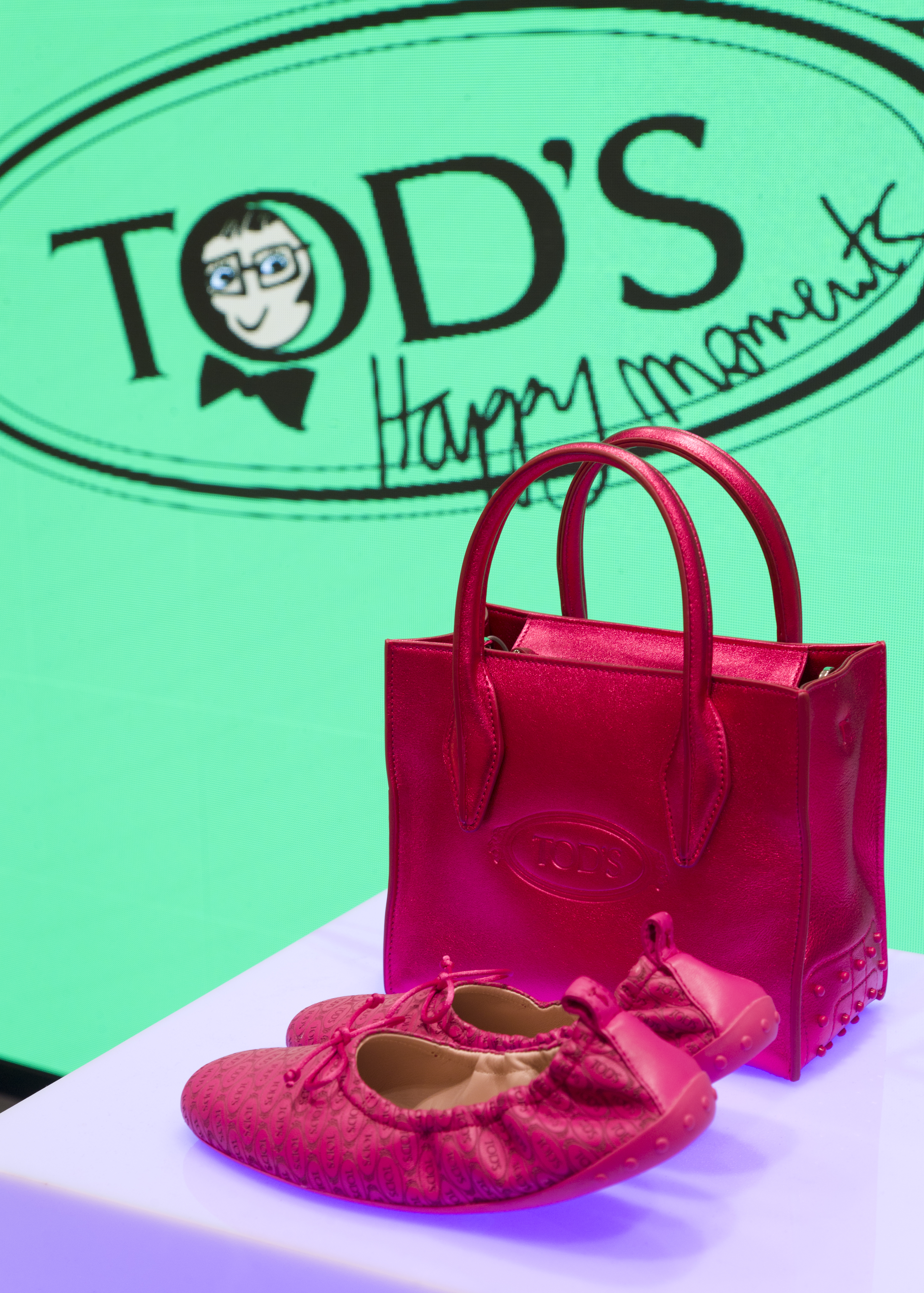 Tod’s: Happy Birthday revisitant le célèbre Gommino Tod’s, dans un cuir velours logotypé et dévoilant un cabas oversize en toile et cuir ;