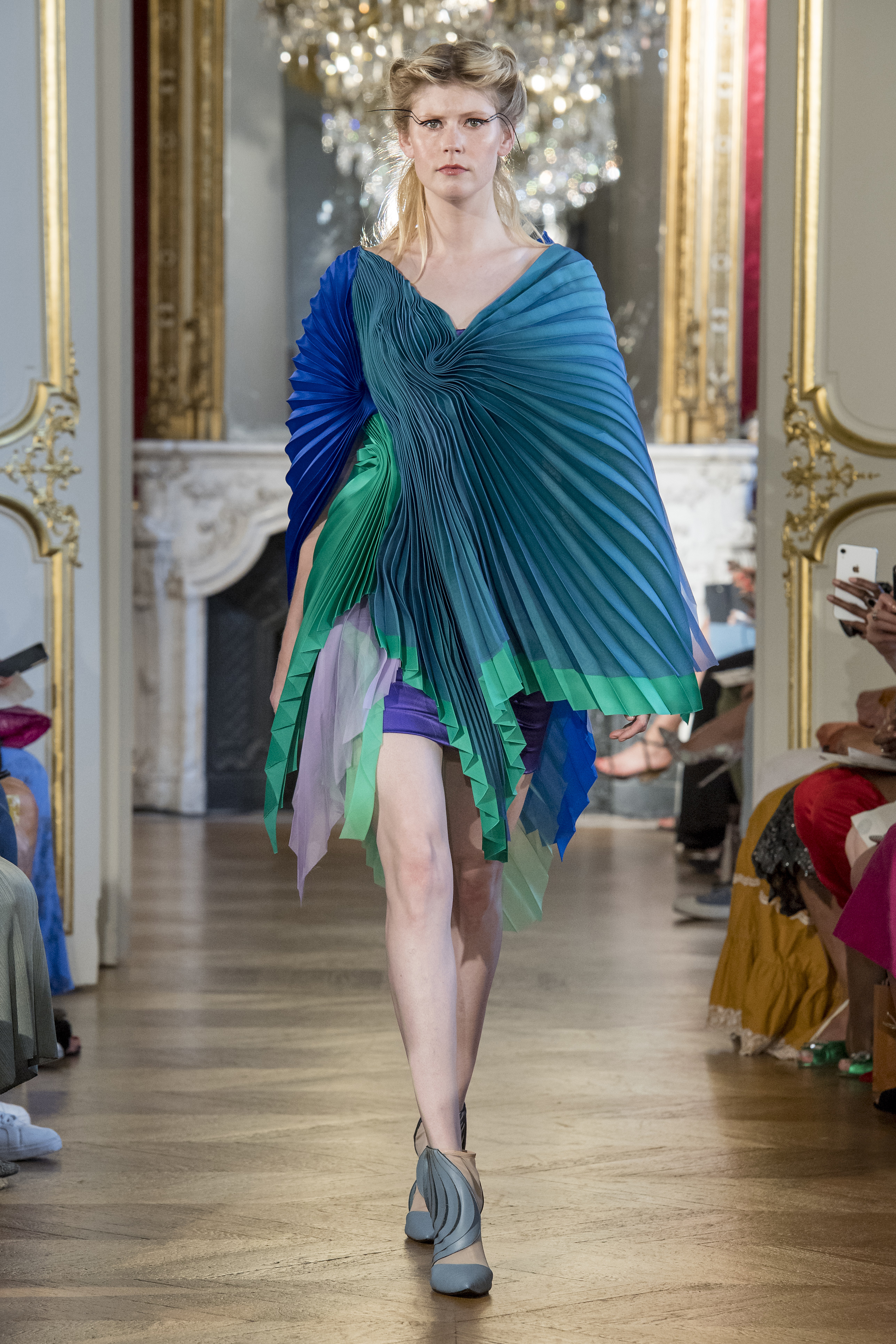 Plusieurs éléments illustrent cette opposition comme par exemple l’utilisation de matières naturelles (mousseline de soie, organza de soie, satin duchesse, coton, etc.) – avec de magnifiques plissés artisanaux conçus par la Maison du Pli -, associée à la découpe laser.