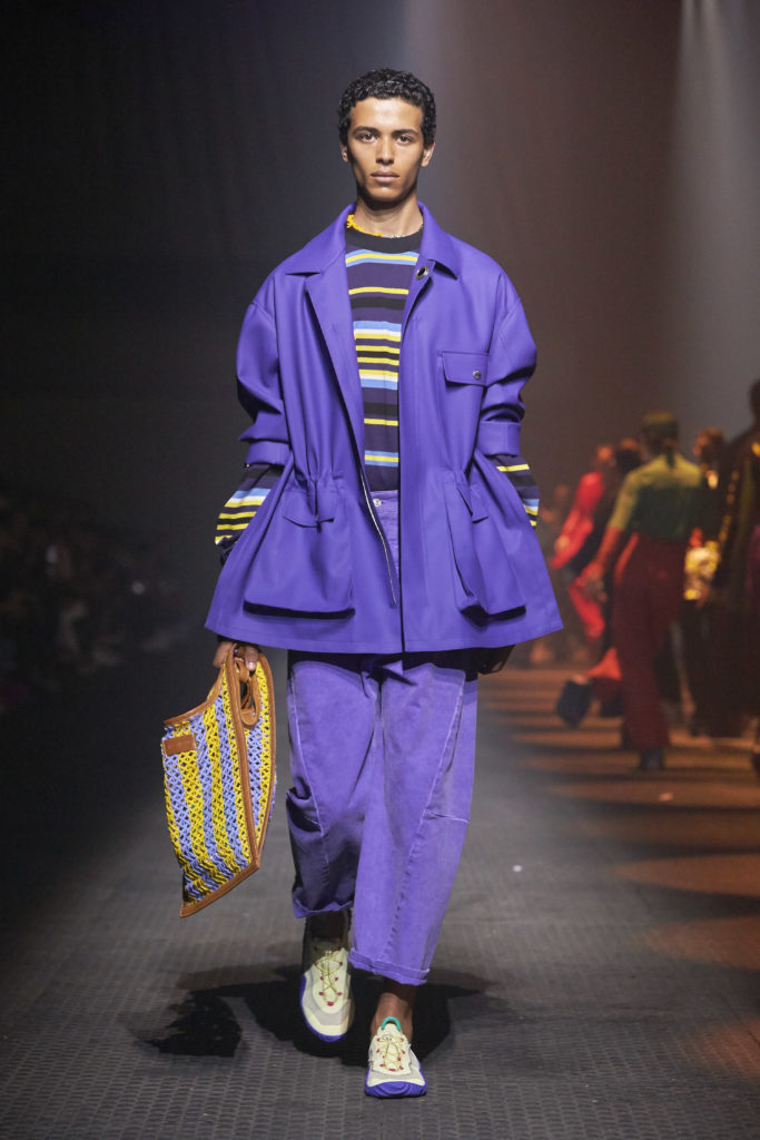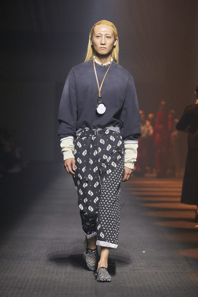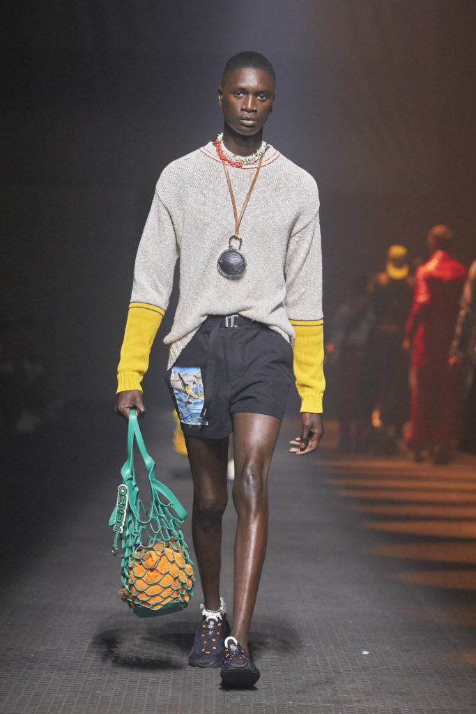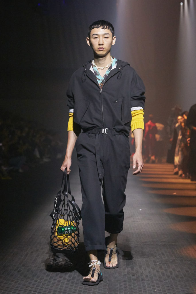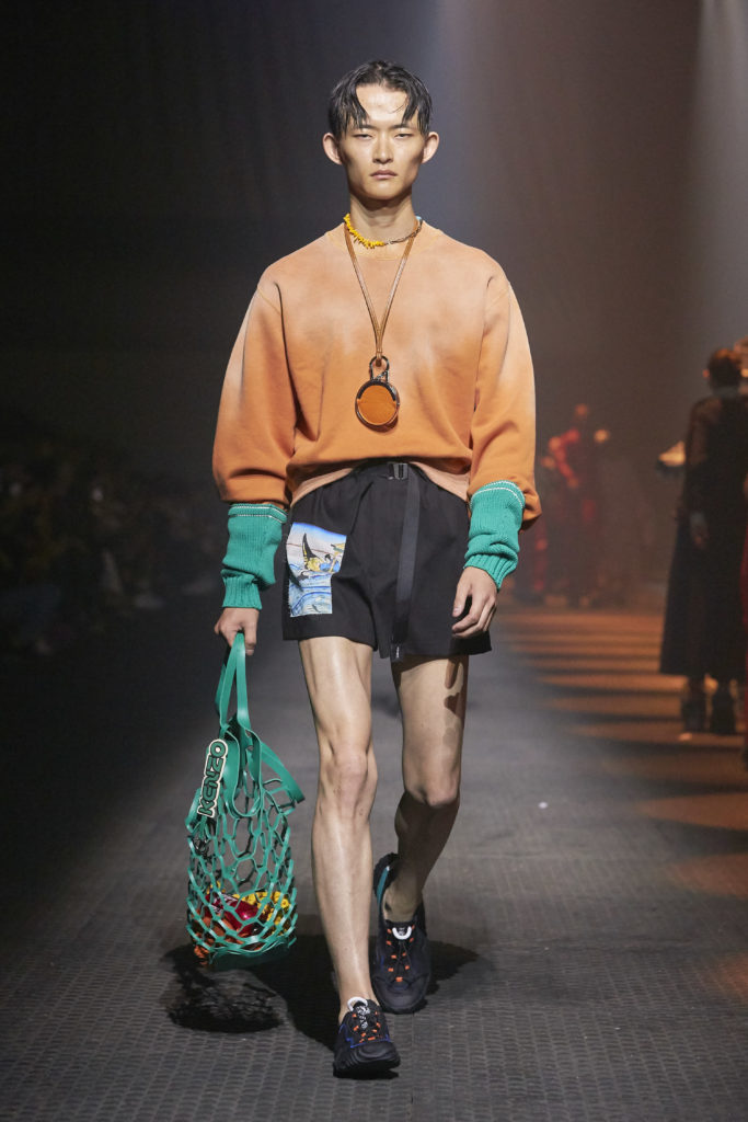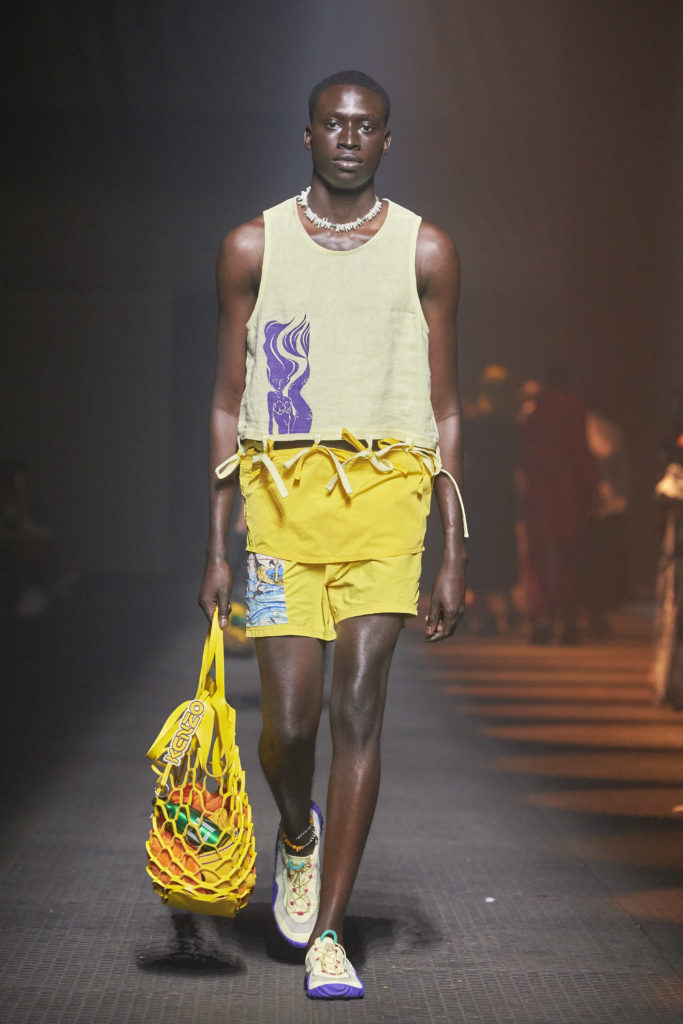 In our Fall-Winter 2019 collection for KENZO, we introduced a new bag, ‘The Tali’. We revisit the Tali for Spring-Summer 2020, updating it within the themes of the new collection and we introduce a new smaller version, The Mini Tali. Skins of viper snake resemble fish scales. Dégradés recall the approaching light seen from the bottom of the ocean floor. Net straps and bumbags mirror the belt pouches used by the Ama to retrieve their rewards. Sunglasses are high performance and feature solarised lenses to protect. For women, traditional Japanese Okobo sandals in the sea-lily print walk alongside scuba sock sandals and a new unisex sneaker style, the scuba inspired K-Wave for men and women.